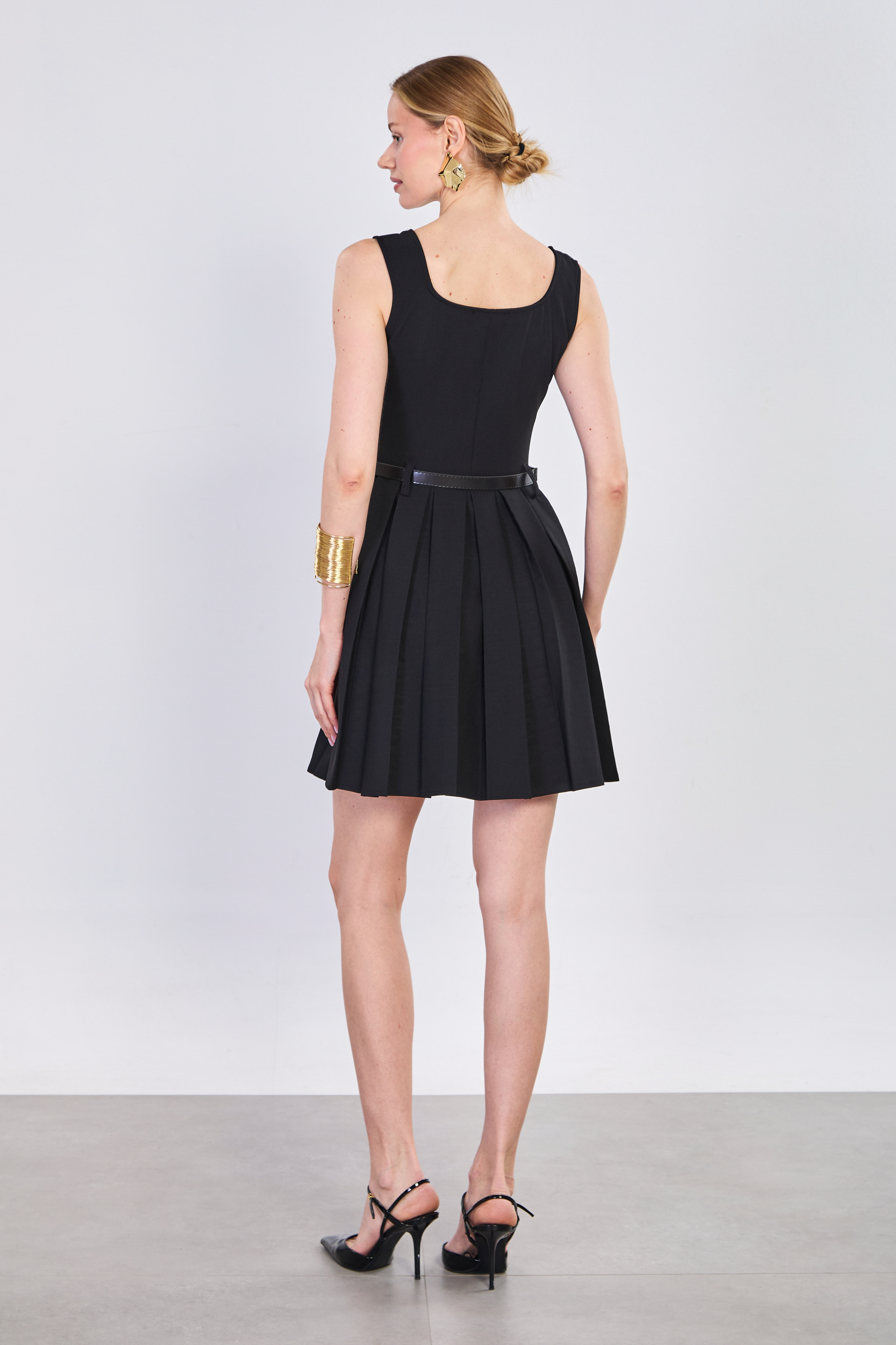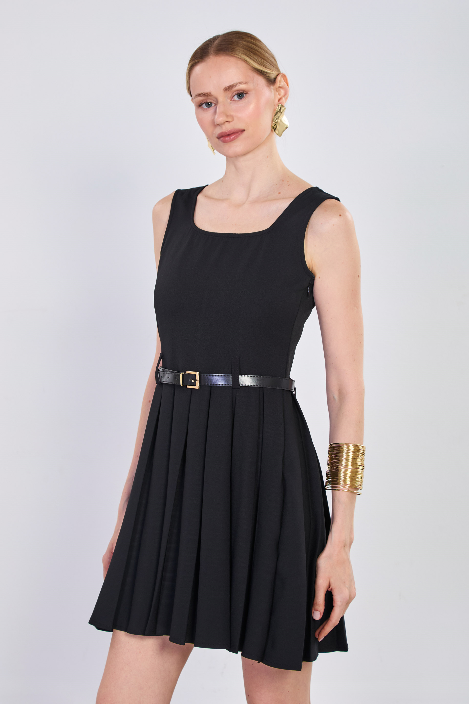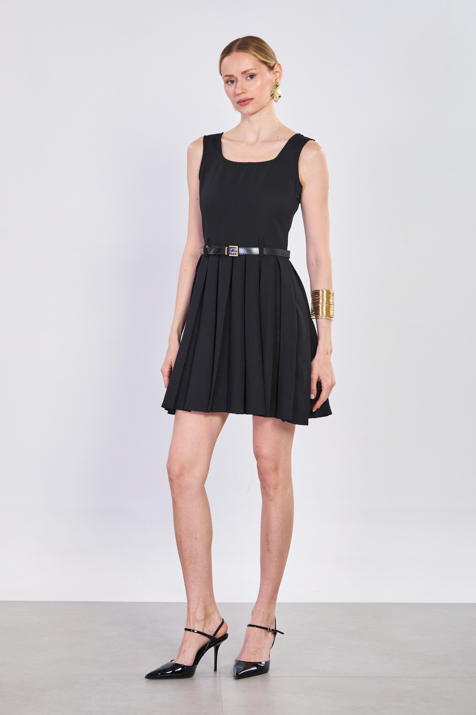 Kadın Kalın Askılı Kemerli Pileli Kısa Elbise - Siyah