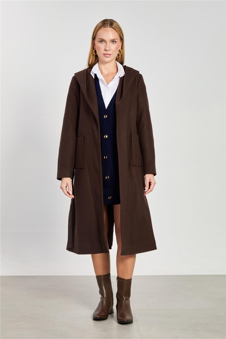 Kadın Kapüşonlu Beli Kuşaklı Kaşe Kaban - Kahve