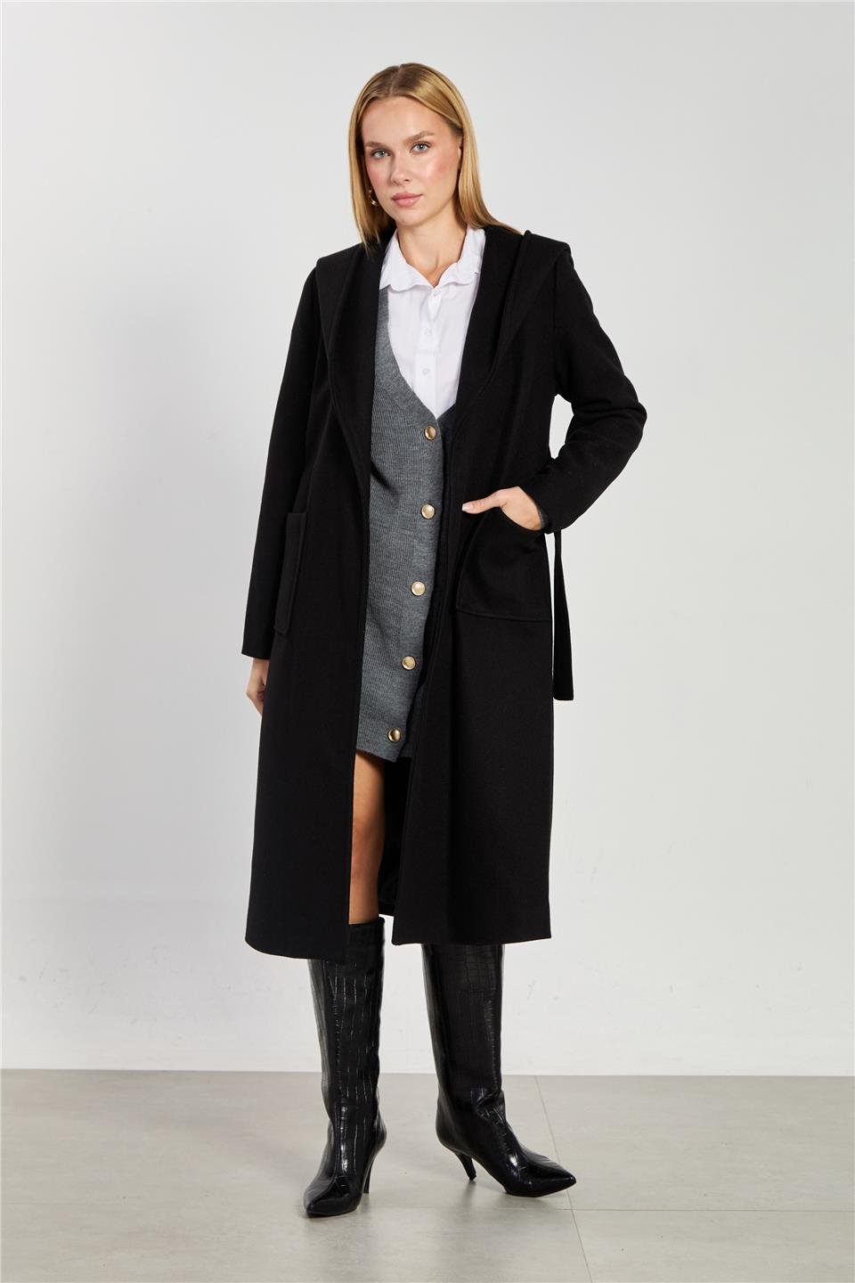 Kadın Kapüşonlu Beli Kuşaklı Kaşe Kaban - Siyah