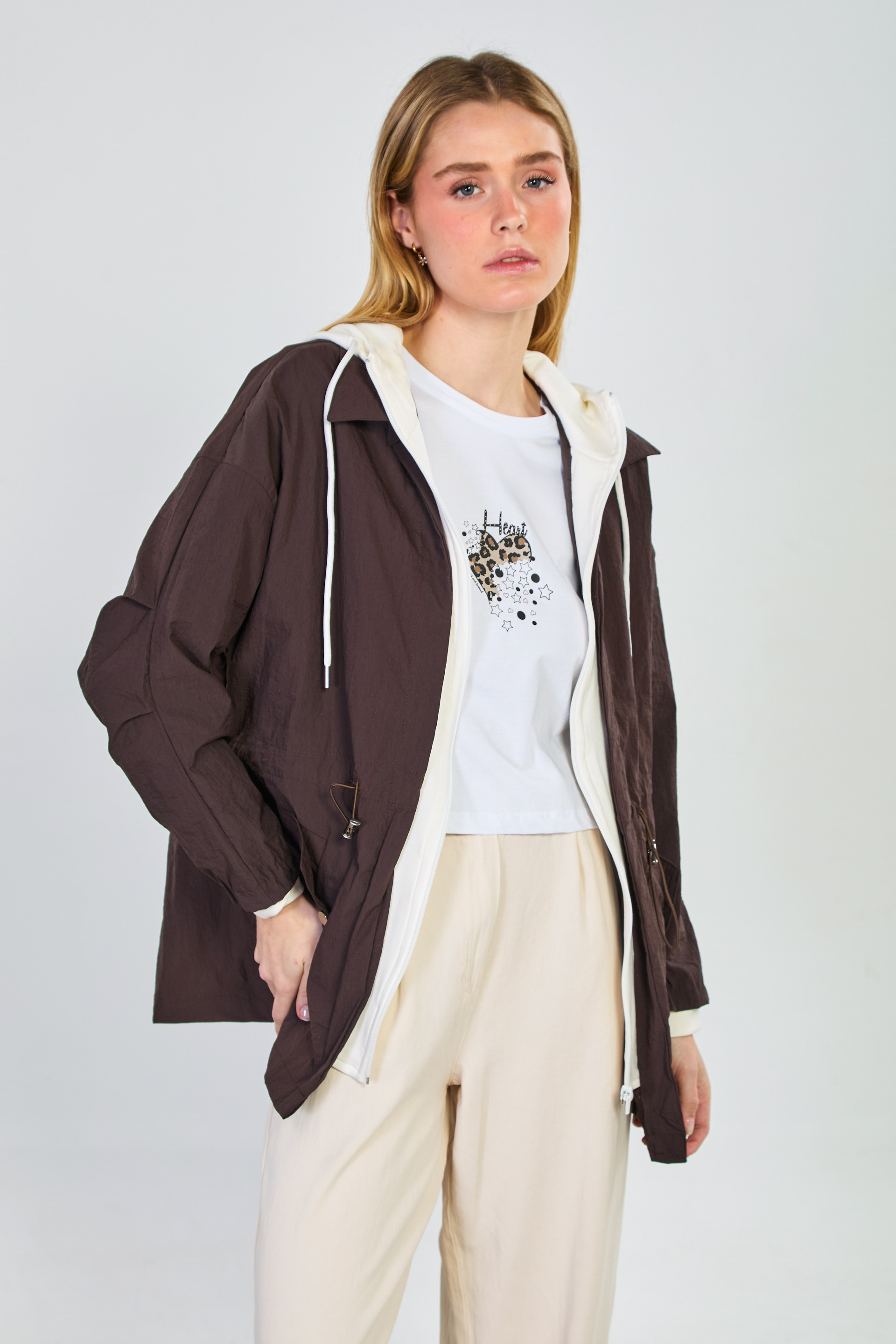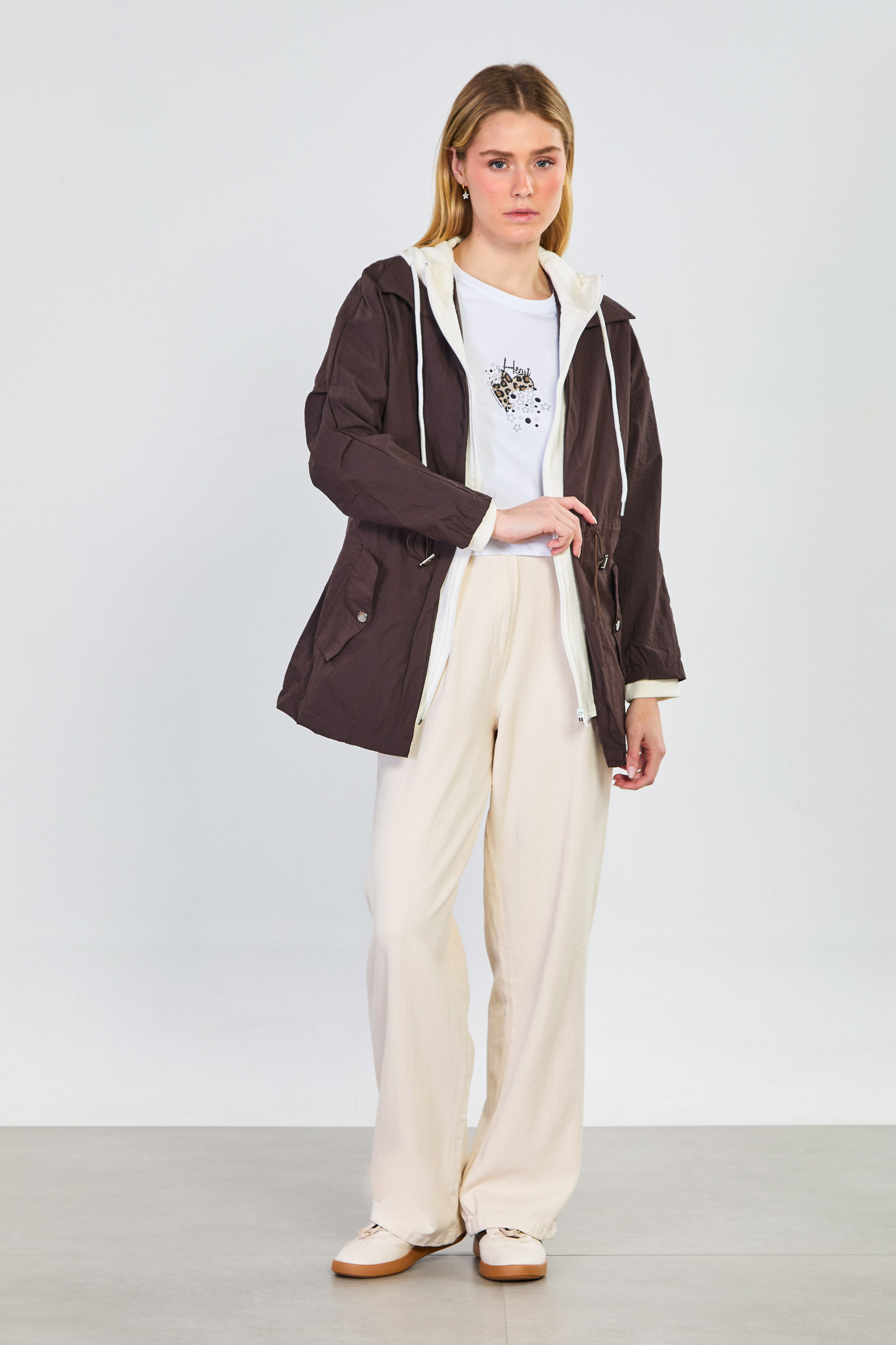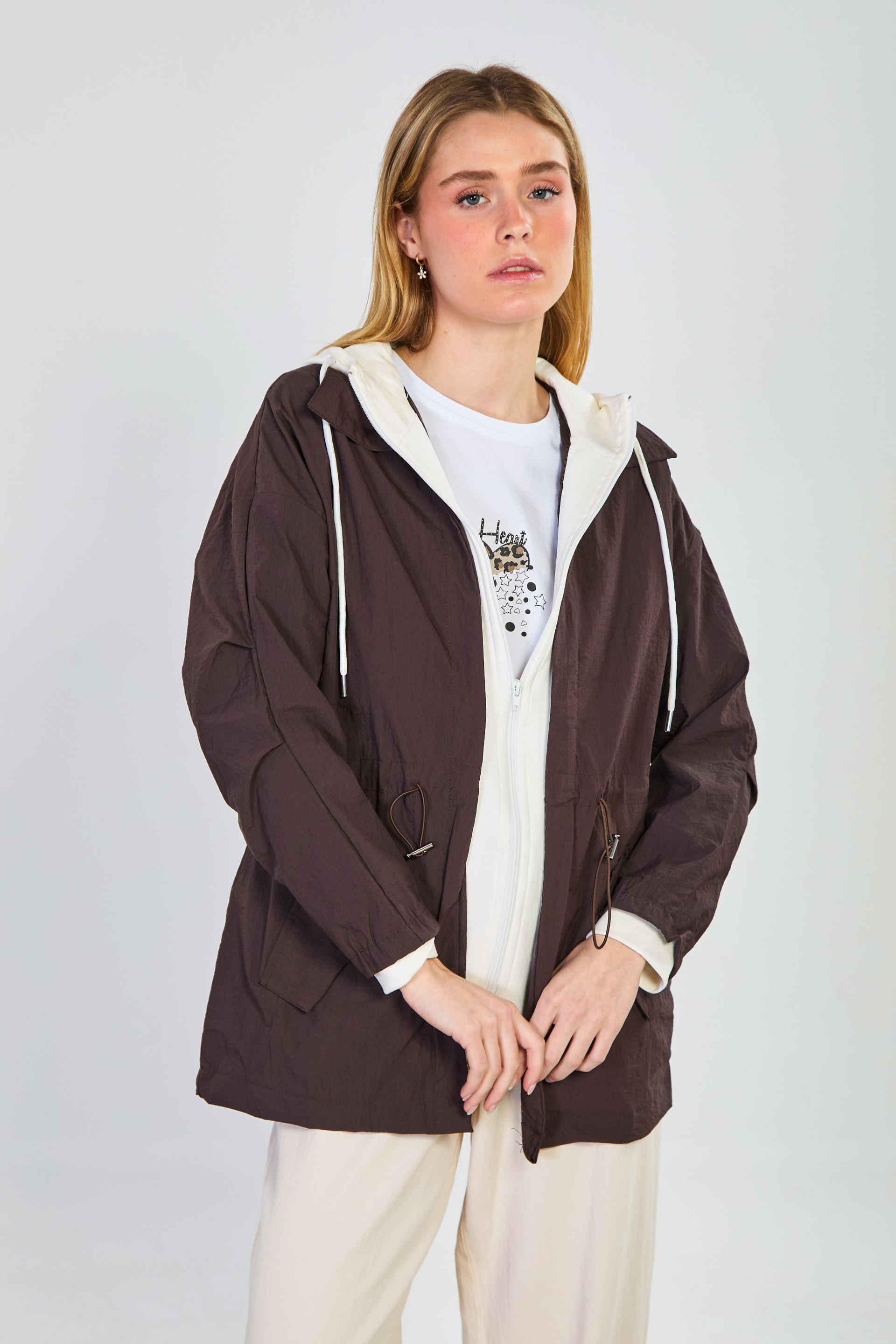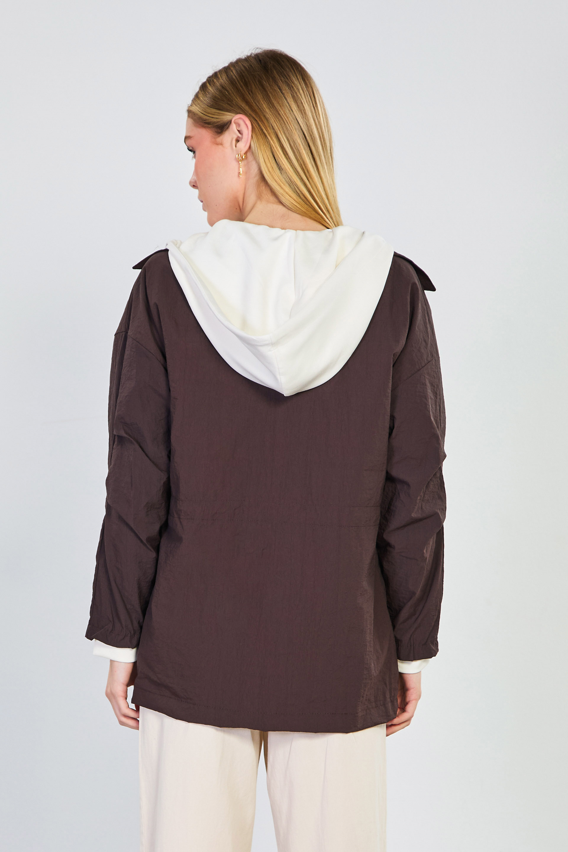 Kadın Kapüşonlu Garnili Fermuarlı Mont - Acı Kahve
