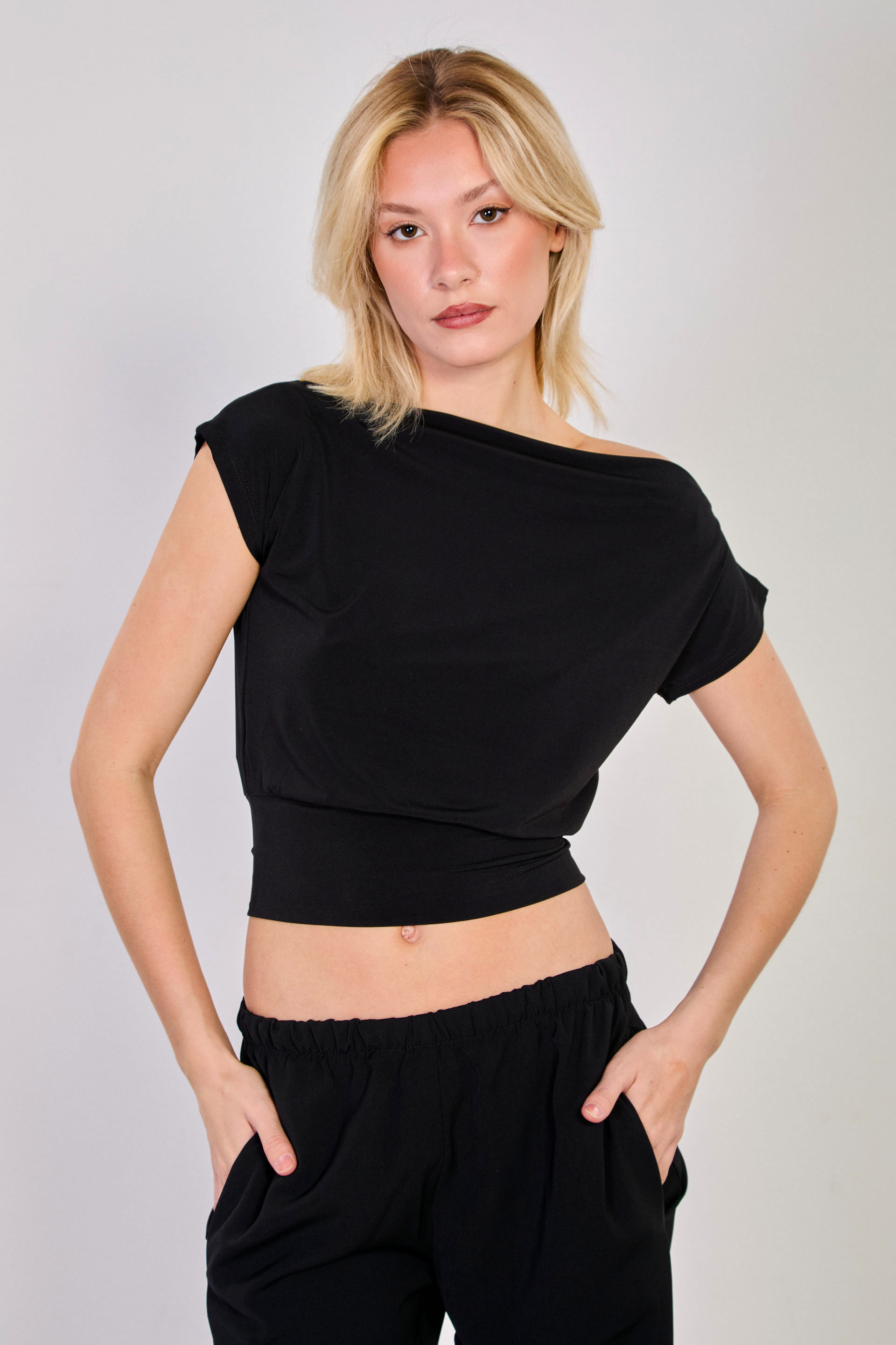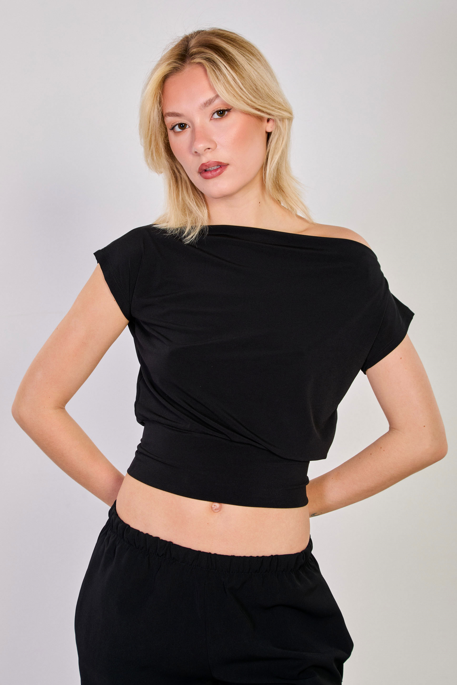 Kadın Kayık Yaka Drapeli Bluz - Siyah