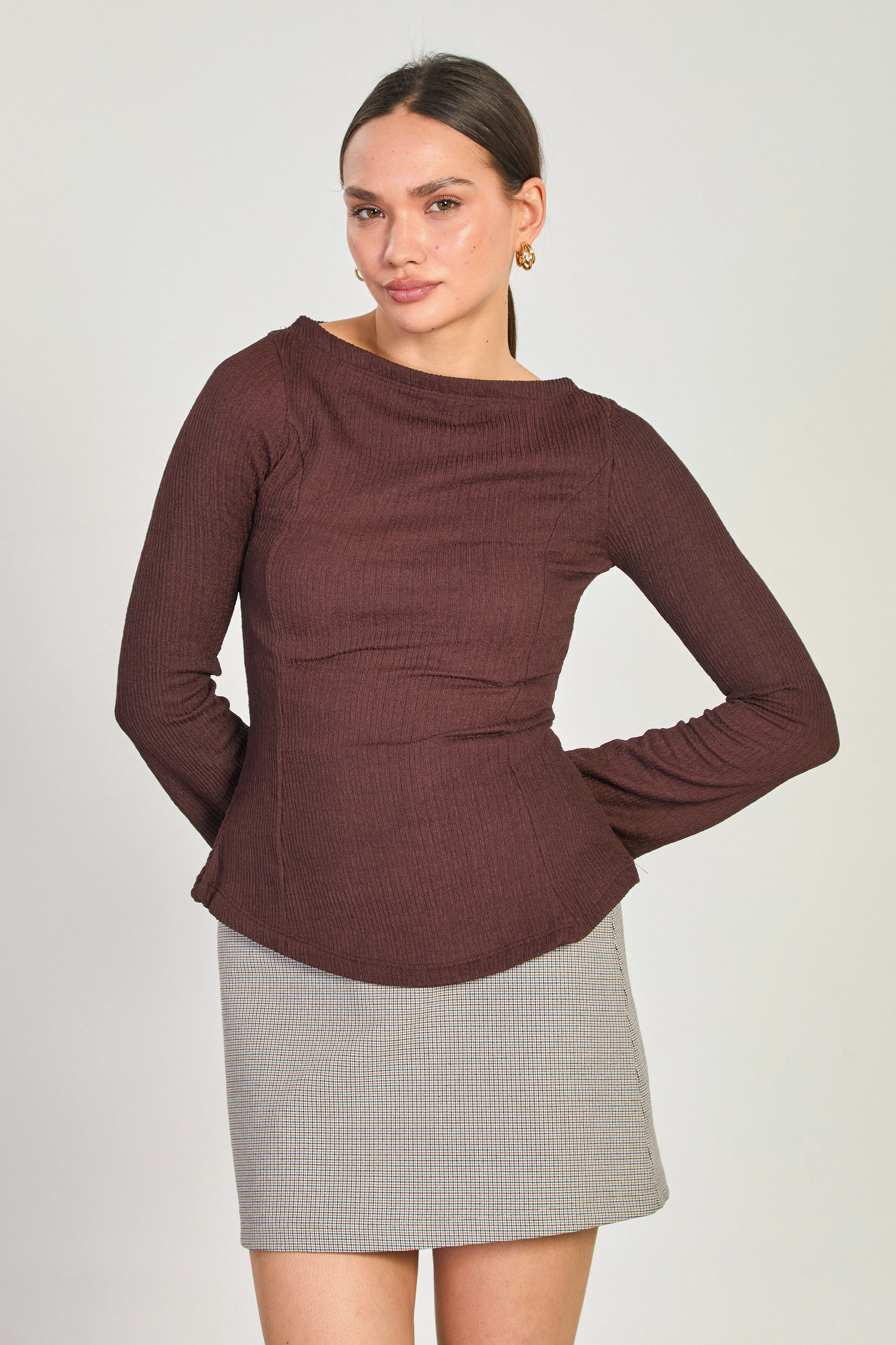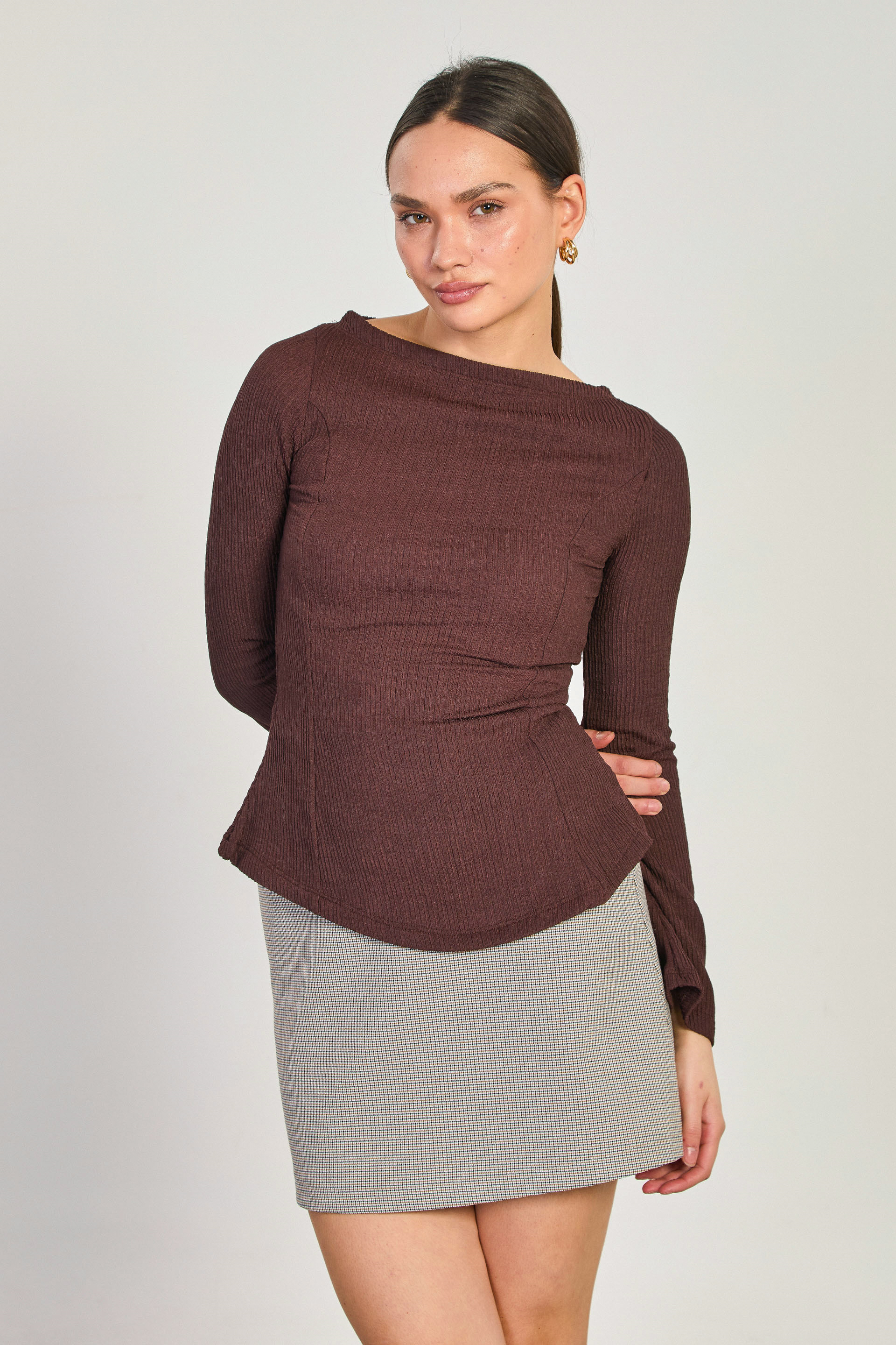 Kadın Kayık Yaka İspanyol Kol Bluz - Kahve