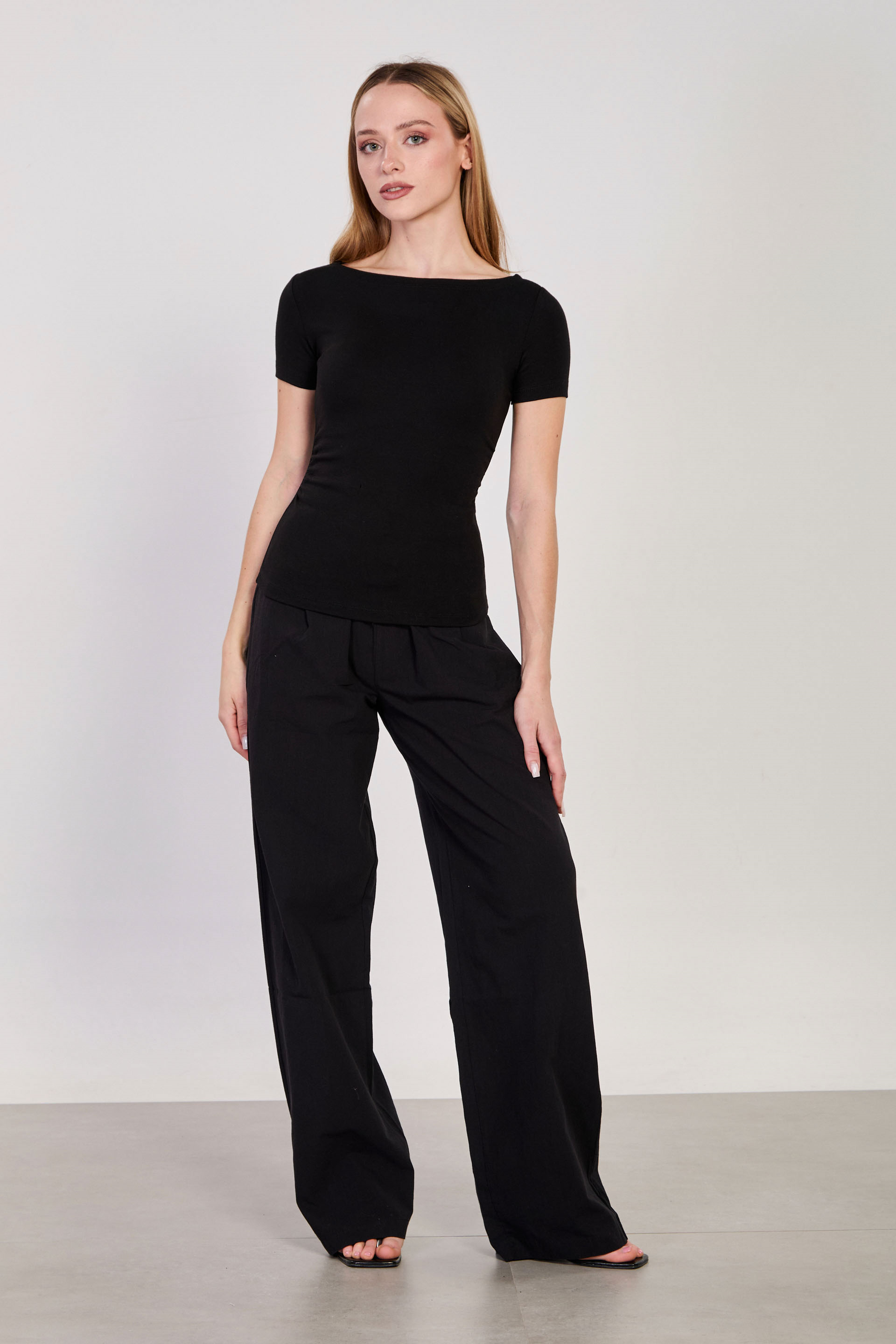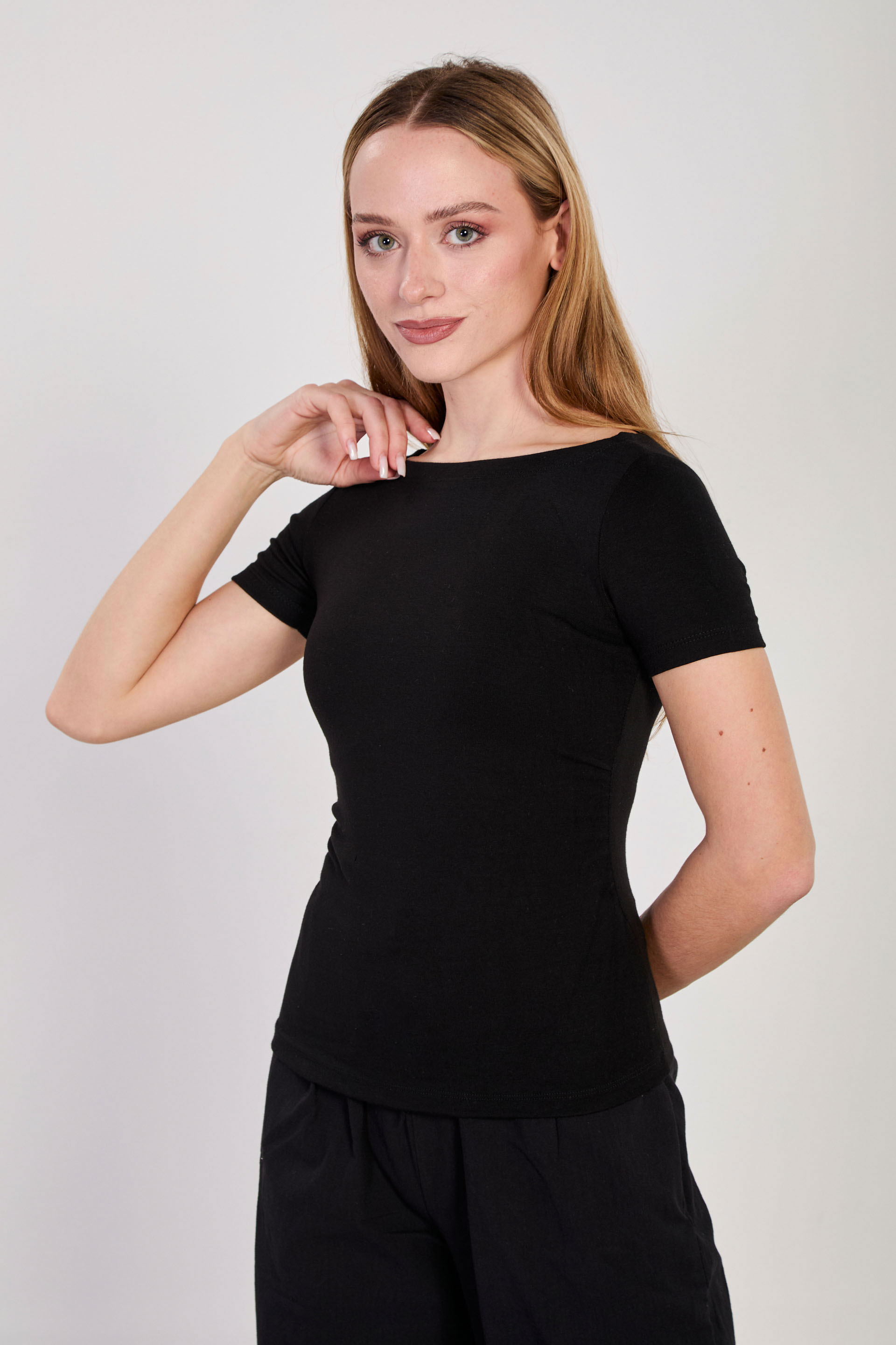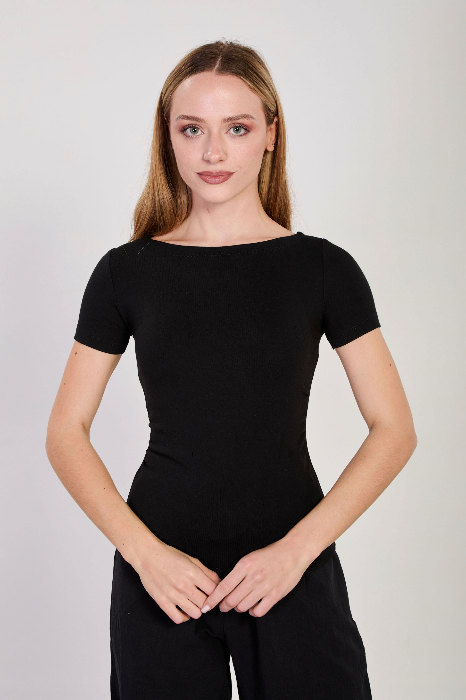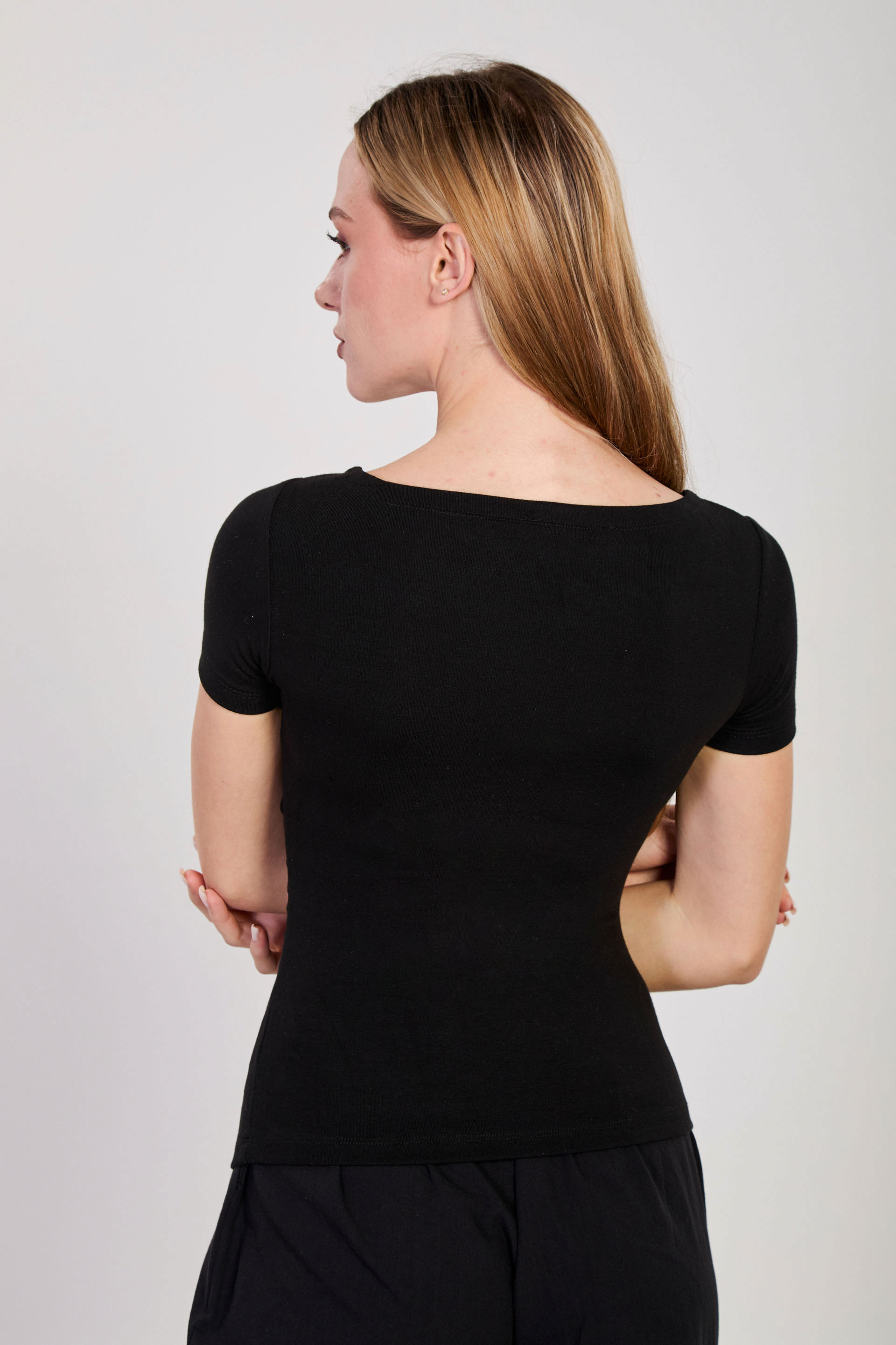 Kadın Kayık Yaka Yanı Büzgülü Kısa Kol Body - Siyah