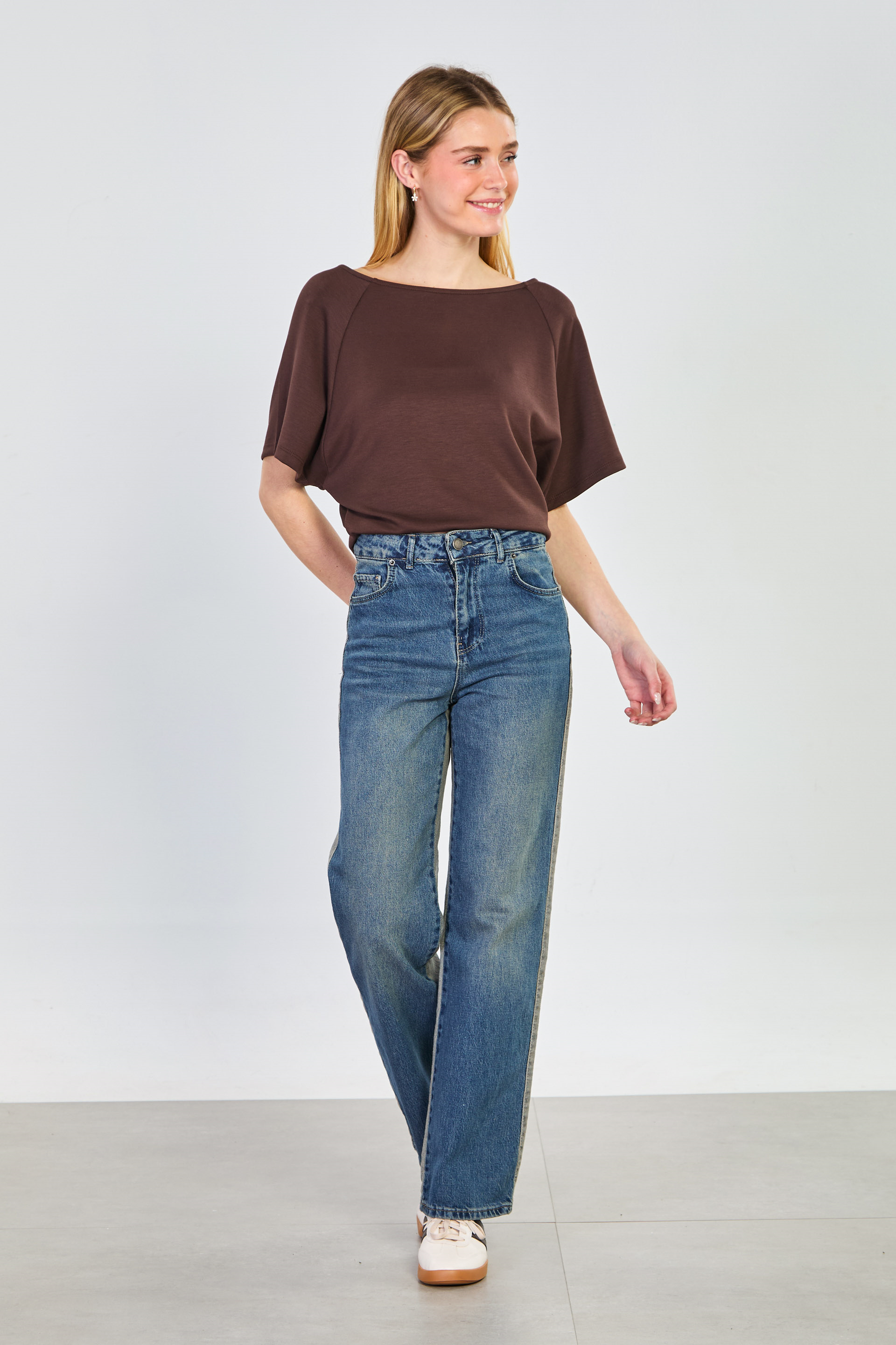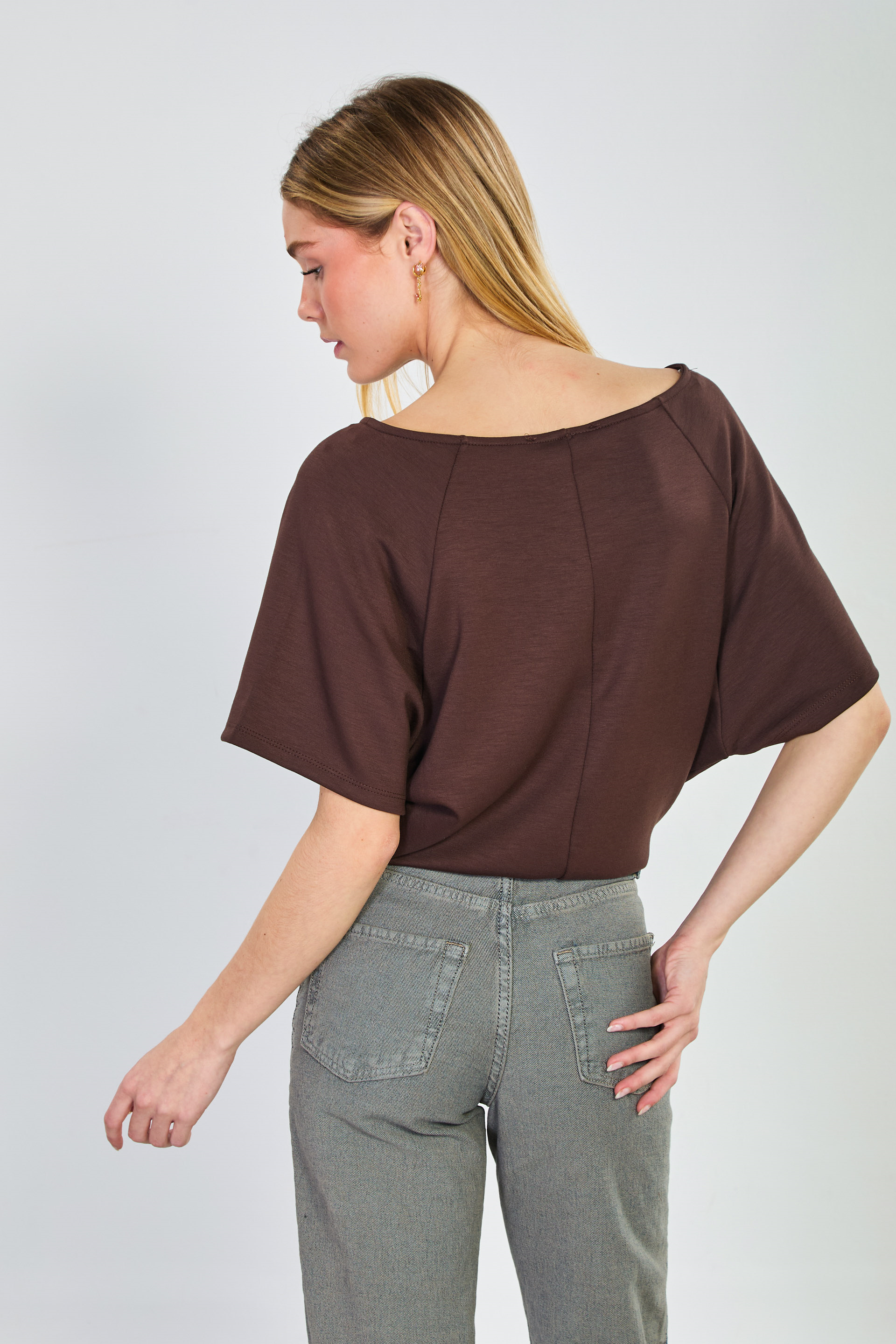 Kadın Kayık Yaka Yarasa Kol T-Shirt - Acı Kahve