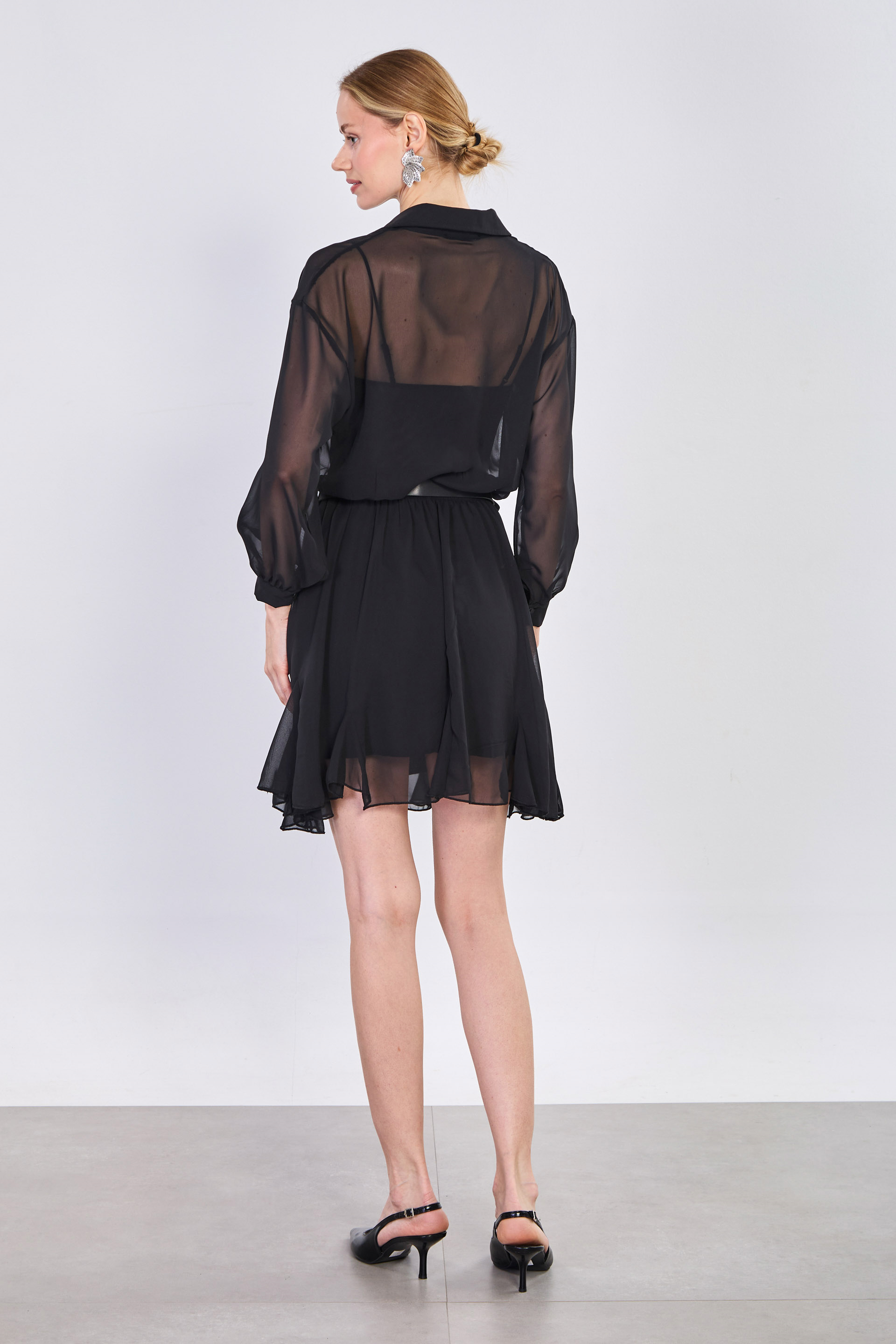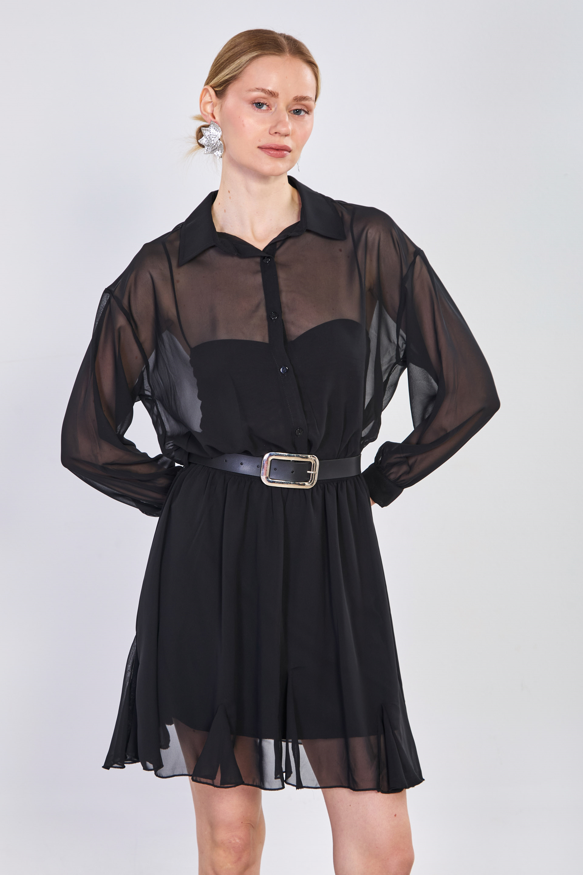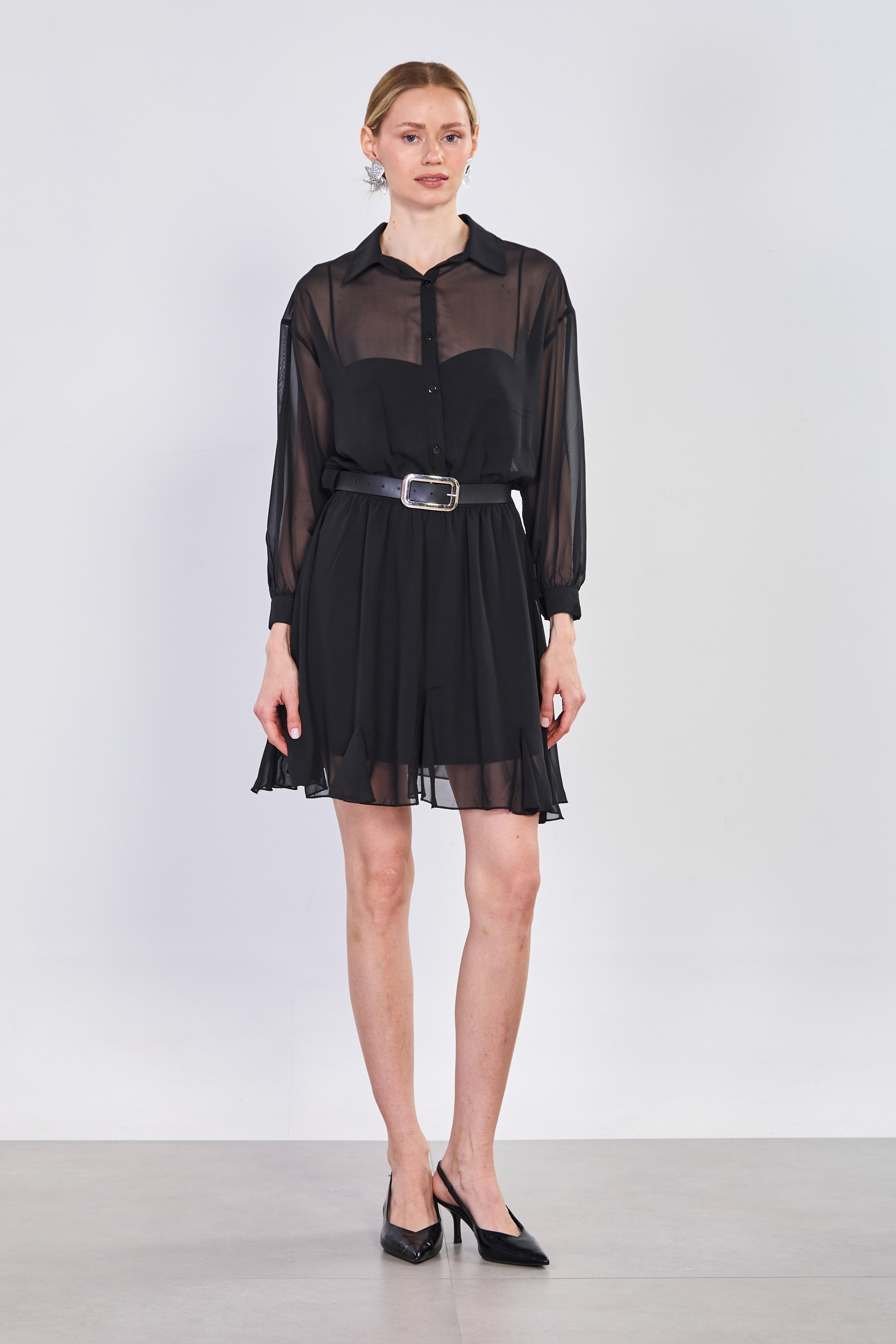 Kadın Kemerli Astarlı Şifon Elbise - Siyah