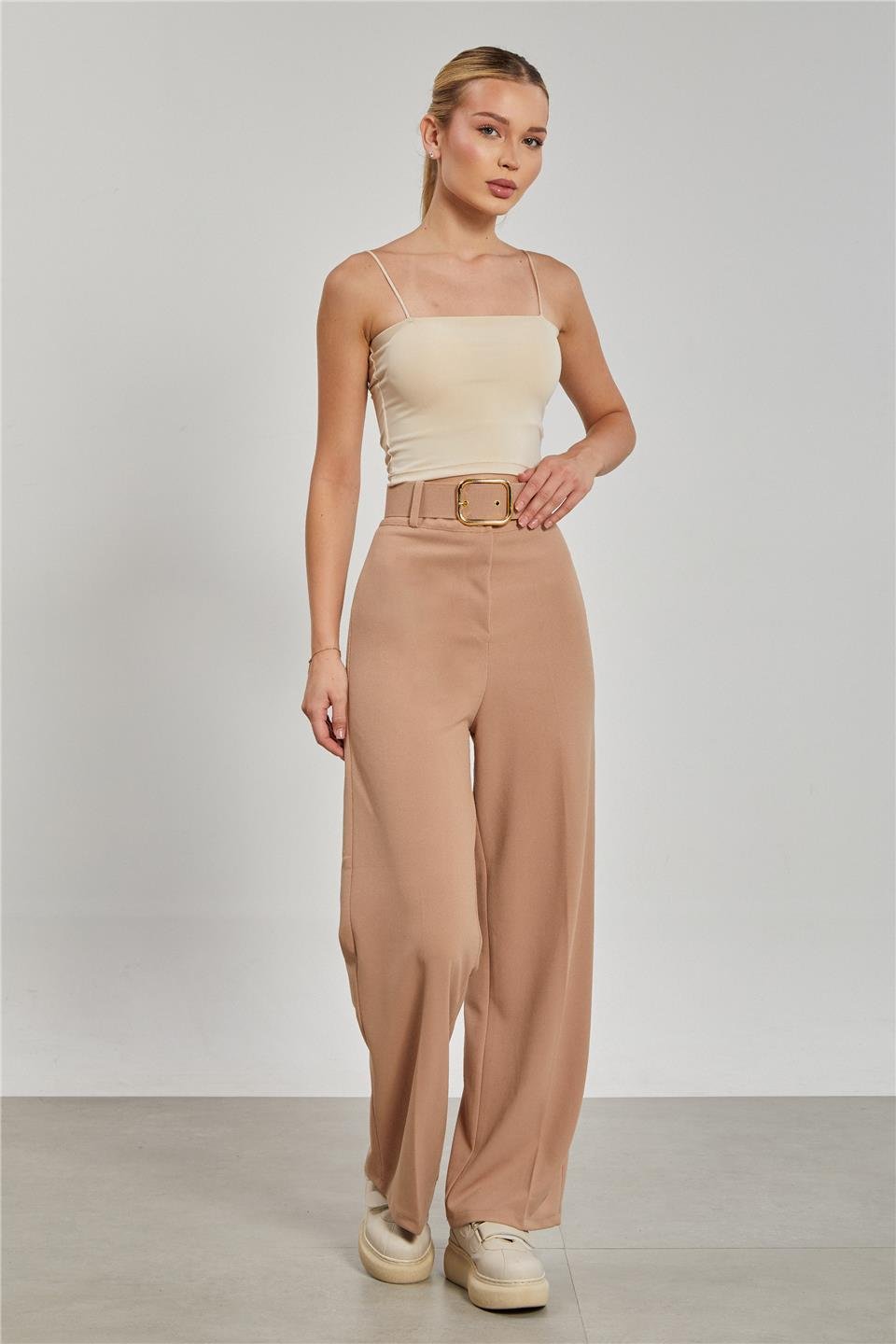 Kadın Kemerli Bol Paça Kumaş Pantolon - Taş