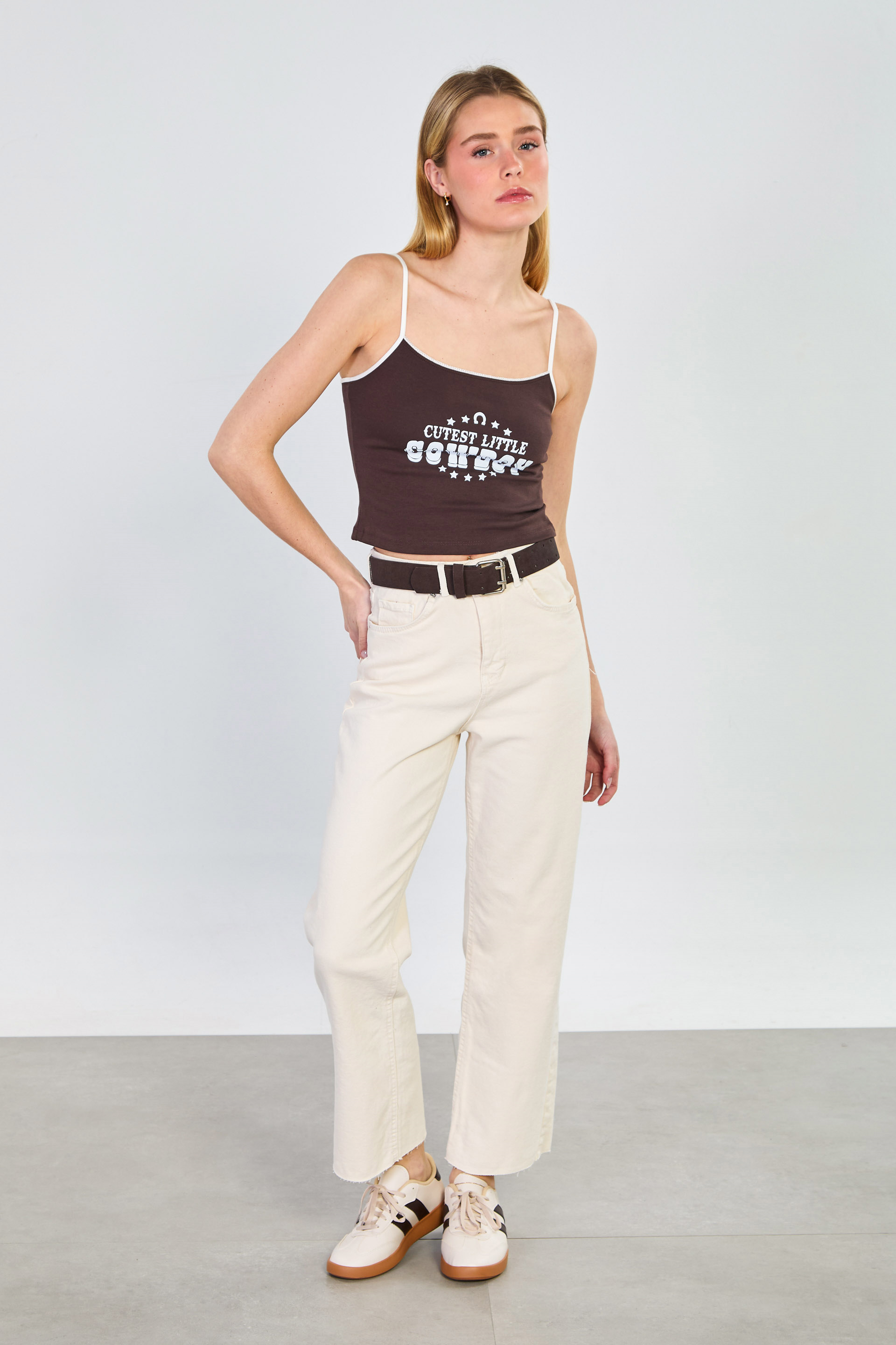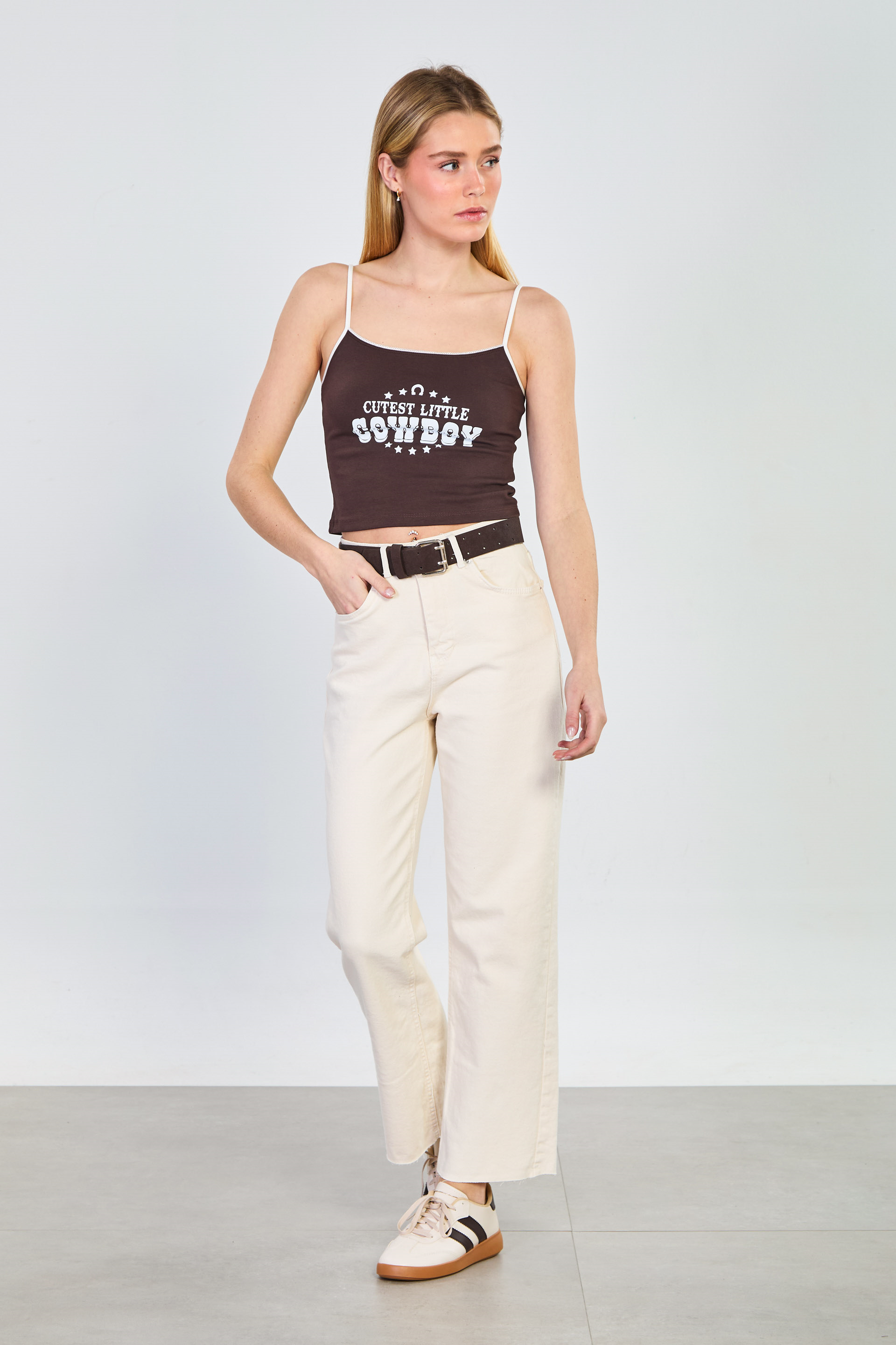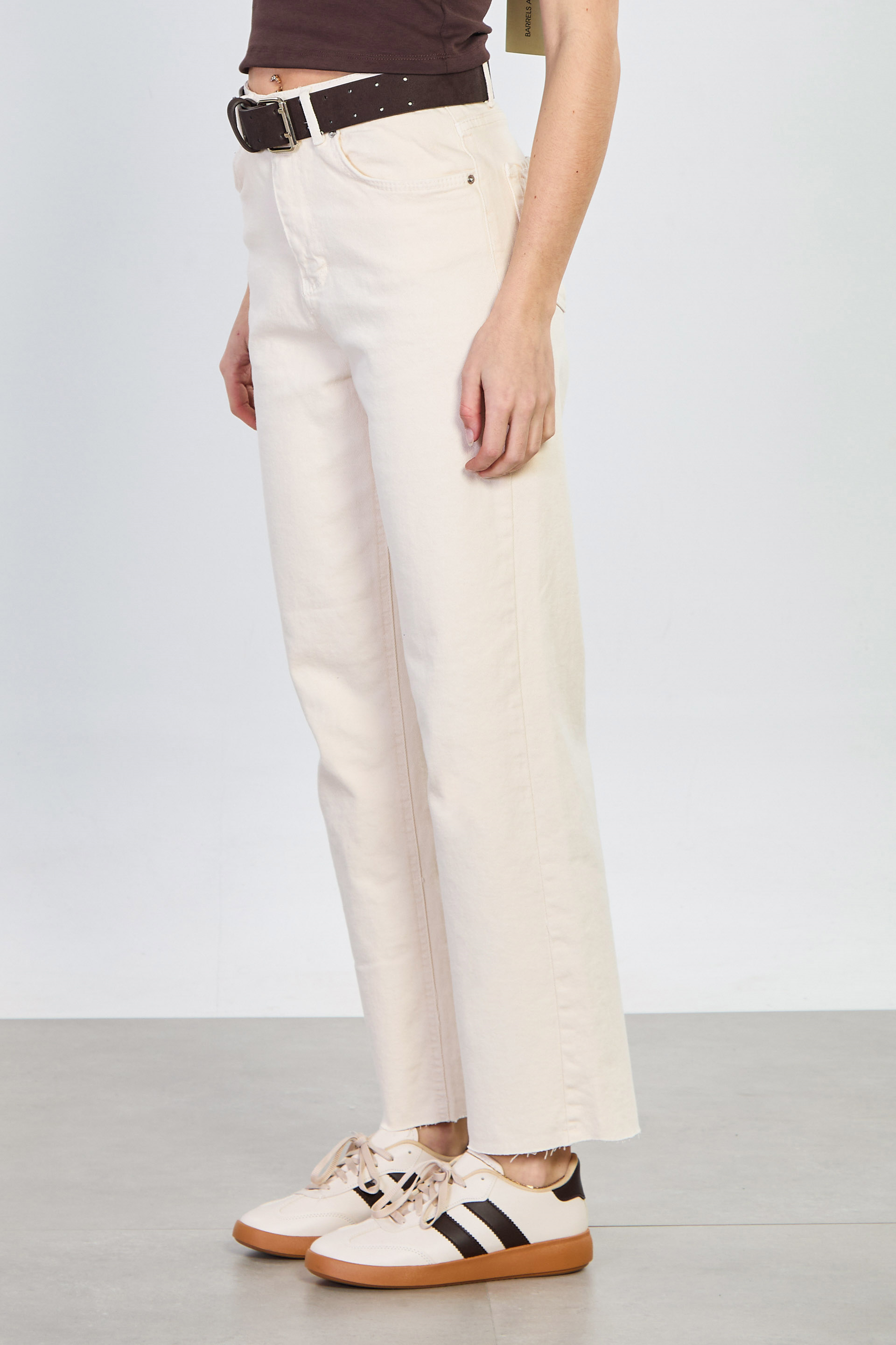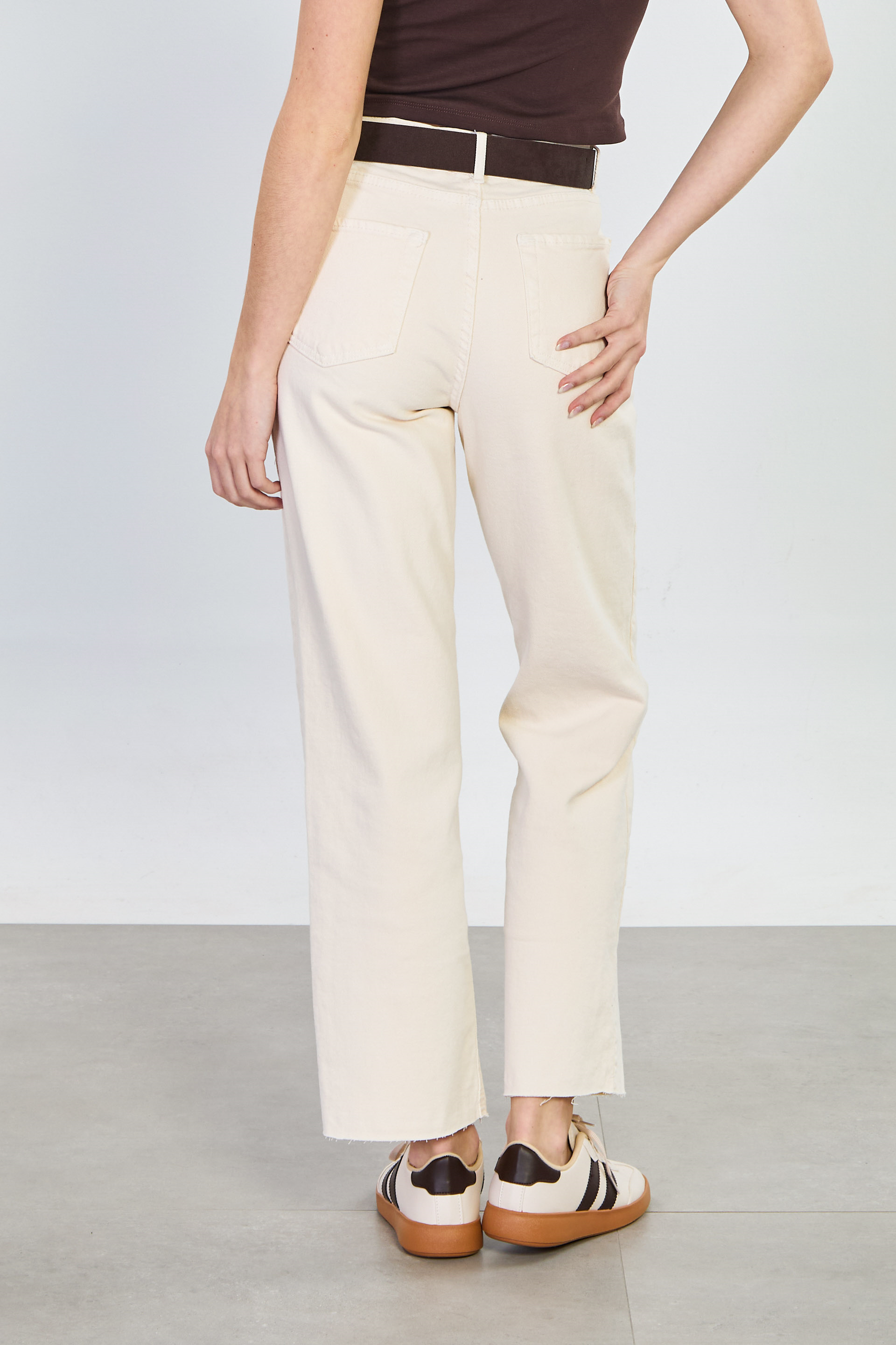 Kadın Kemerli Kesik Paça Jean Pantolon - Ekru