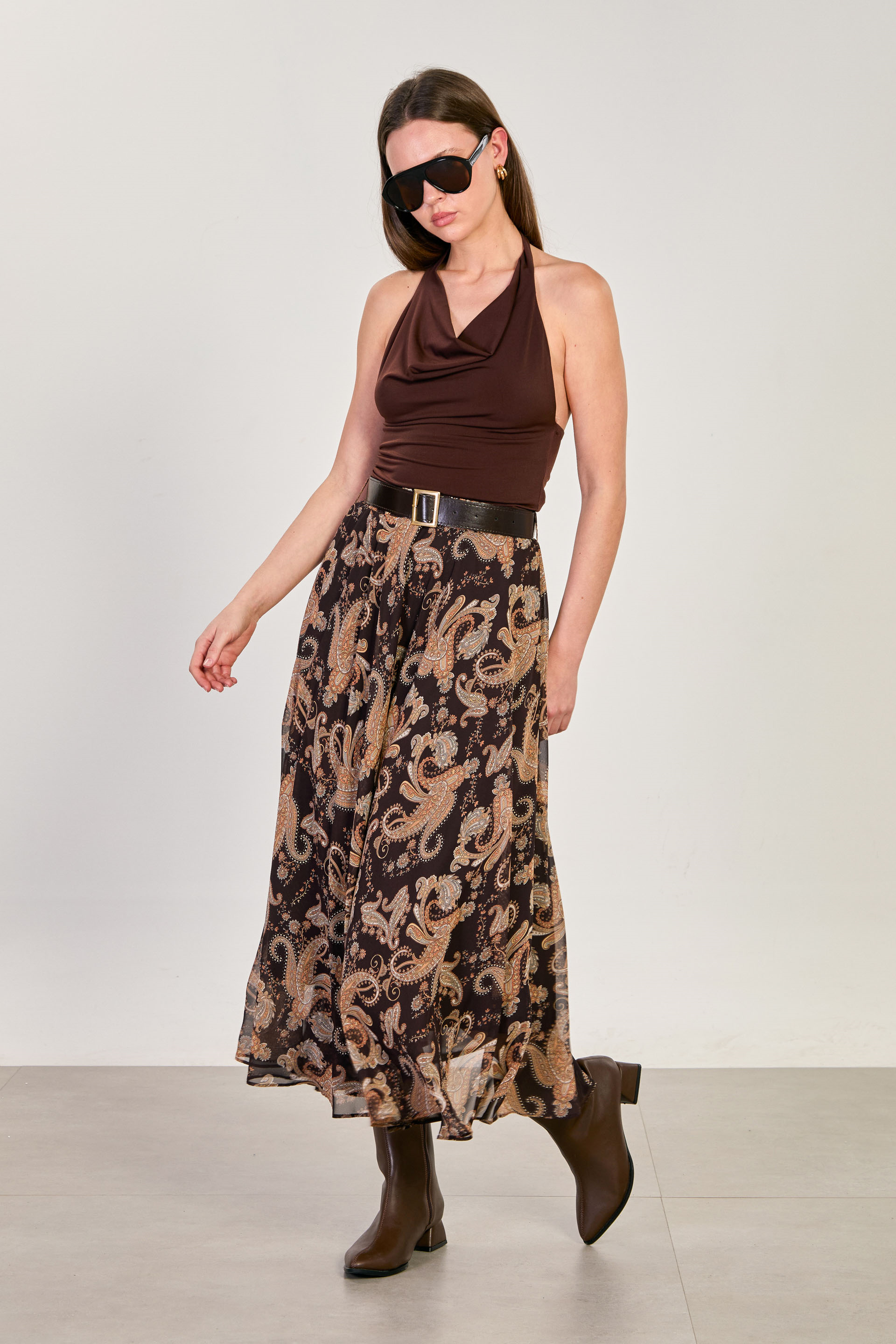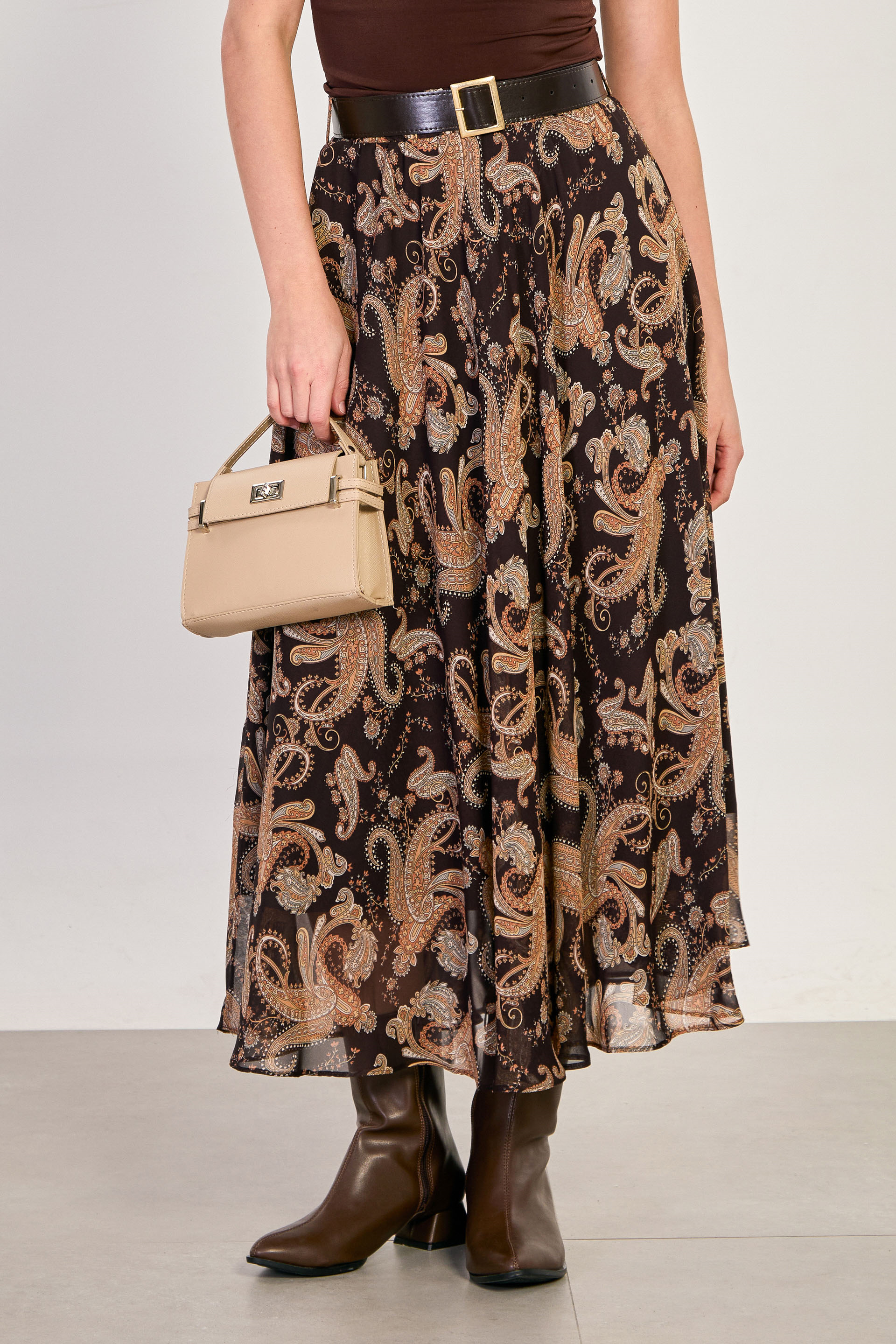 Kadın Kemerli Paisley Desen Midi Şifon Etek - Acı Kahve