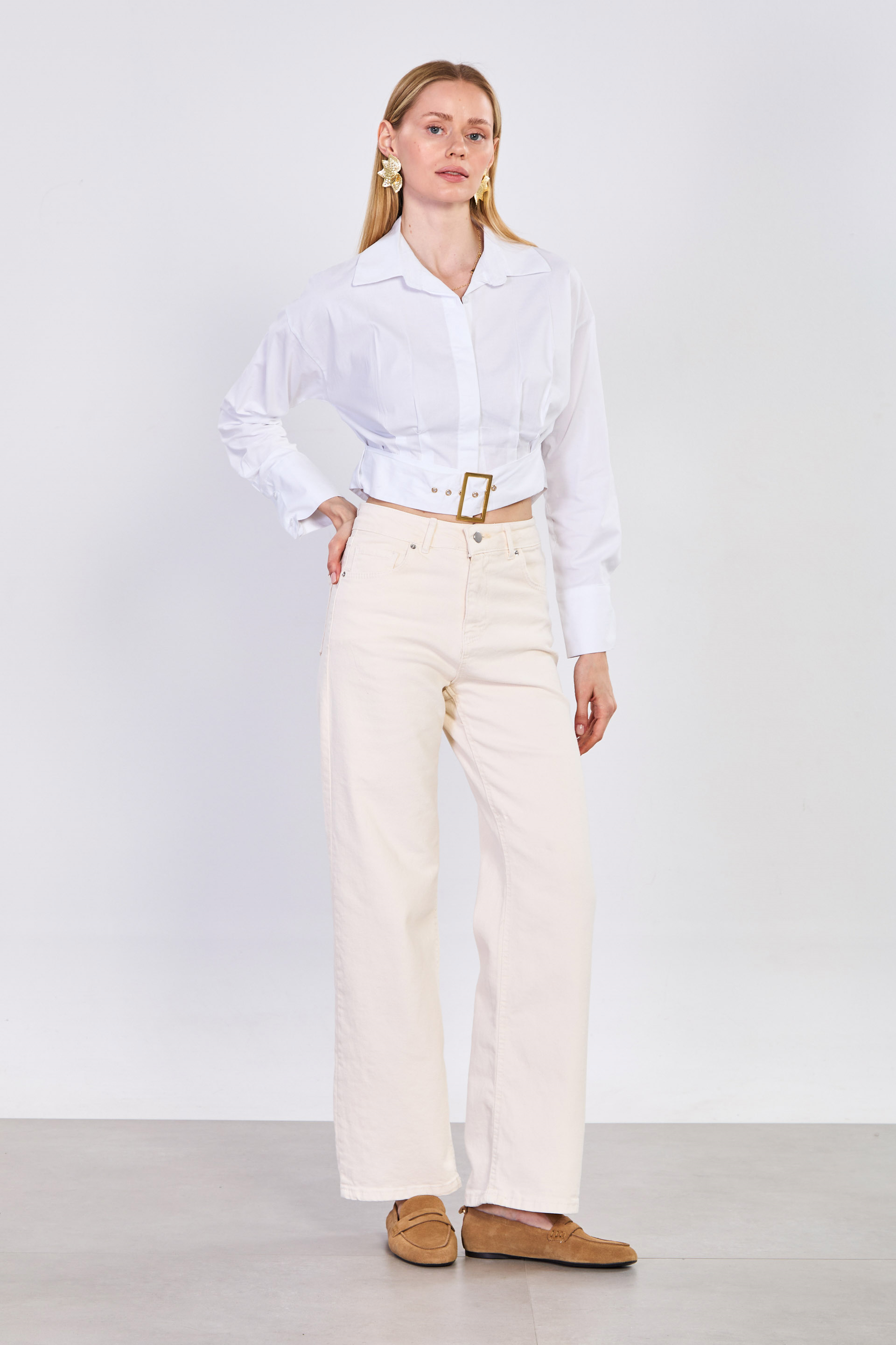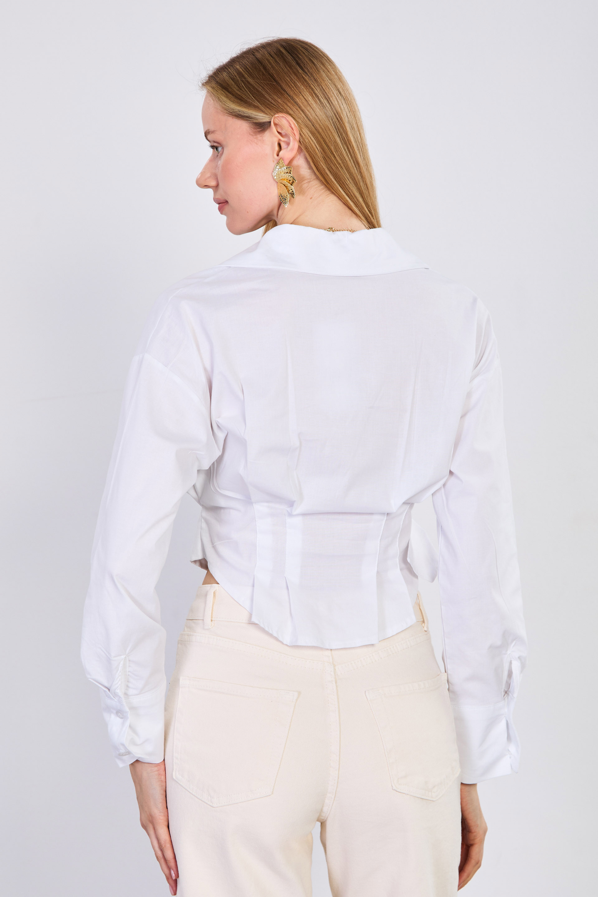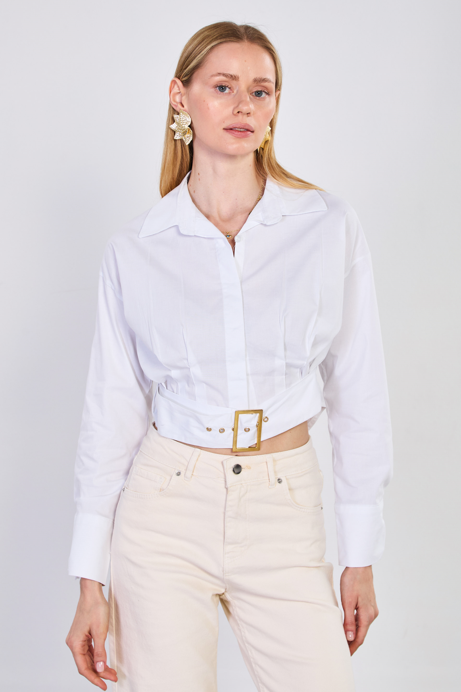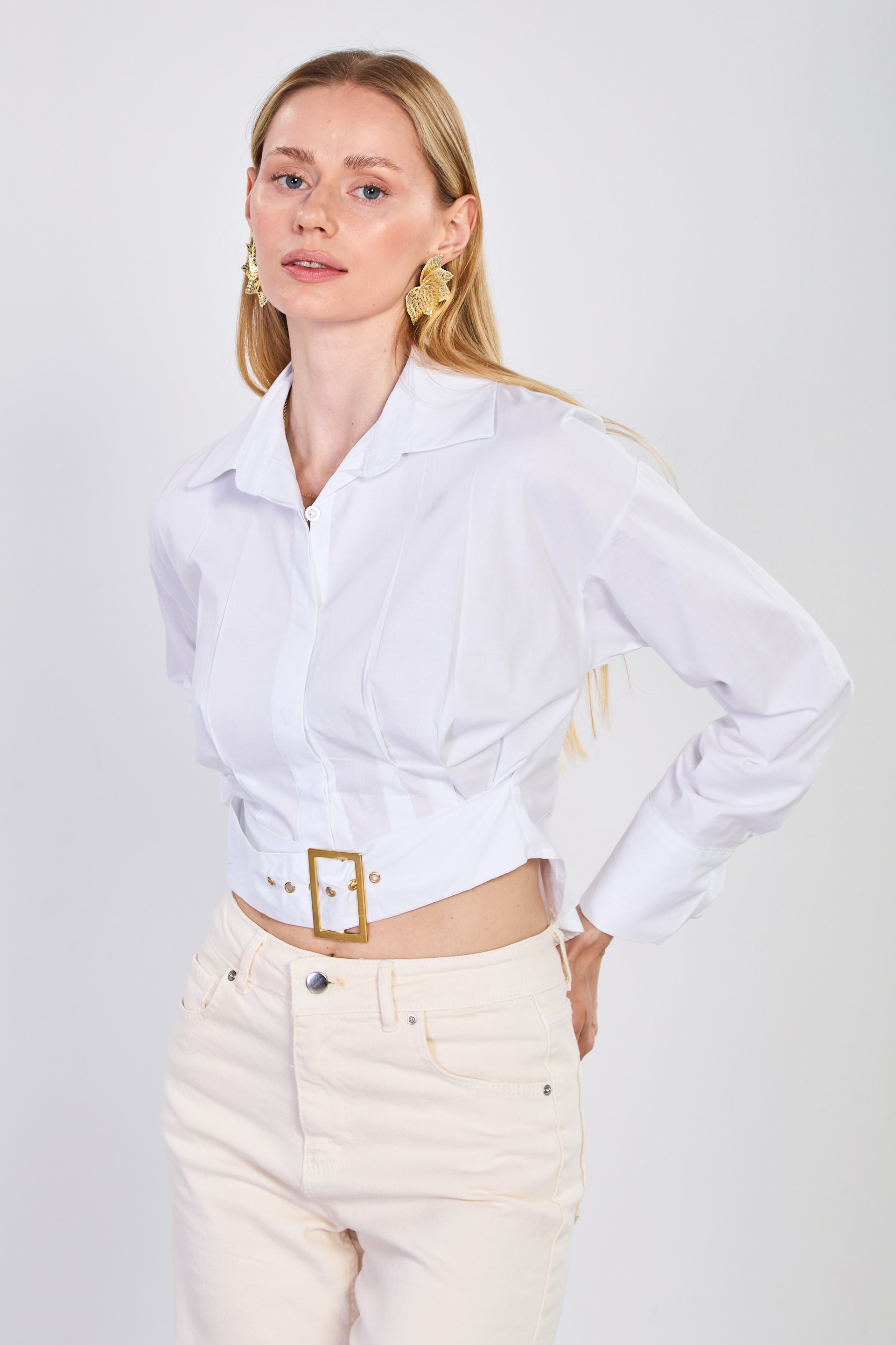 Kadın Kemerli Pensli Uzun Kollu Kısa Gömlek - Beyaz