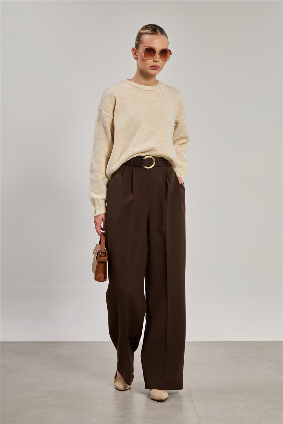 Kadın Kemerli Pileli Palazzo Kumaş Pantolon - Kahve