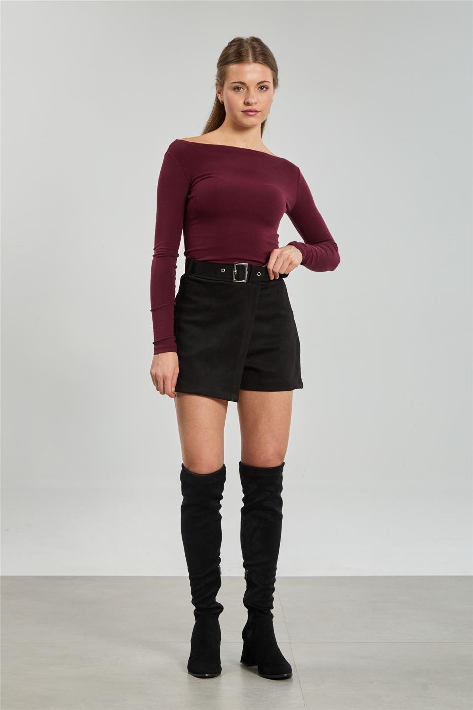 Kadın Kemerli Süet Şort Etek - Siyah