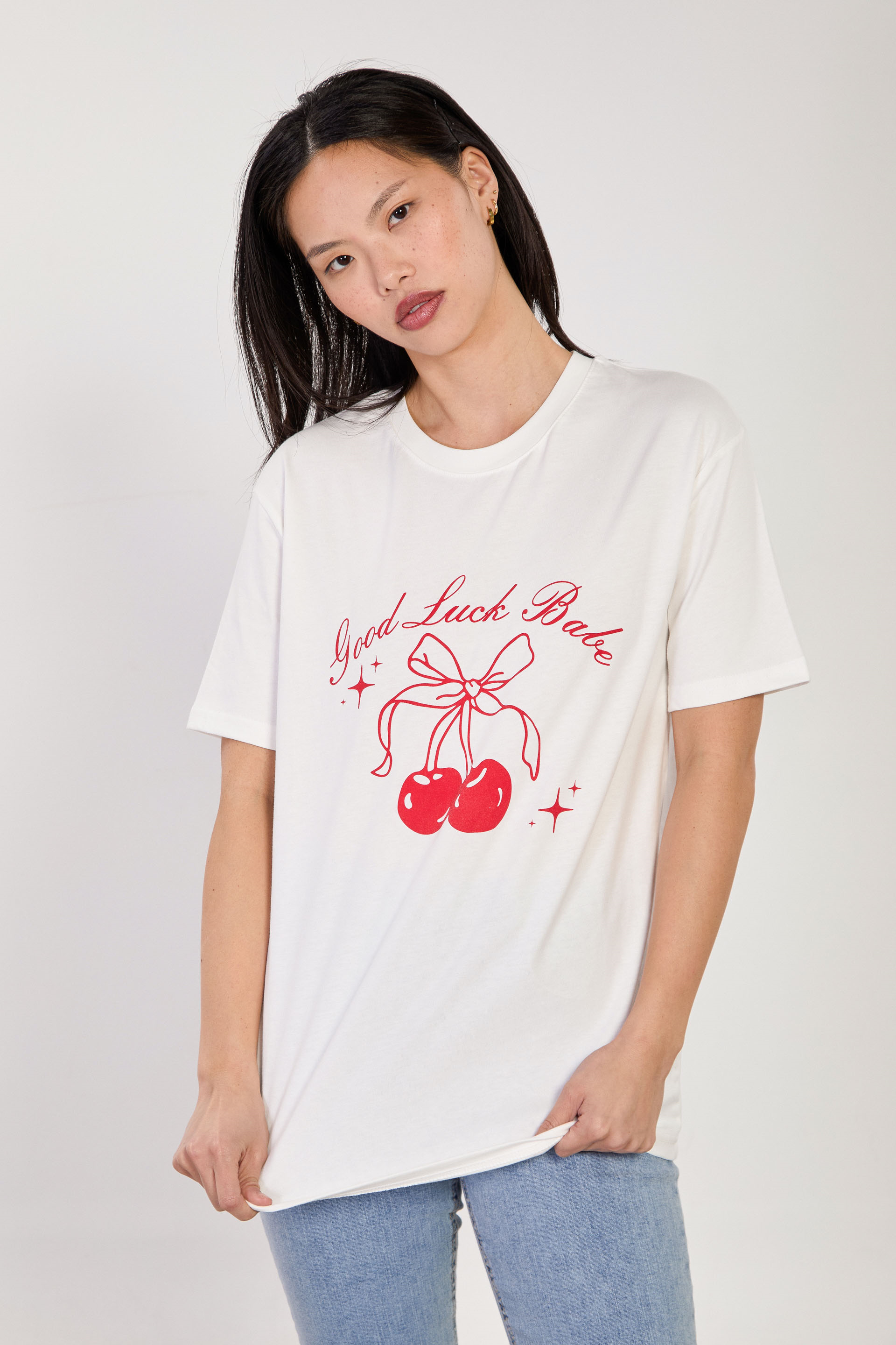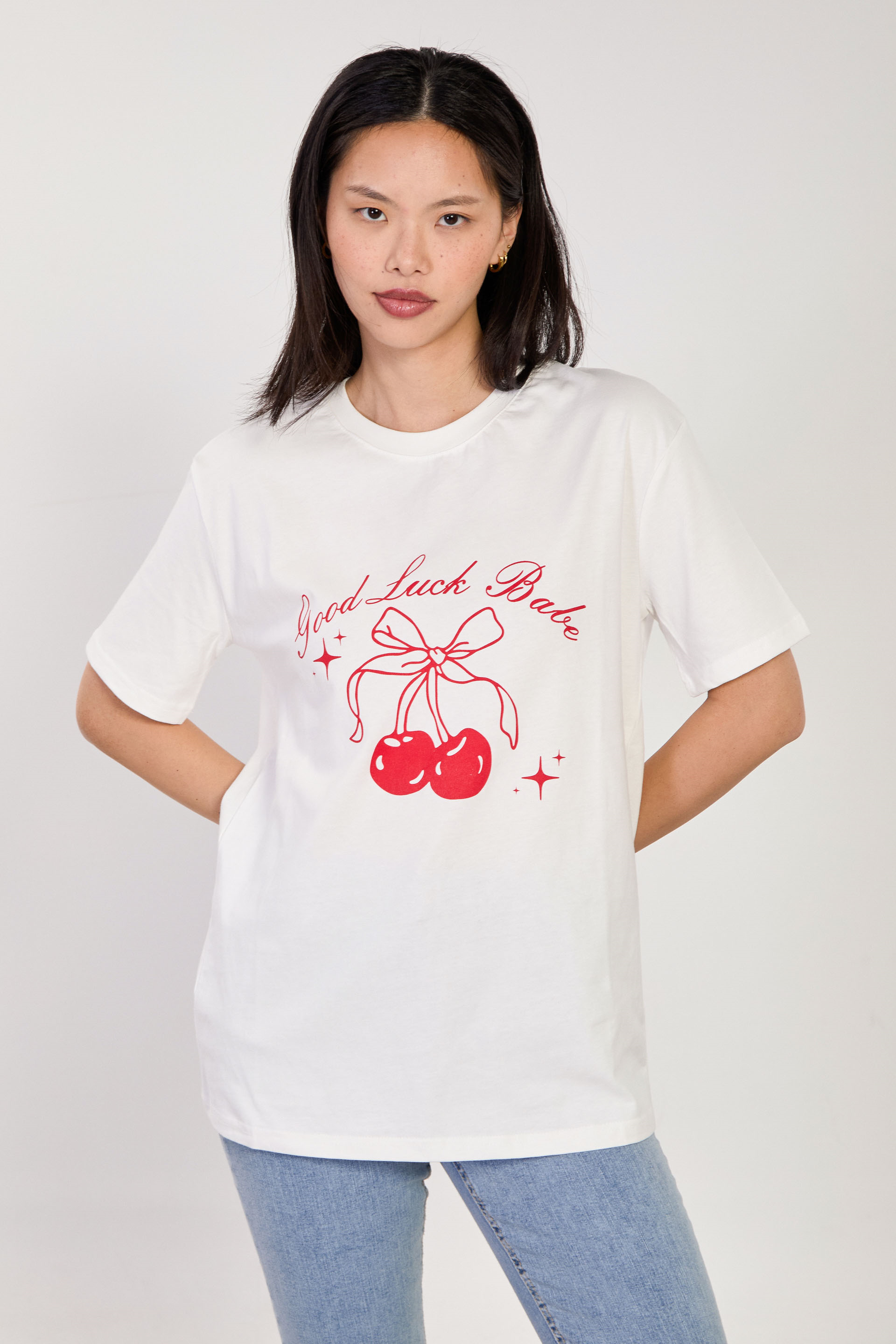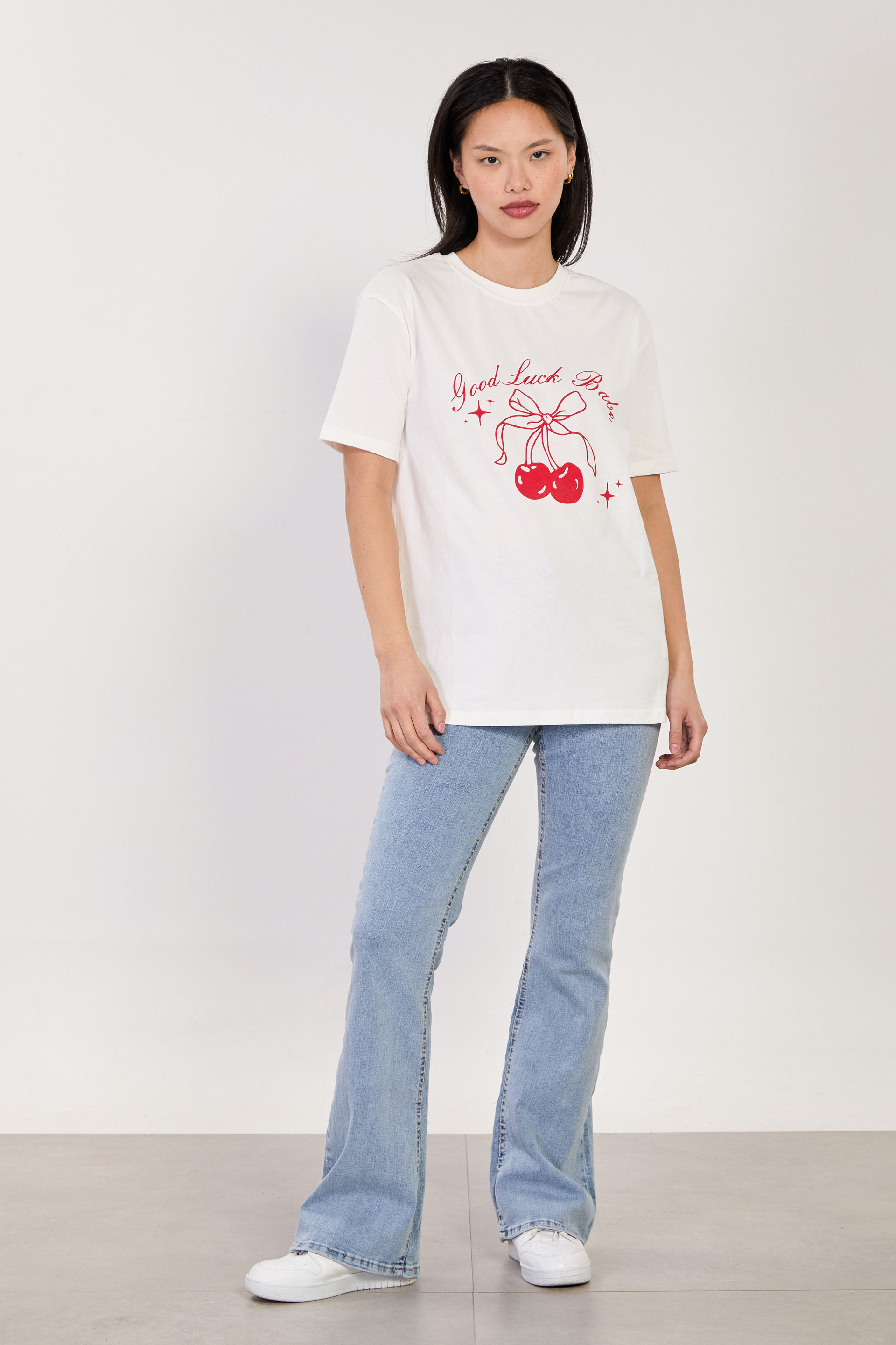 Kadın Kiraz Baskılı T-Shirt - Ekru