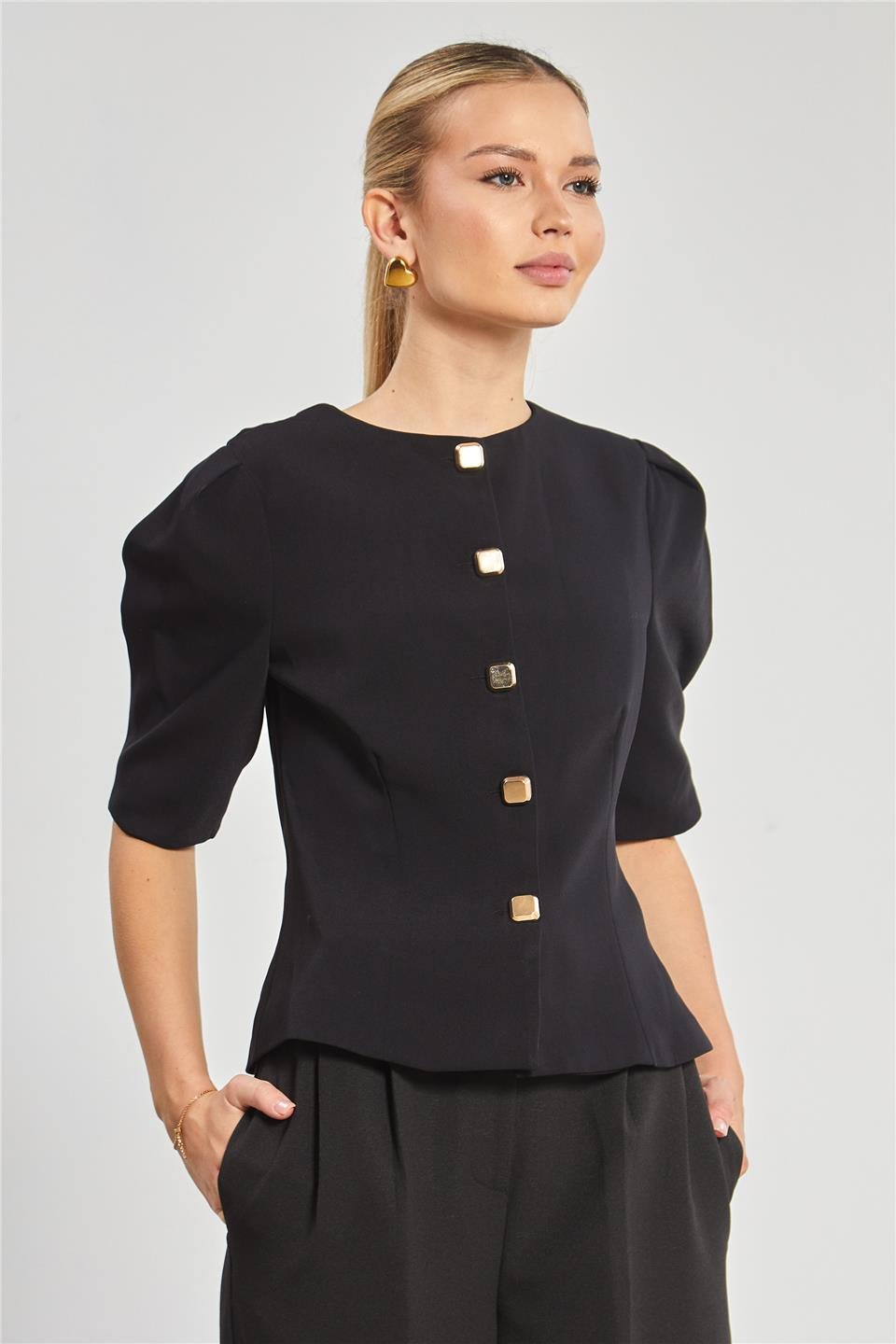 Kısa Kol Düğme Detay Kadın Ceket - Siyah