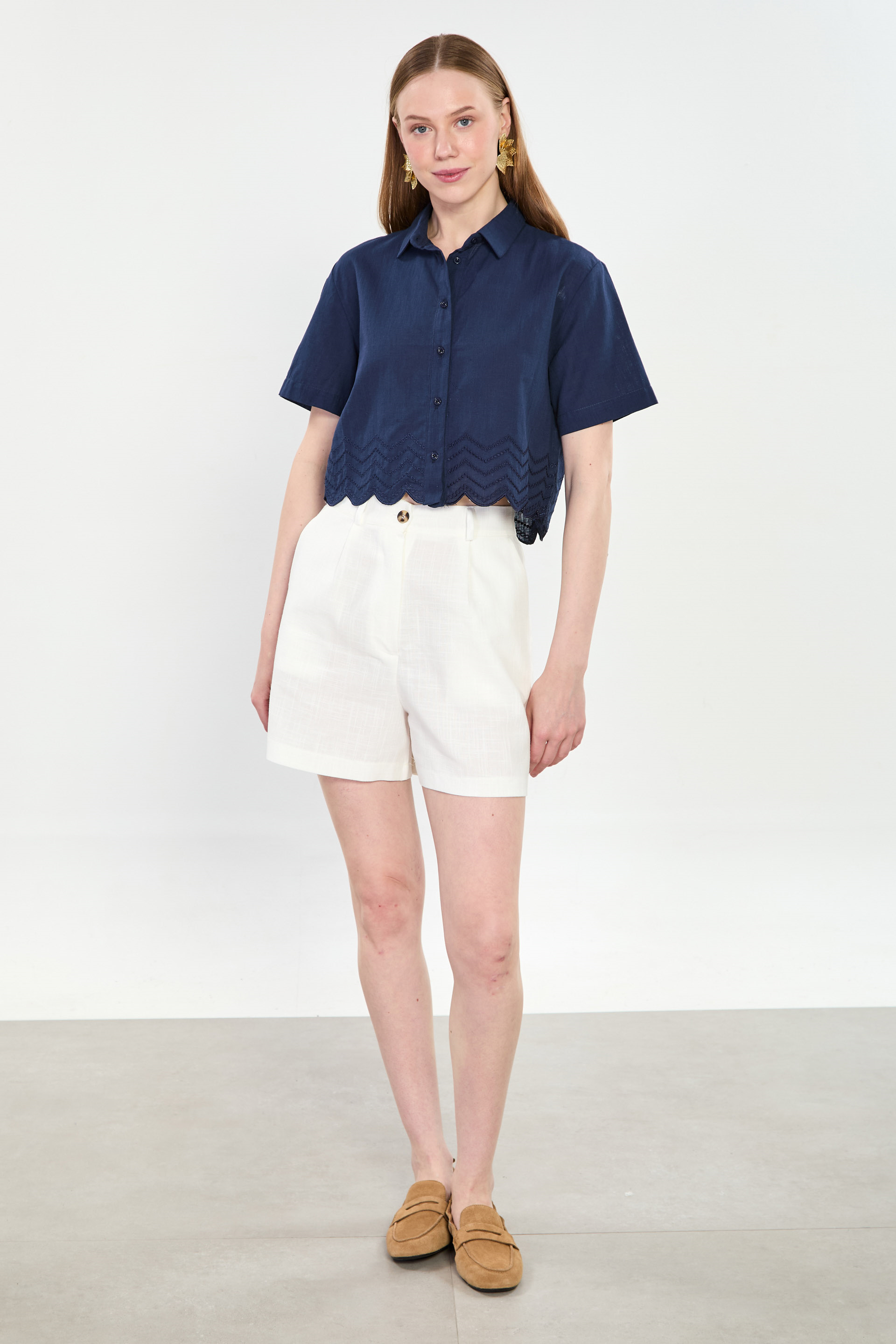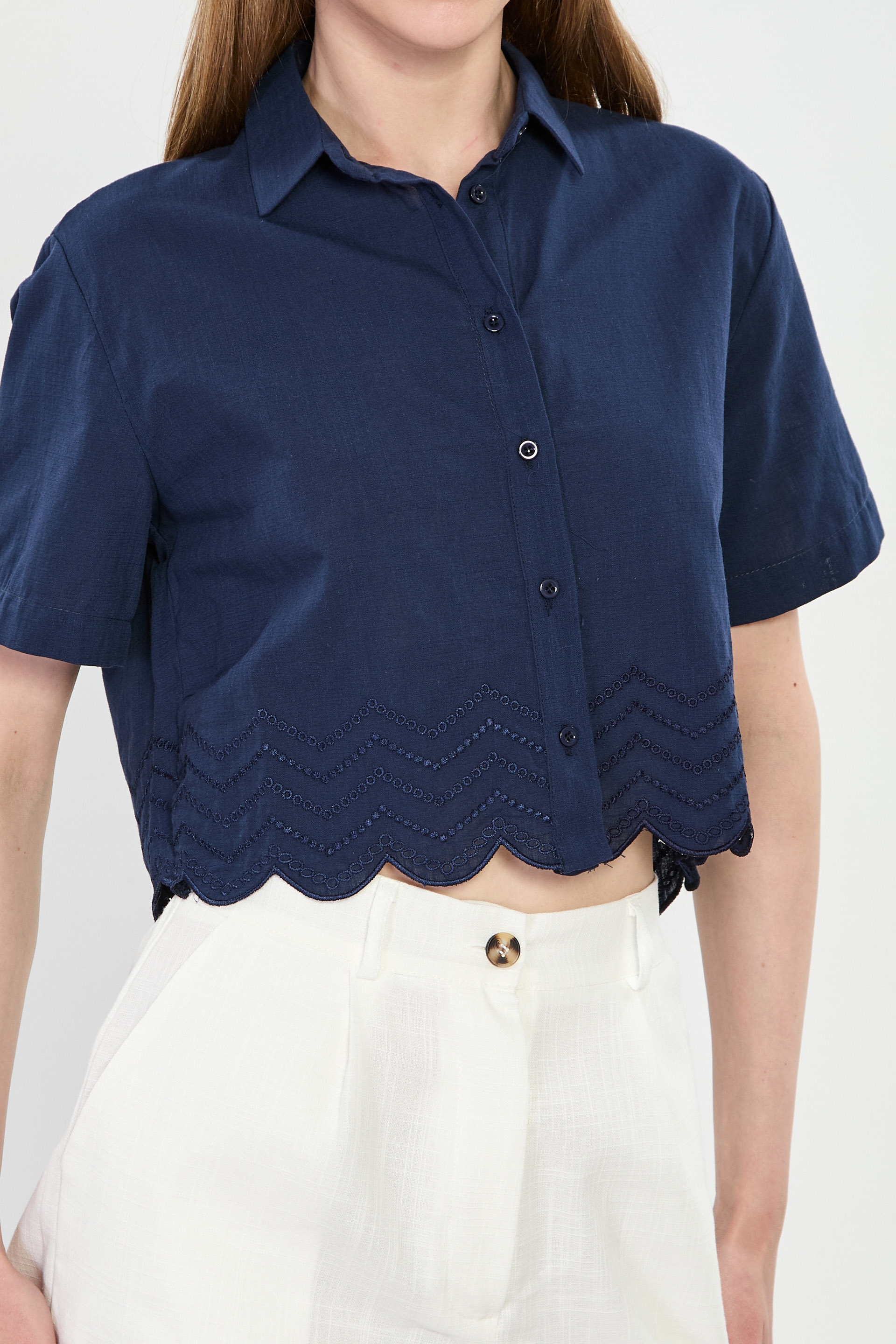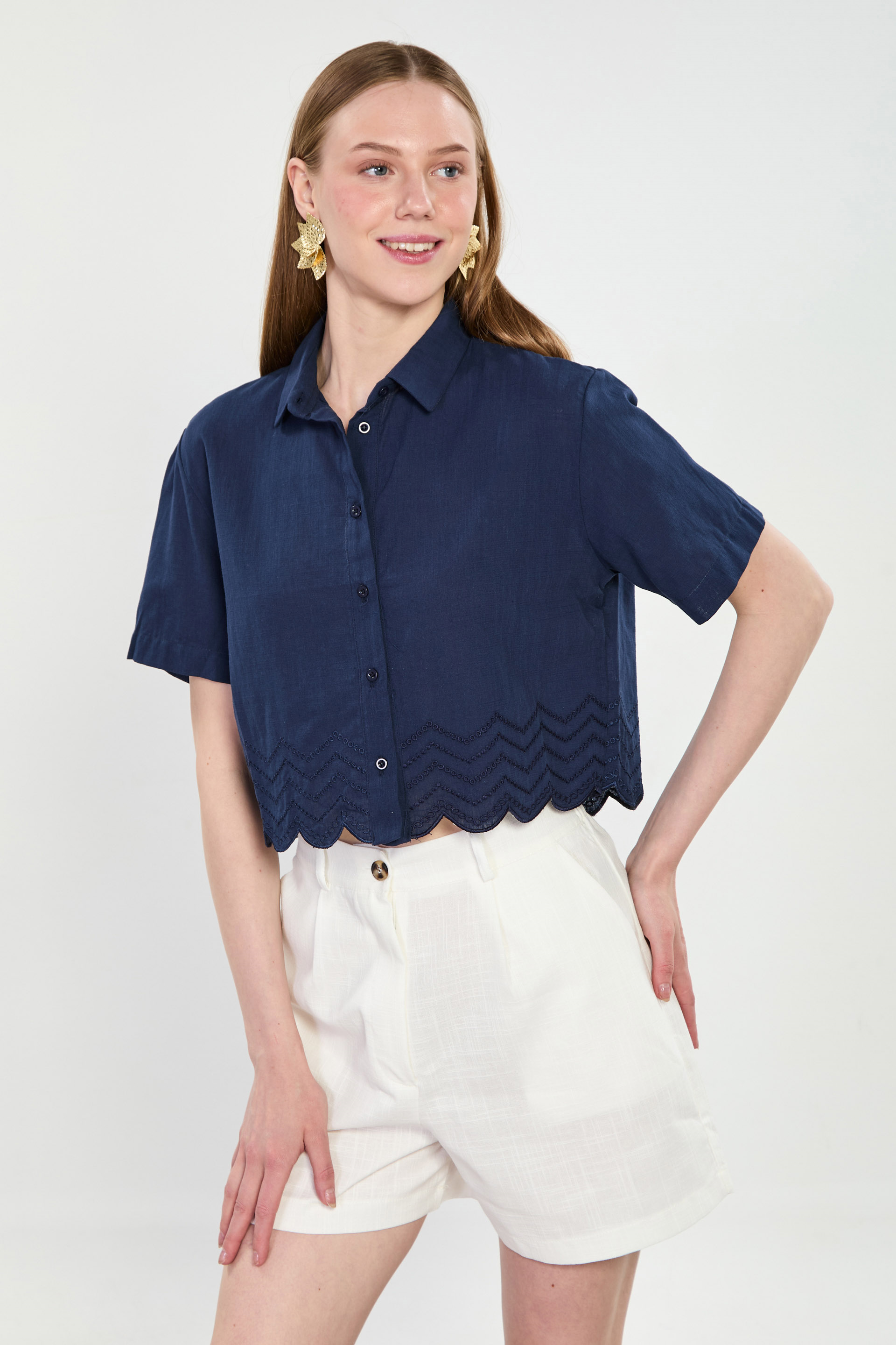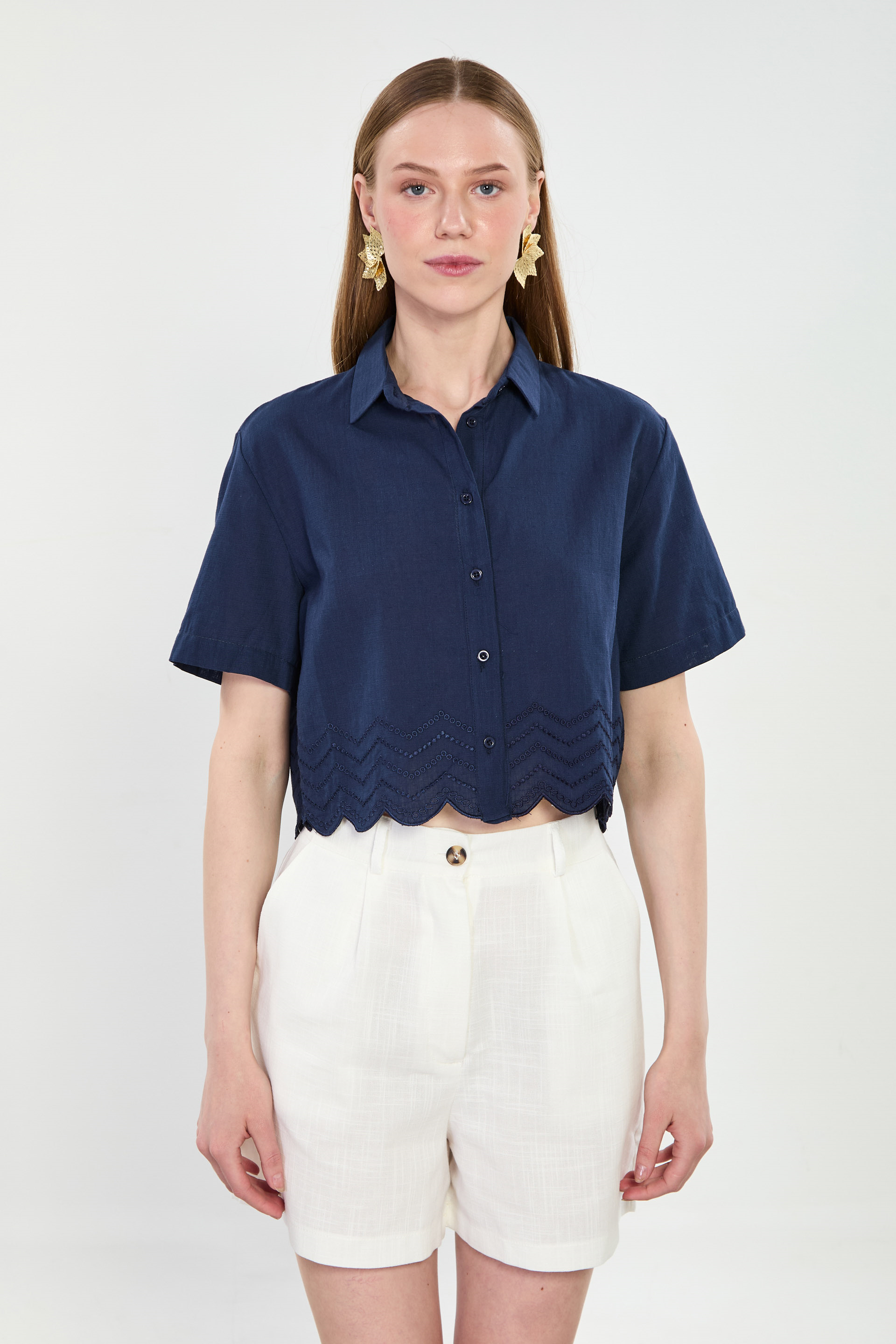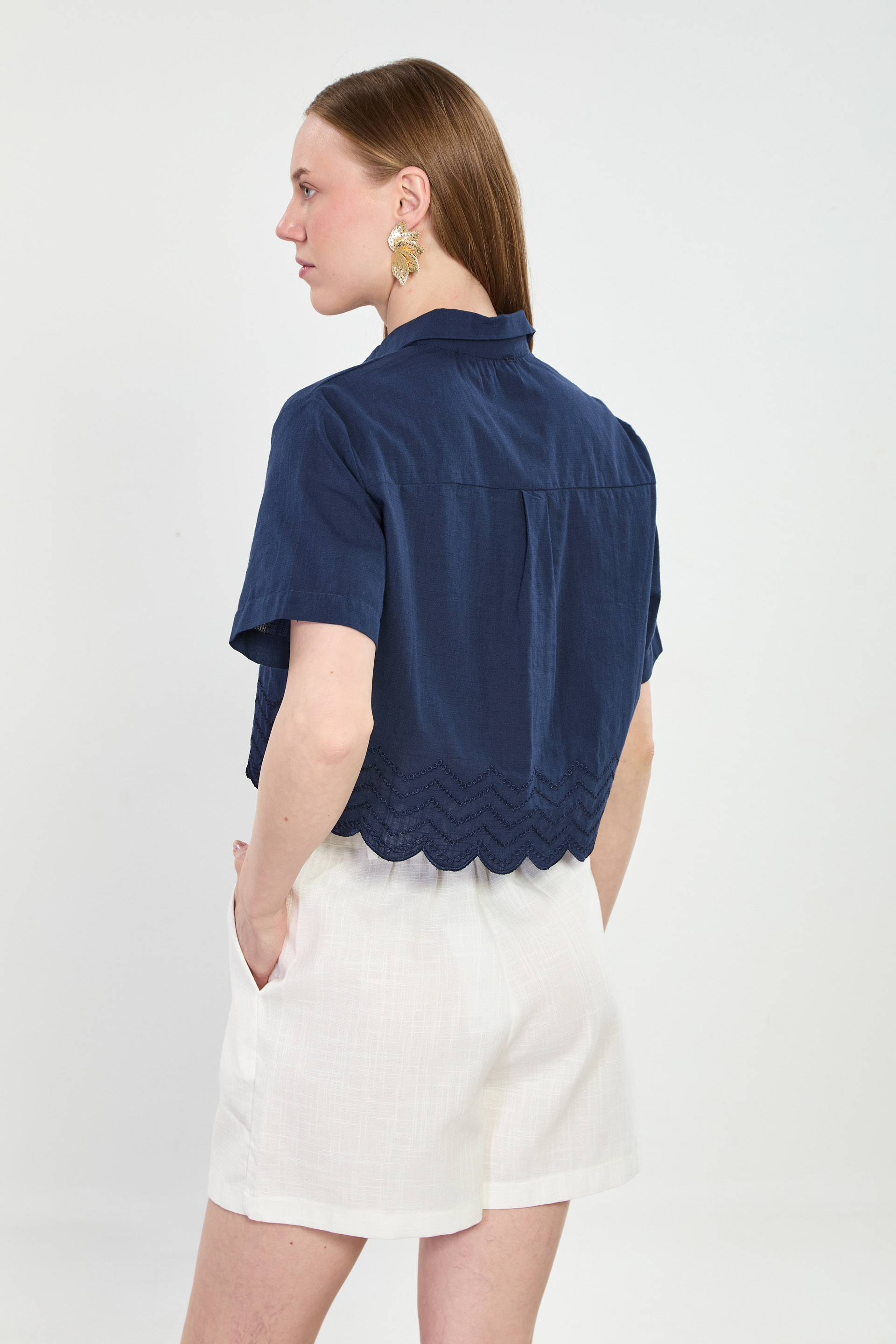 Kısa Kollu Etek Ucu Nakışlı Gömlek - Lacivert