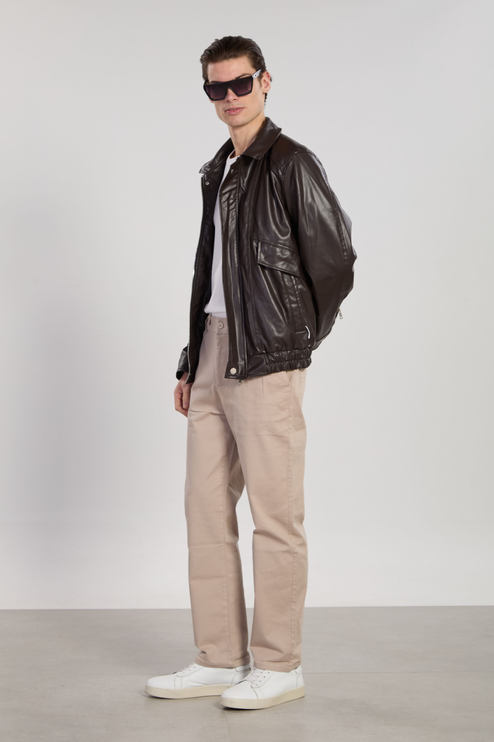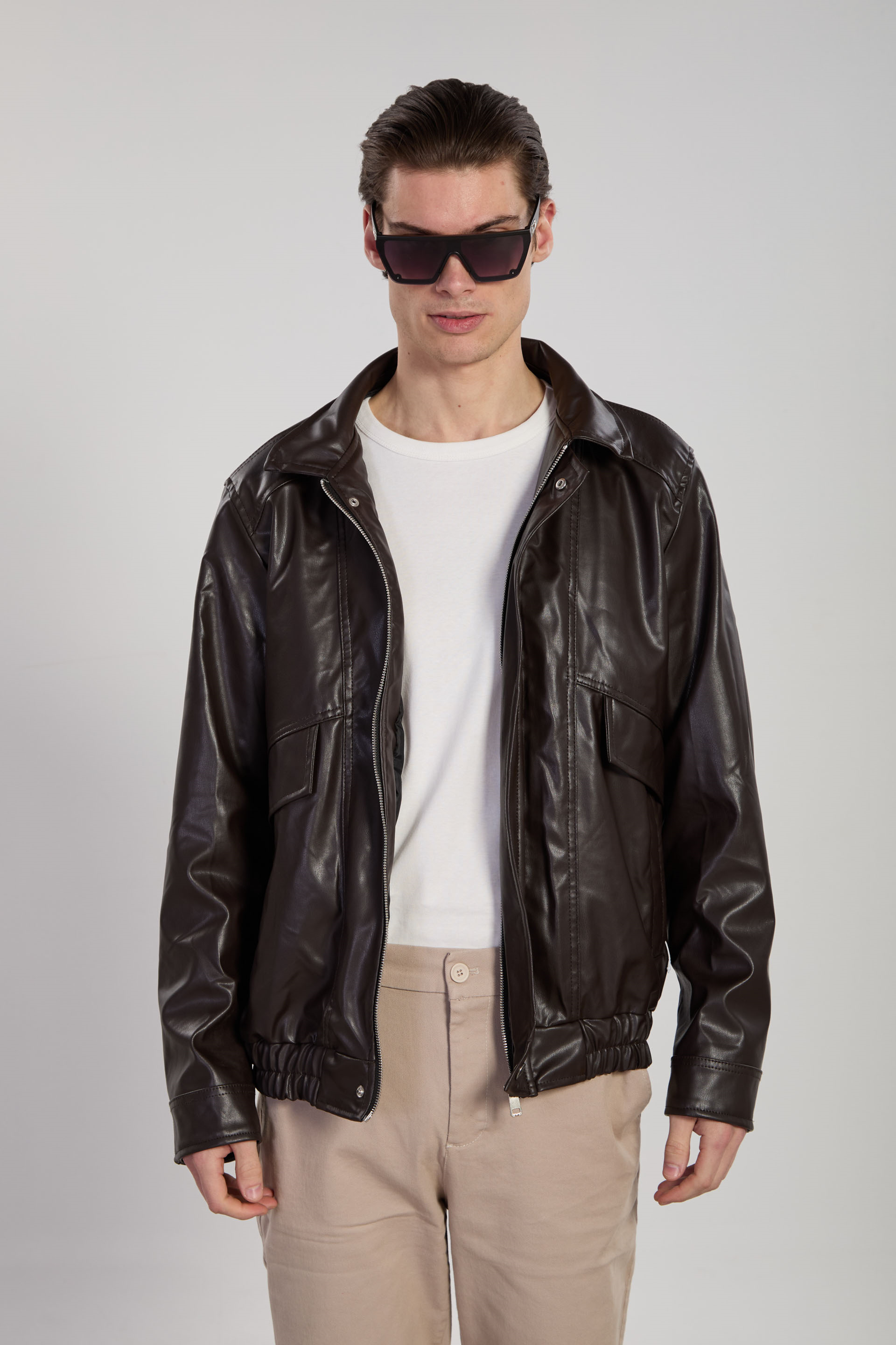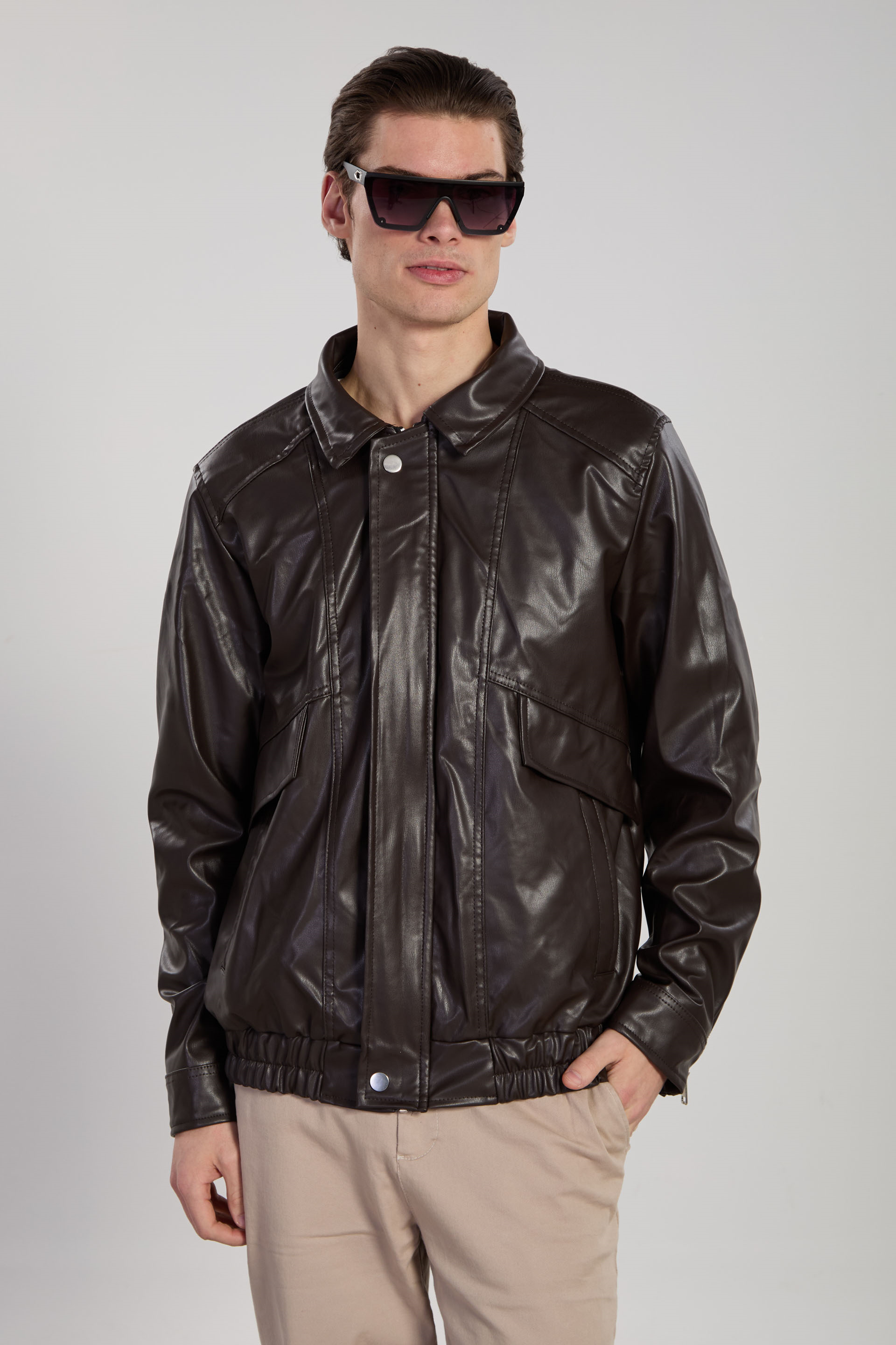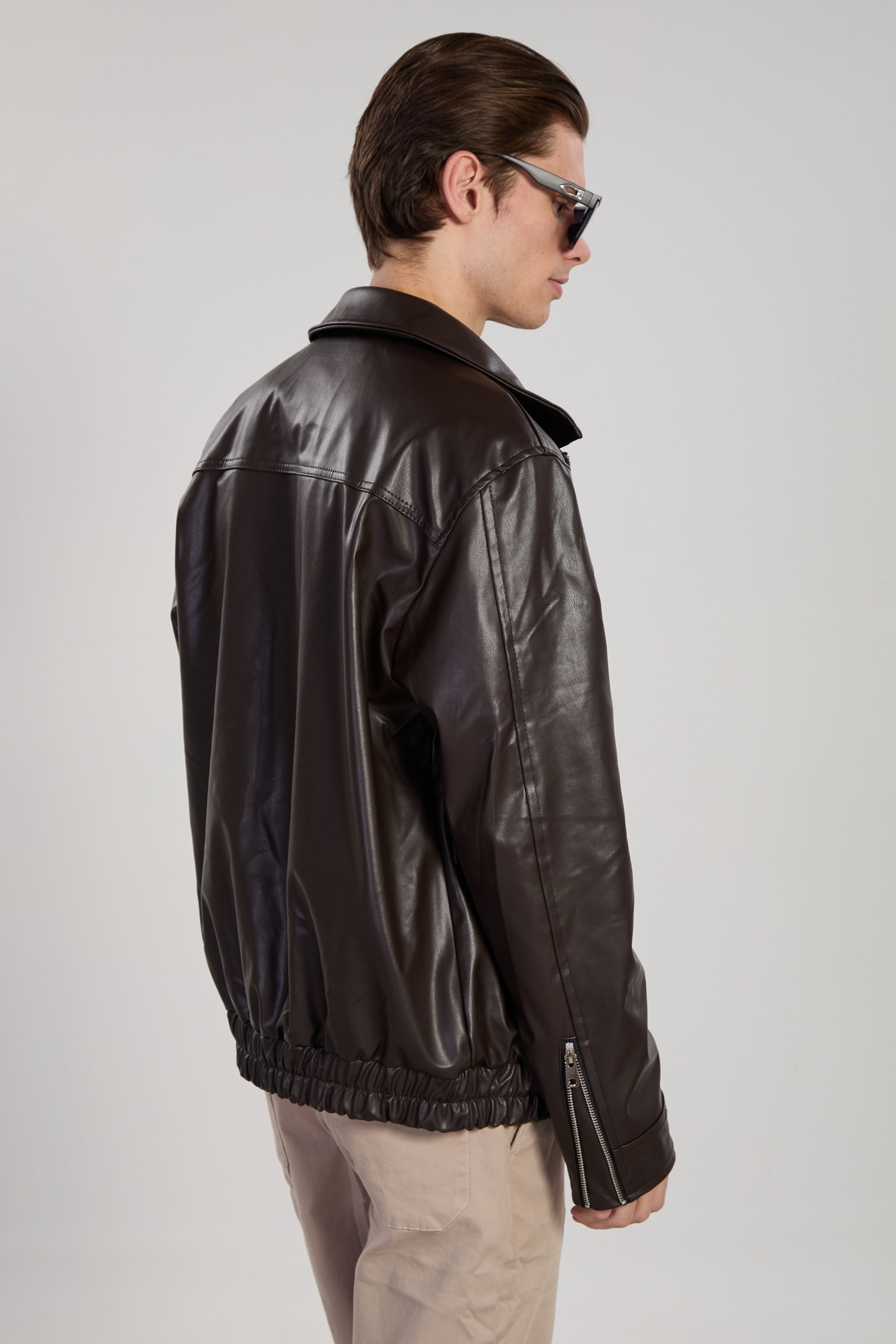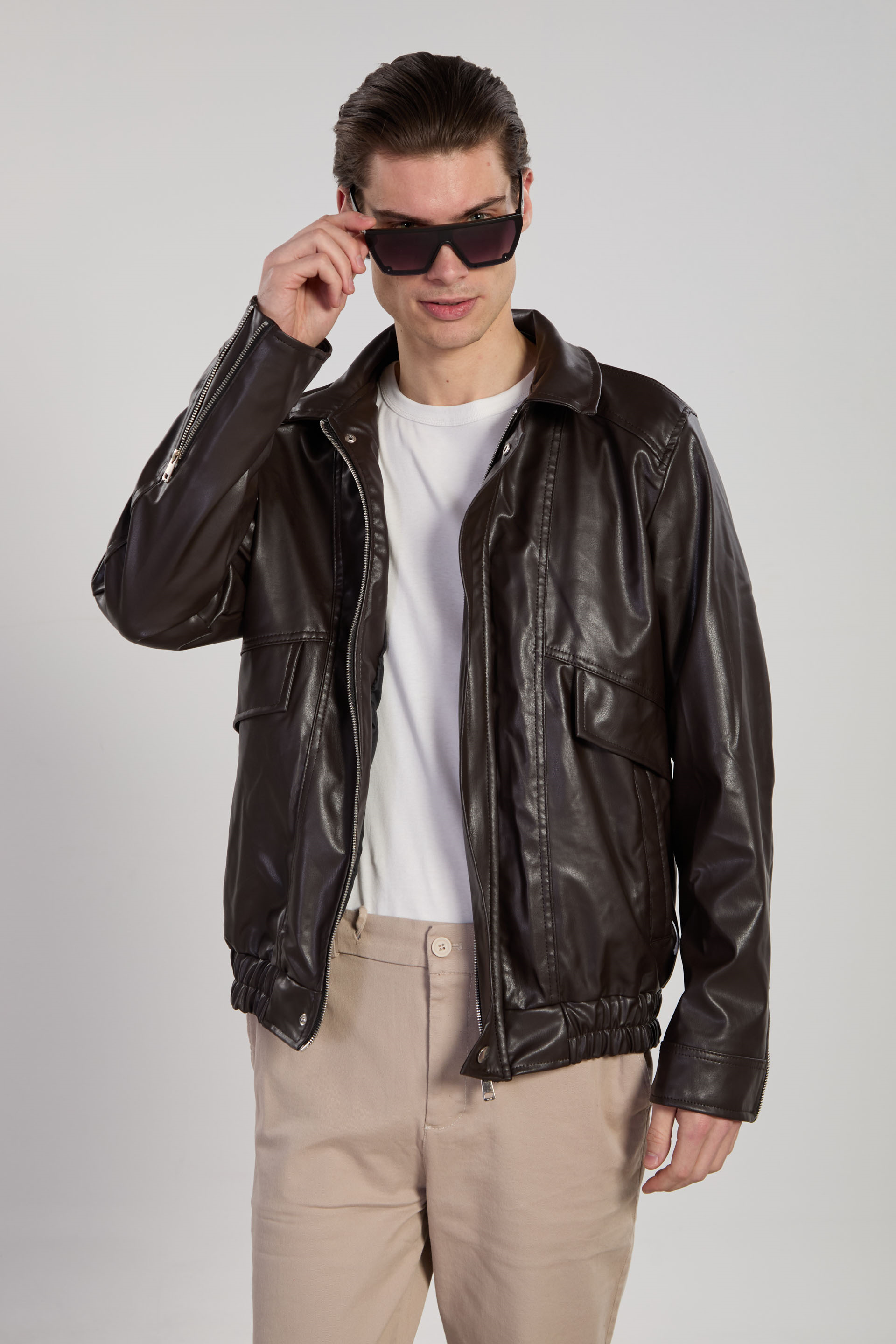 Erkek Kol Fermuarlı Bomber Deri Mont - Acı Kahve