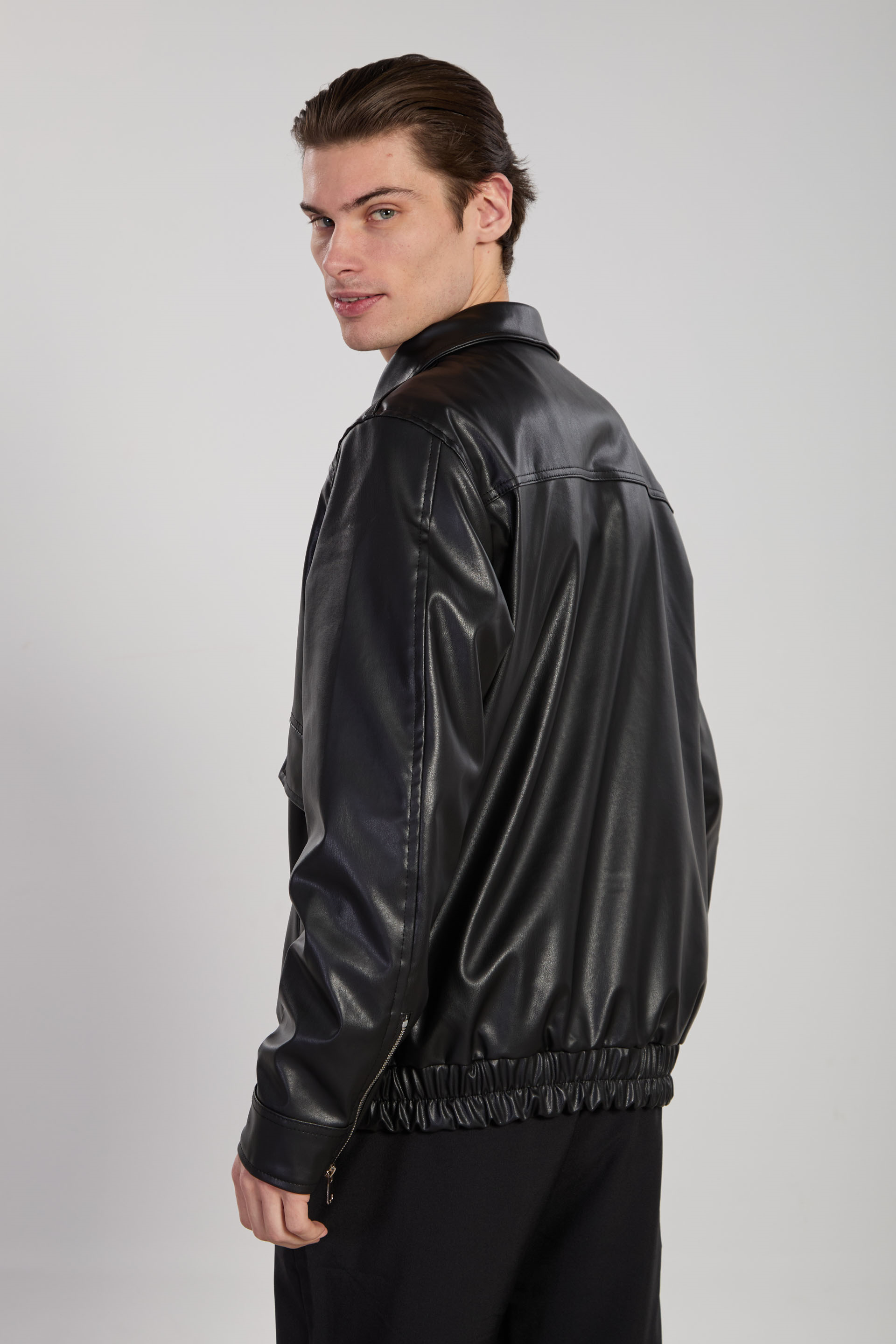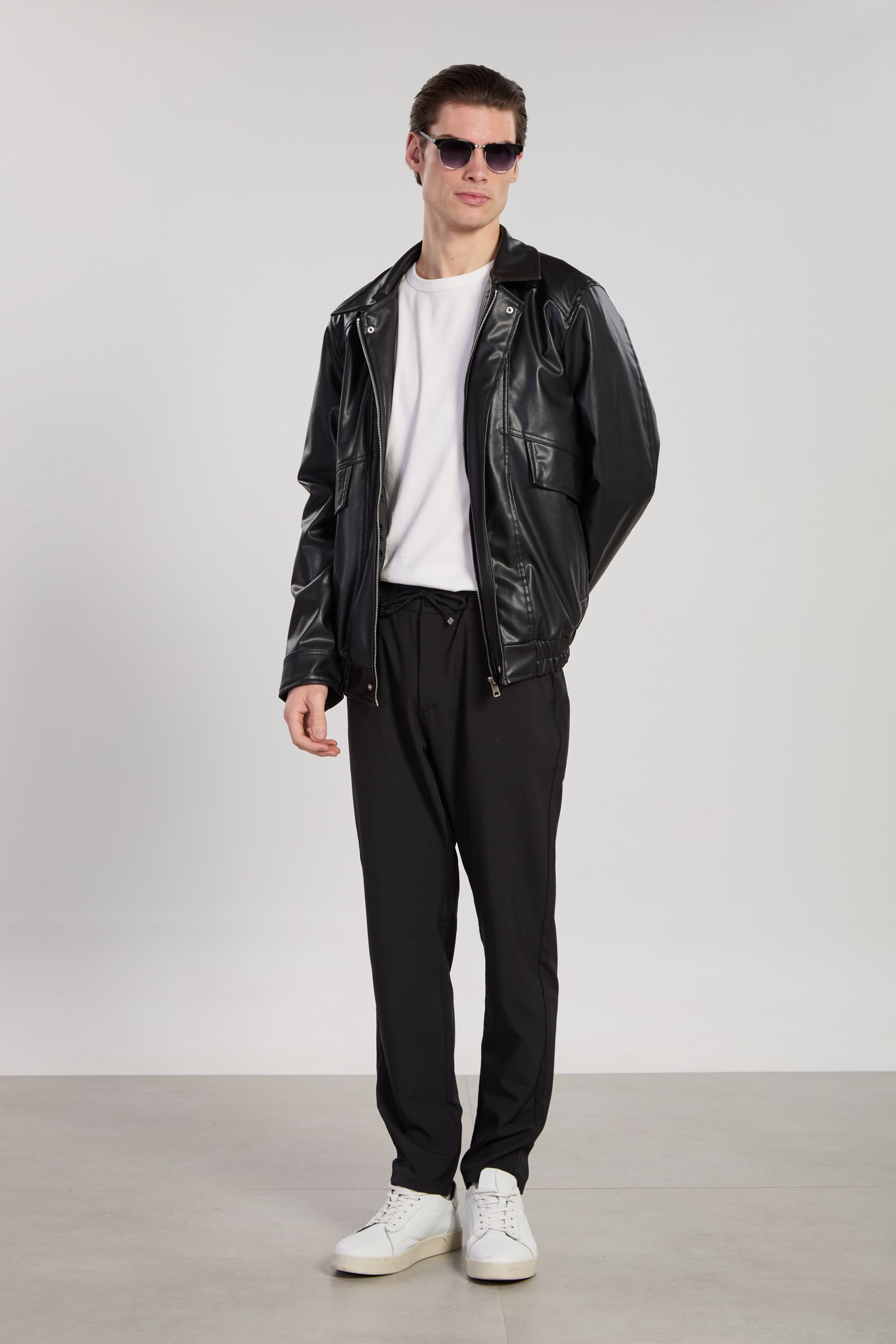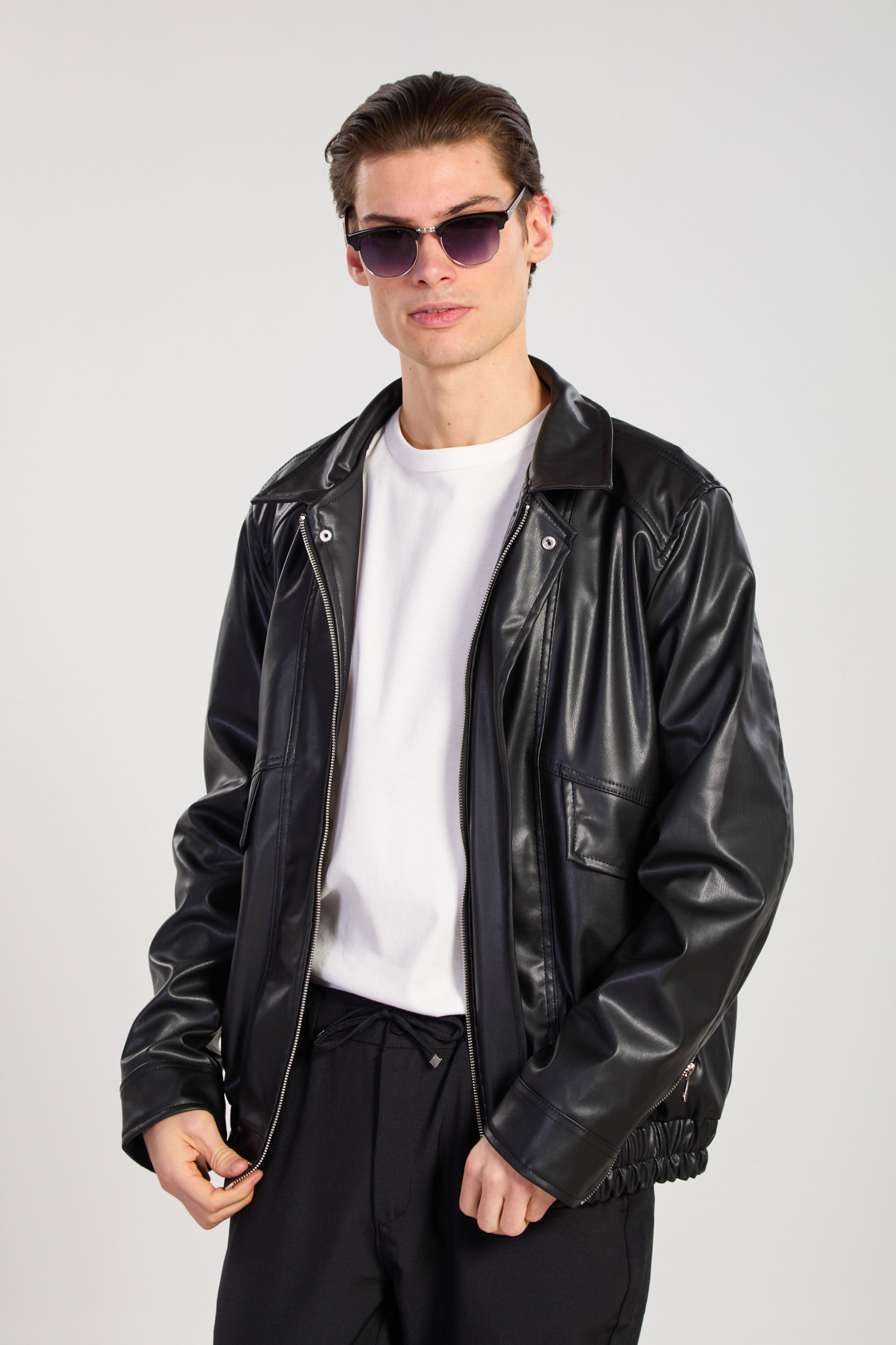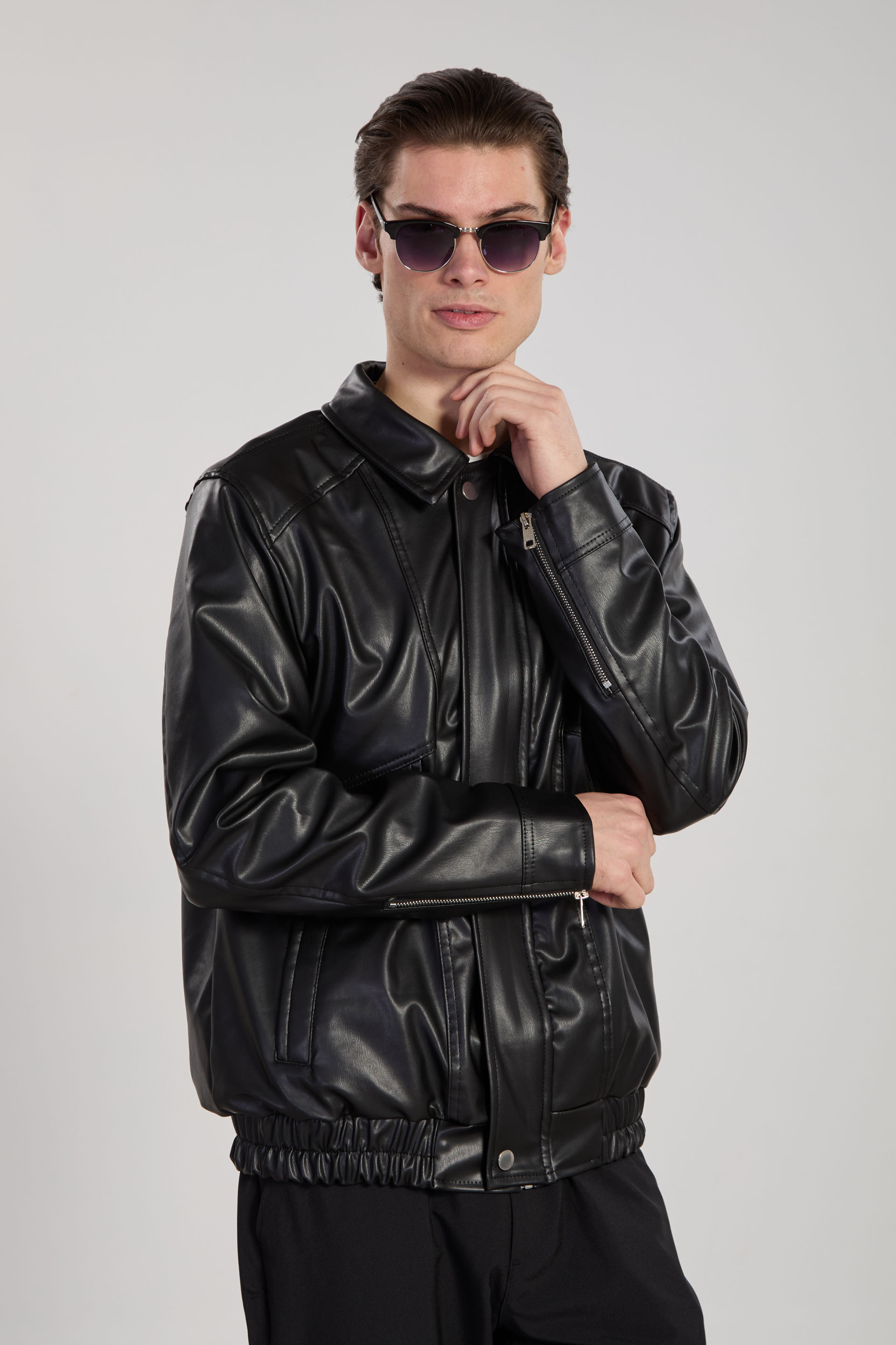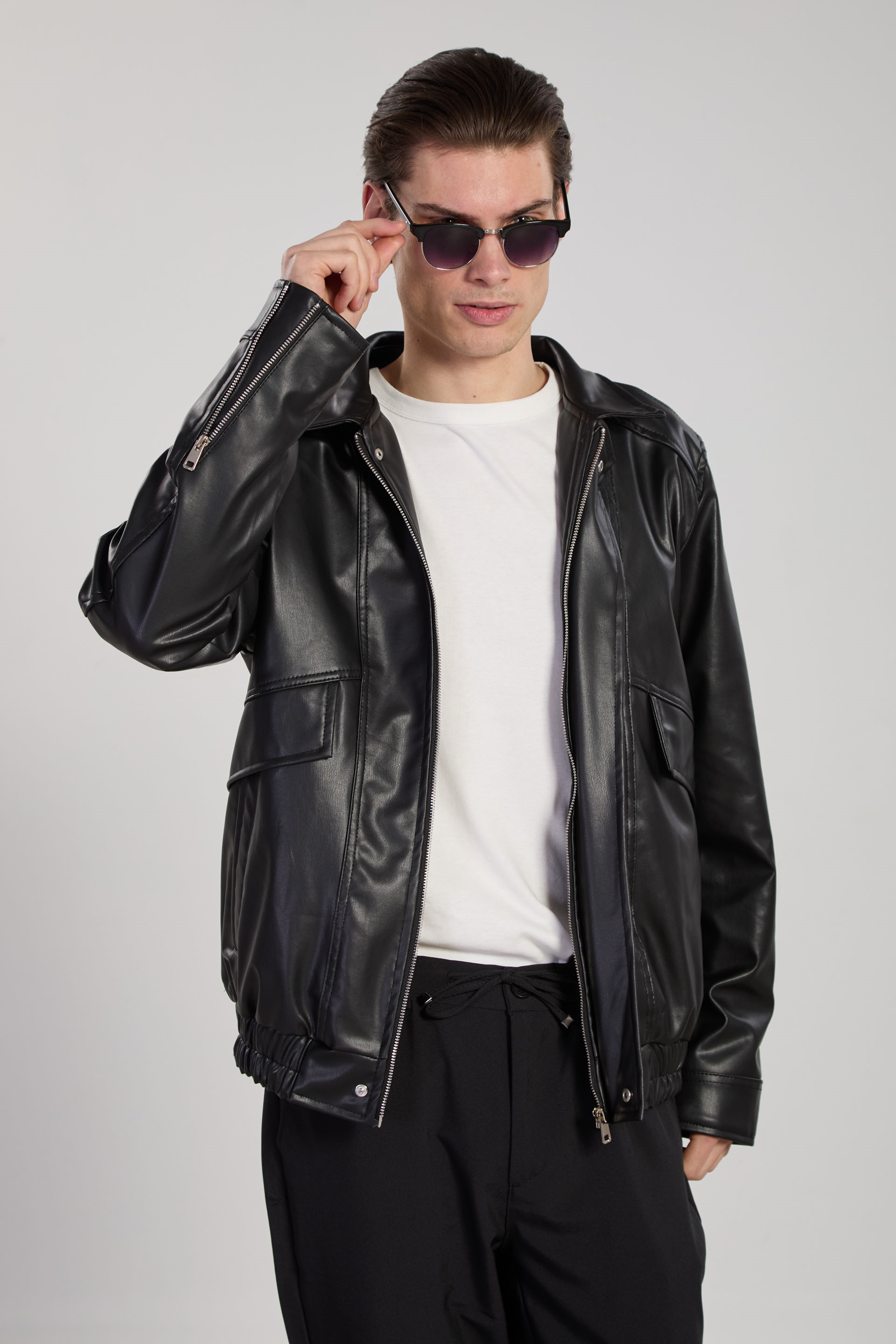 Erkek Kol Fermuarlı Bomber Deri Mont - Siyah