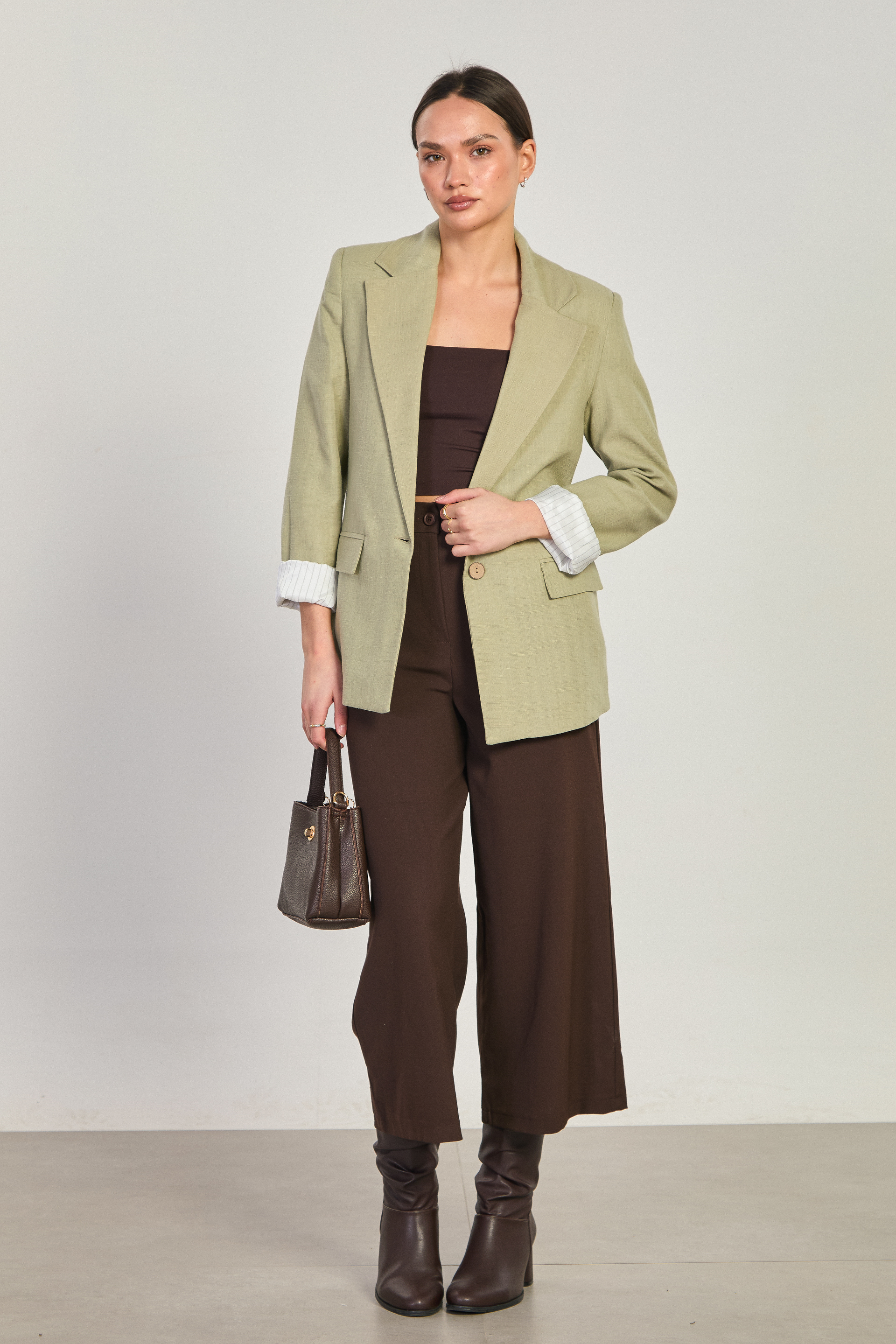 Kadın Kolları Çizgili Keten Blazer Ceket - Yeşil