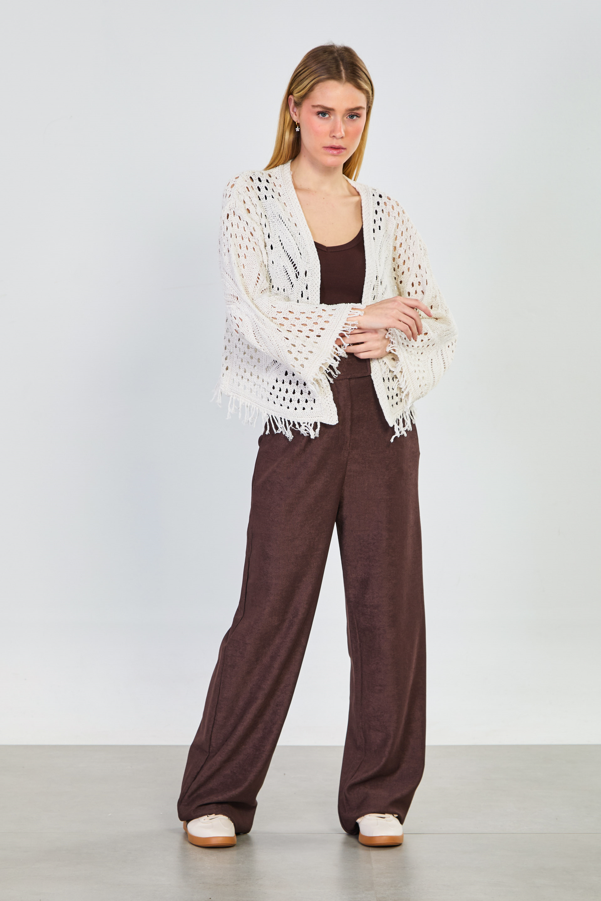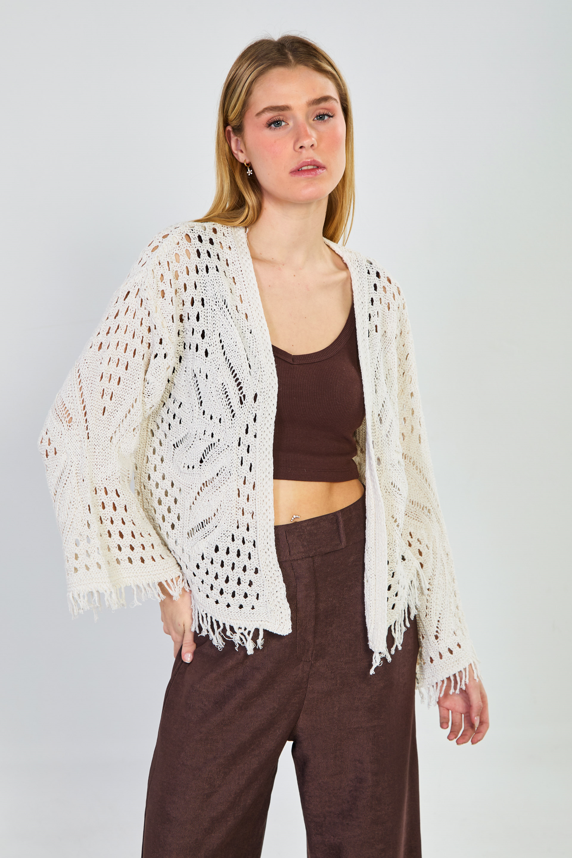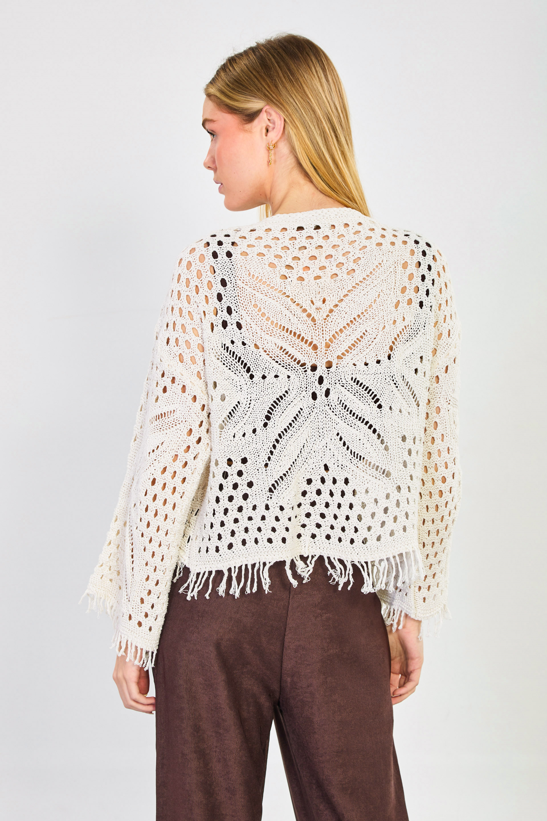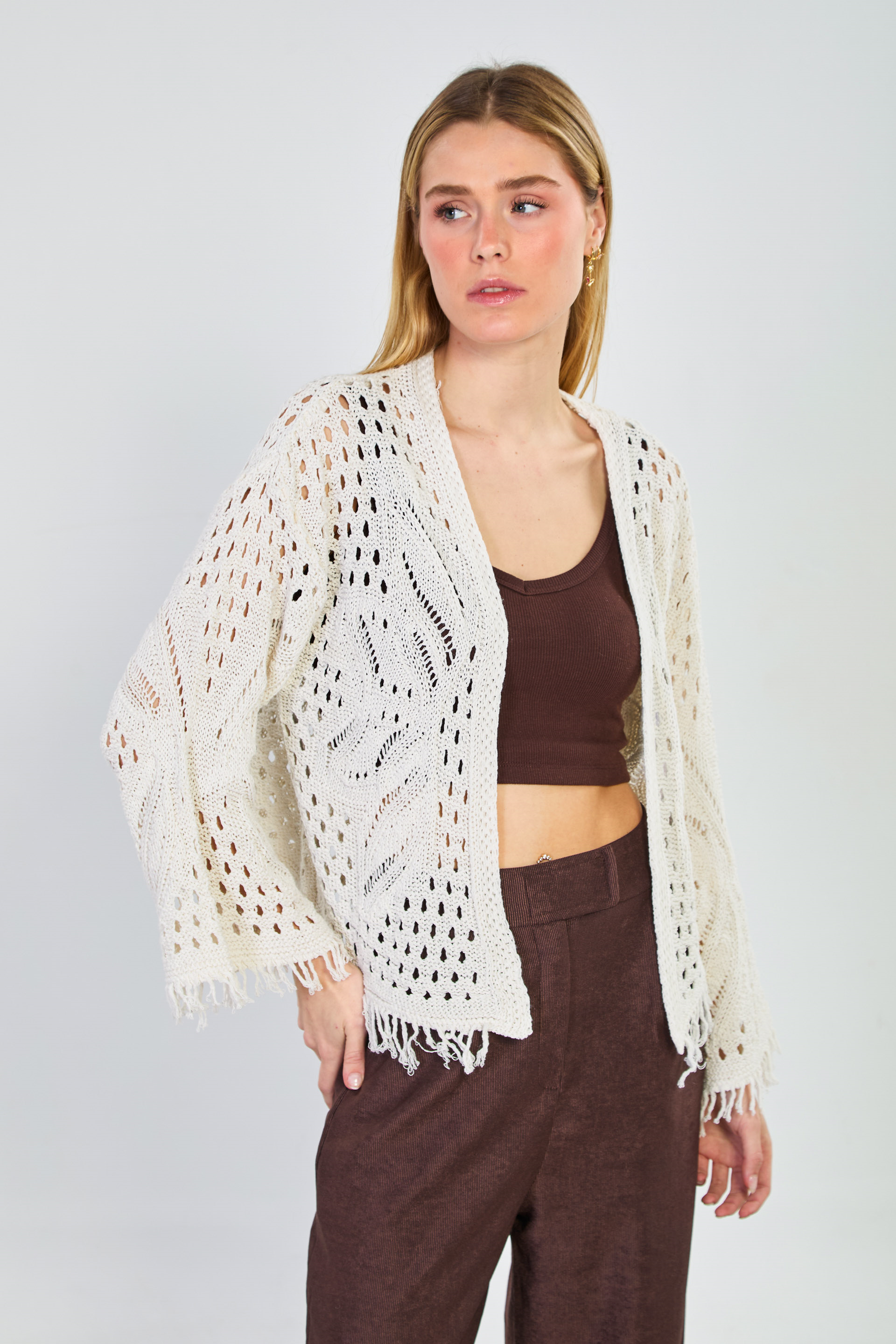 Kolları ve etek ucu püsküllü ajurlu hırka-1569 Natural