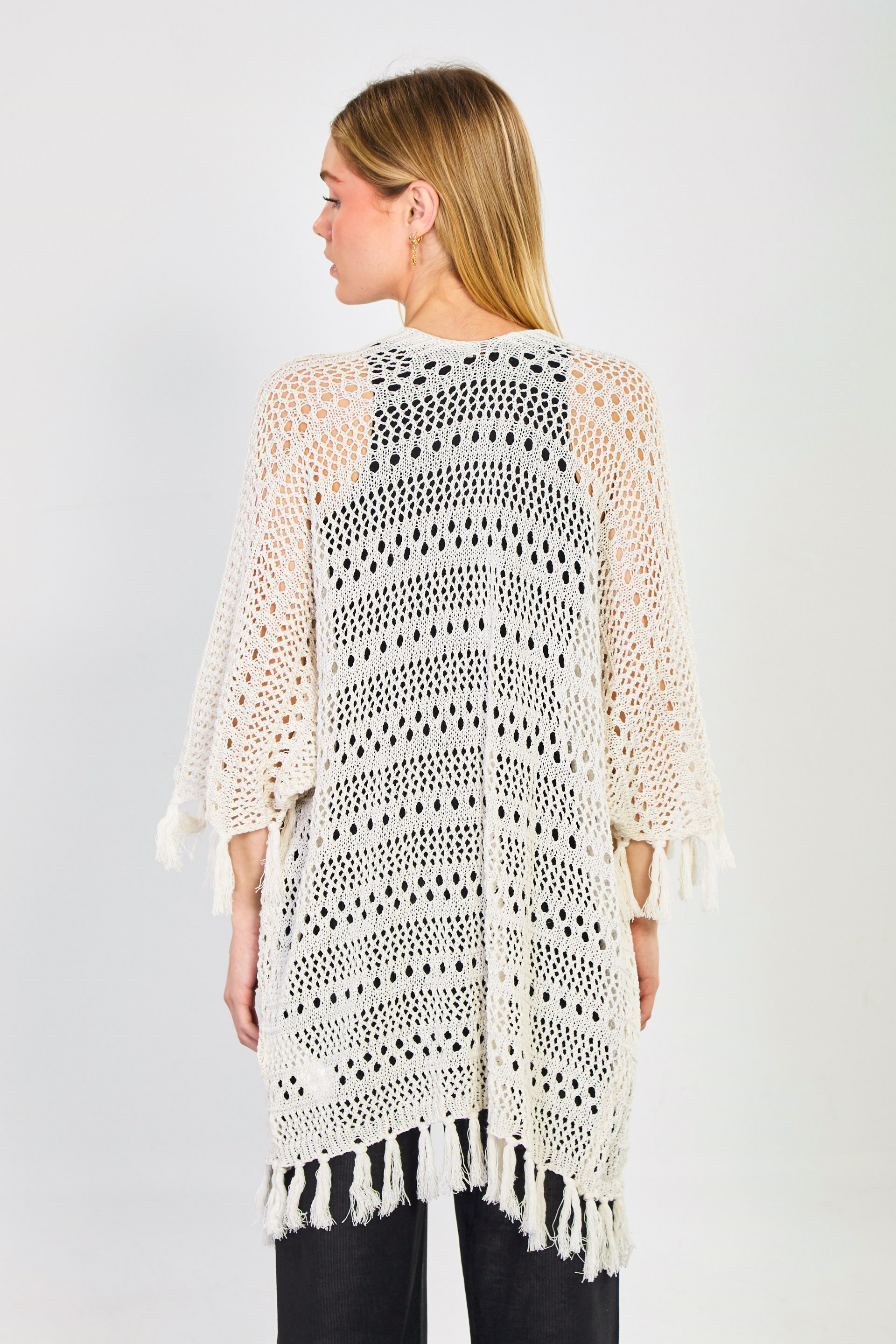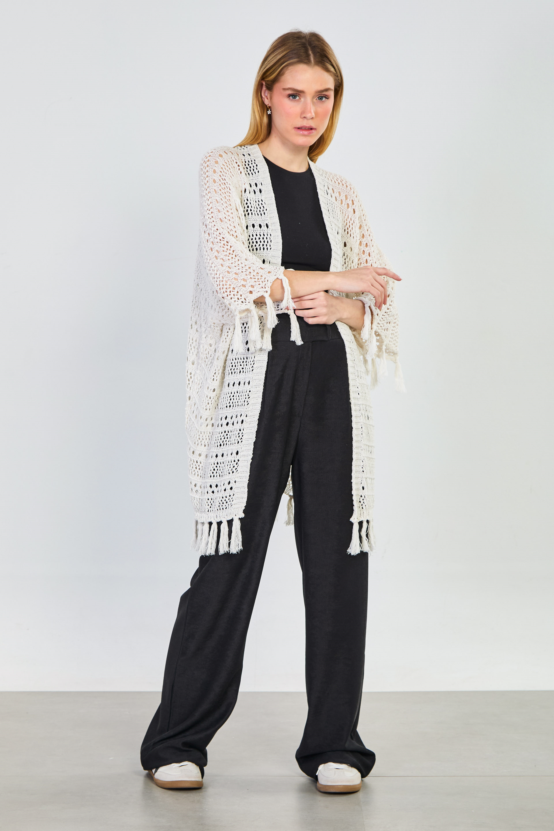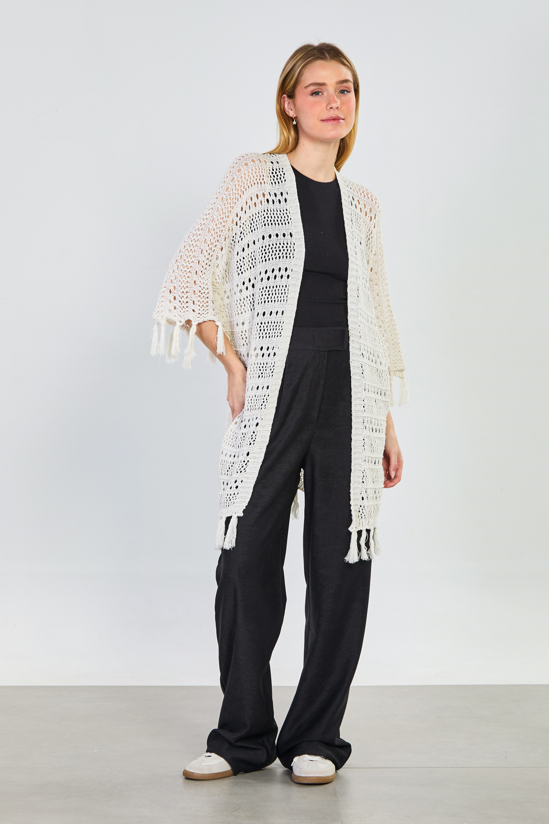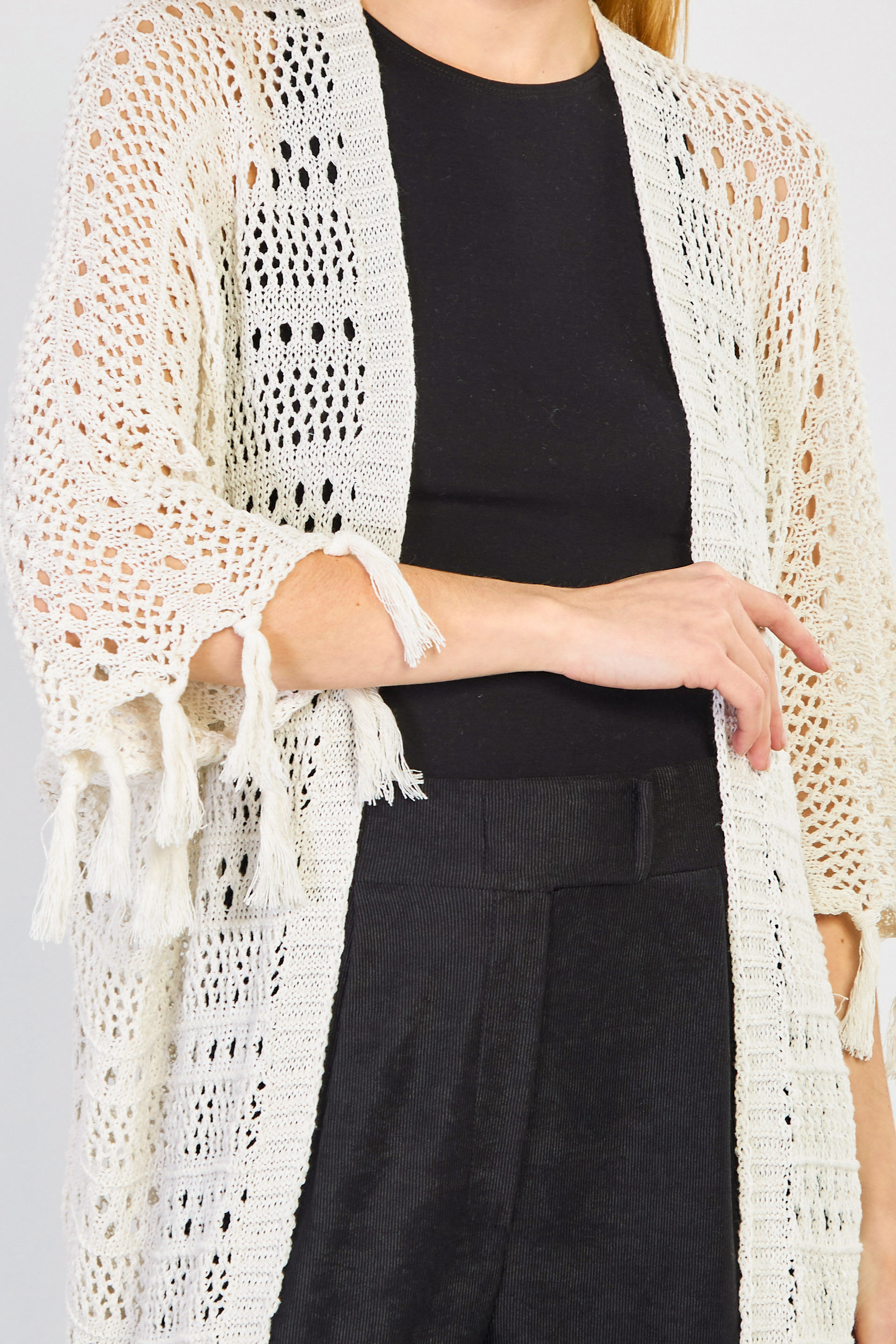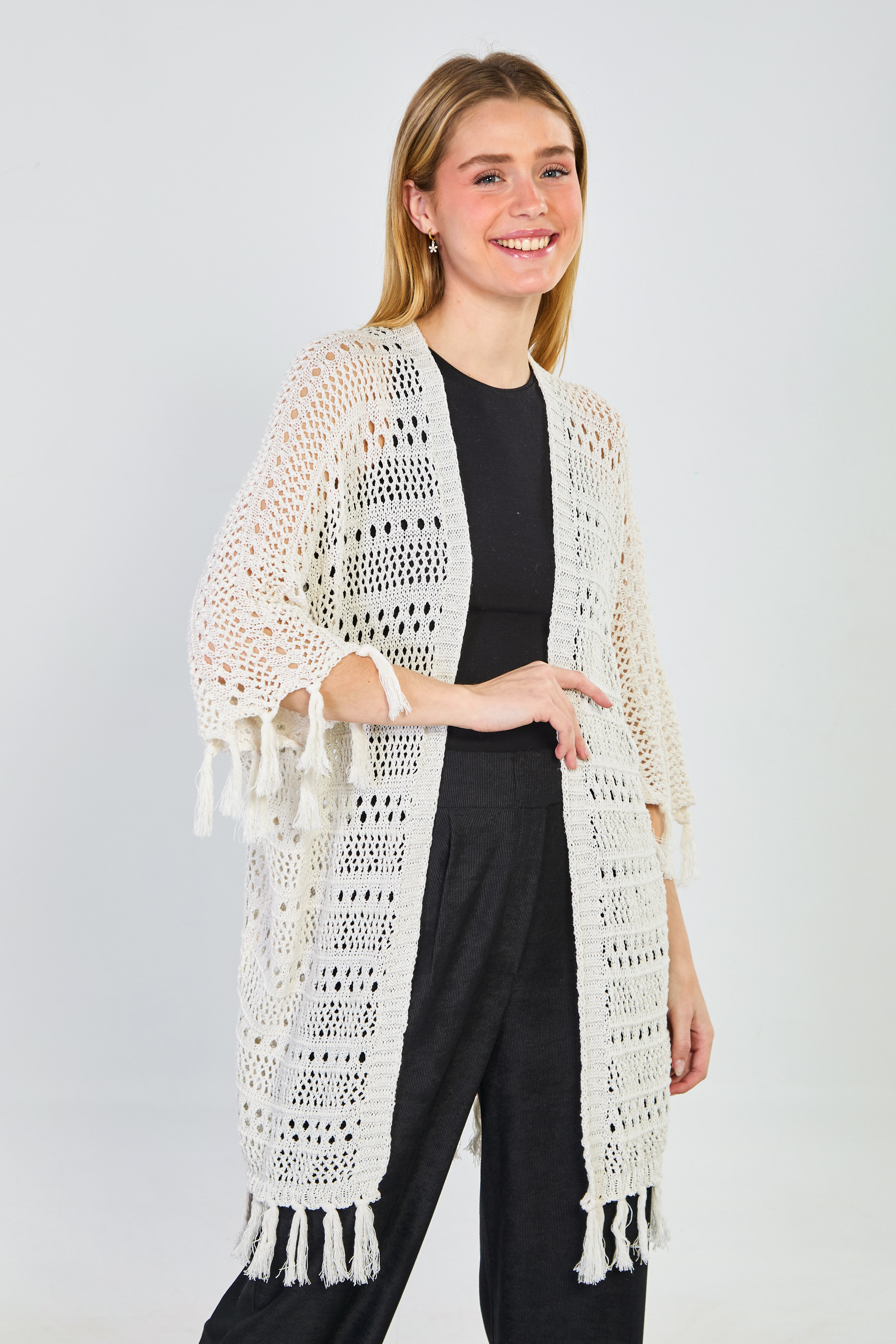 Kadın Kolu ve Etek Ucu Püsküllü Ajurlı Hırka - Natural