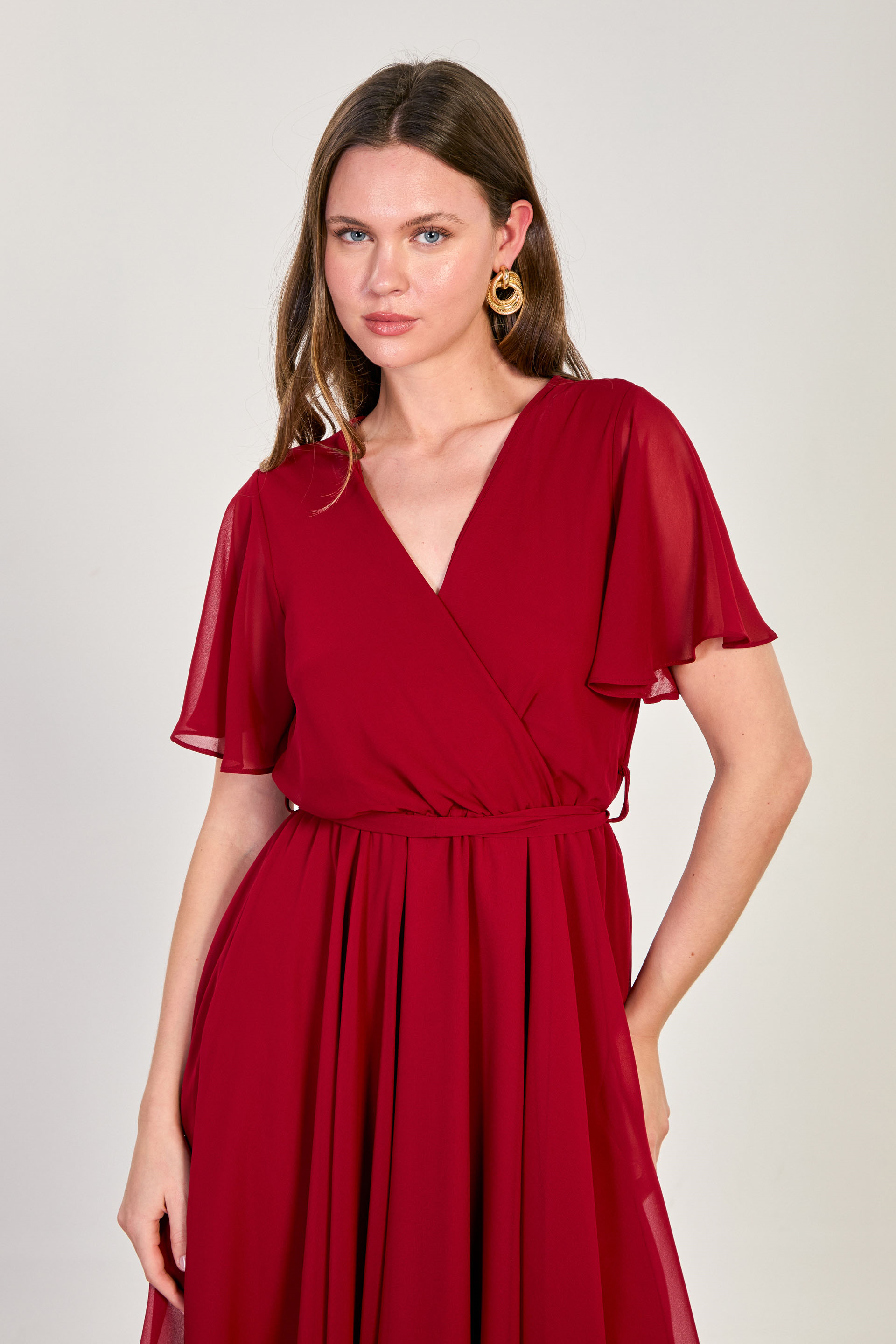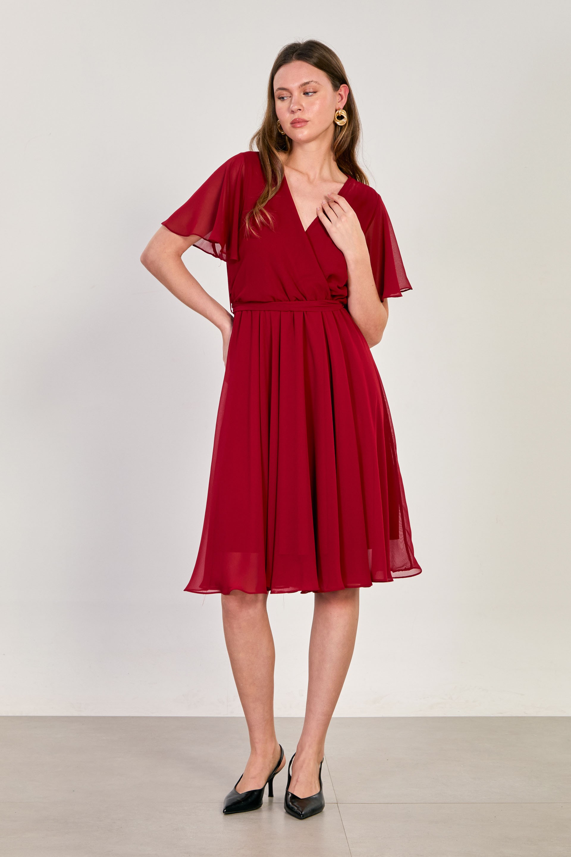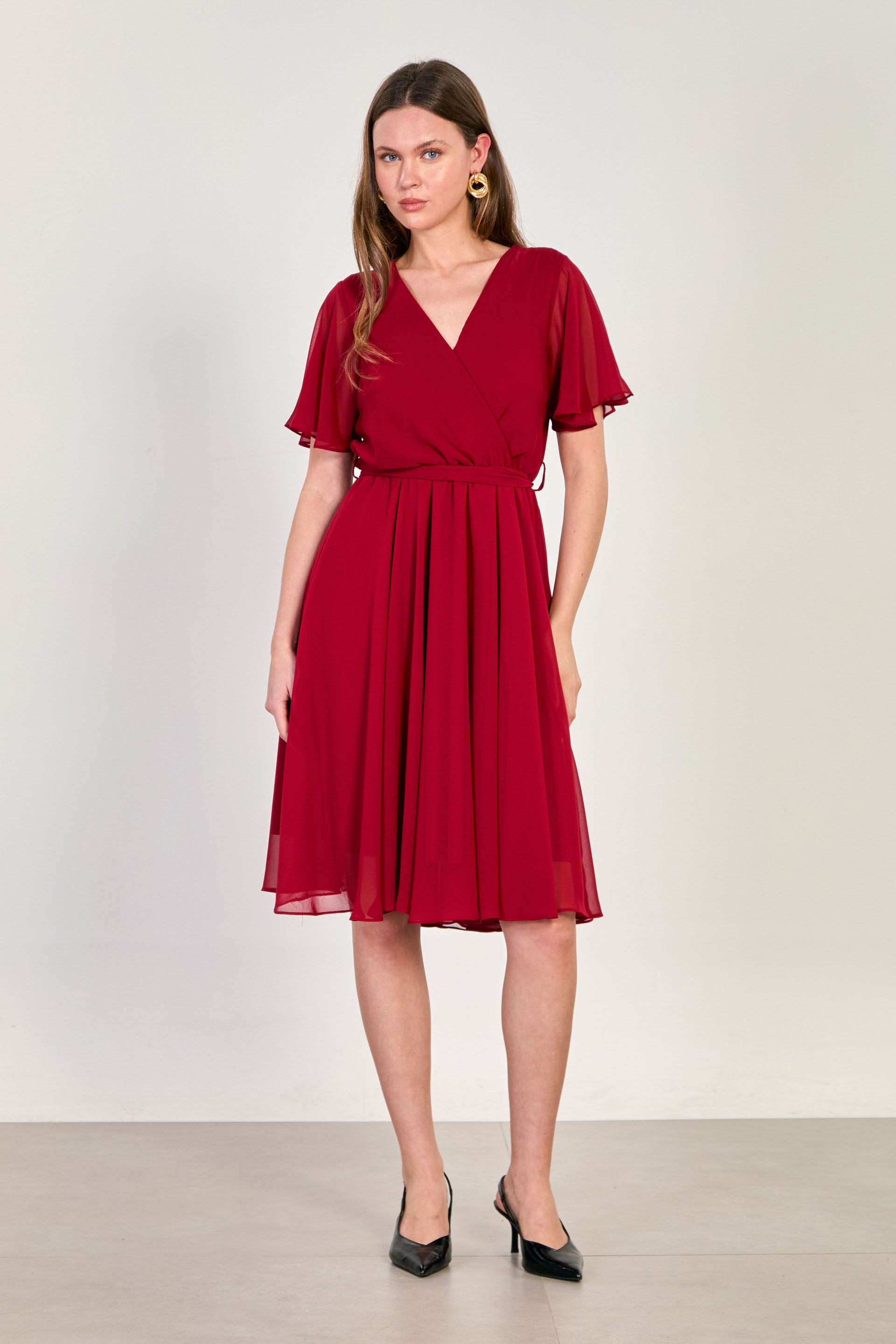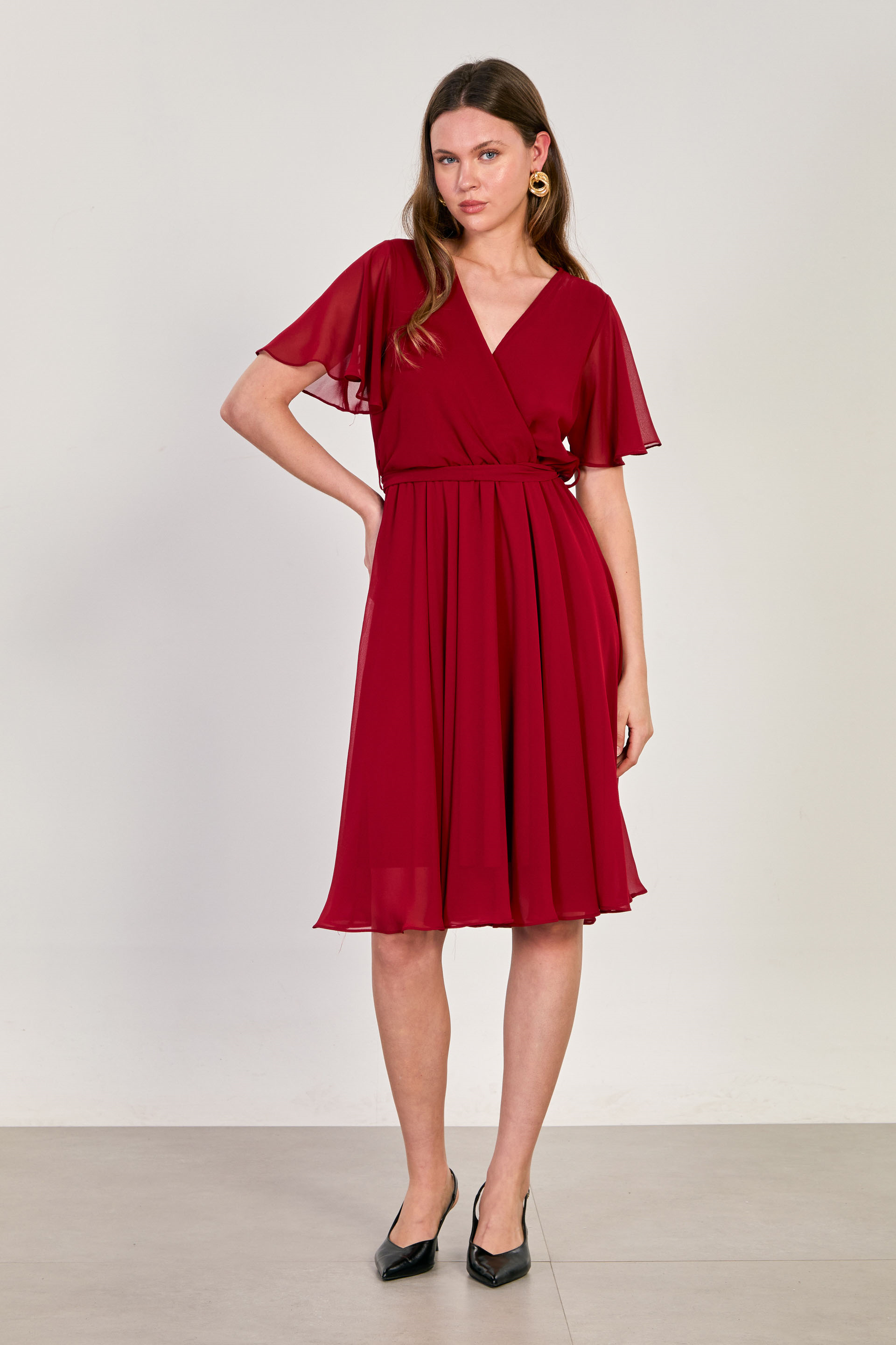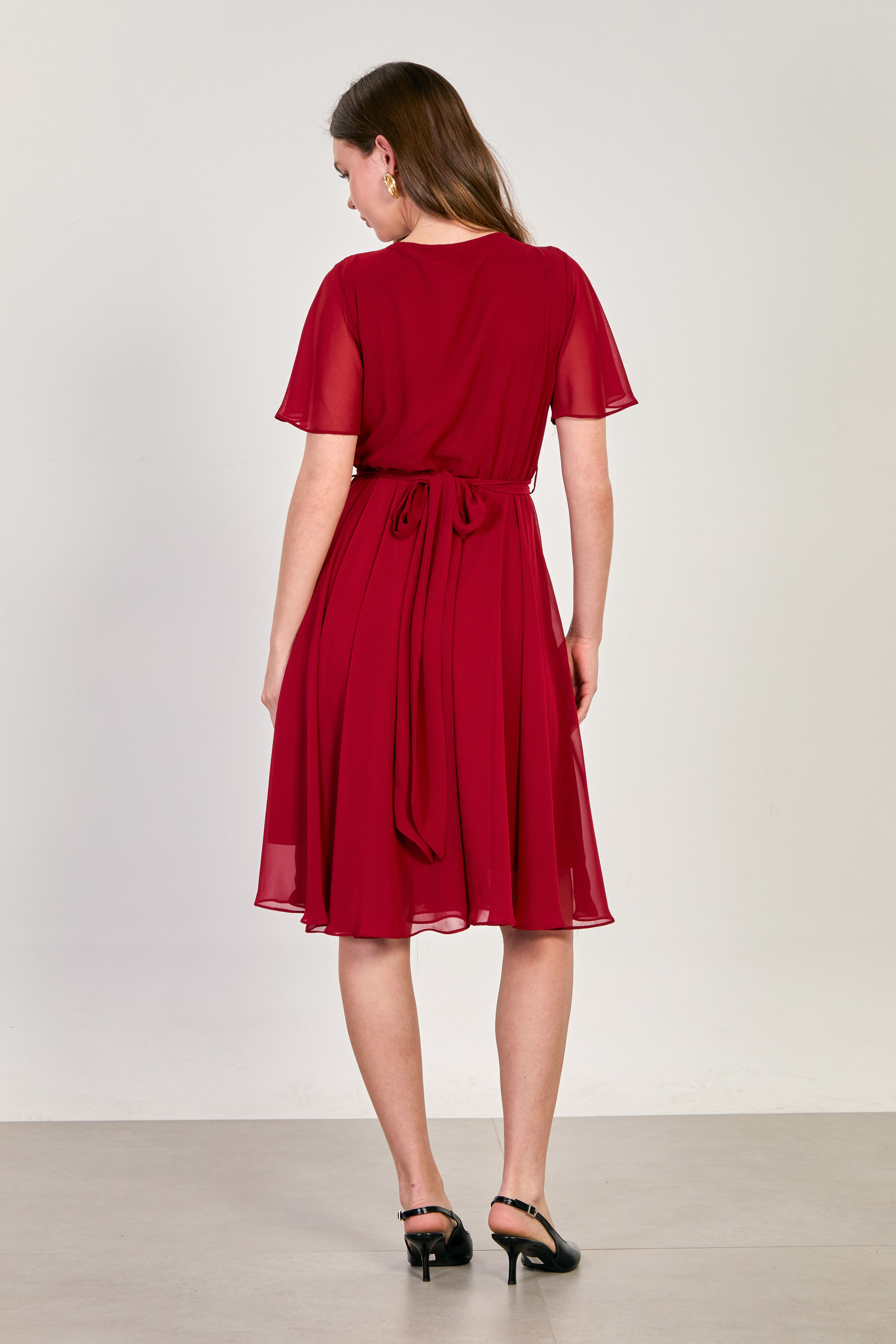 Kadın Kruvaze Yaka Kuşaklı Elbise - Kırmızı