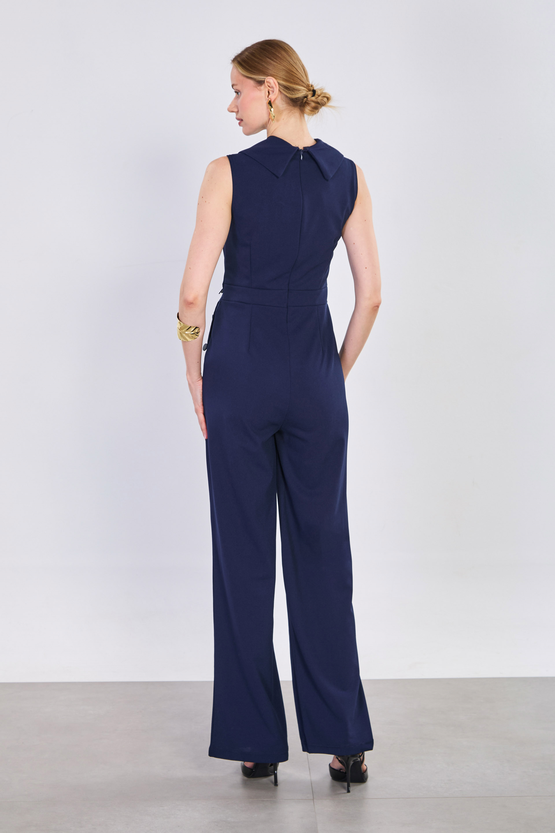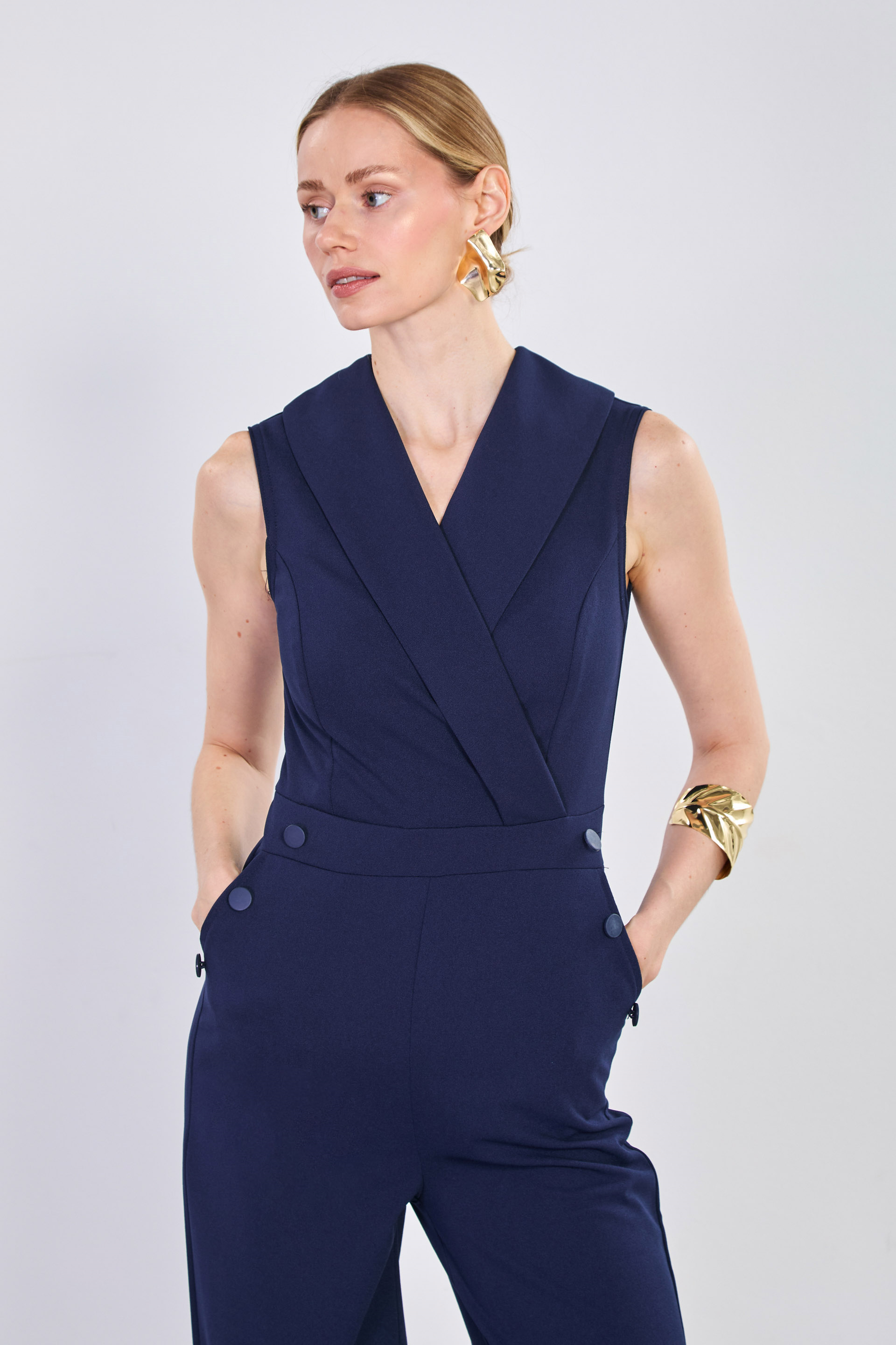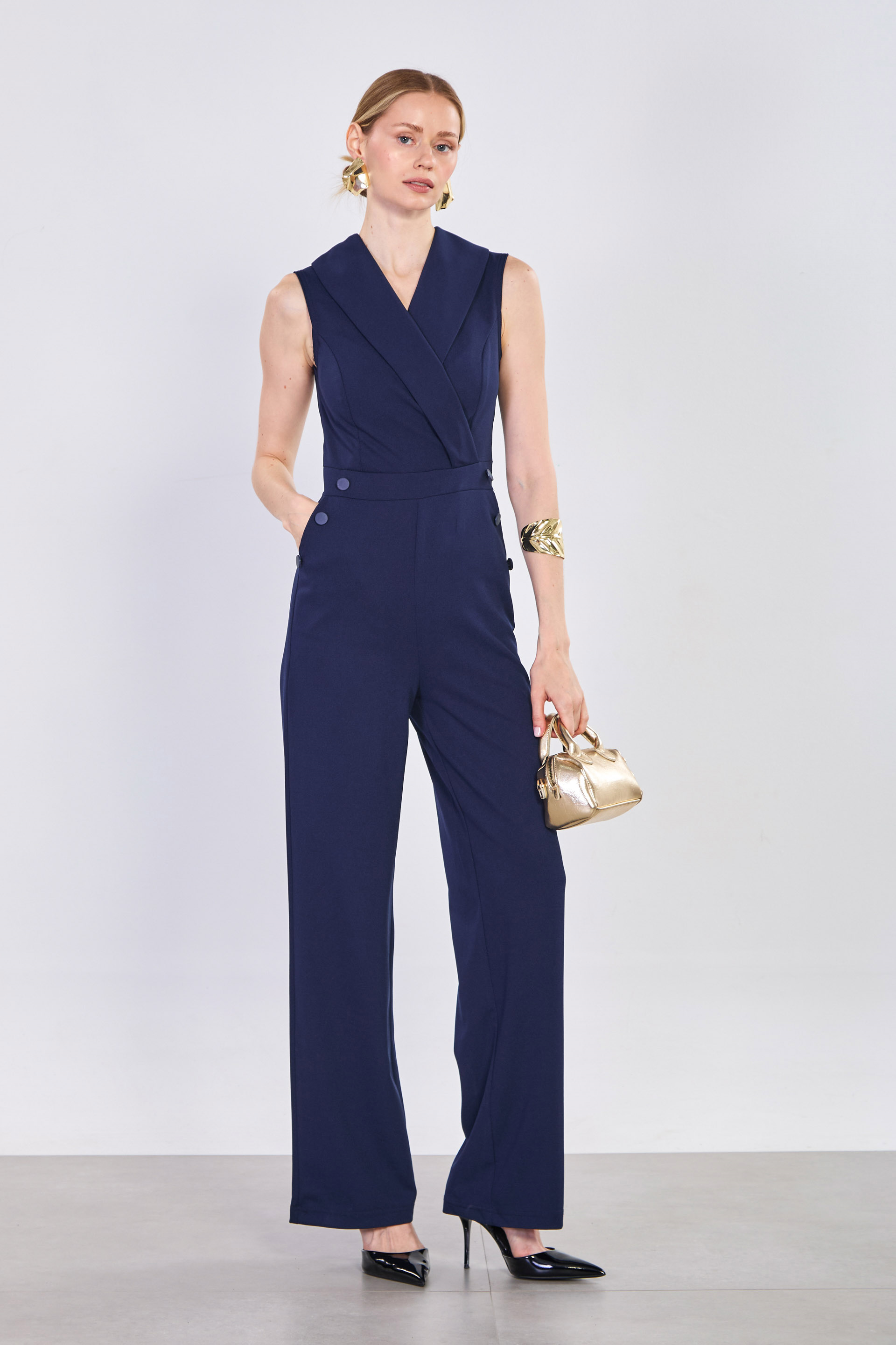 Kadın Kruvaze Yaka Düğme Detay Tulum - Lacivert