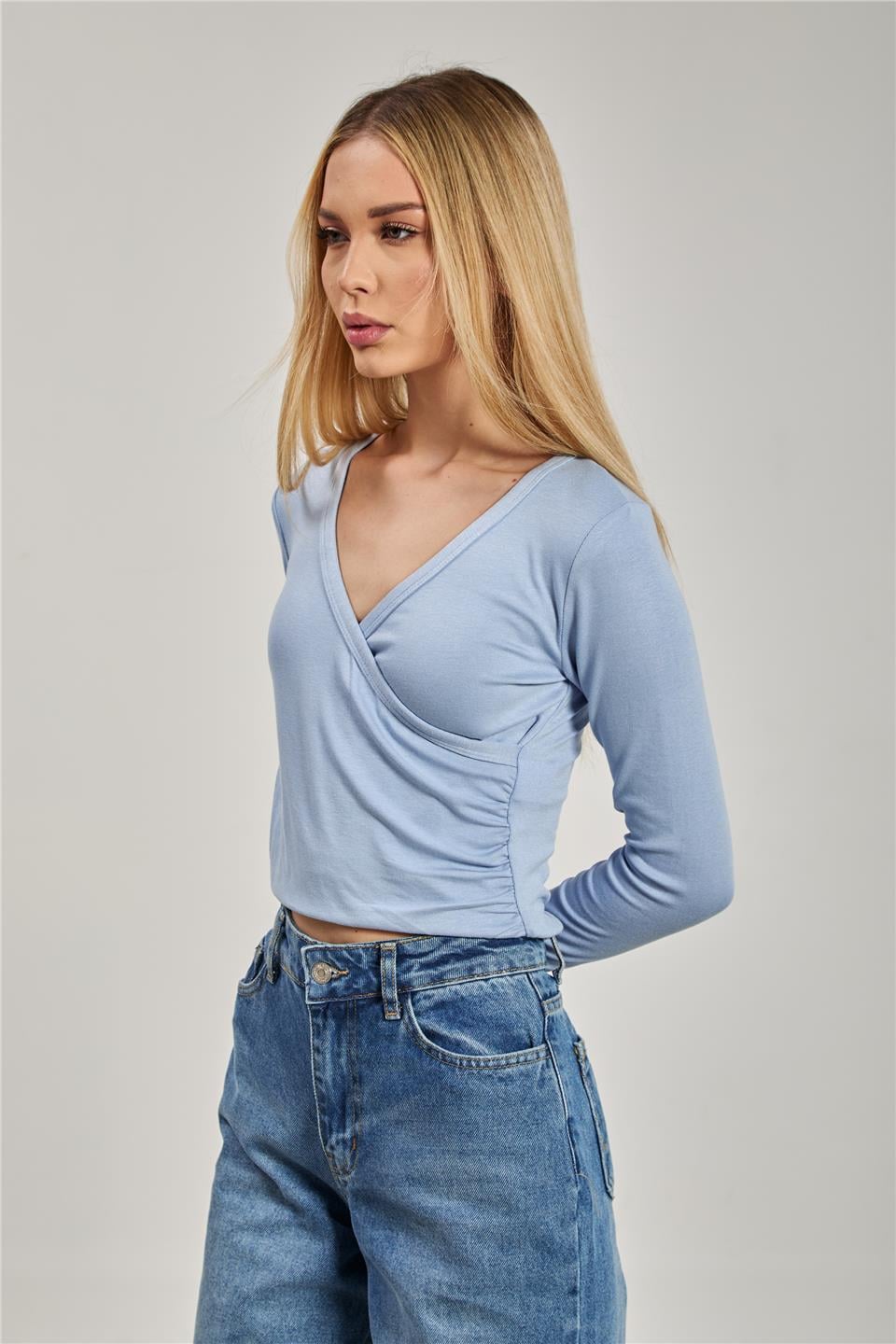 Kadın Kruvaze Yaka Uzun Kol Body - Mavi