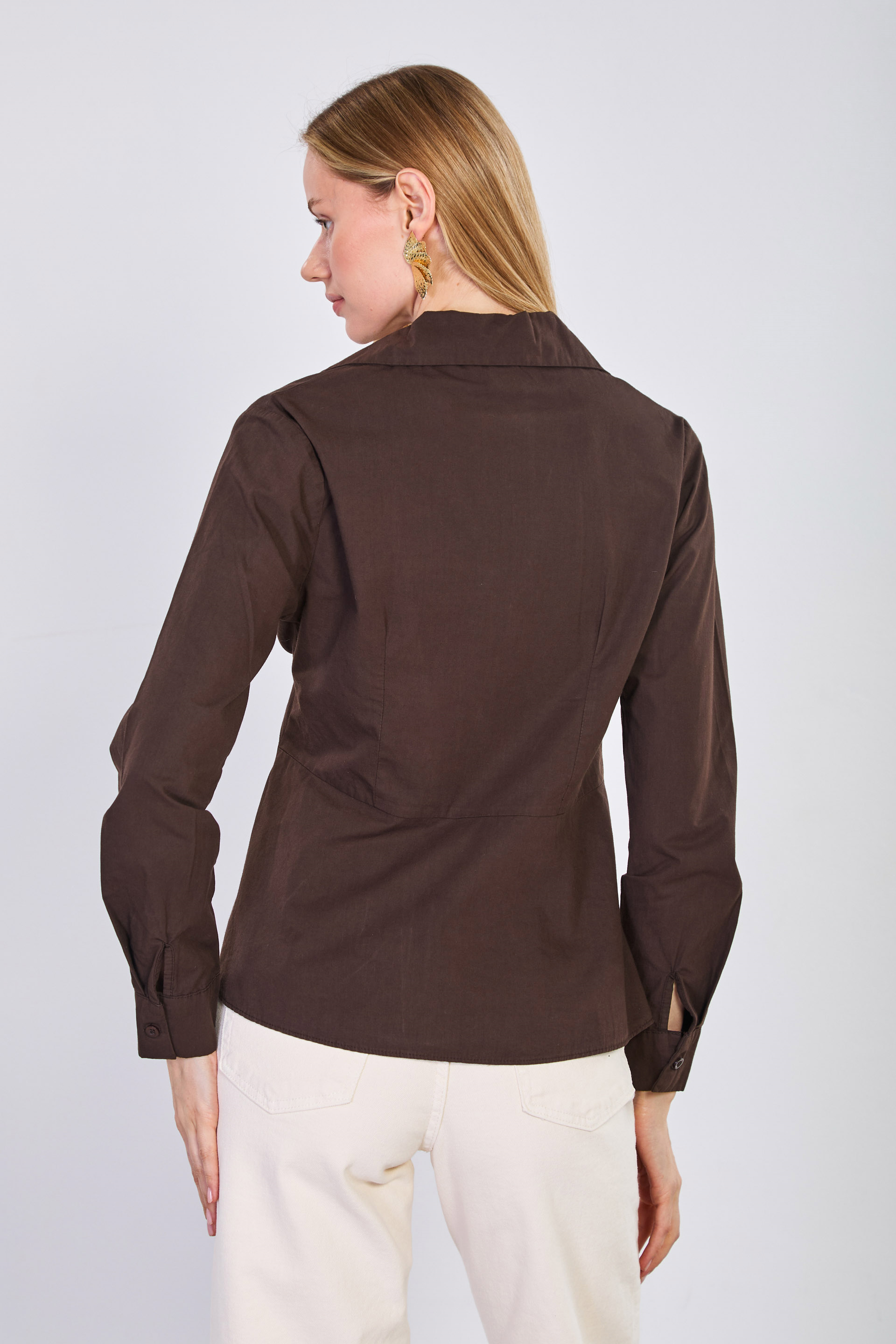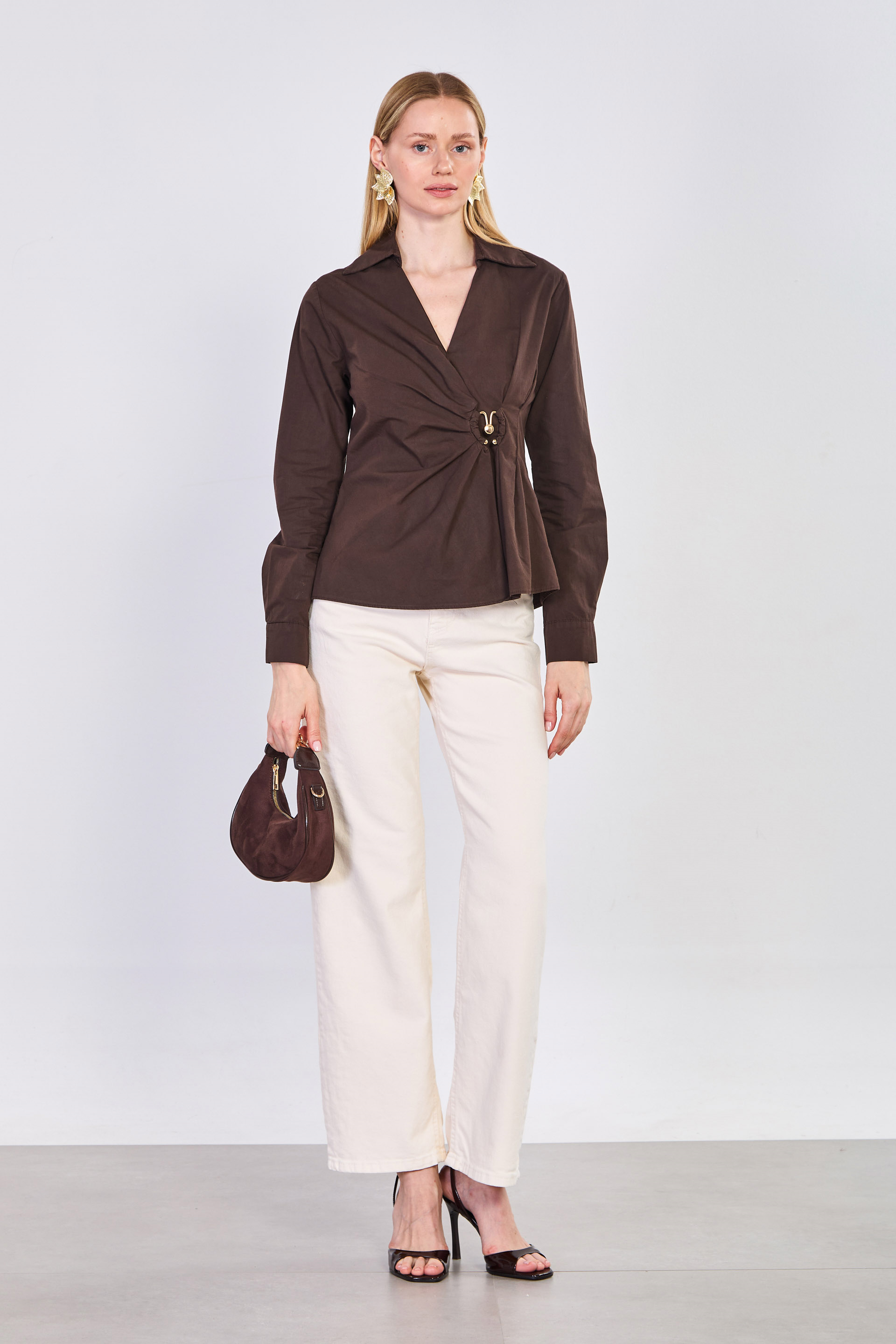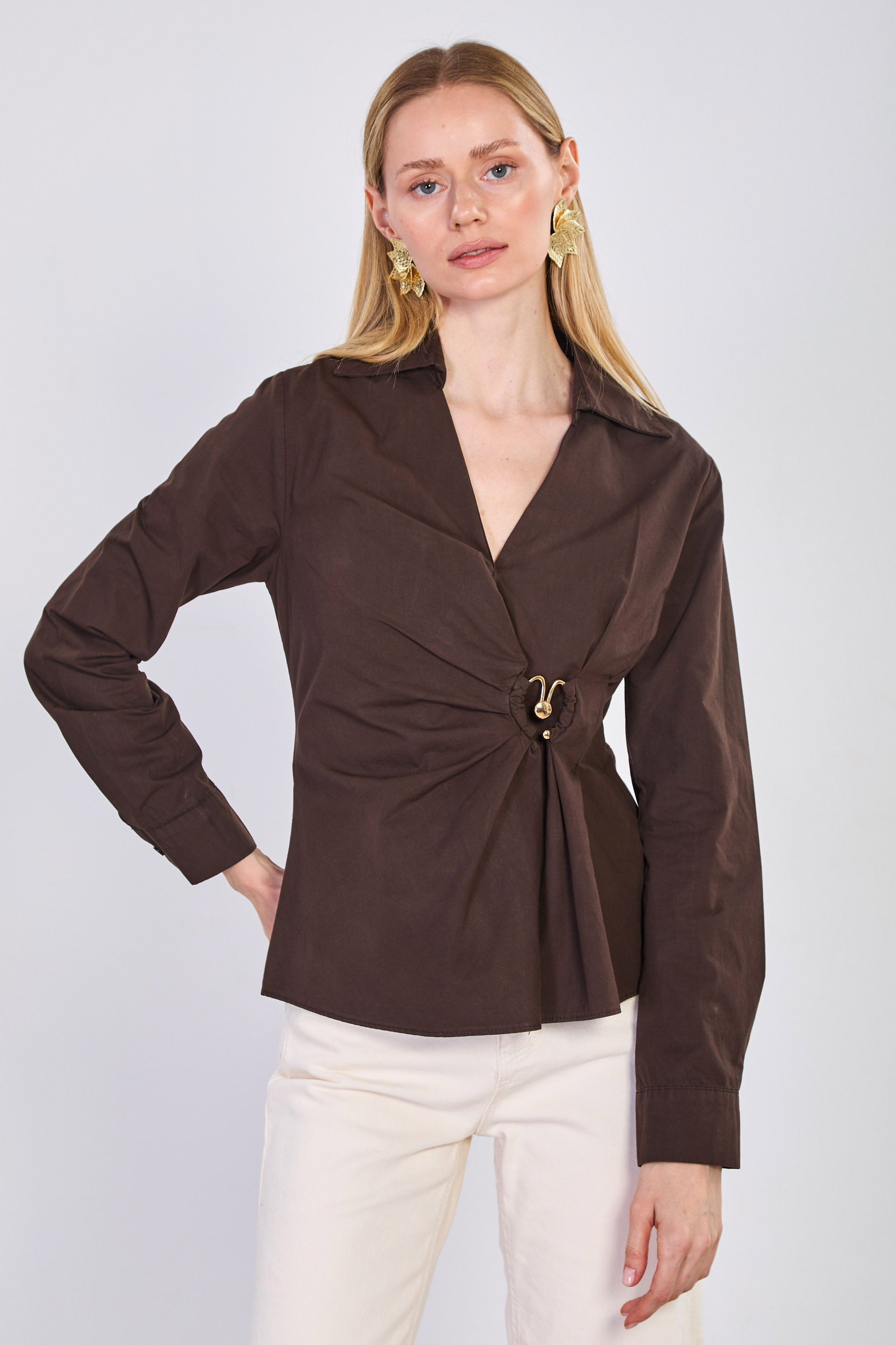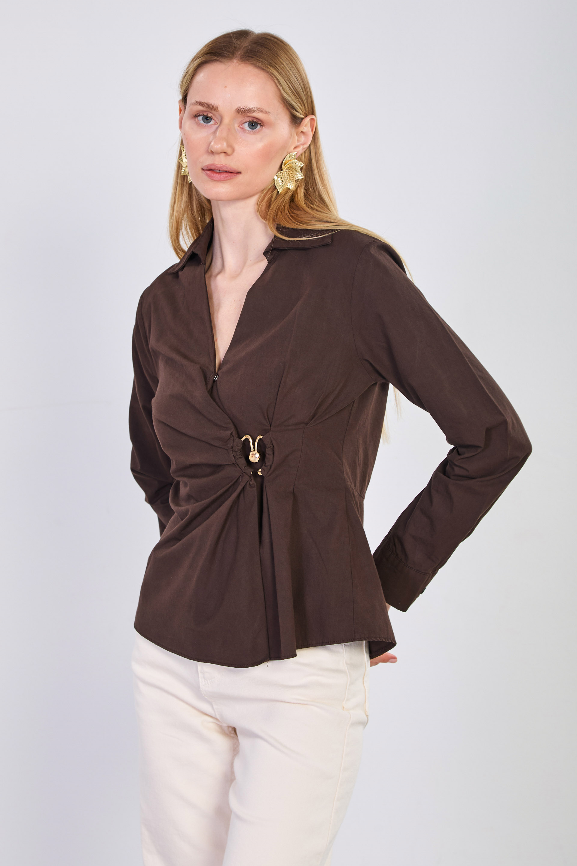 Kadın Kruvaze Yaka Yandan Toka Geçmeli Bluz - Acı Kahve