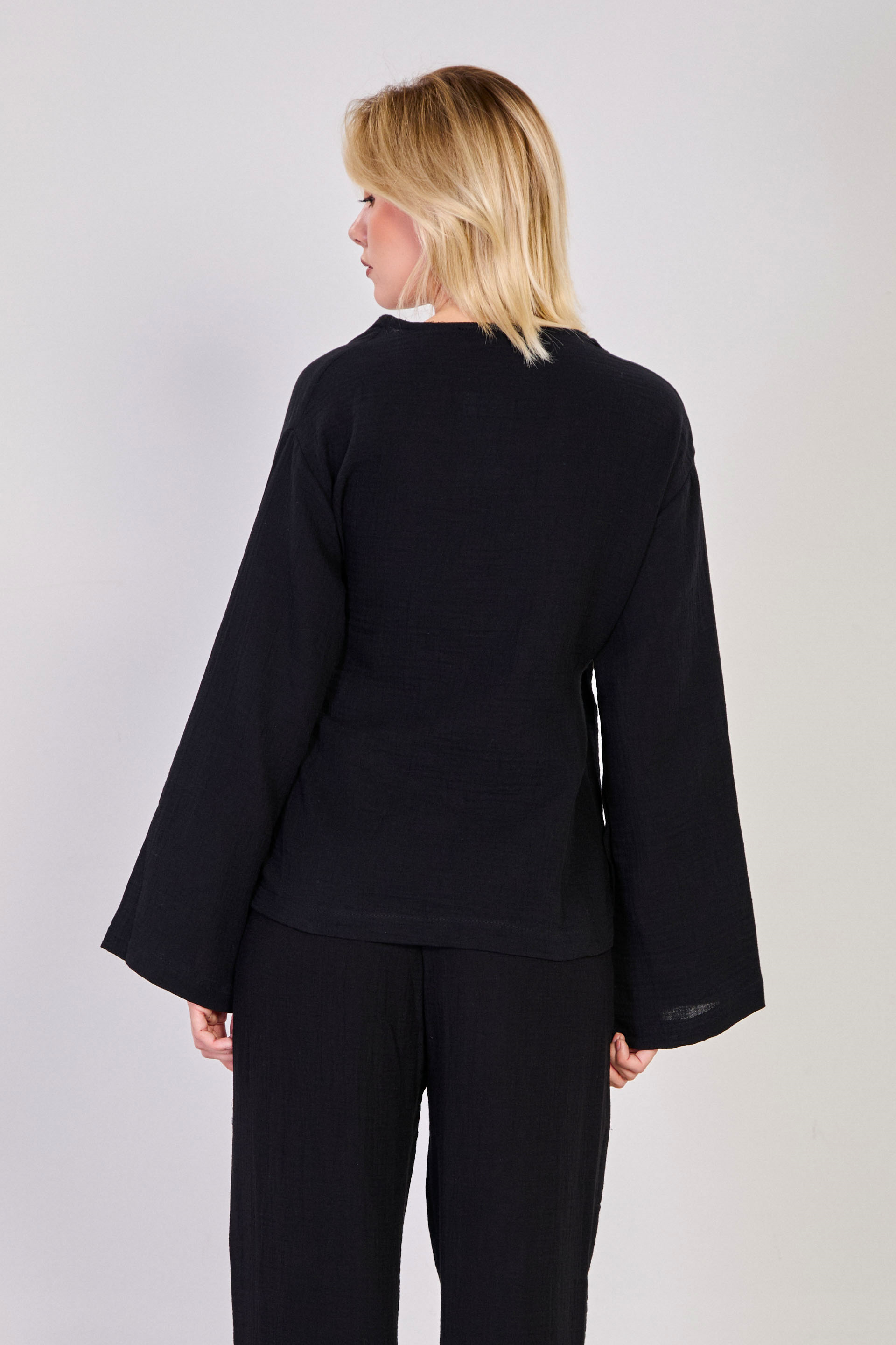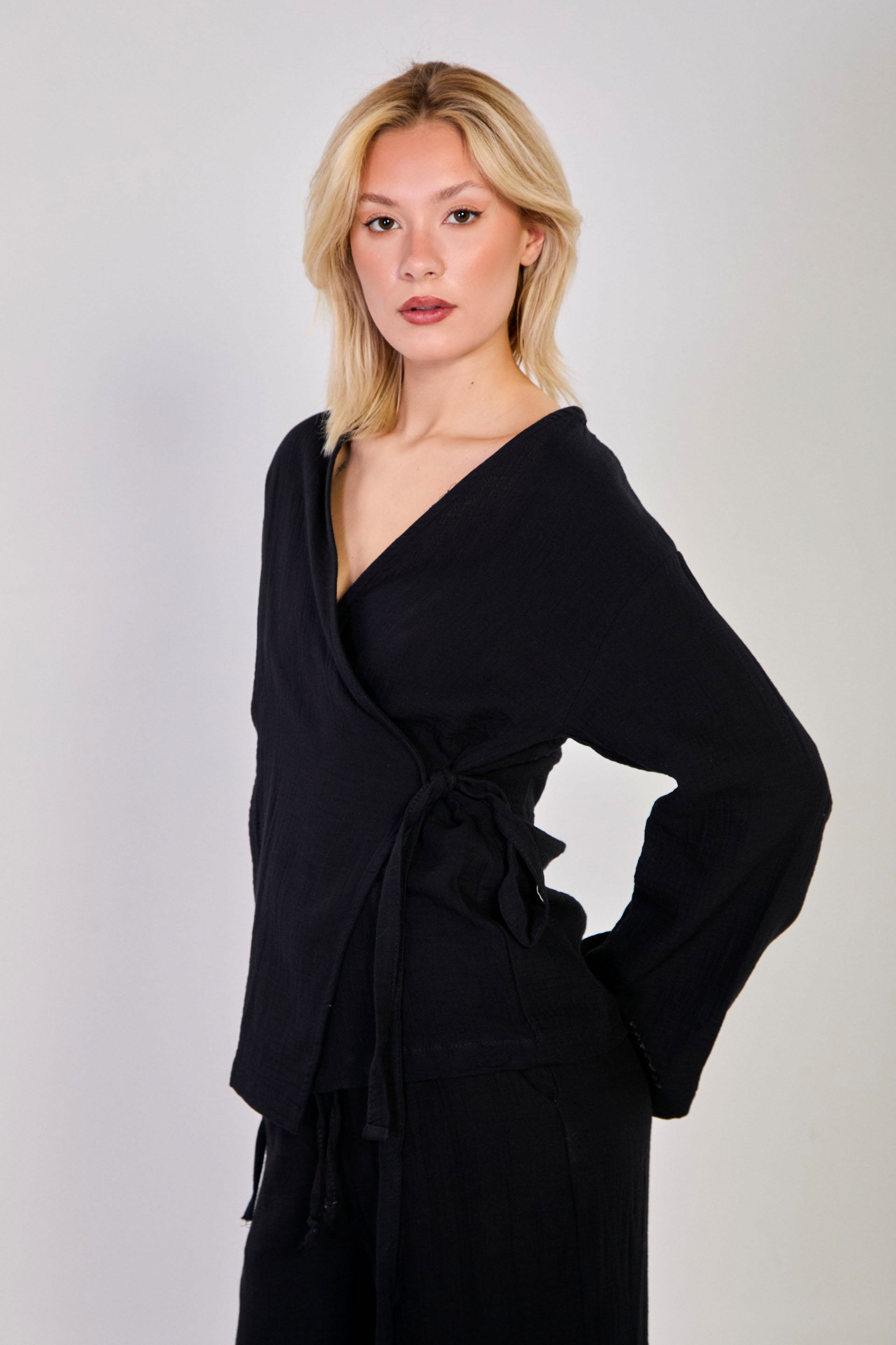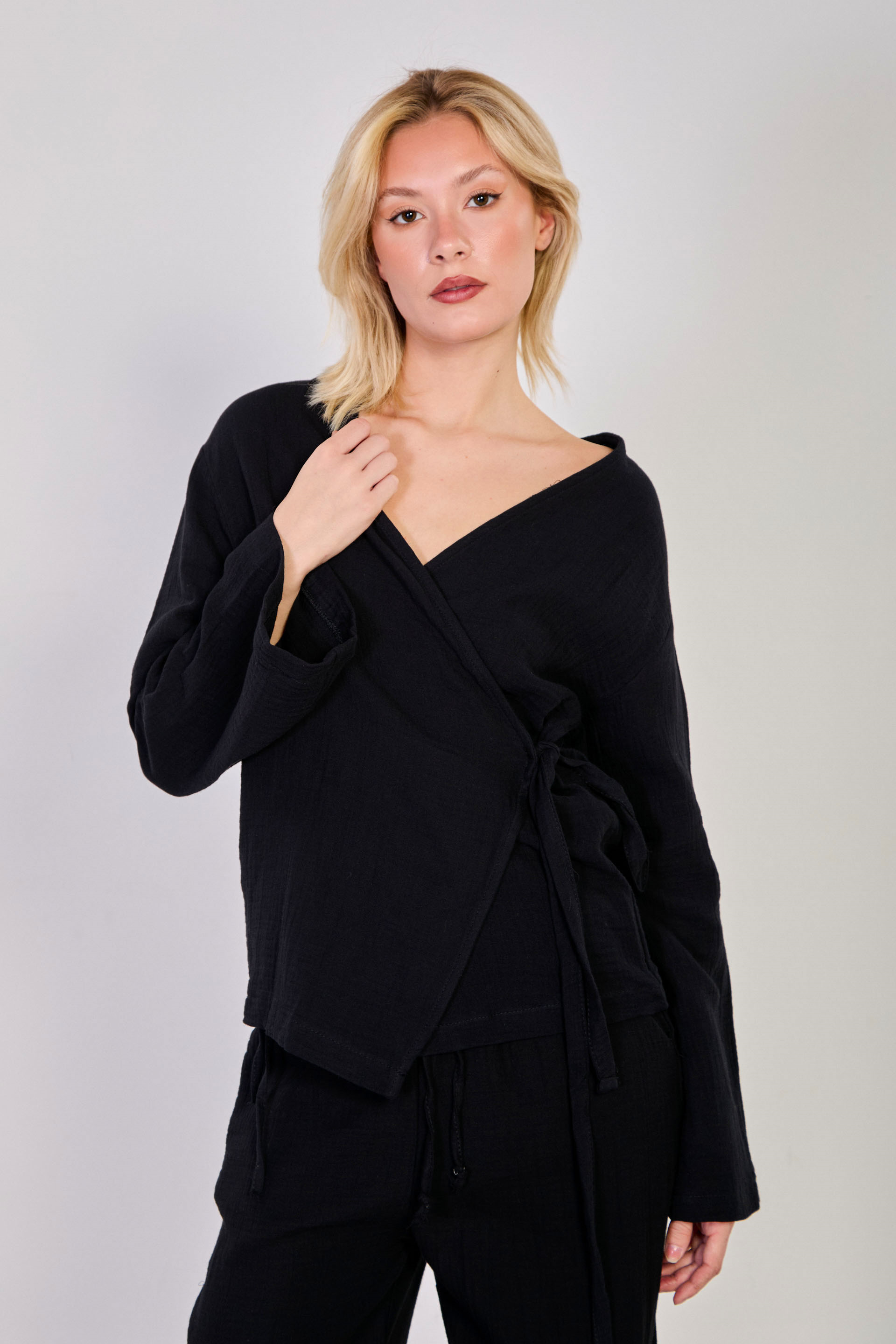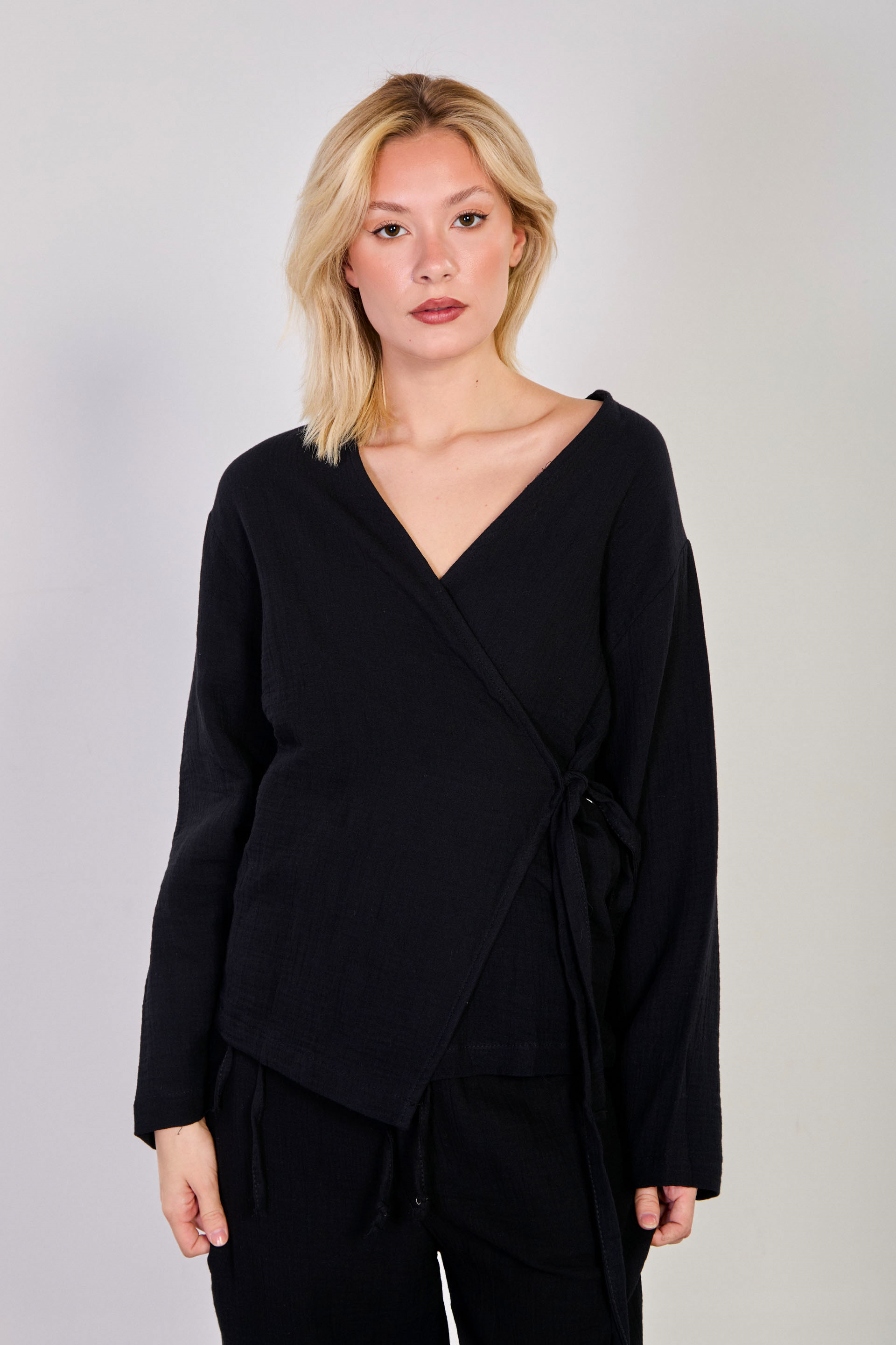 Kadın Kruvaze Yaka Yanı Bağlamalı Kimono - Siyah
