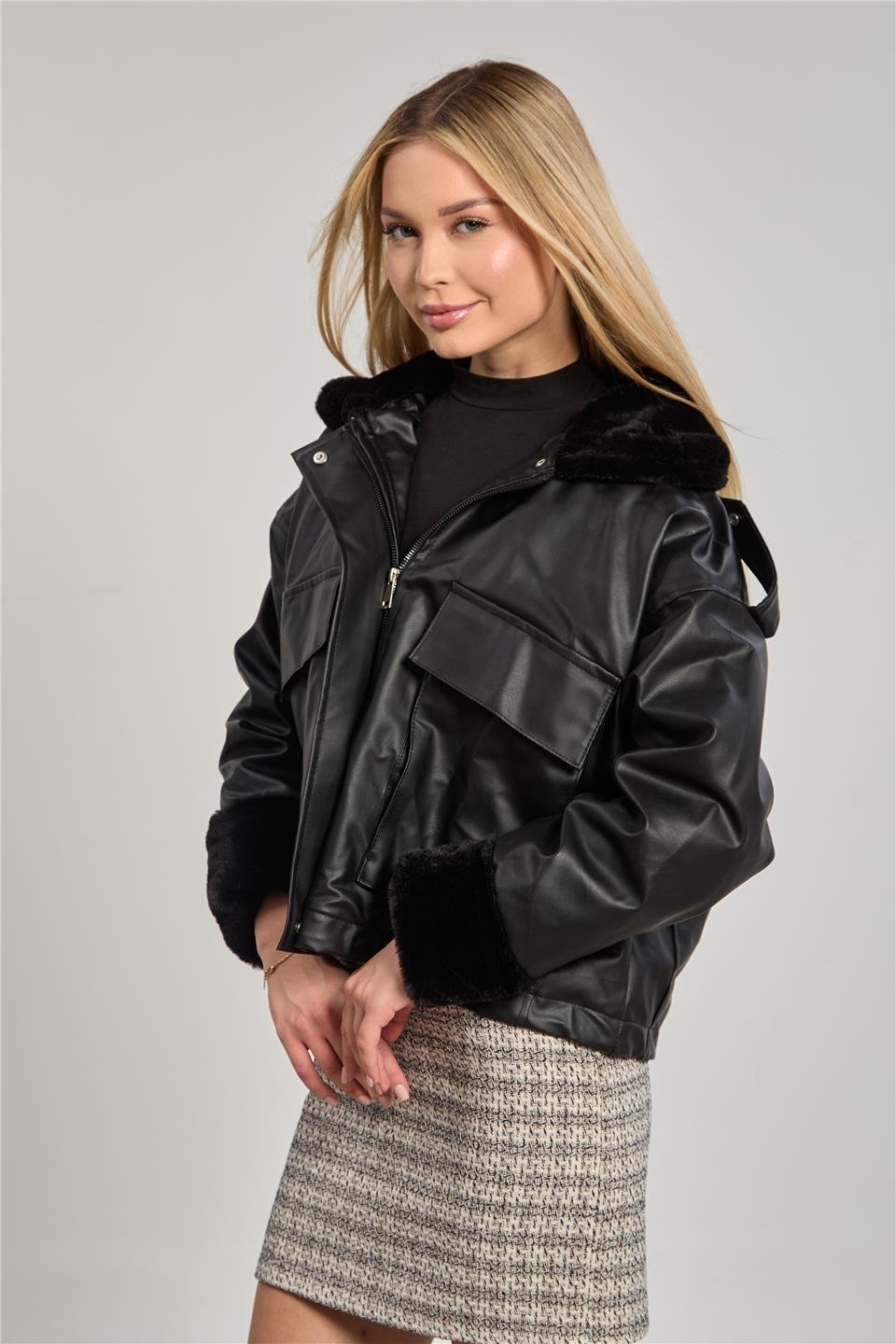 Kadın Kürk Detaylı Deri Görünümlü Mont - Siyah