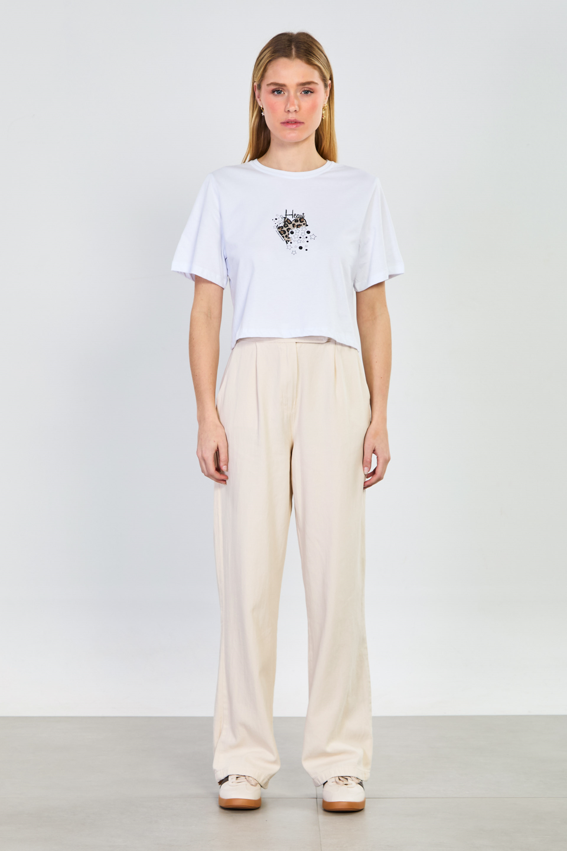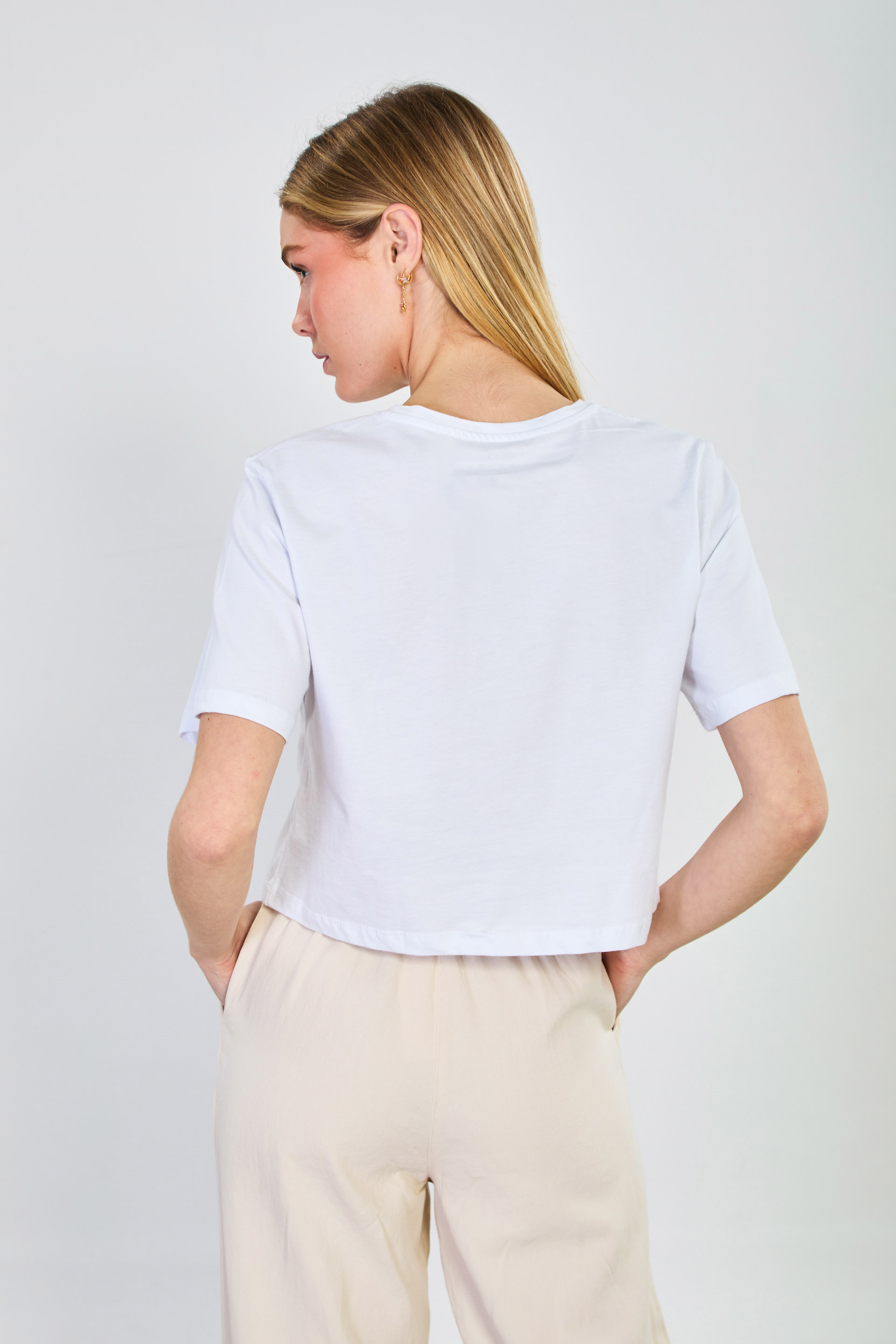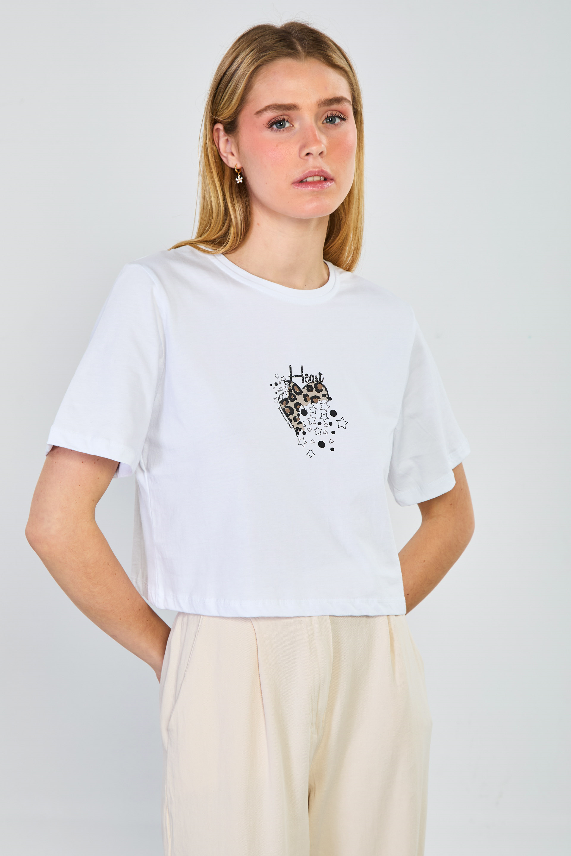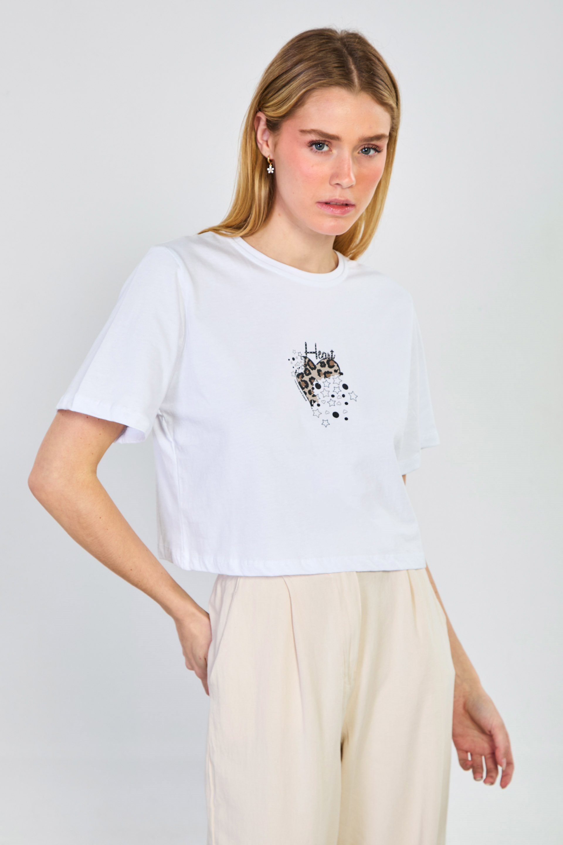 Kadın Leopar Kalp Baskılı Crop T-Shirt - Beyaz