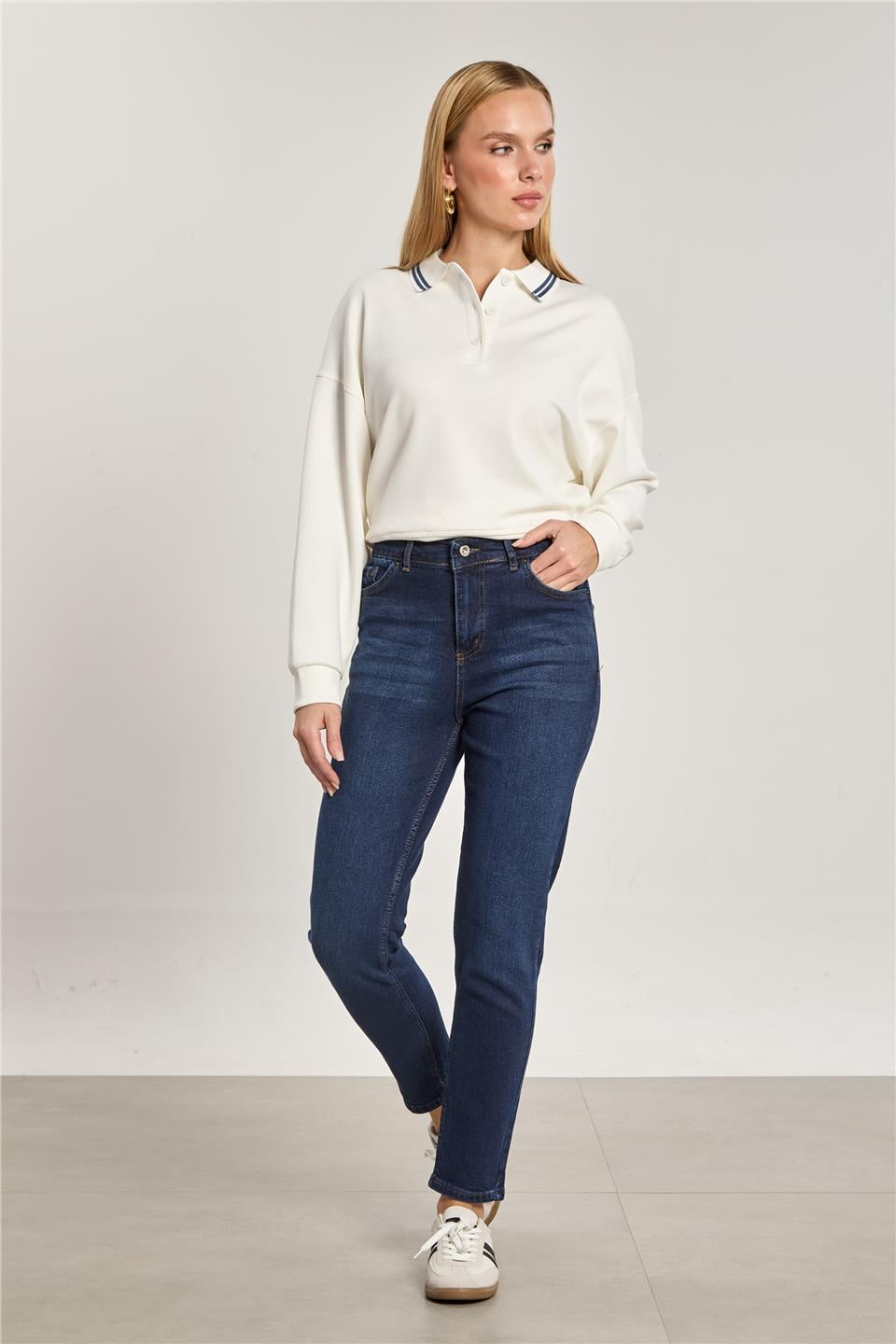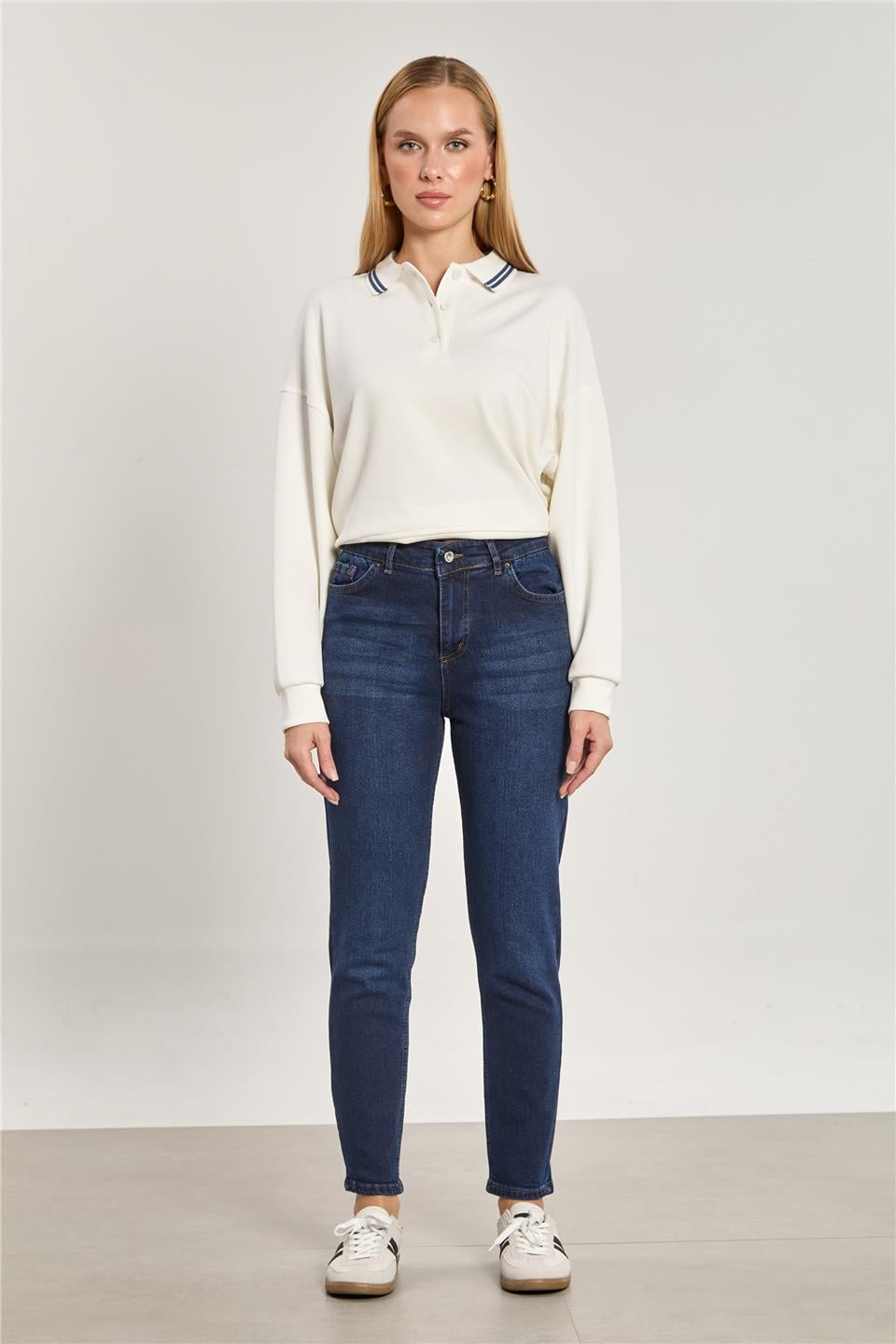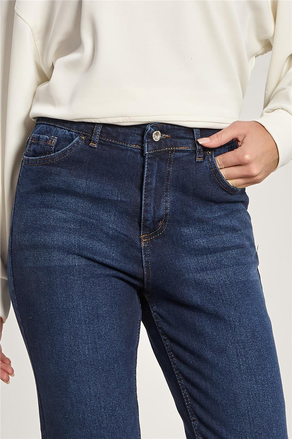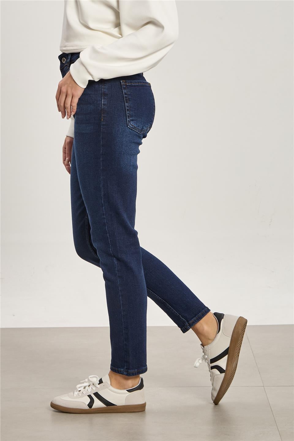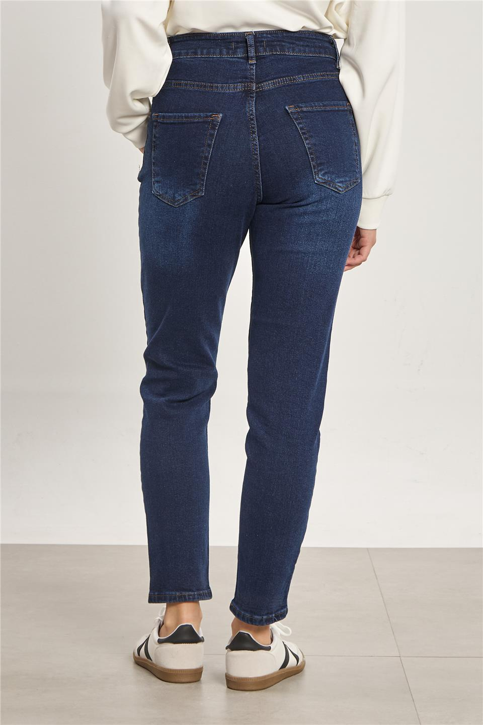 Kadın Likralı Mom Jean Pantolon - Taşlanmış Lacivert