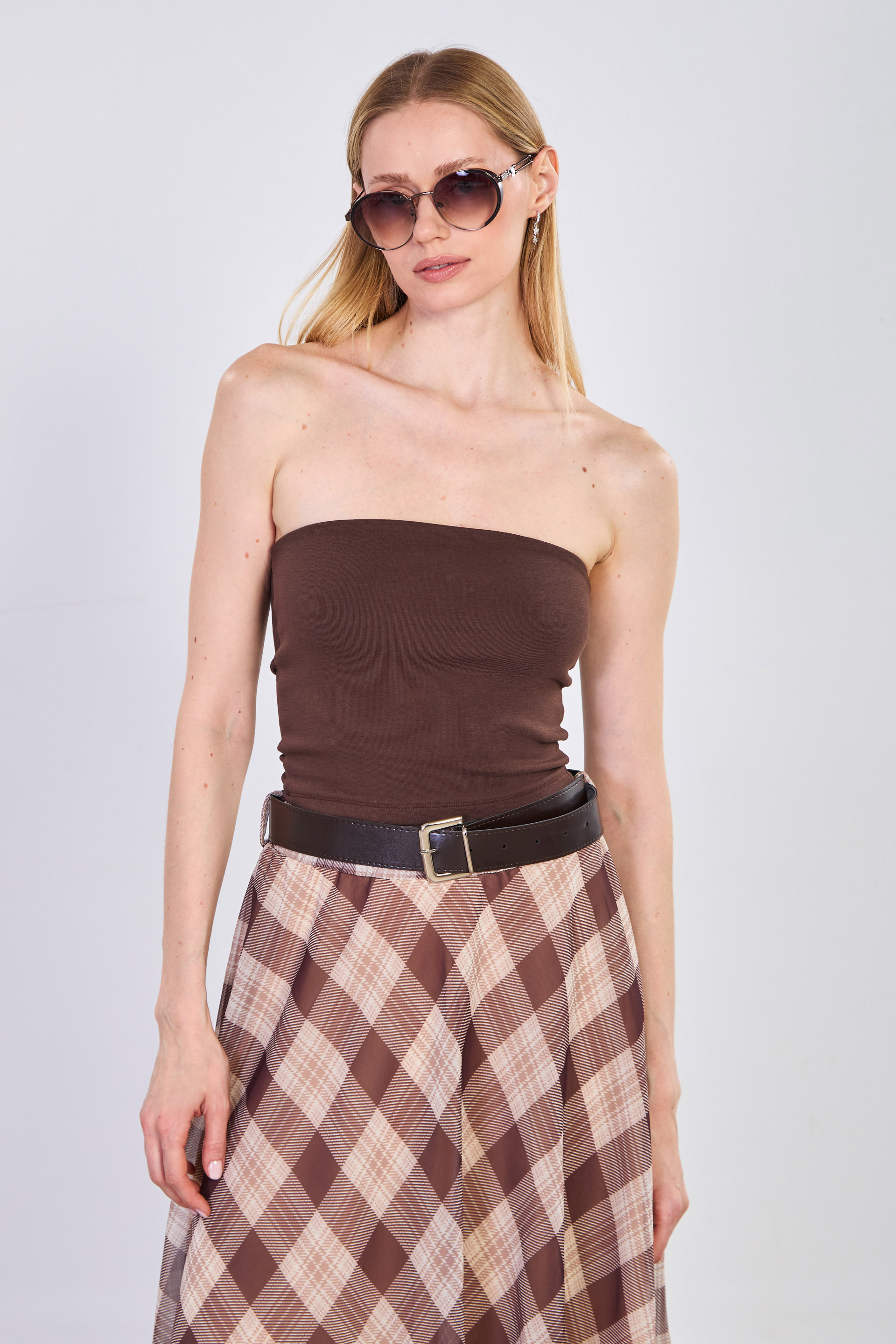 Kadın Likralı Straplez Body - Acı Kahve