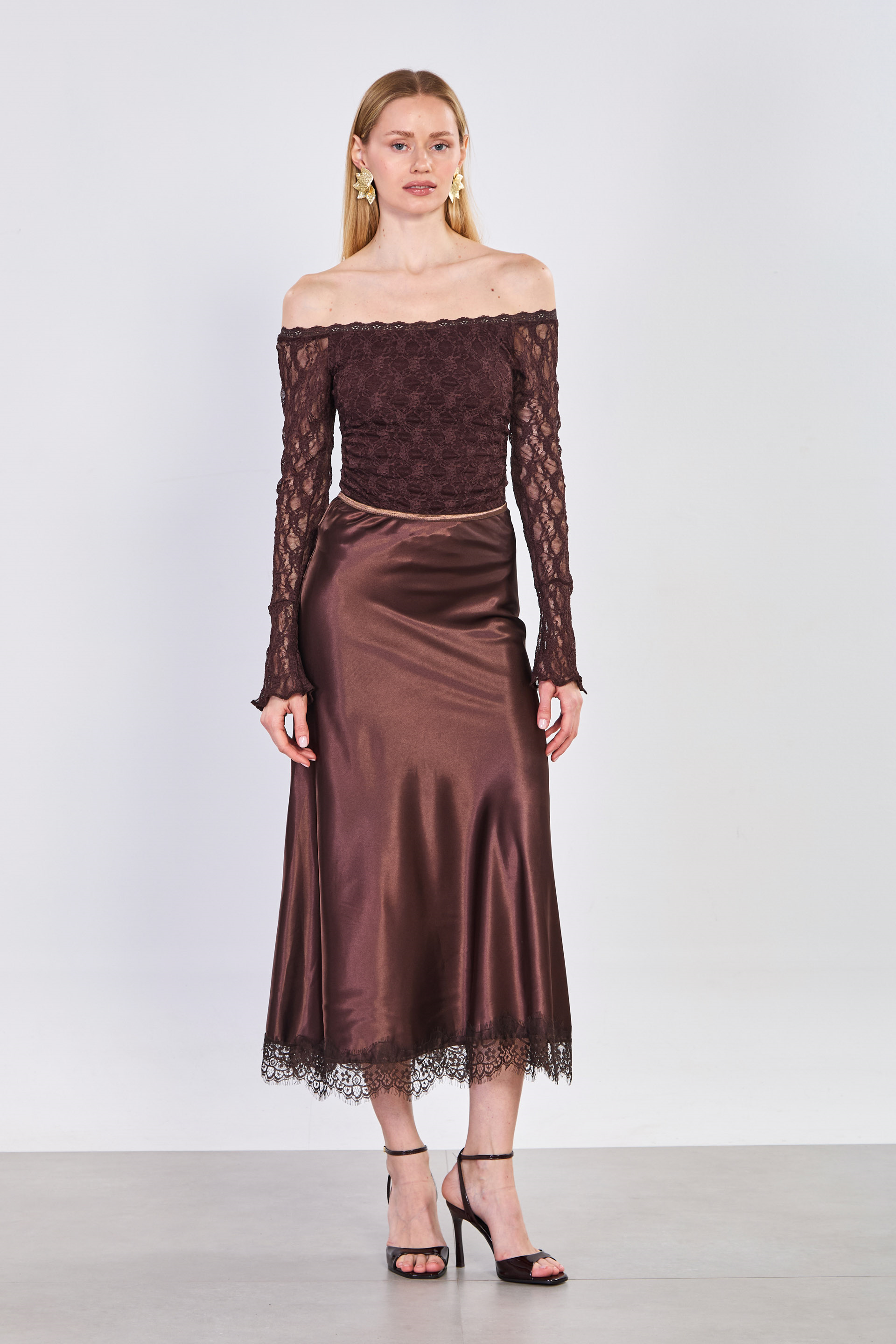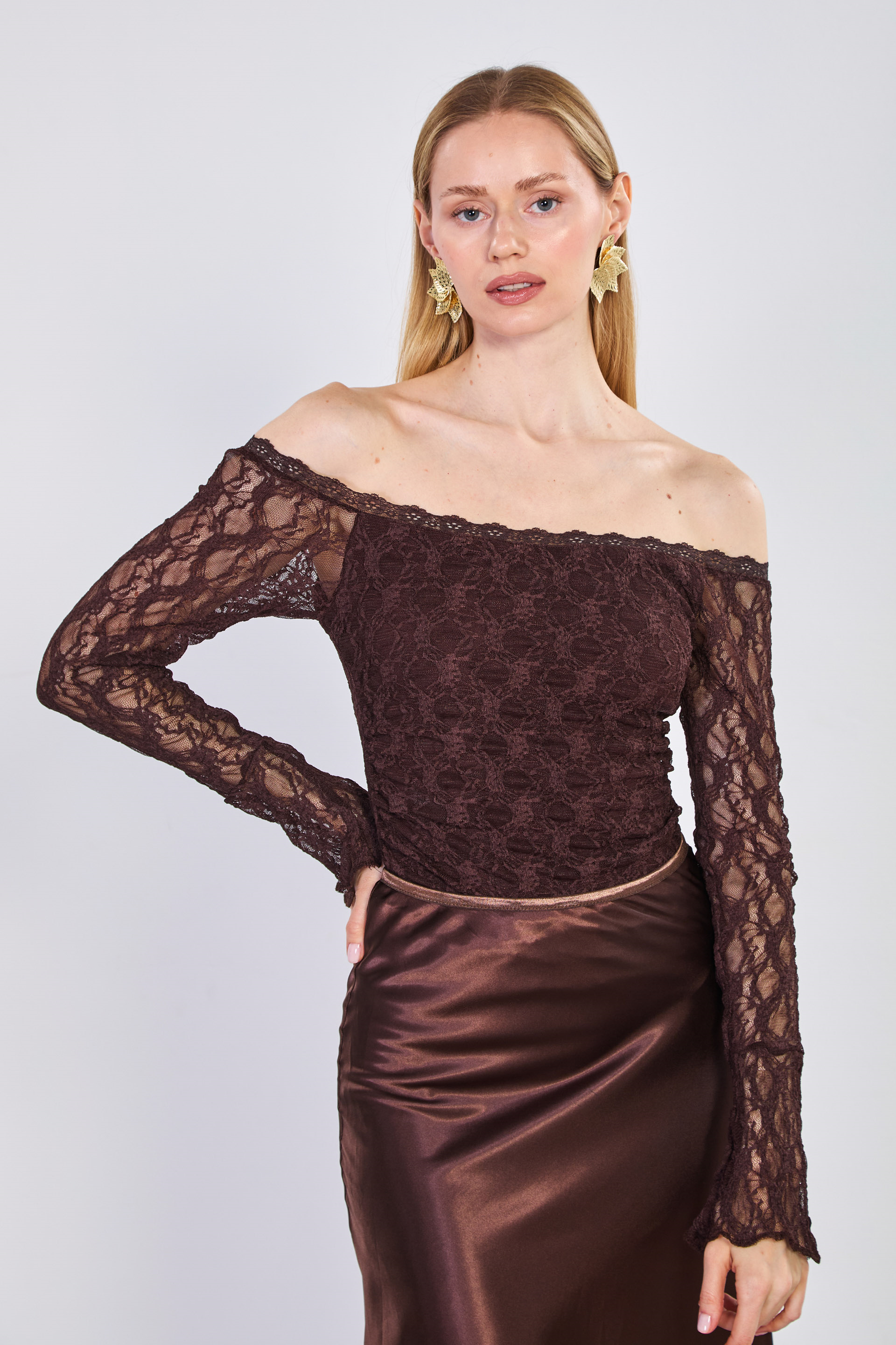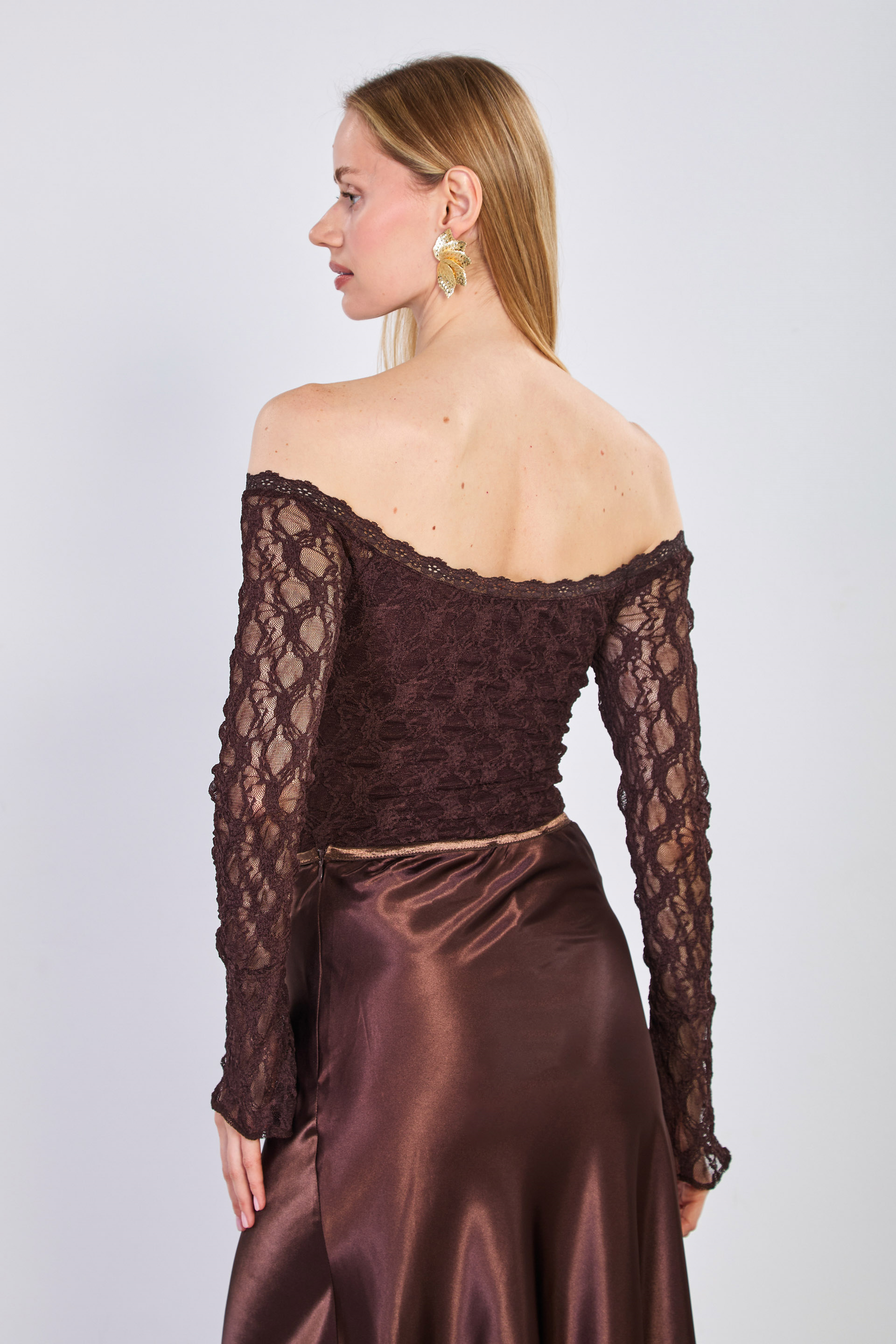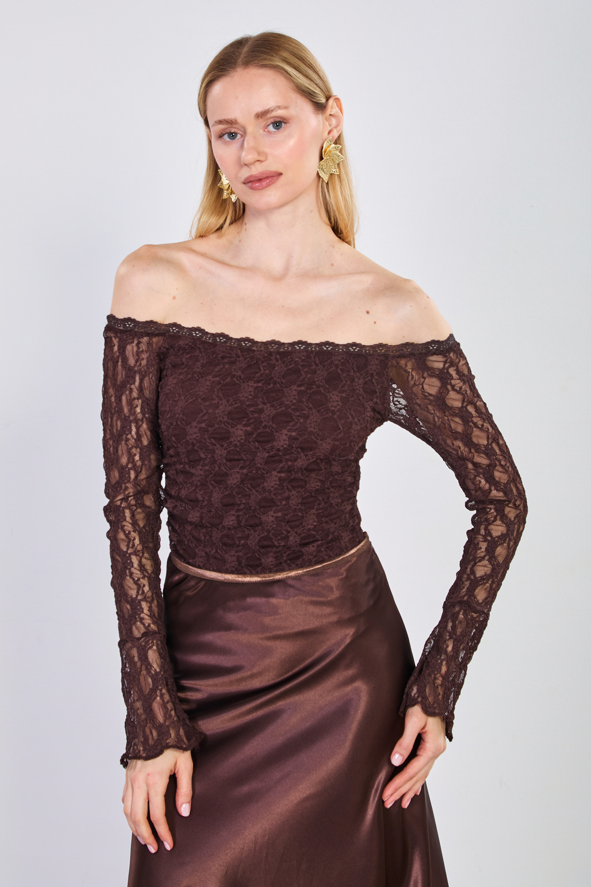 Kadın Madonna Yaka Dantelli Bluz - Acı Kahve