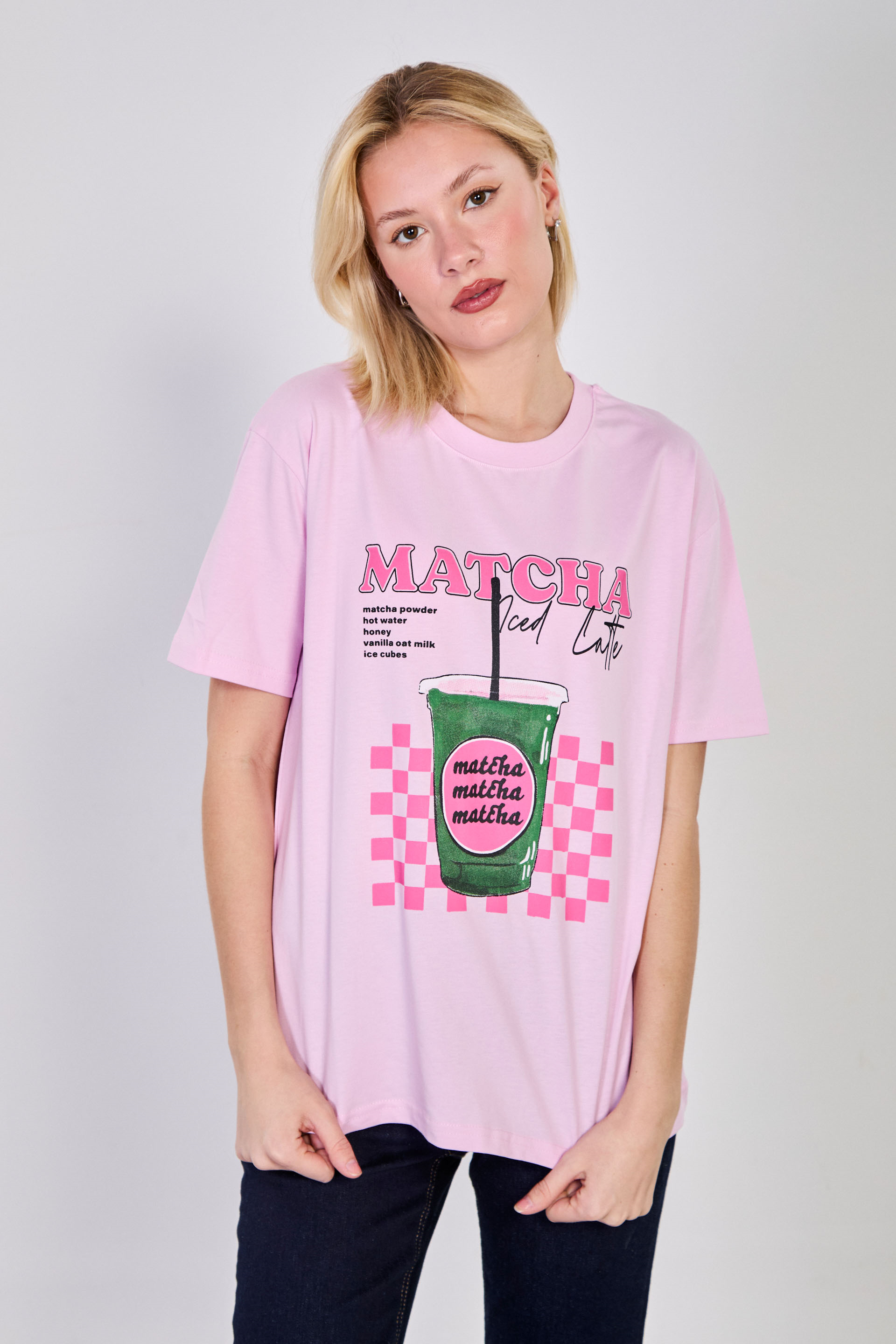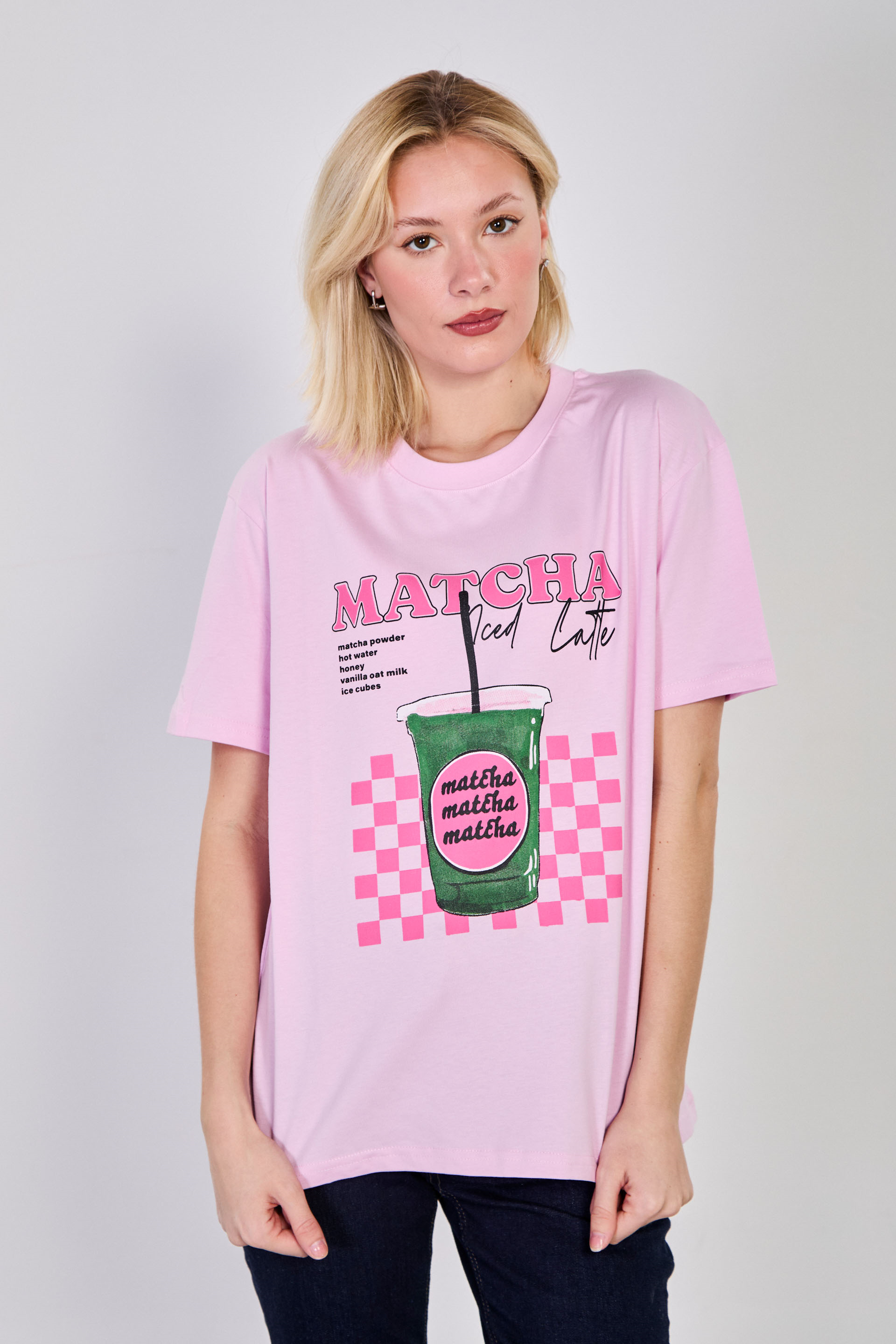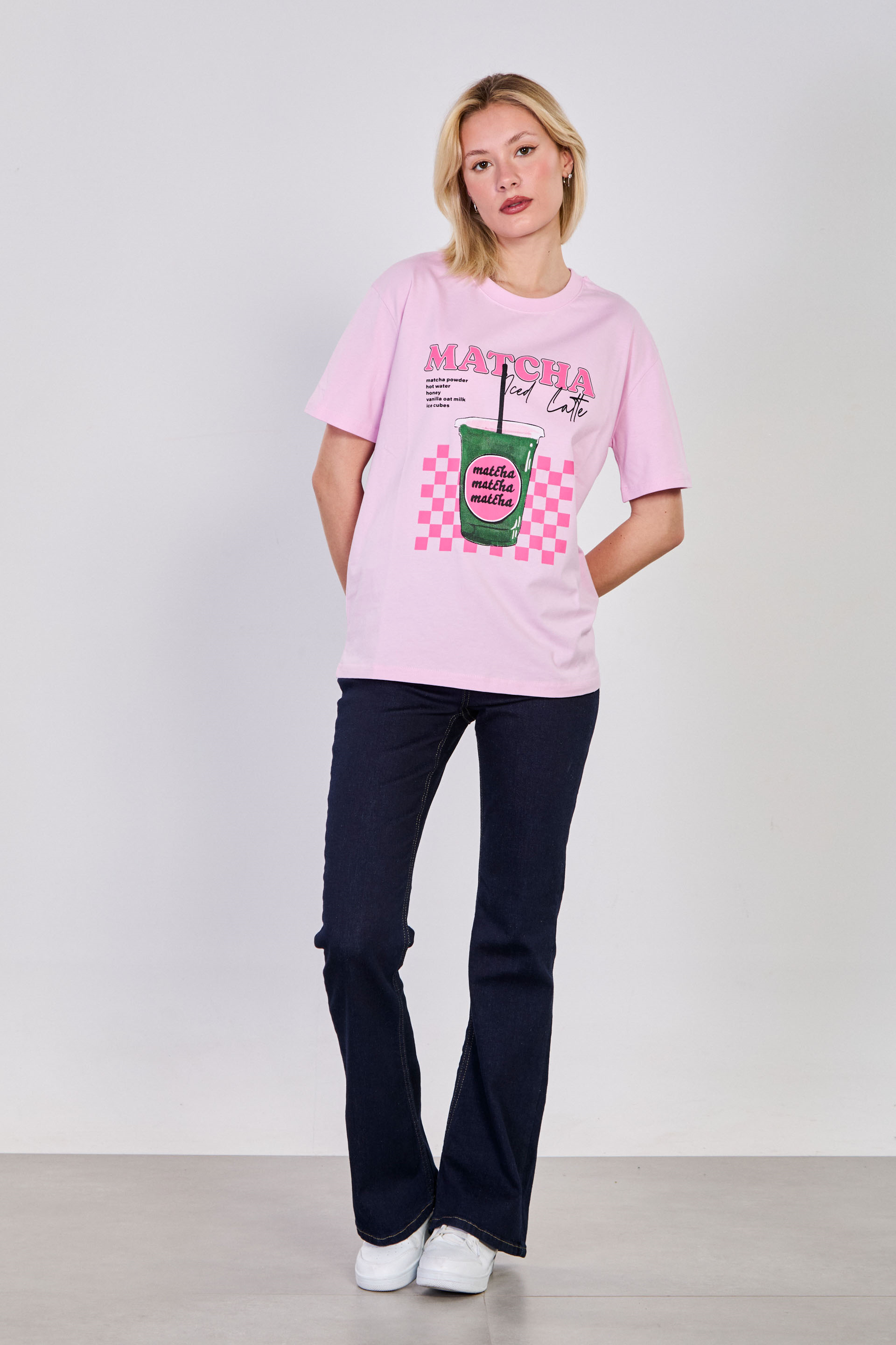 Kadın Matcha Latte Baskılı T-Shirt - Açık Pembe