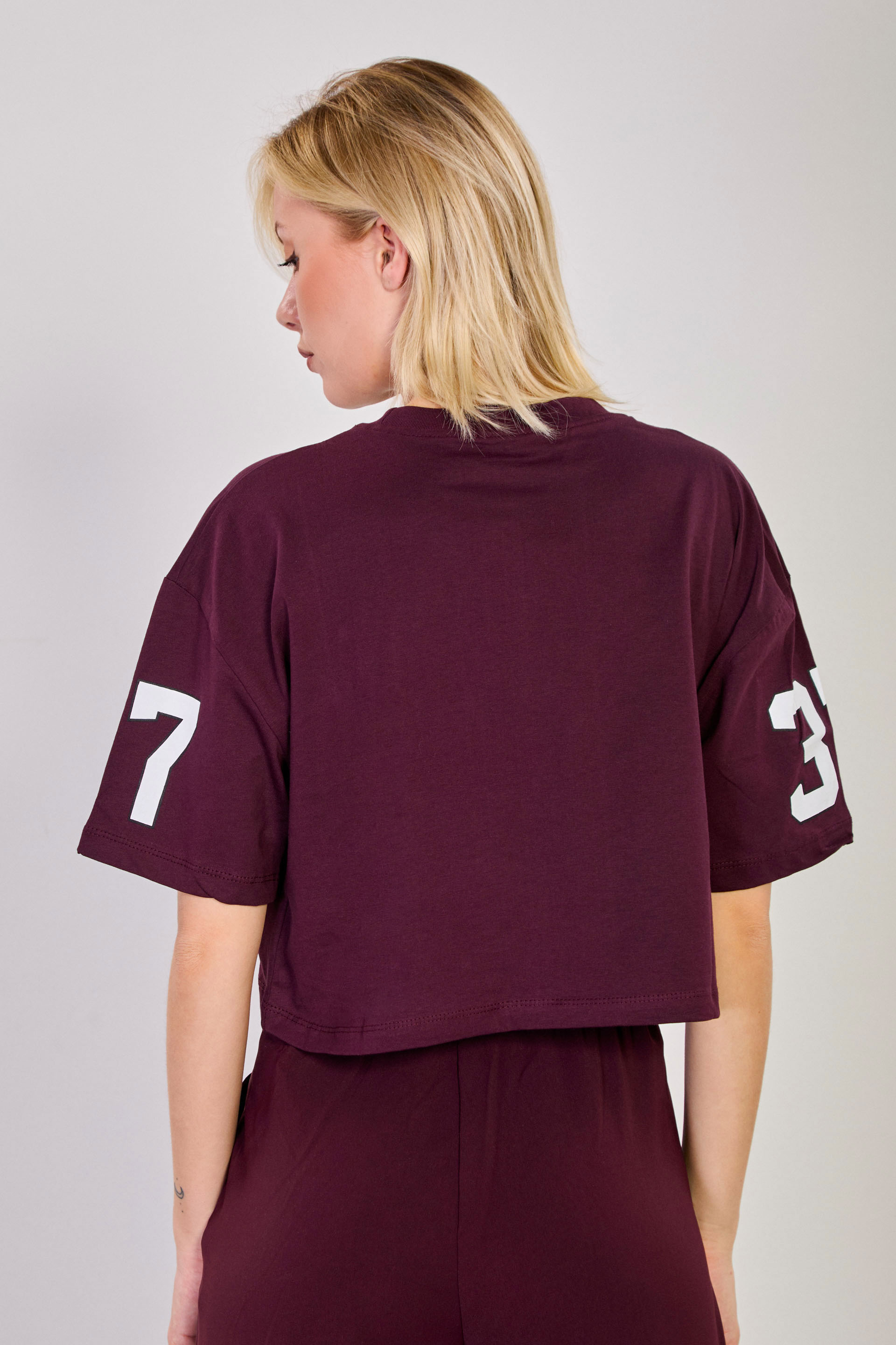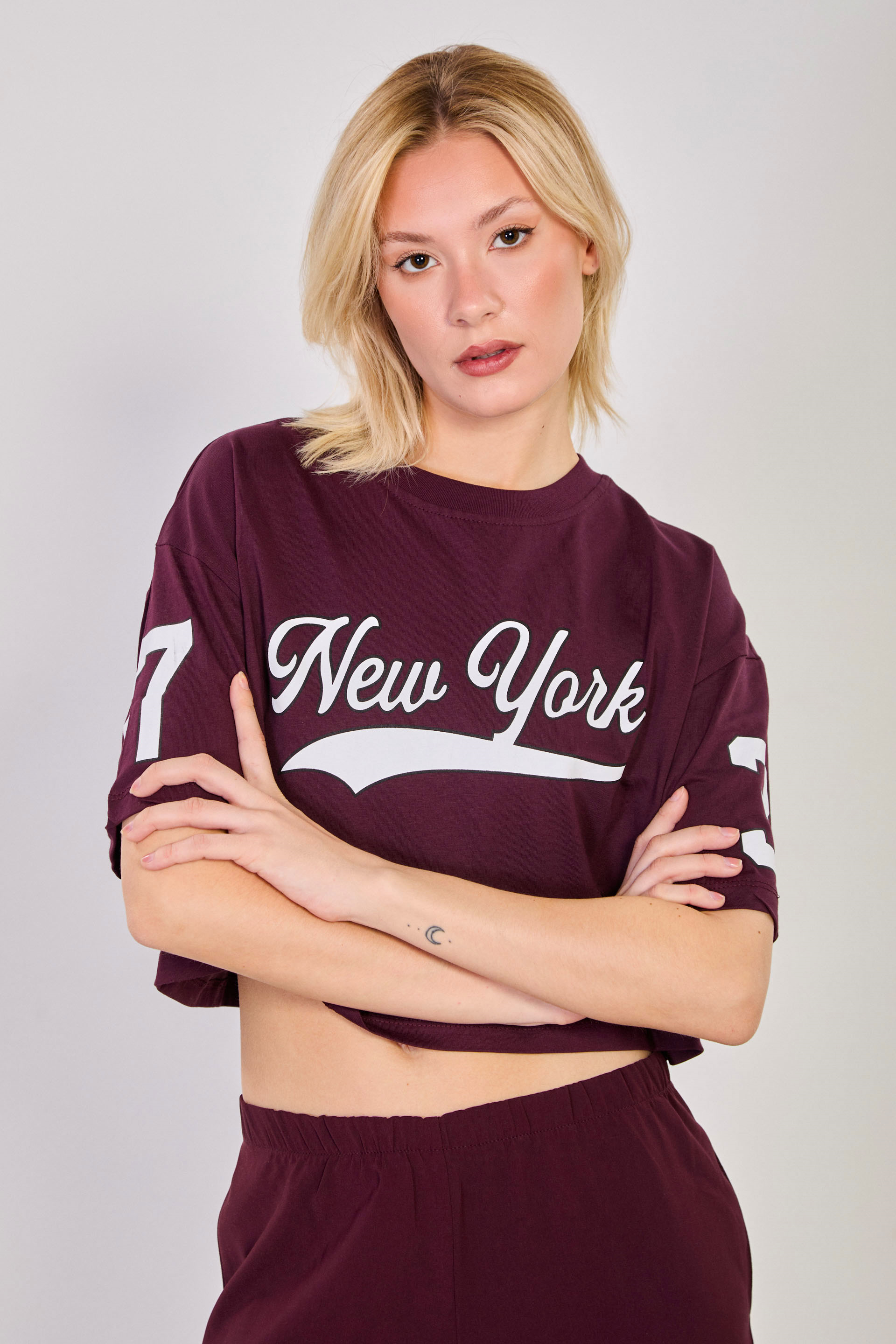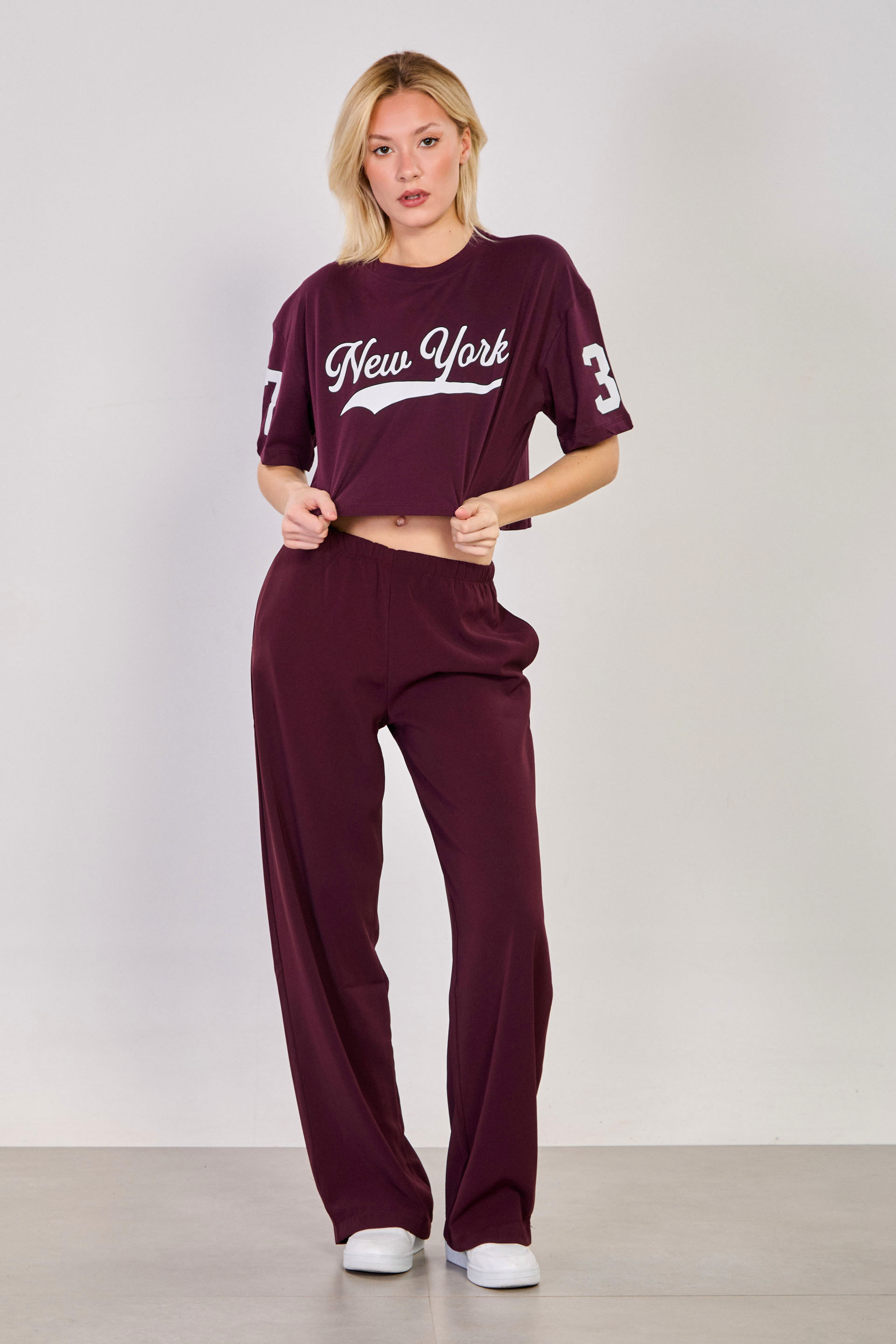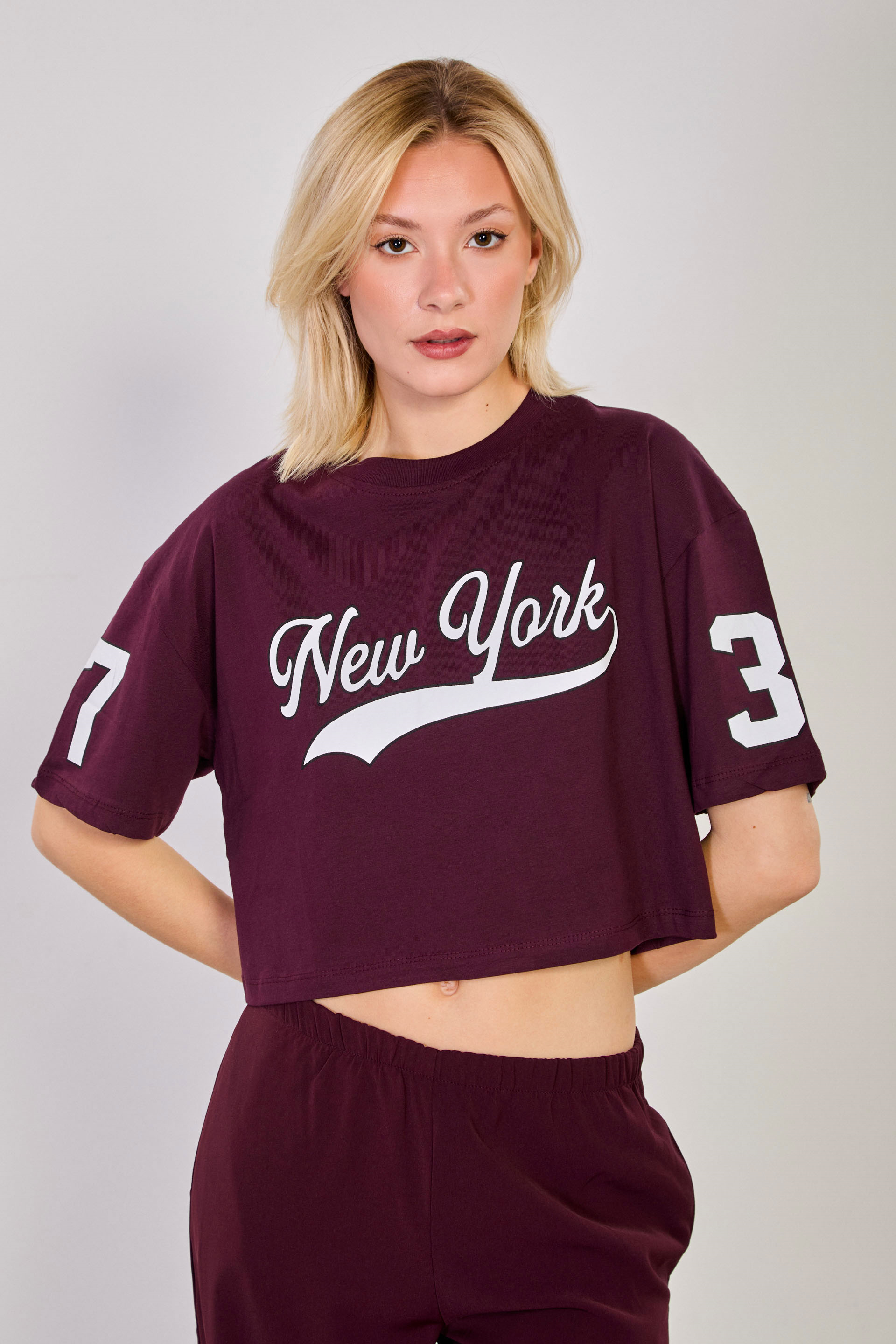 Kadın New York Baskılı Crop T-Shirt - Bordo