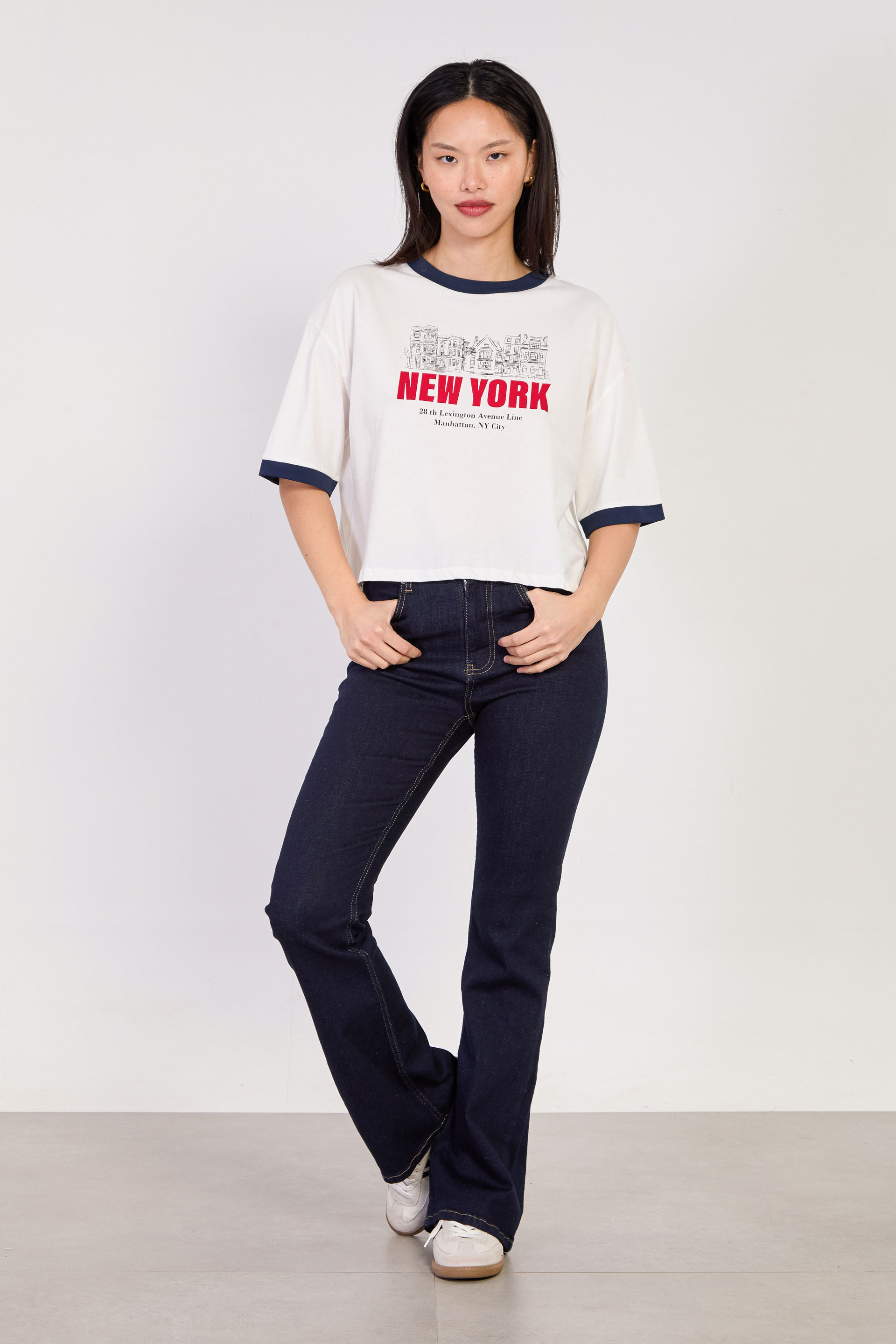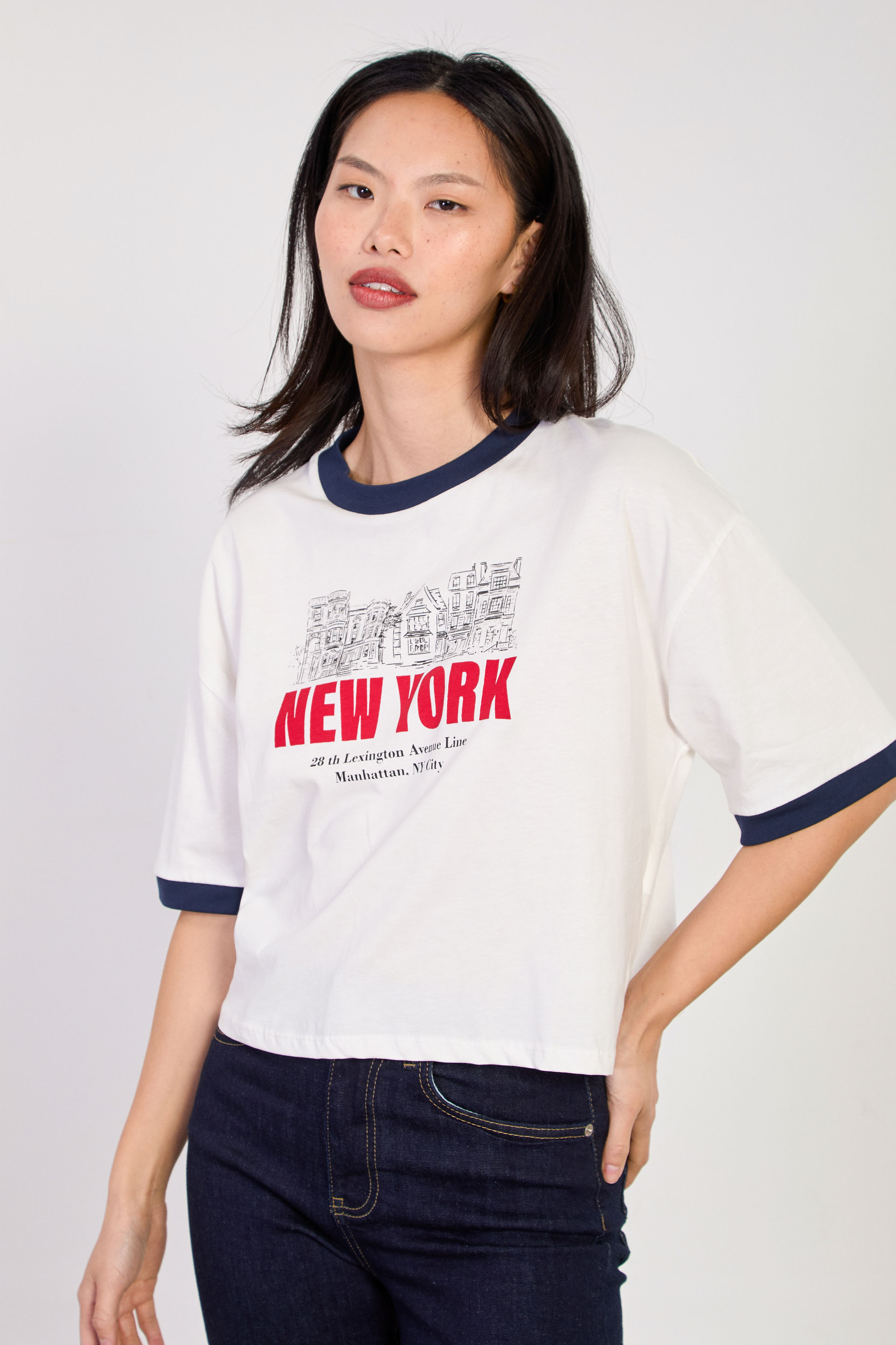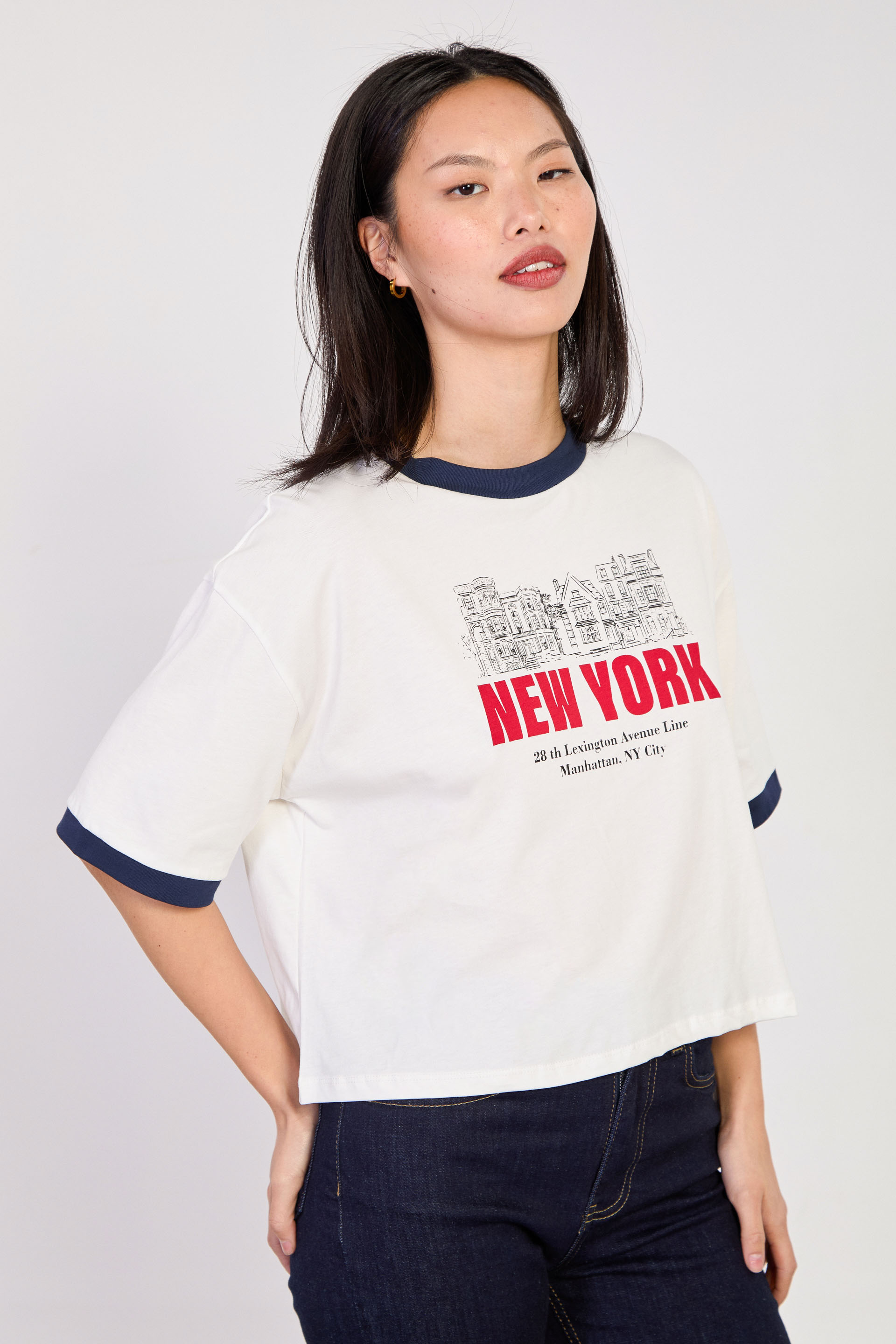Kadın New York Yazılı Garnili T-Shirt - Ekru