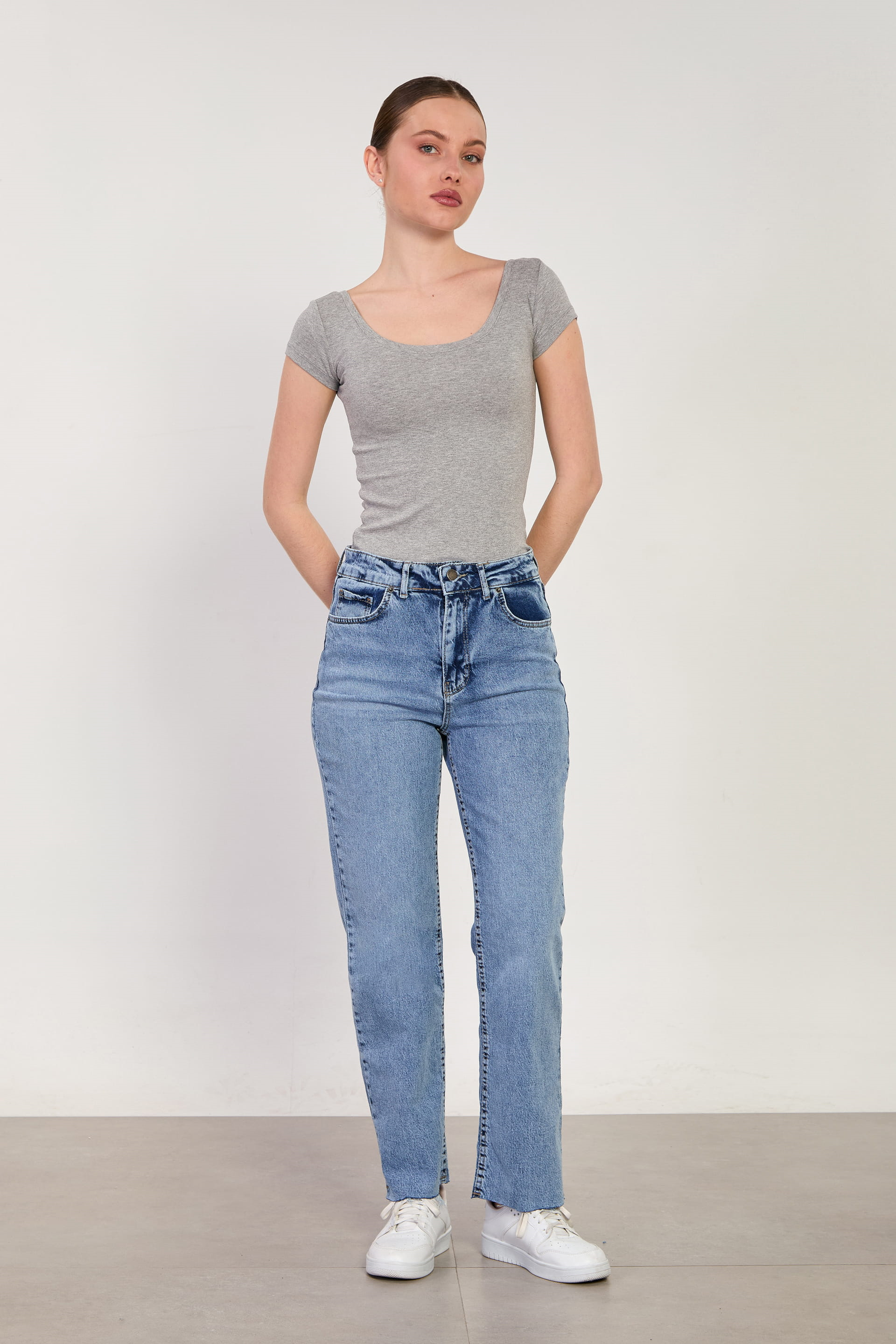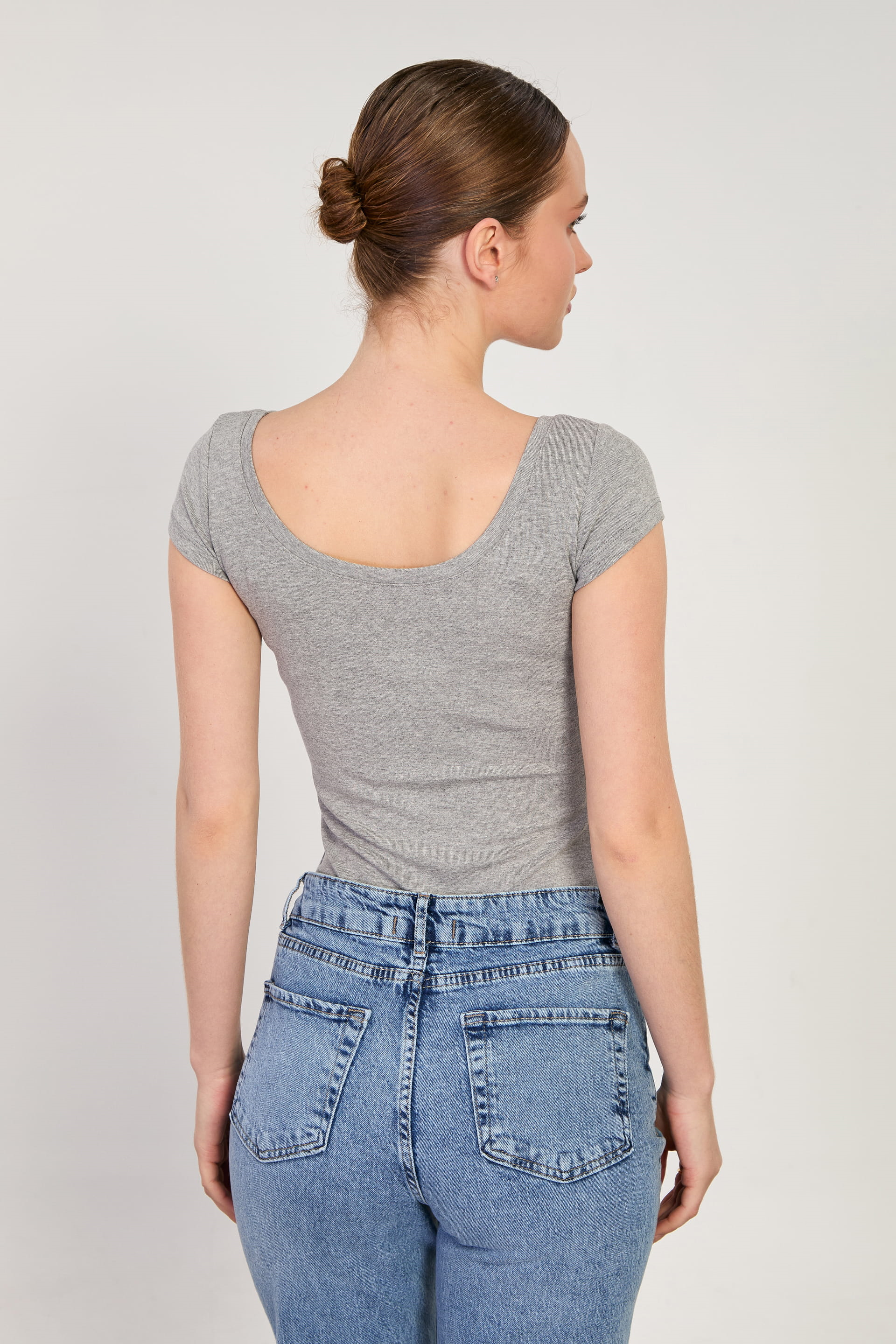 Kadın Ön Arka Açık Yaka Basic Kısa Kol Body - Gri