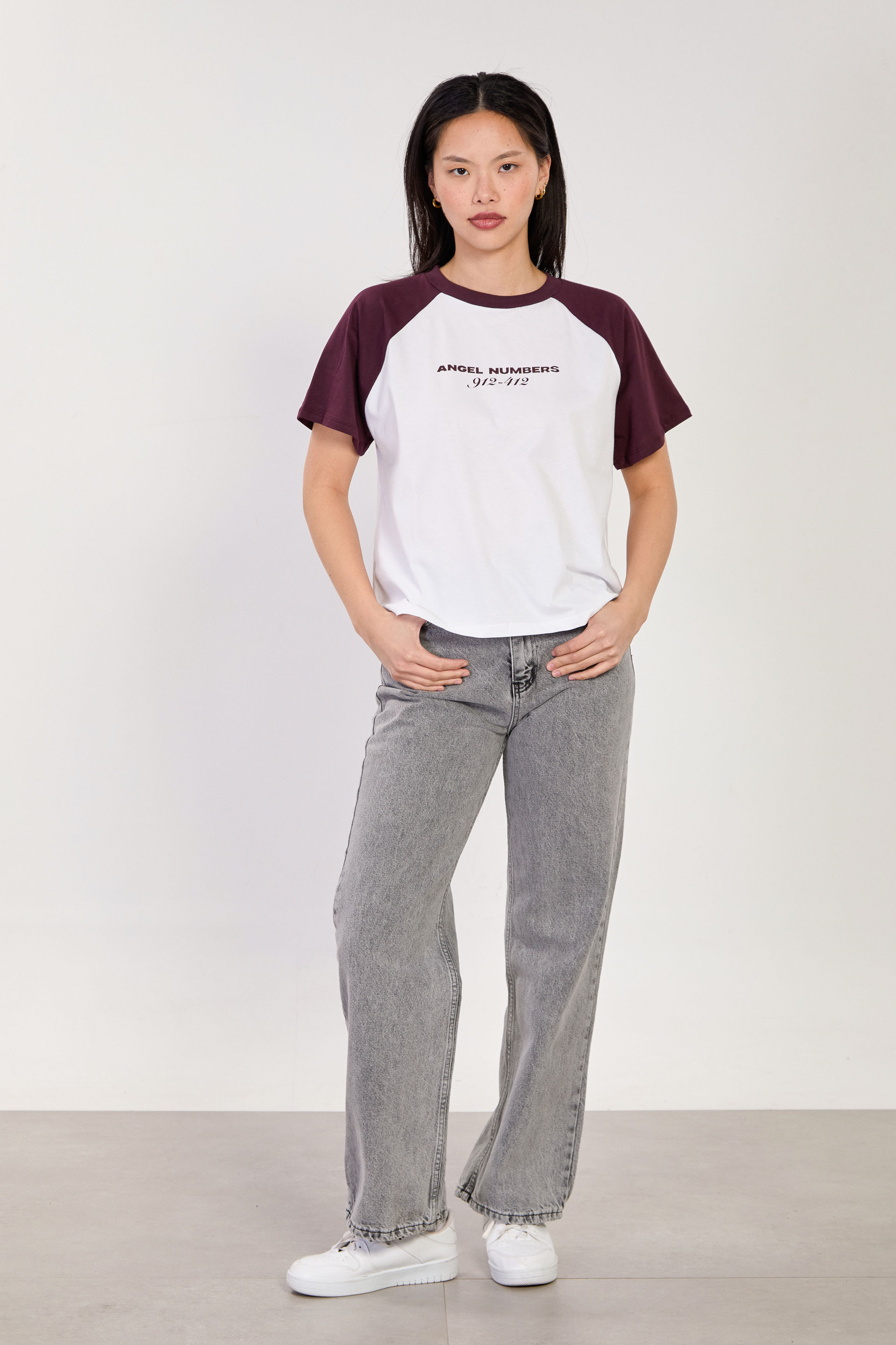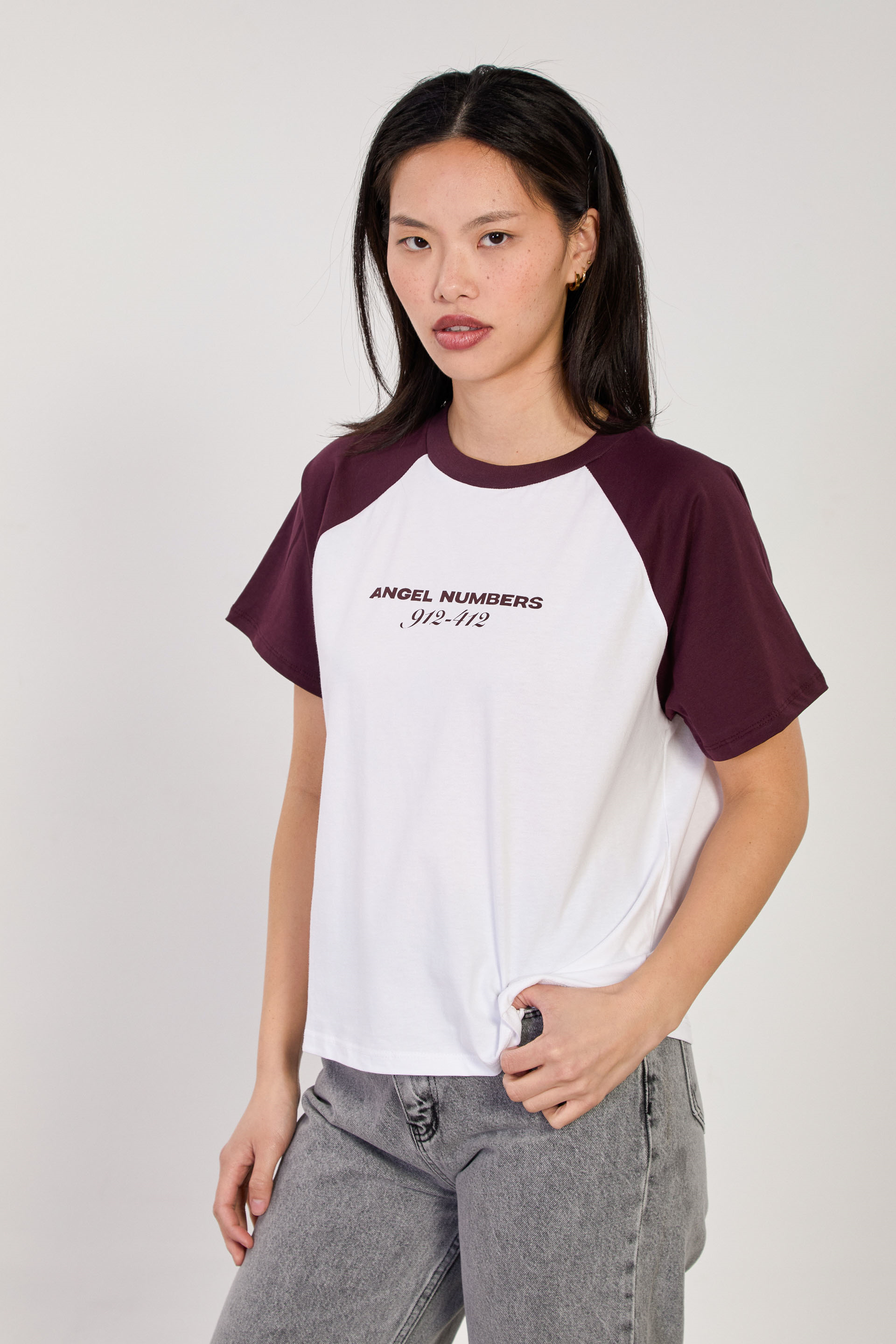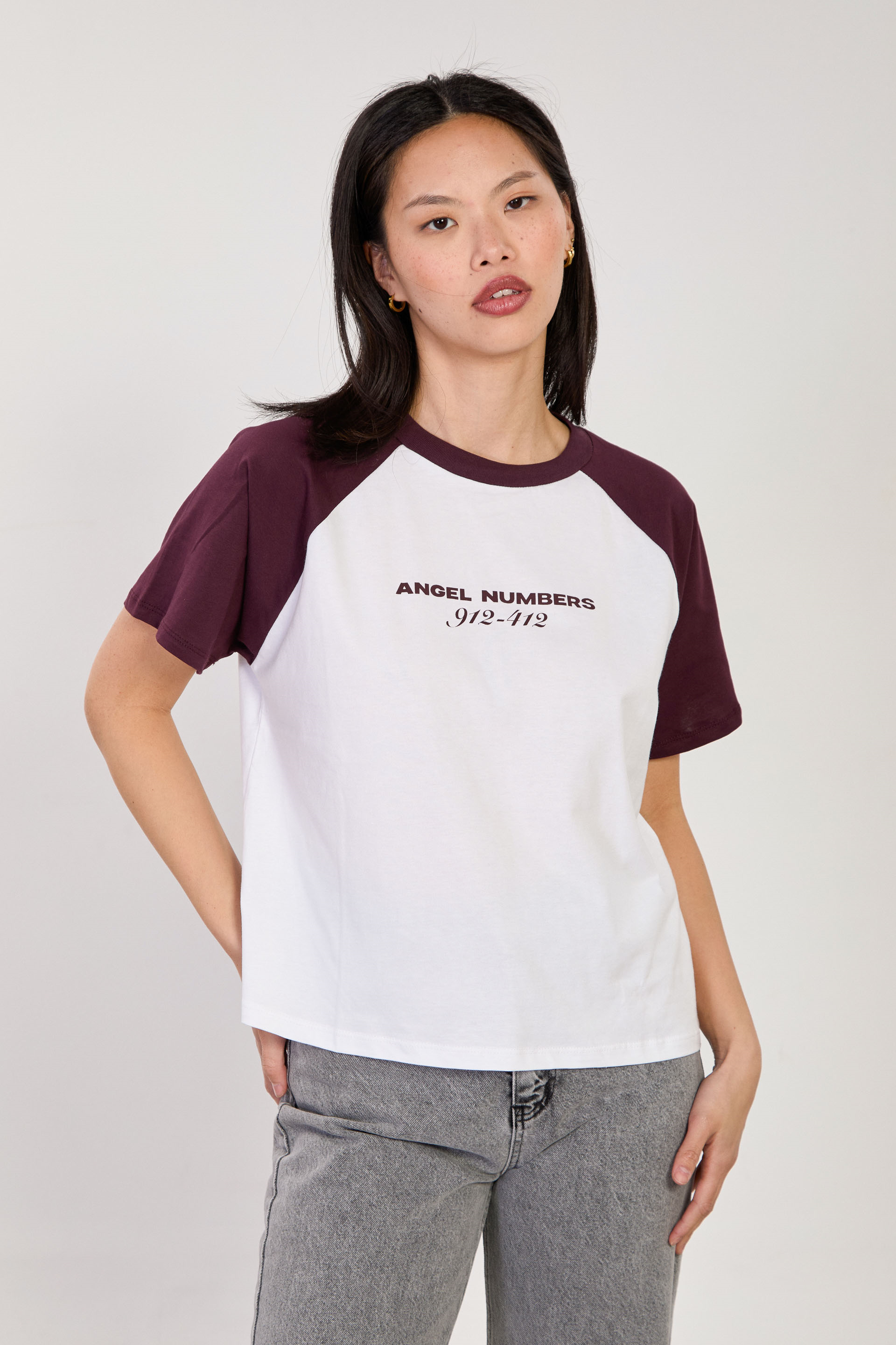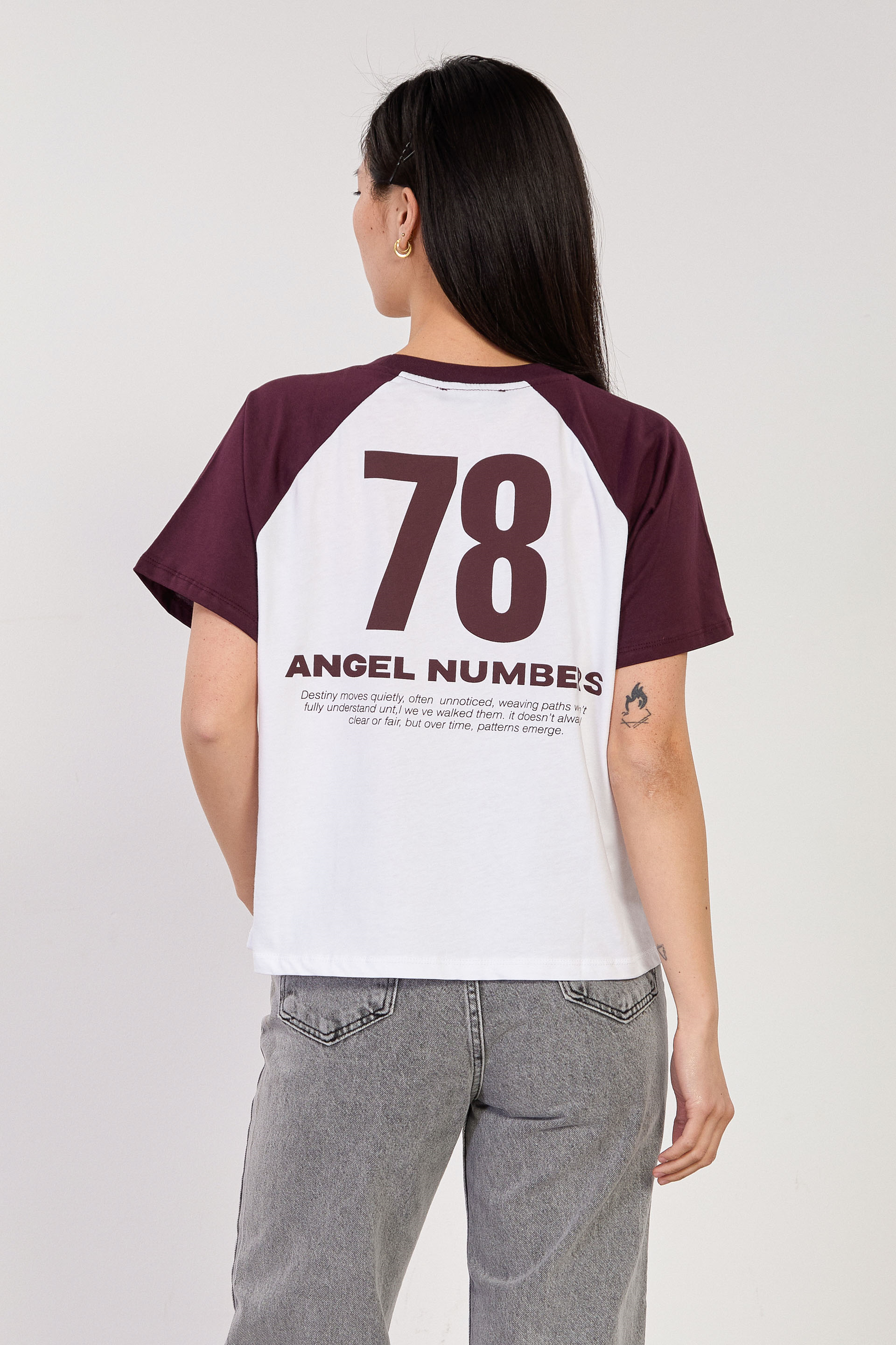 Kadın Ön Arka Baskılı Kol Garnili T-Shirt - Beyaz/Mürdüm