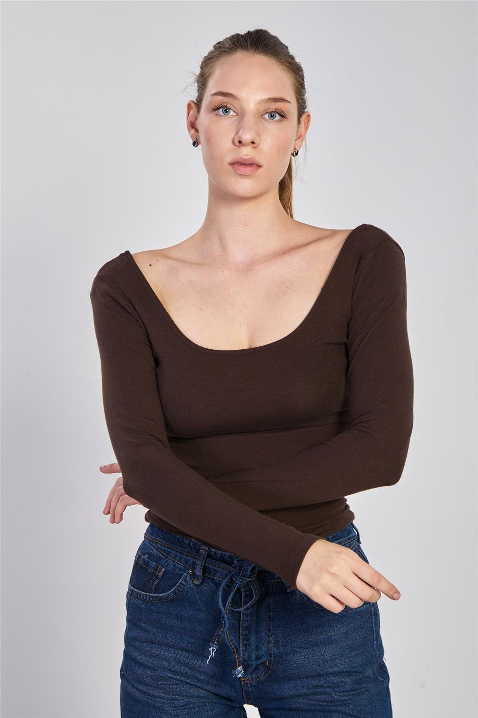 Kadın Ön Arka Kayık Yaka Body - Kahve