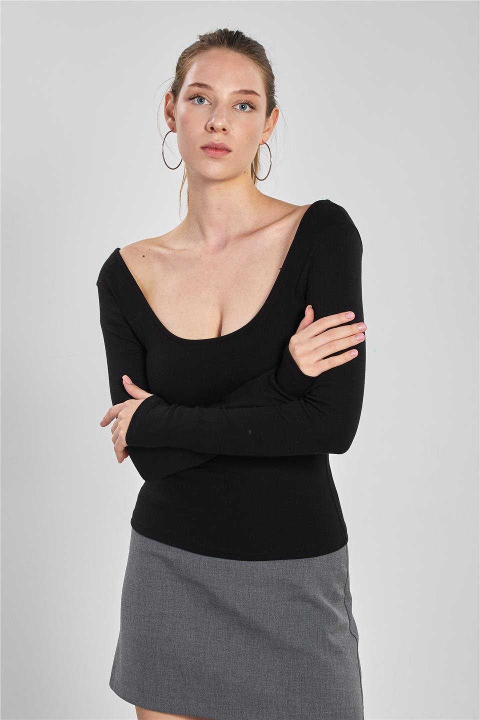 Kadın Ön Arka Kayık Yaka Body - Siyah