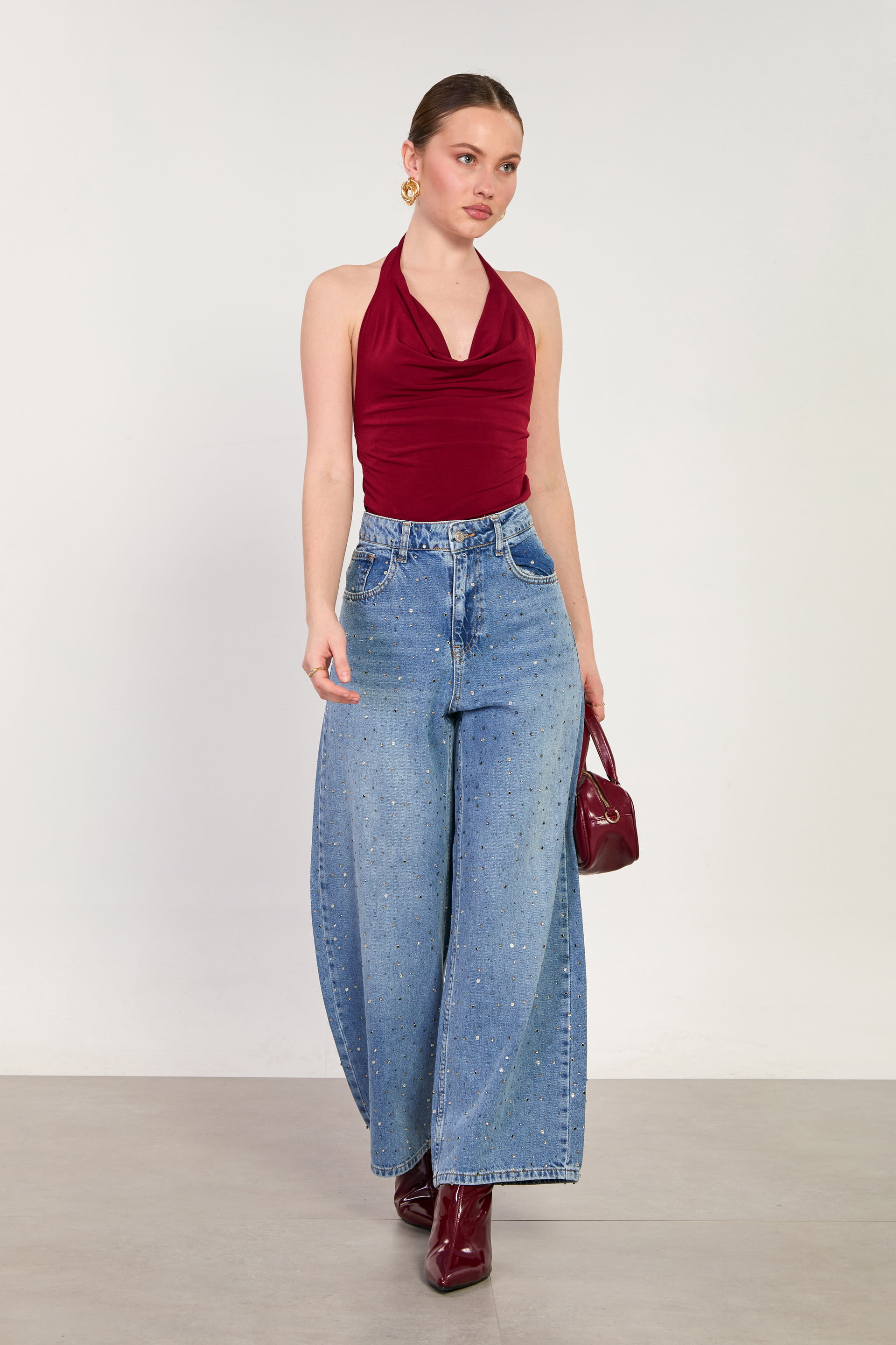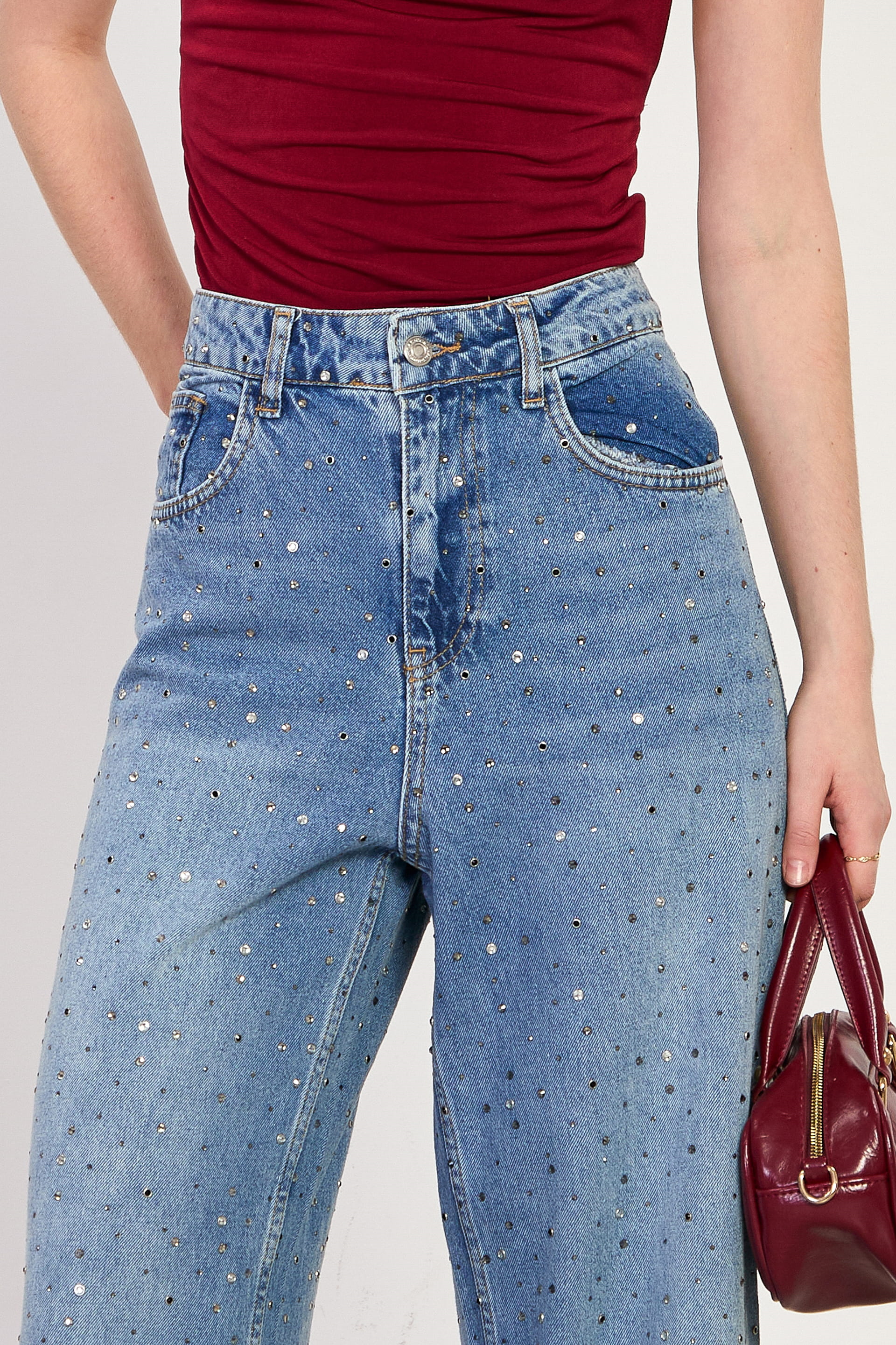 Kadın Ön Arka Taş Baskılı Bol Paça Jean Pantolon - Açık Mavi