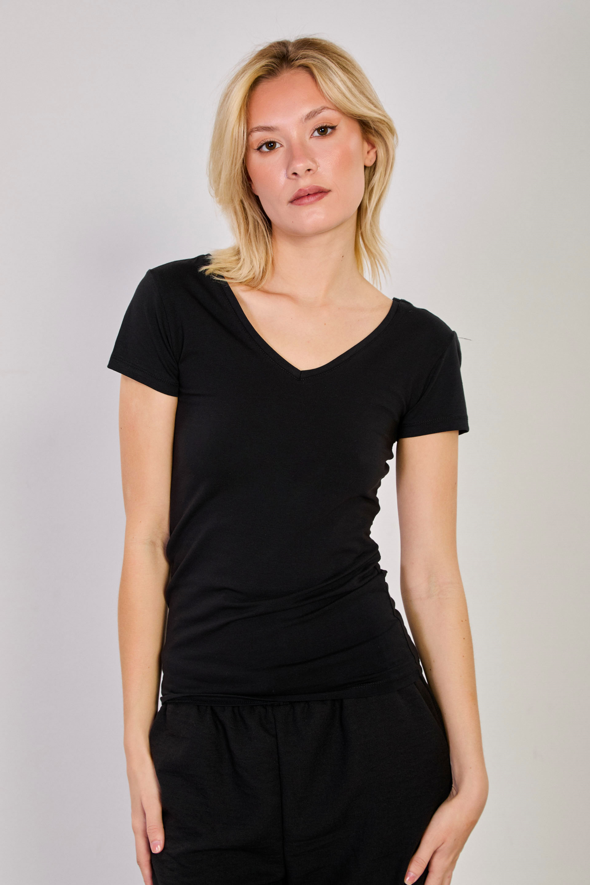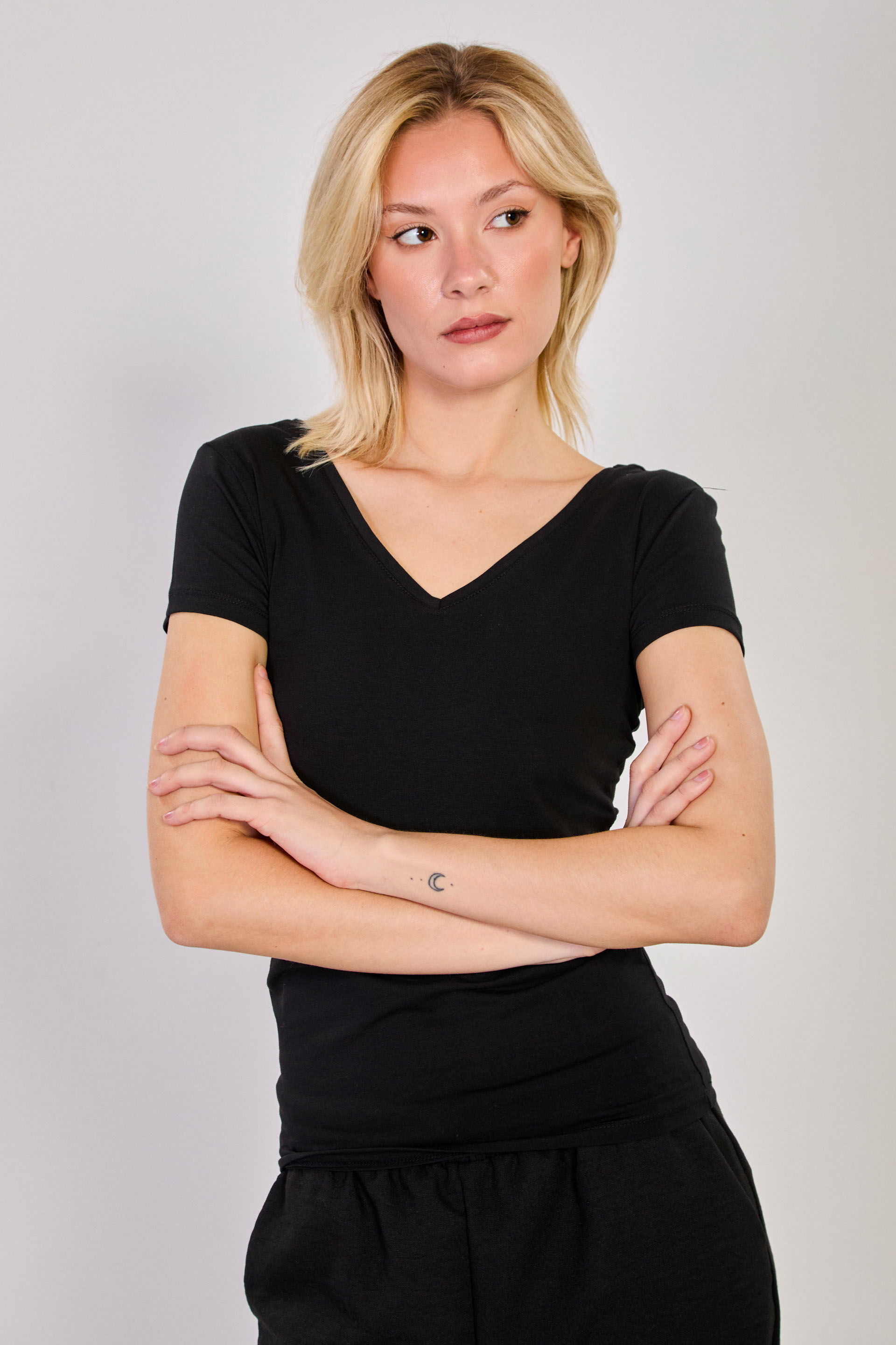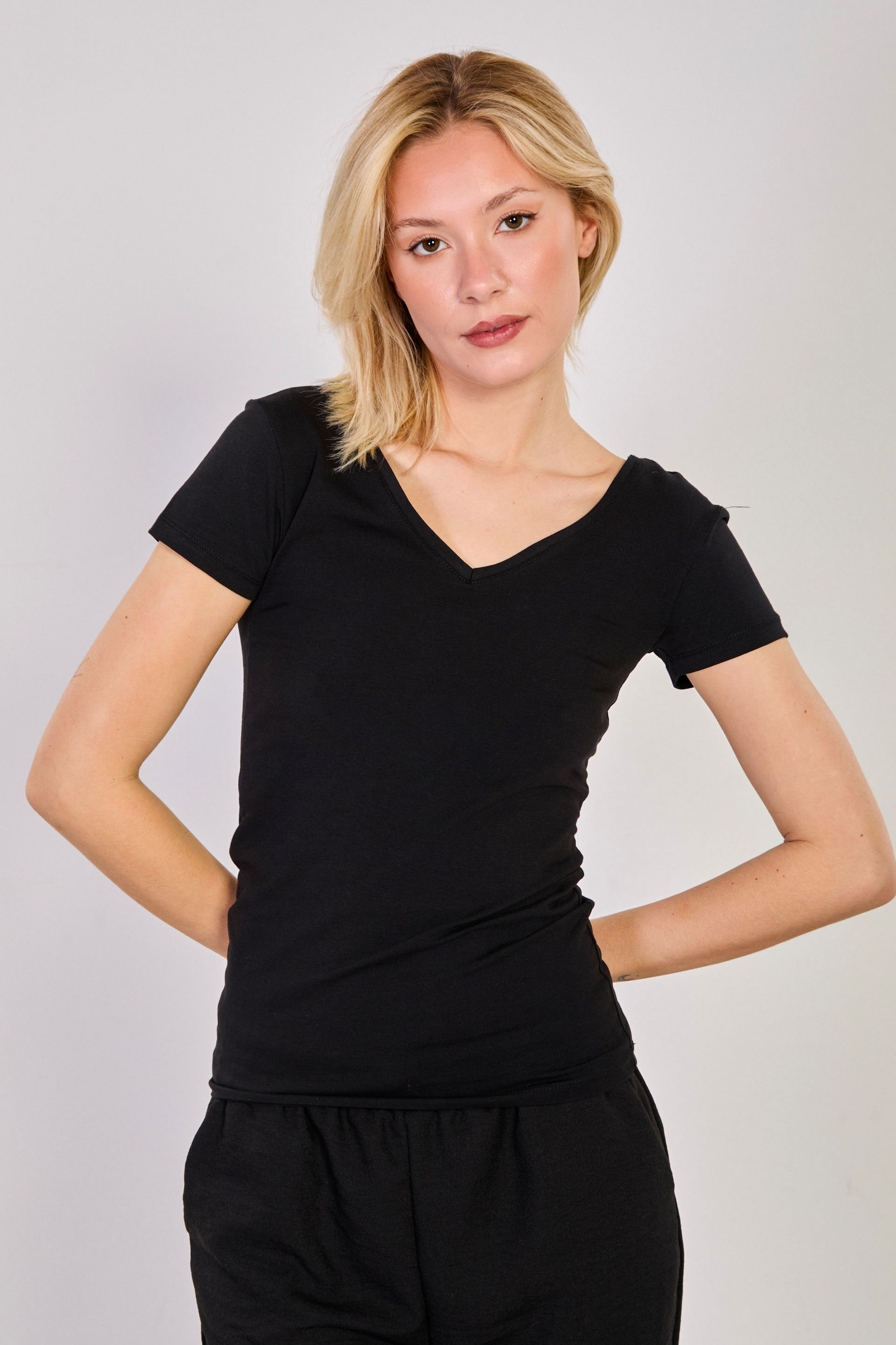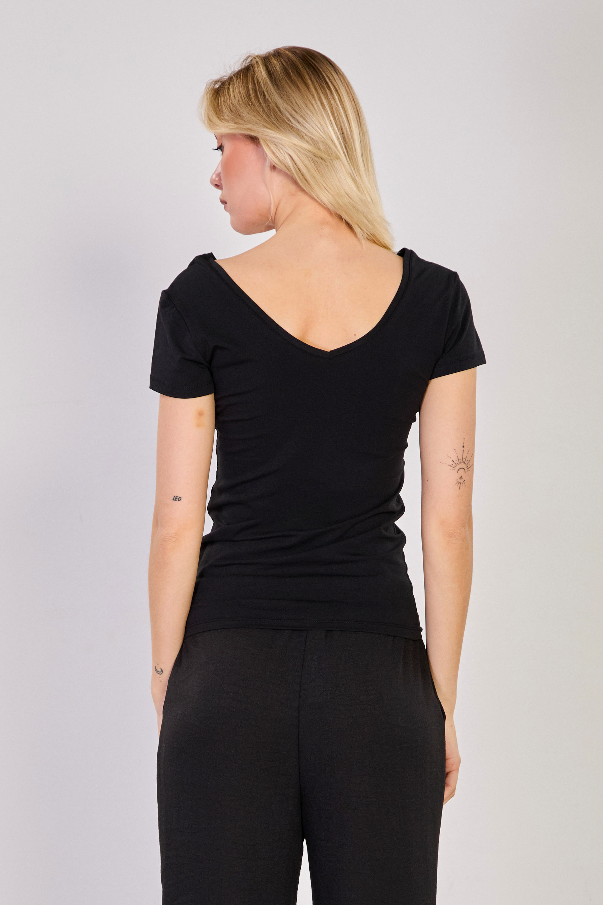 Kadın Ön Arka V Yaka Kısa Kol Body - Siyah