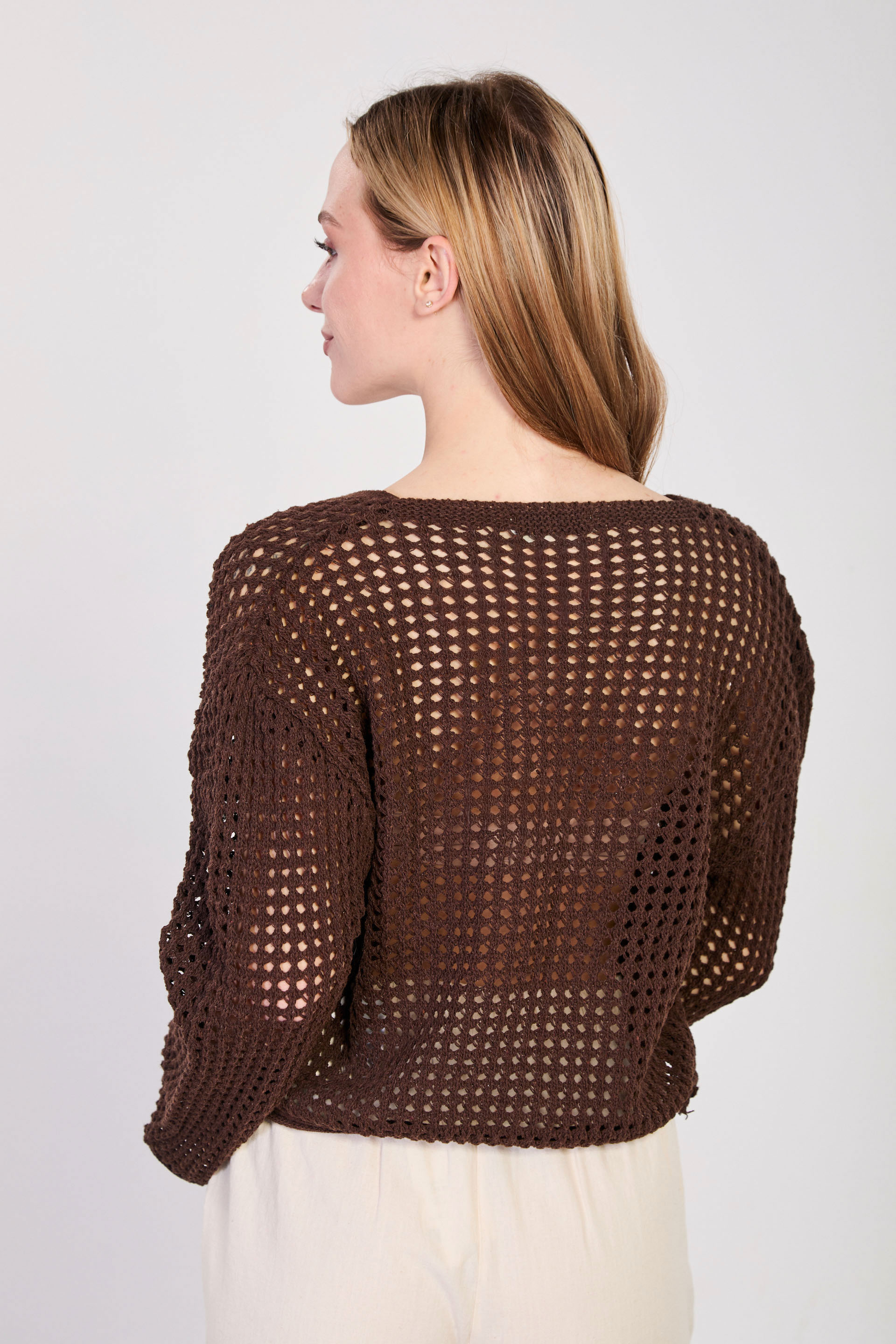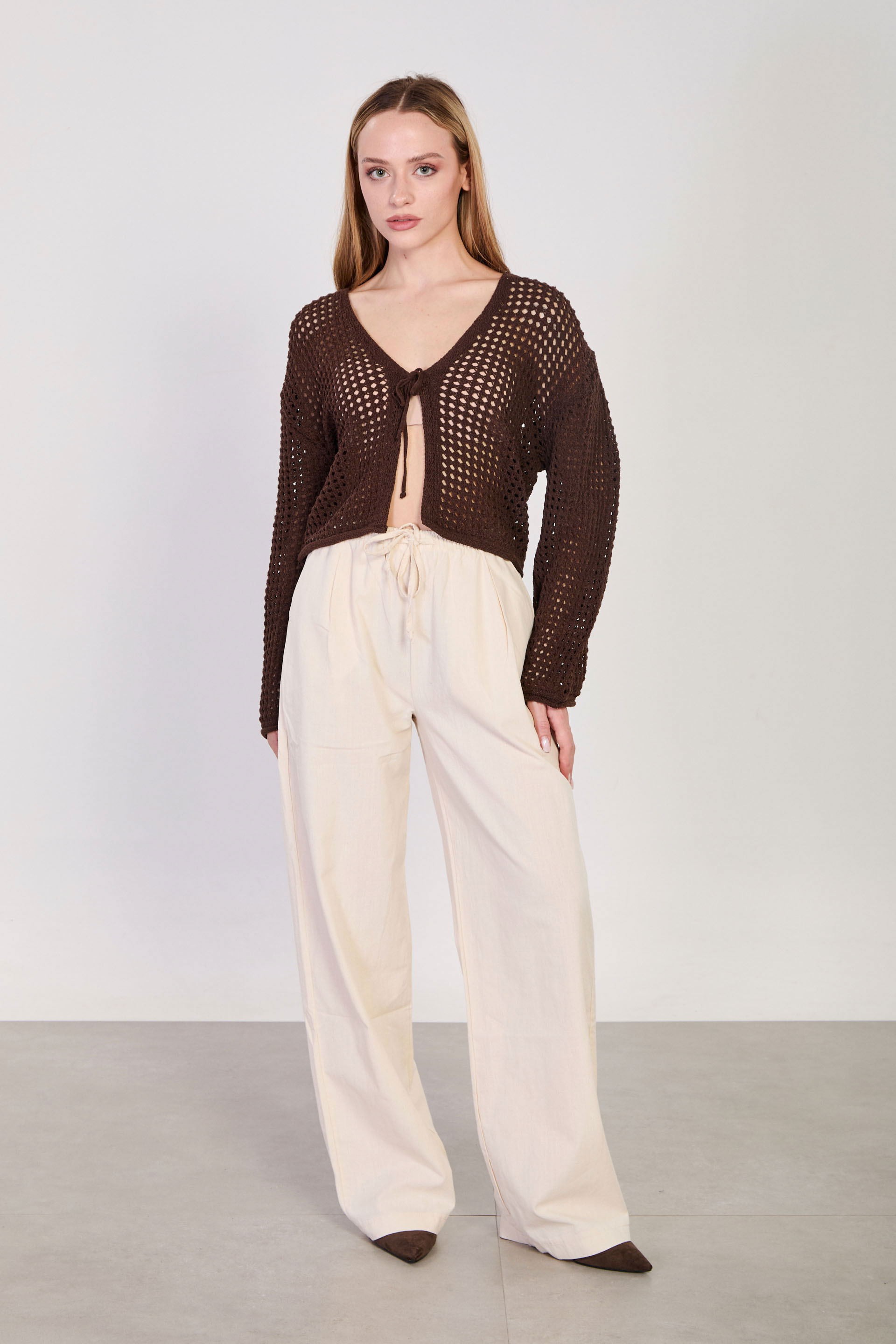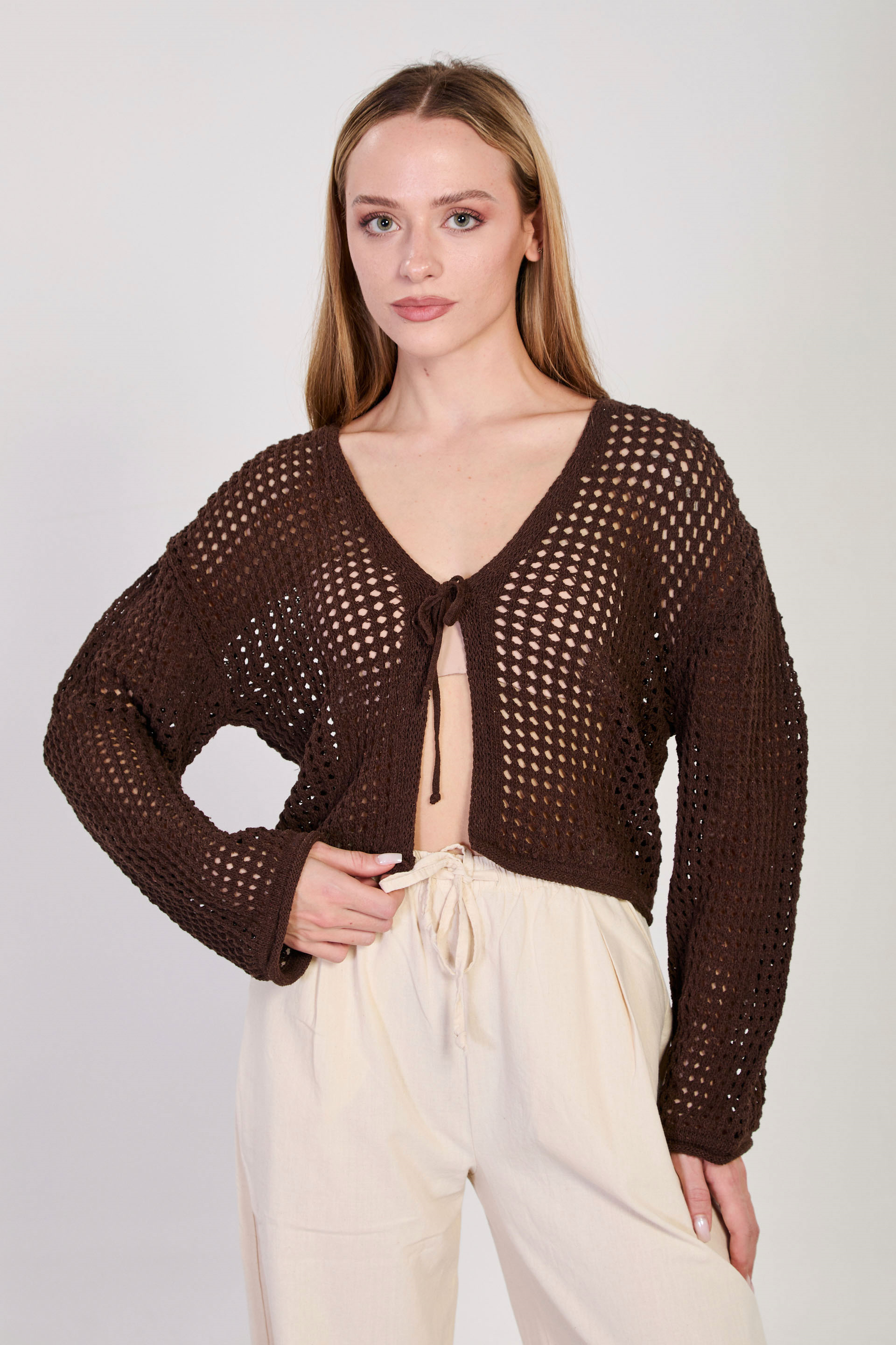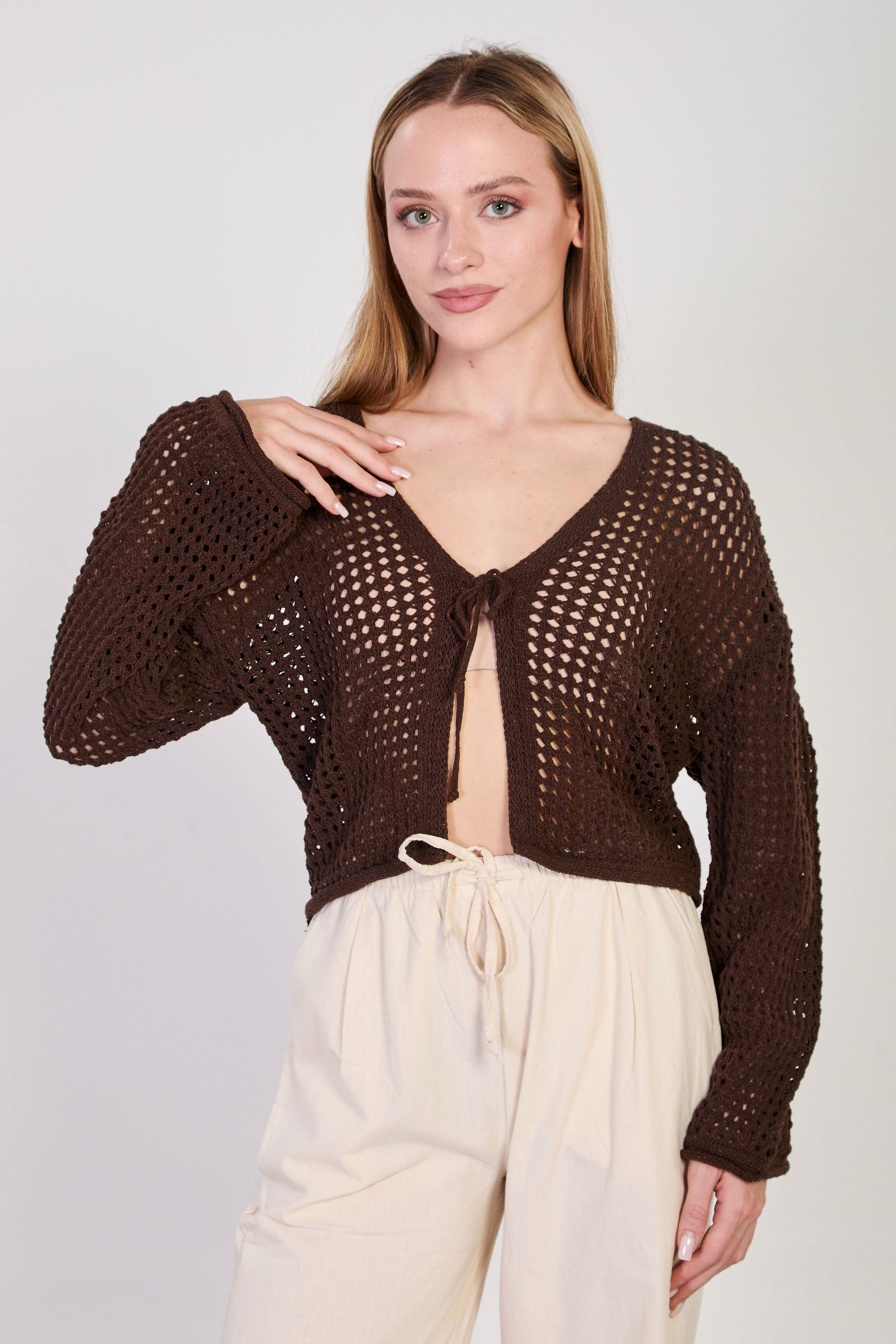 Kadın Önü Bağlamalı Ajurlu Crop Hırka - Acı Kahve