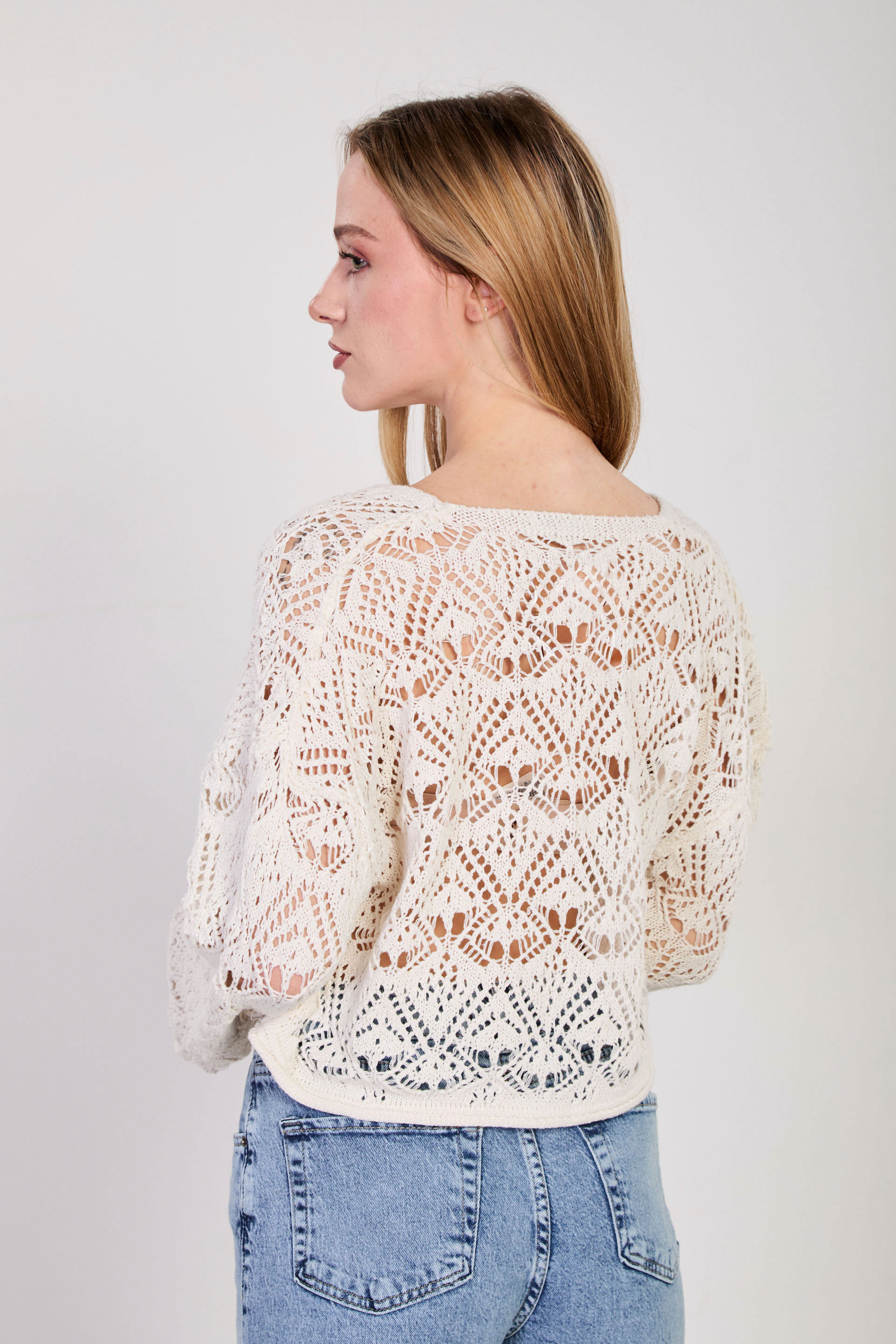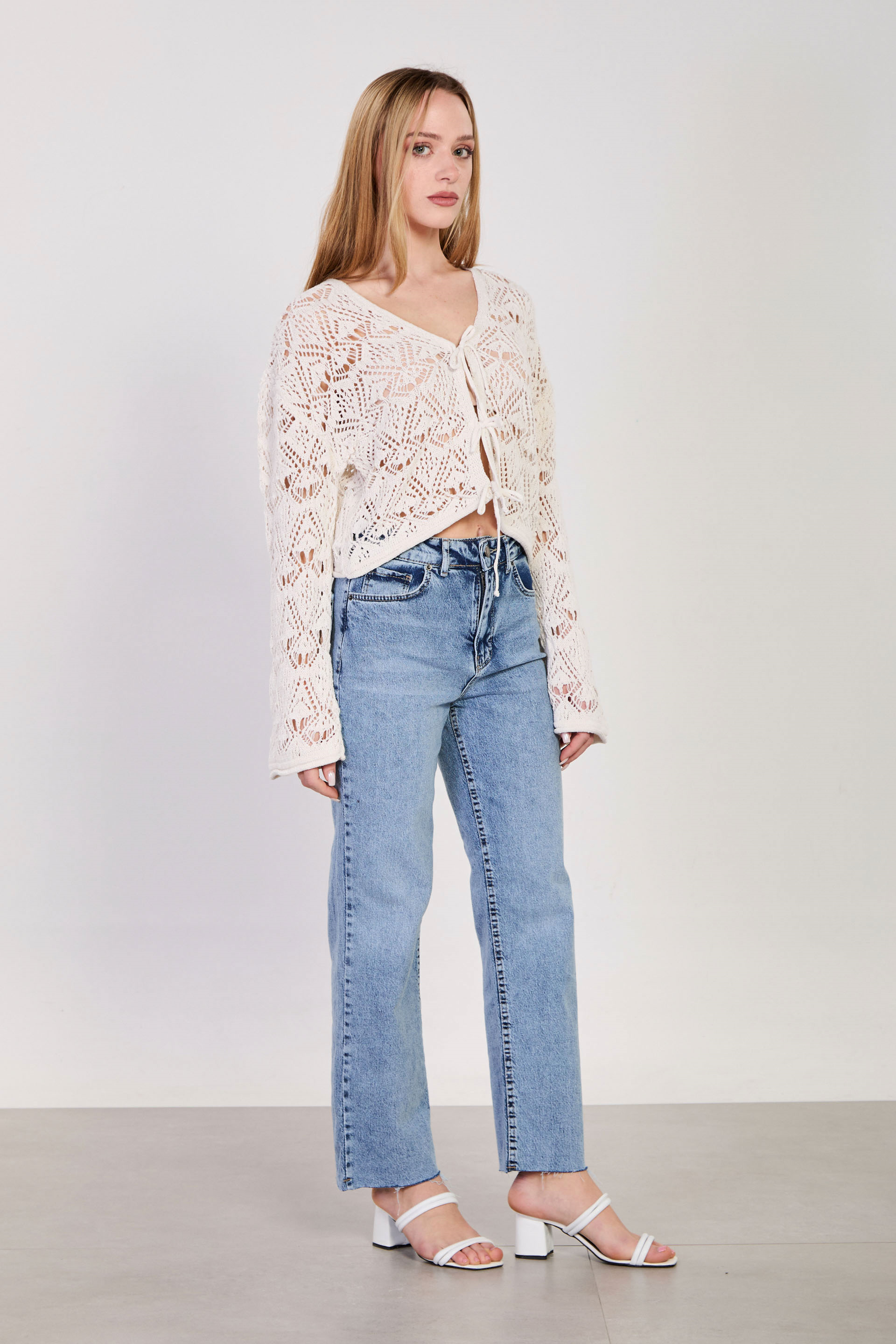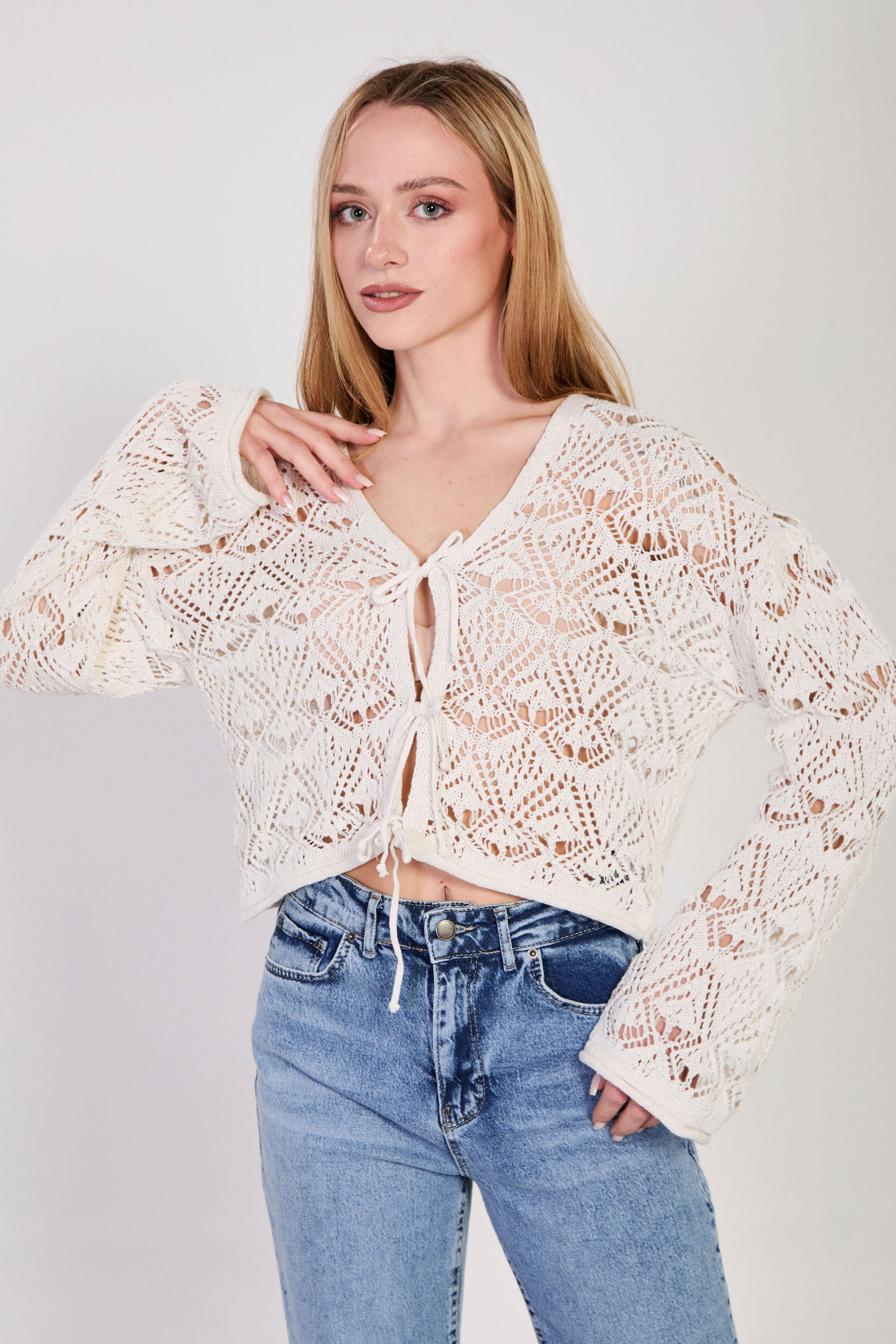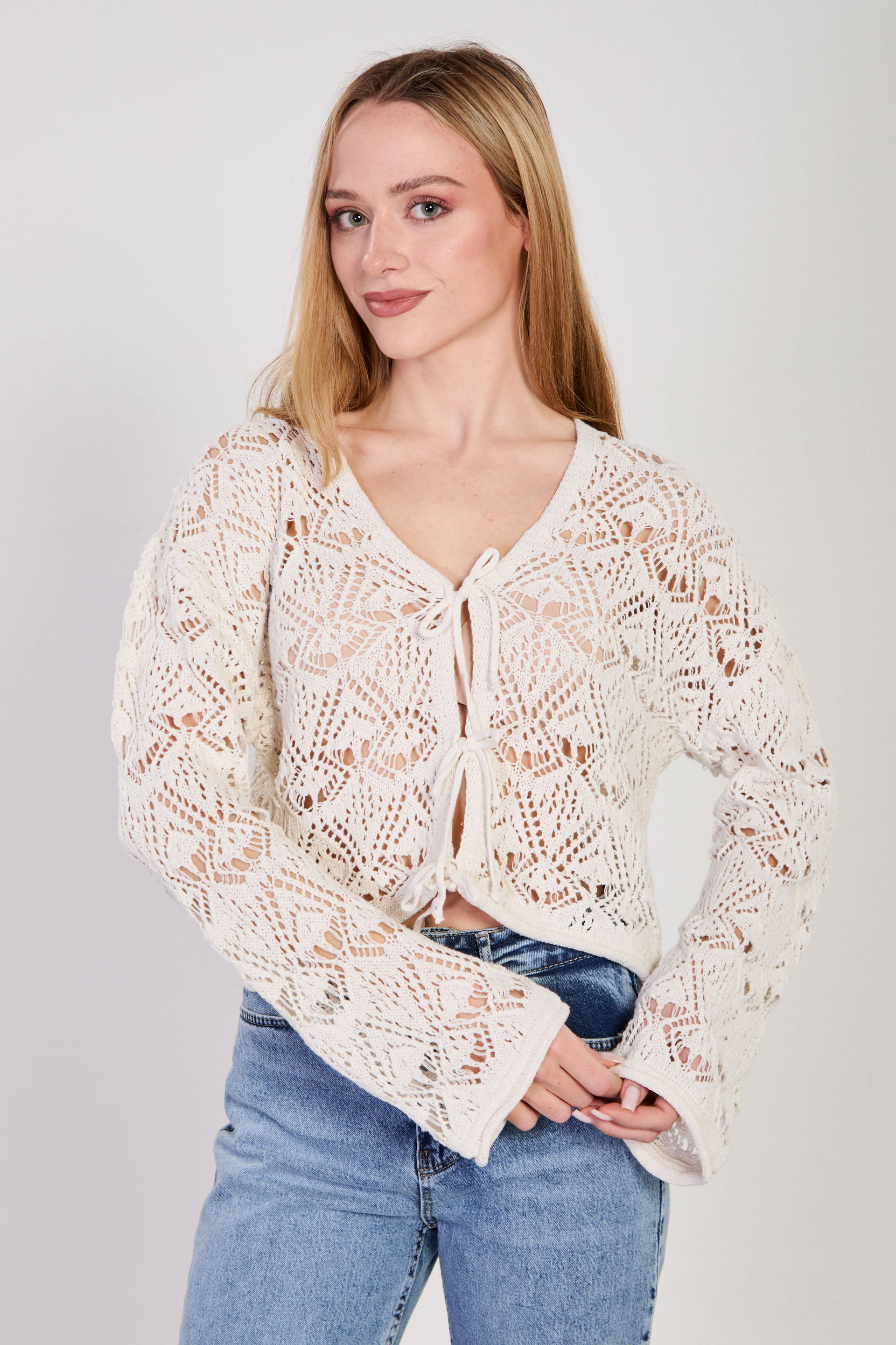 Kadın Önü Bağlamalı Ajurlu Hırka - Natural