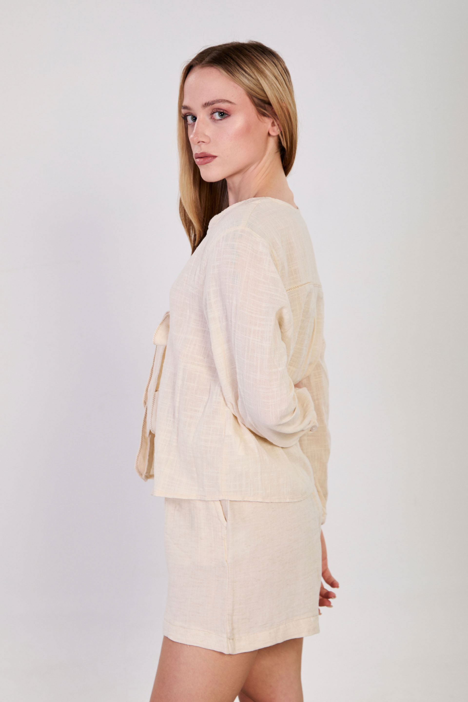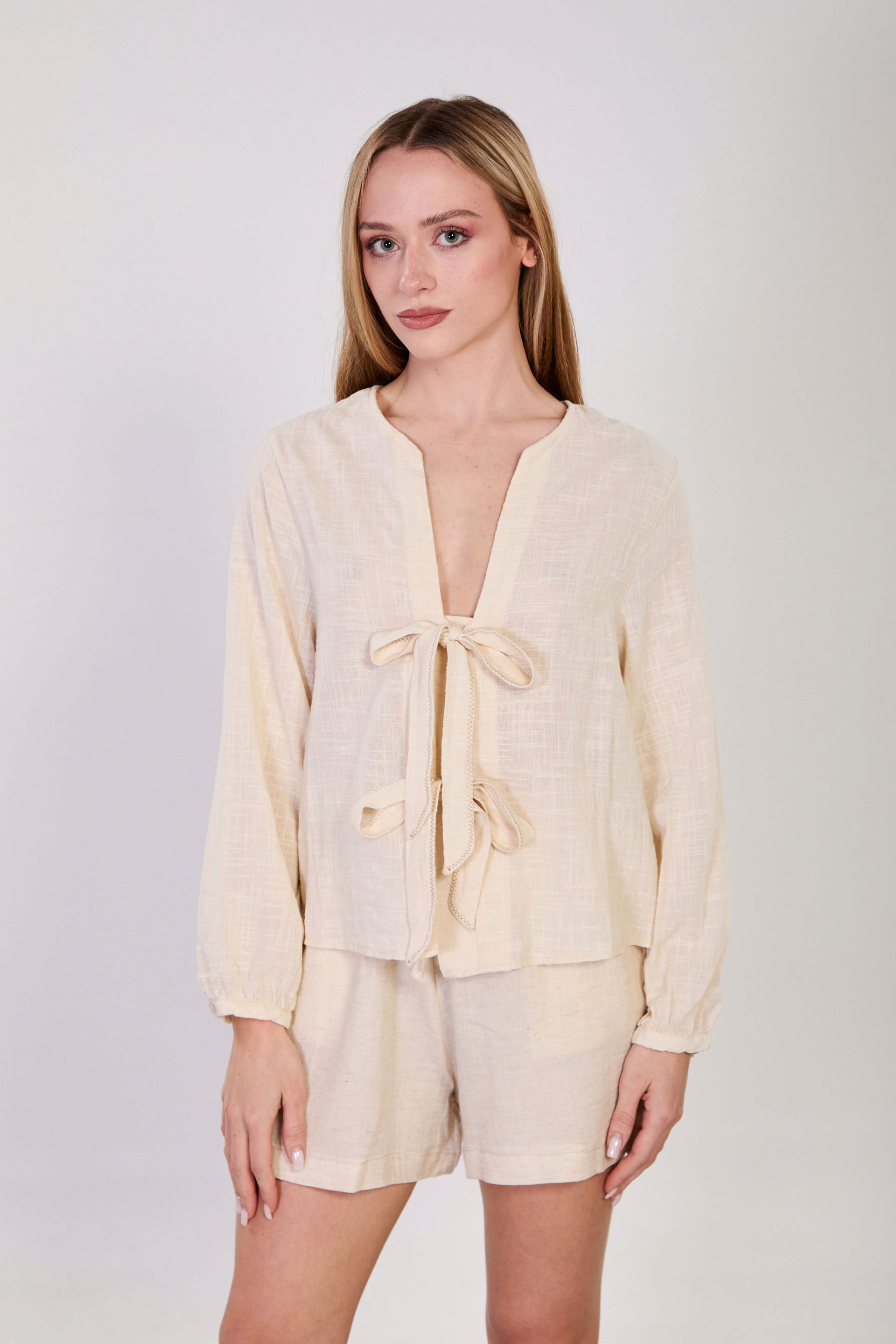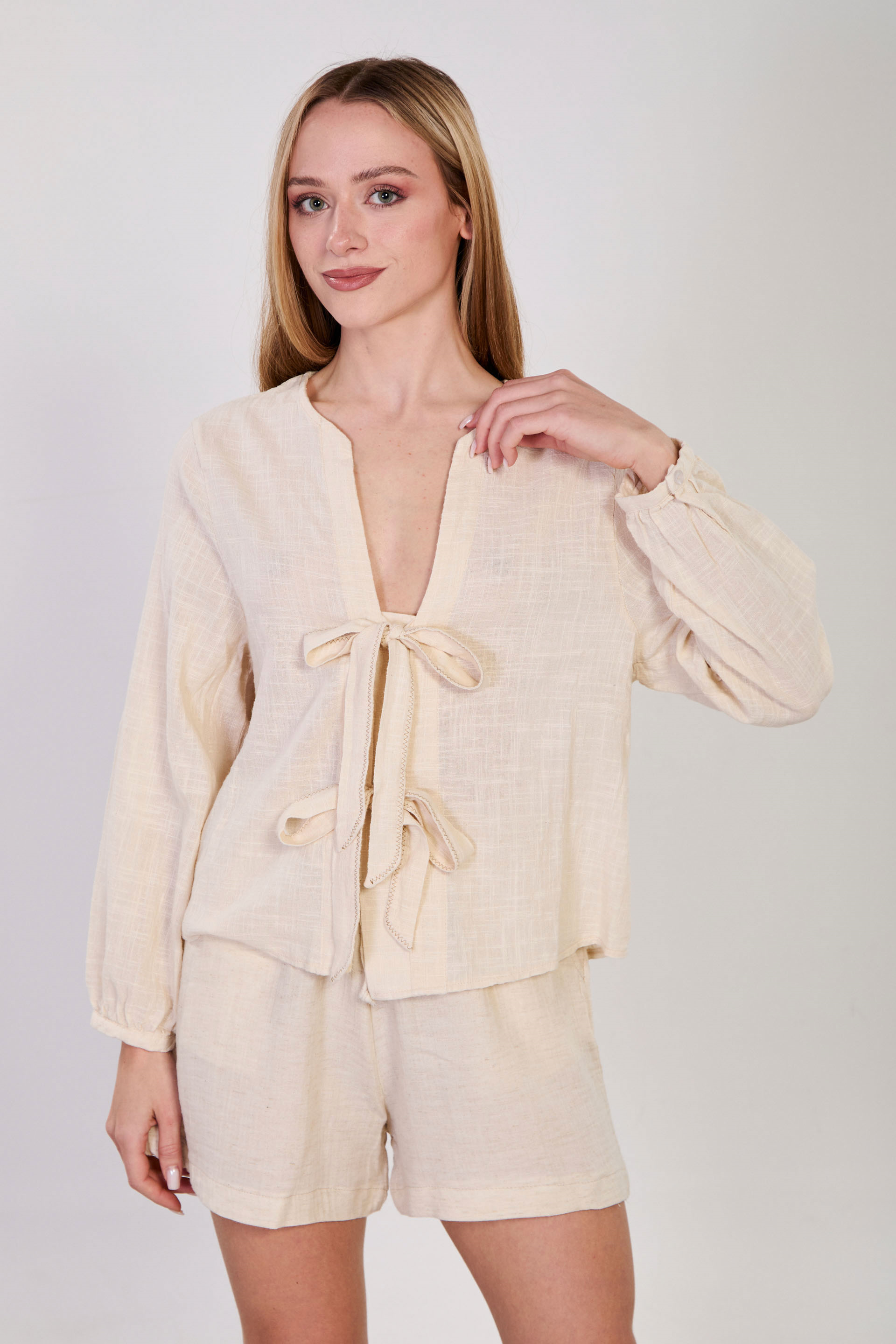 Kadın Önü Bağlamalı Dikiş Detaylı Bluz - Natural