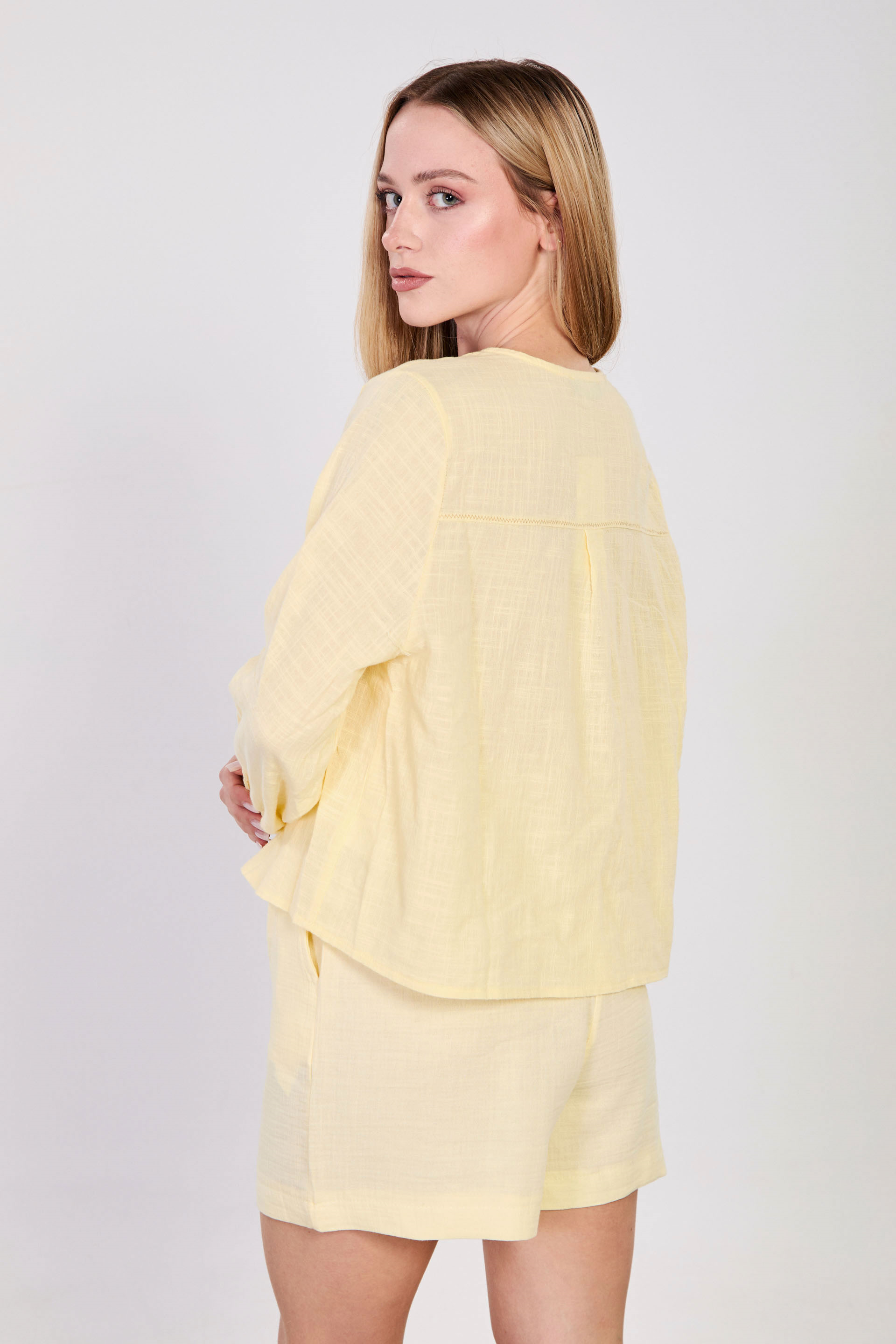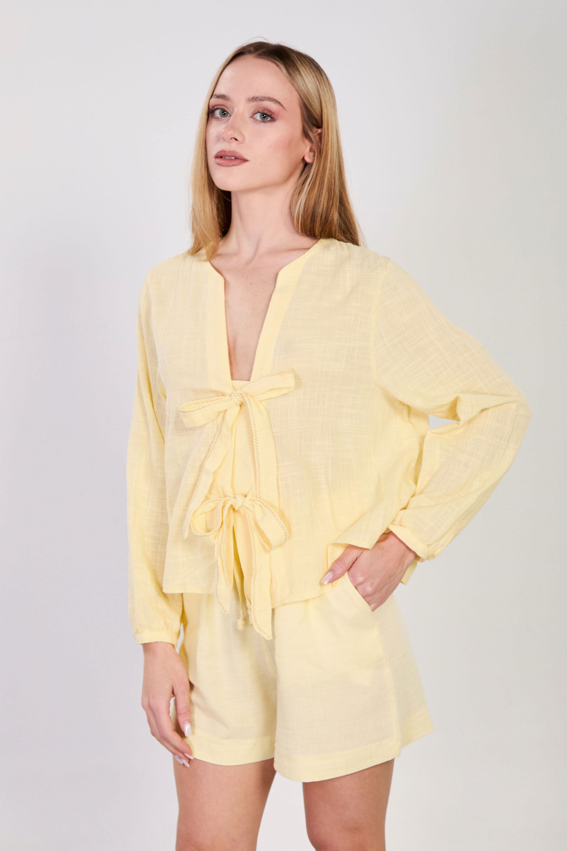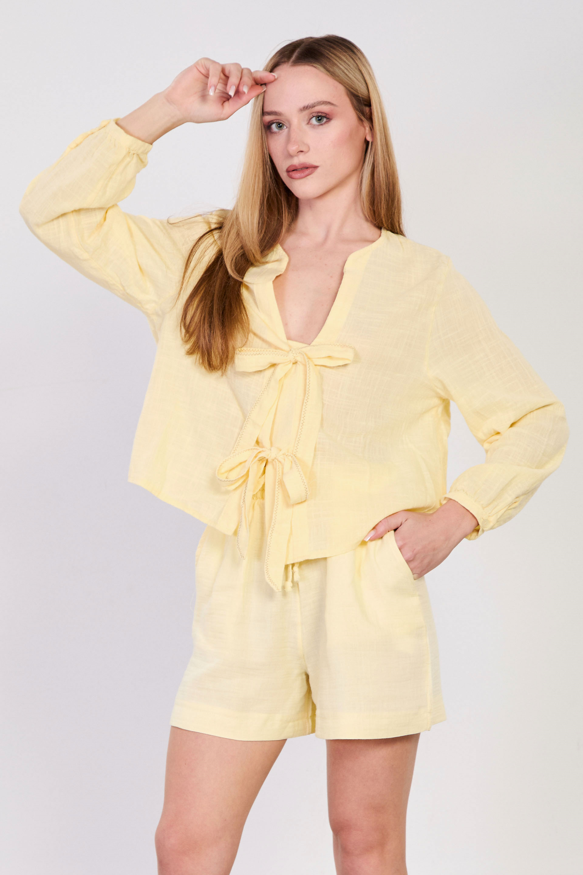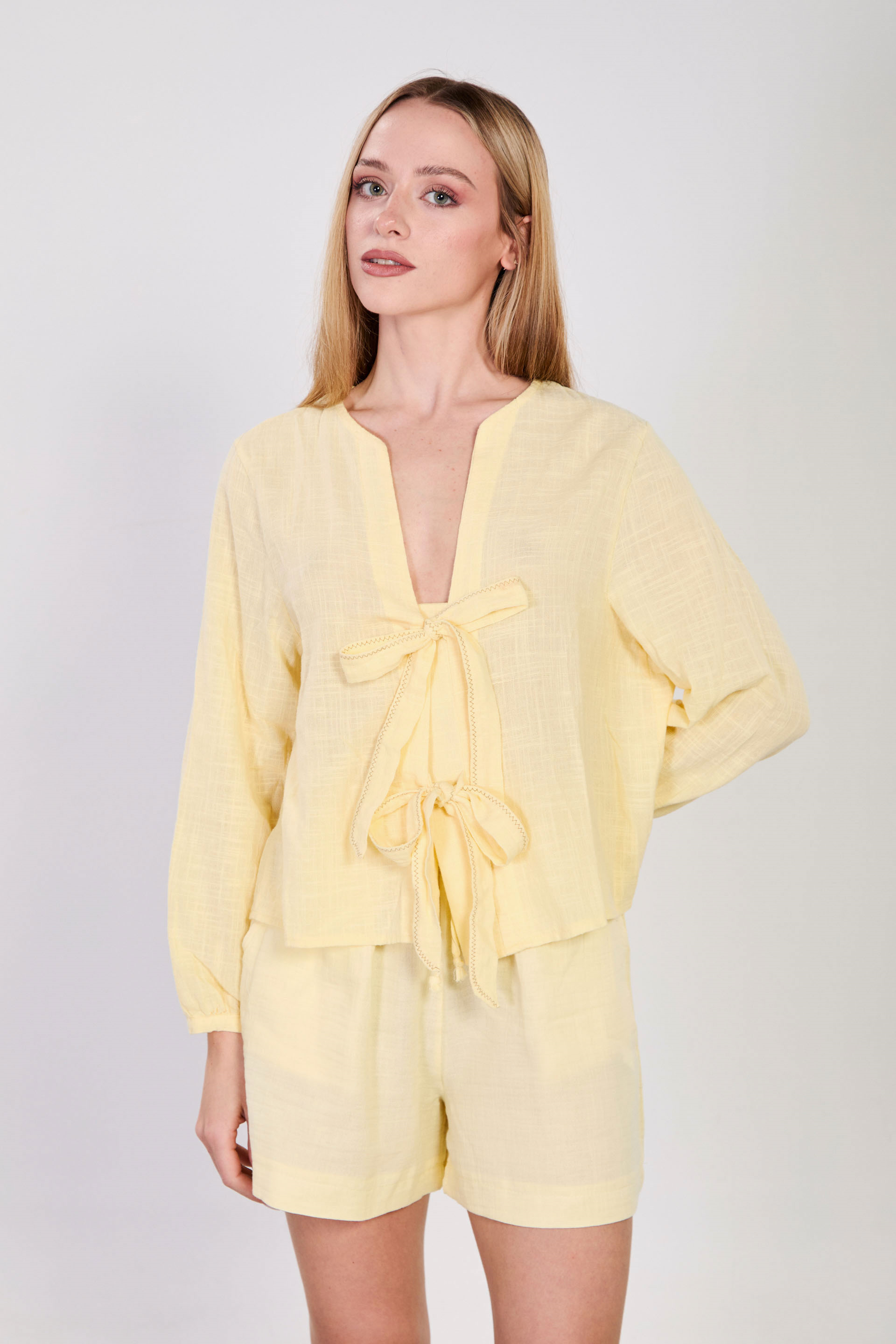 Kadın Önü Bağlamalı Dikiş Detaylı Bluz - Sarı