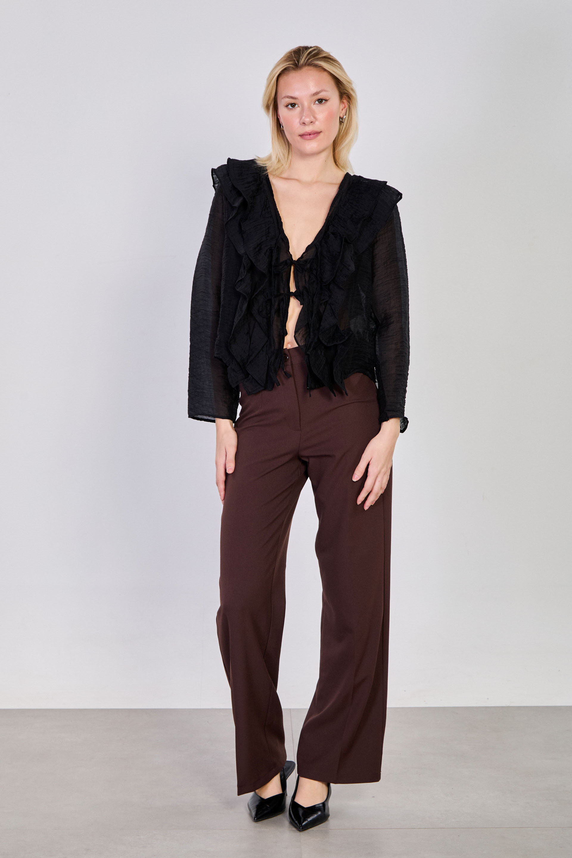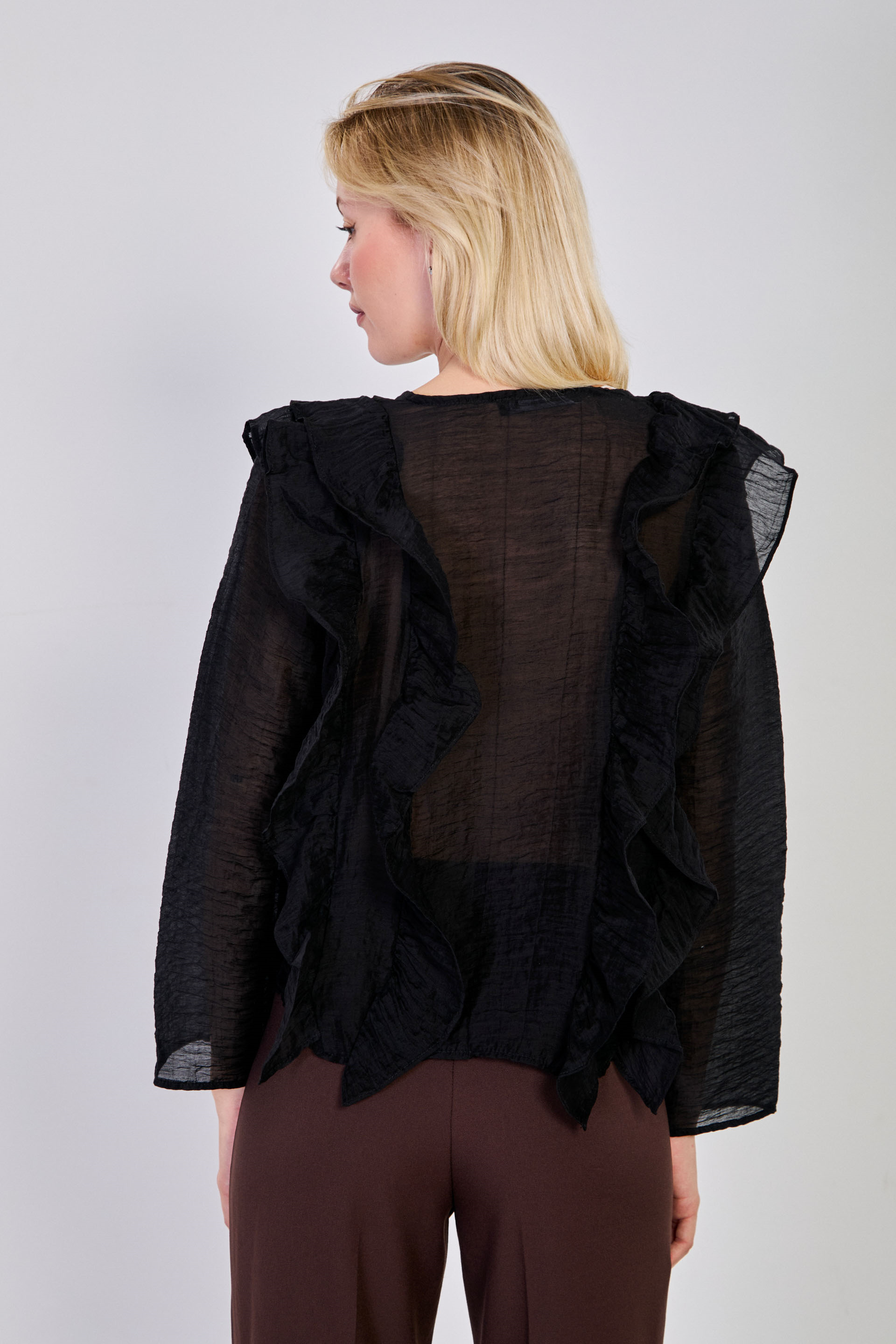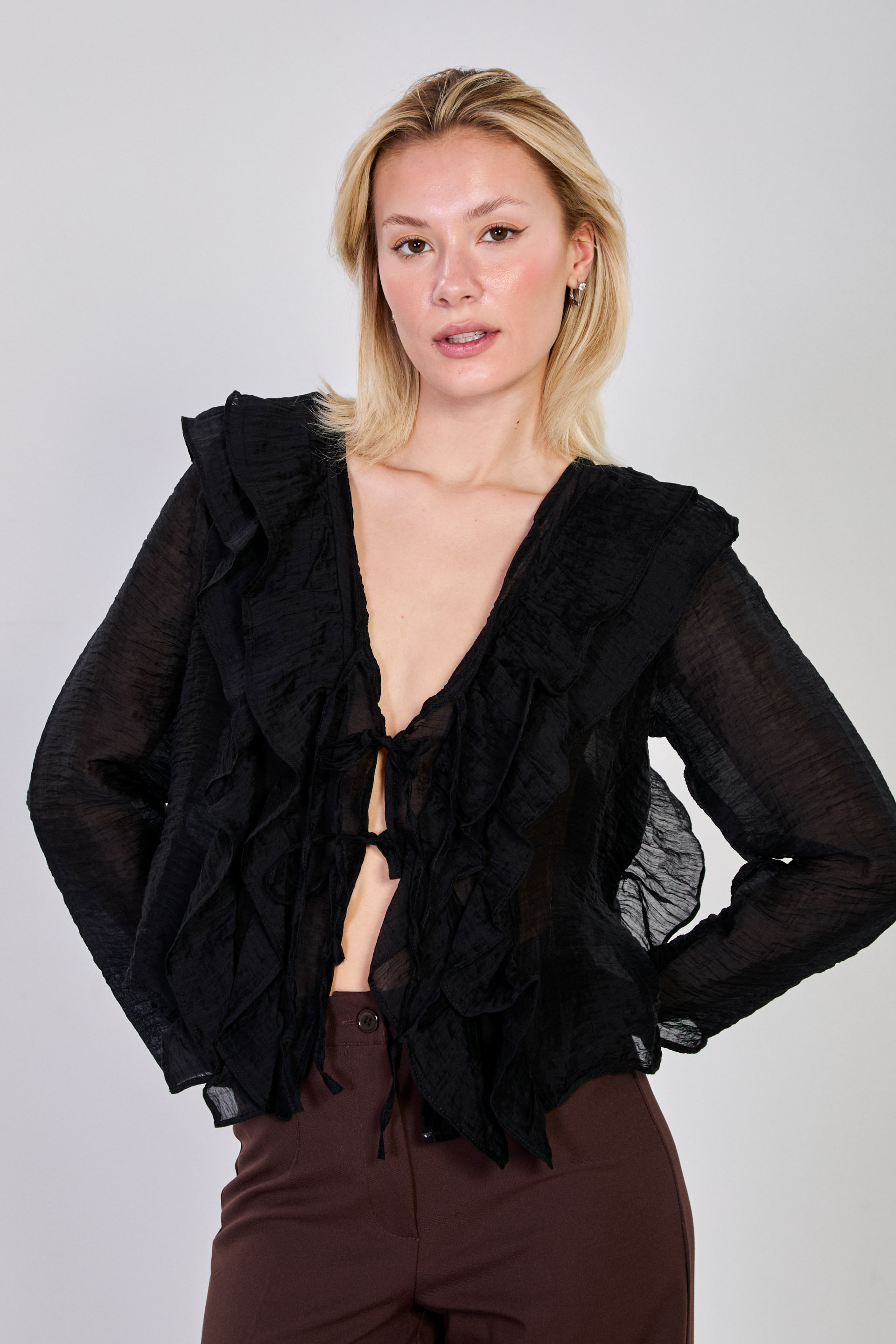 Kadın Önü Bağlamalı Fırfırlı Bluz - Siyah