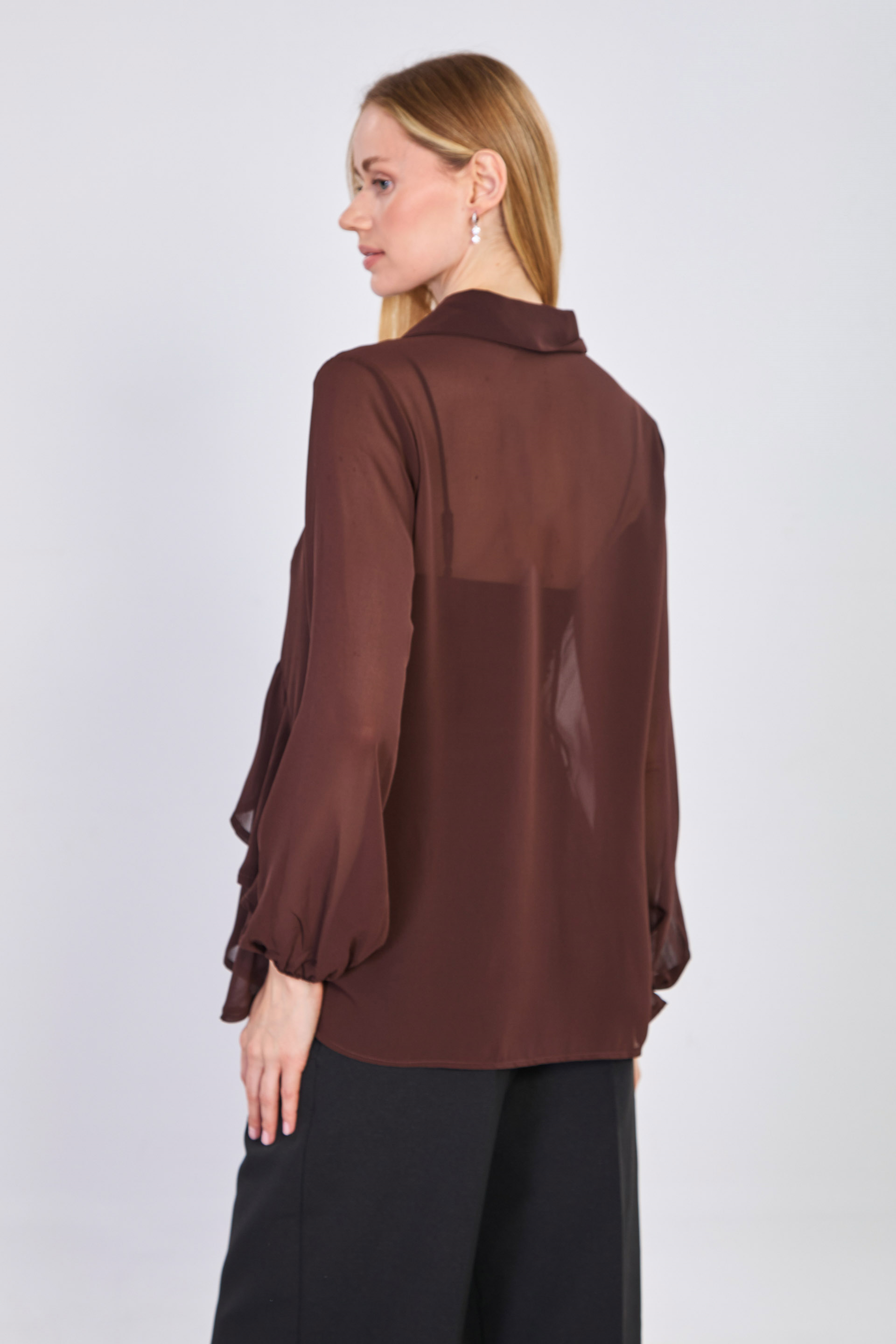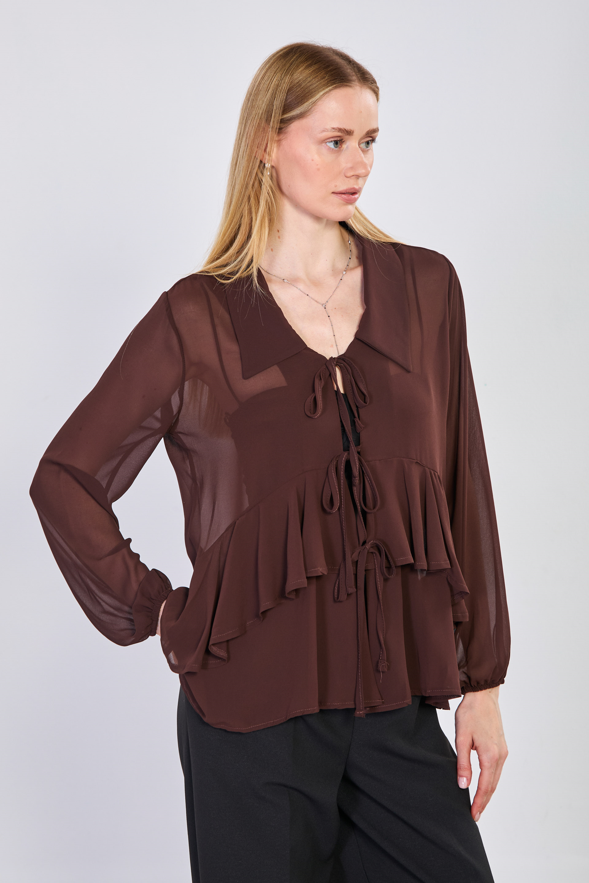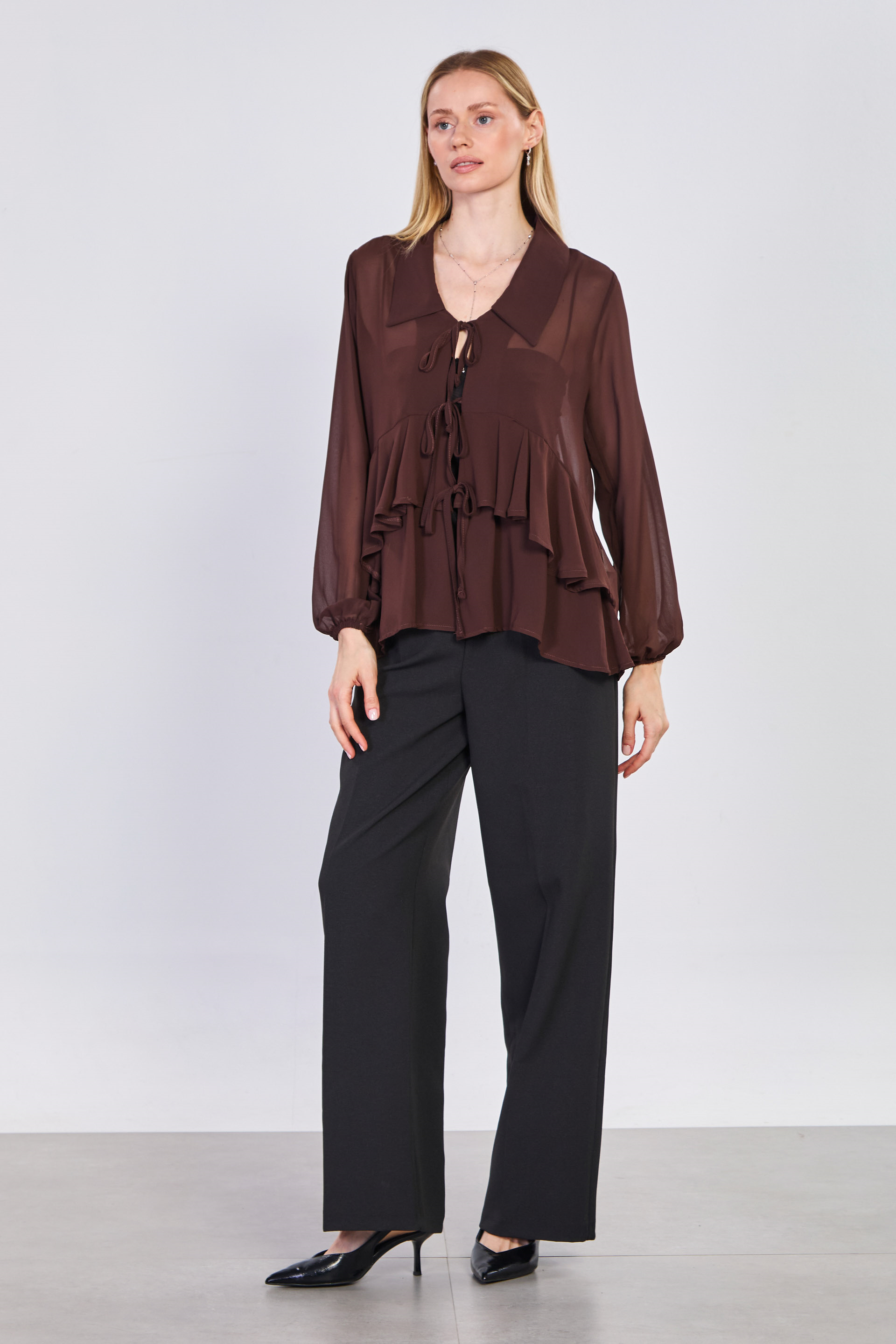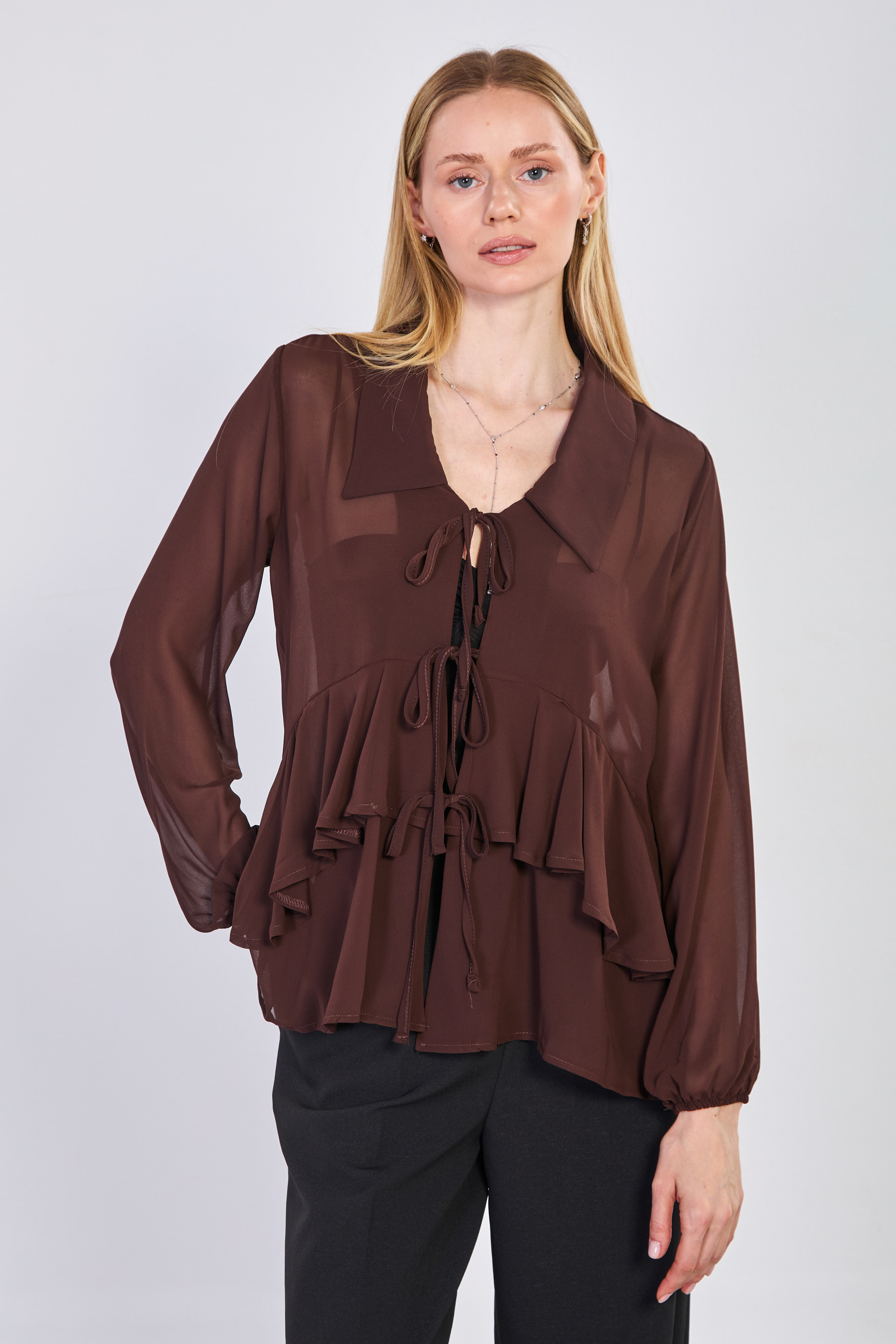 Kadın Önü Bağlamalı Fırfırlı Şifon Bluz - Acı Kahve