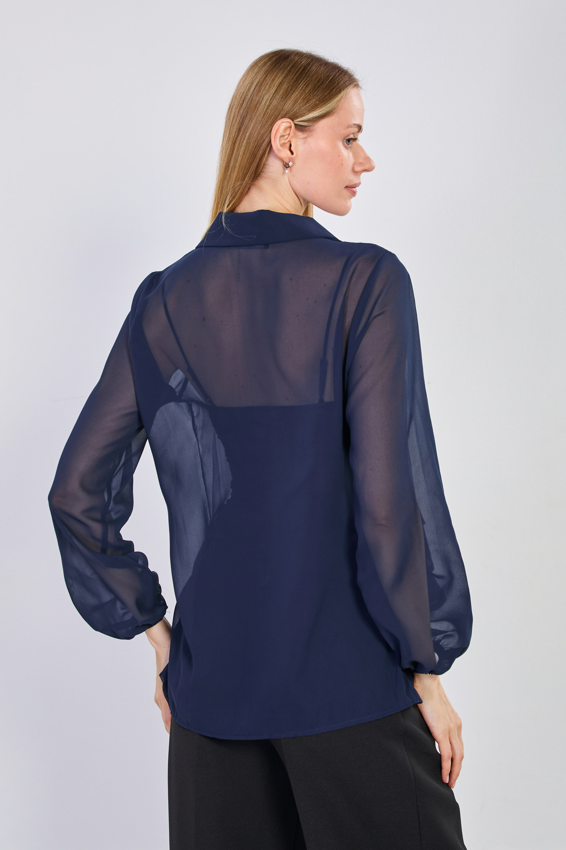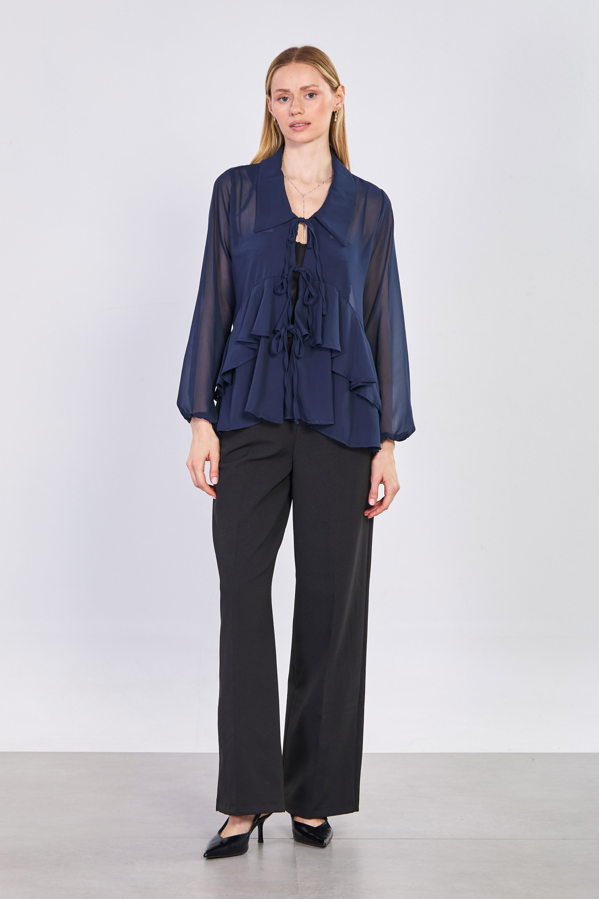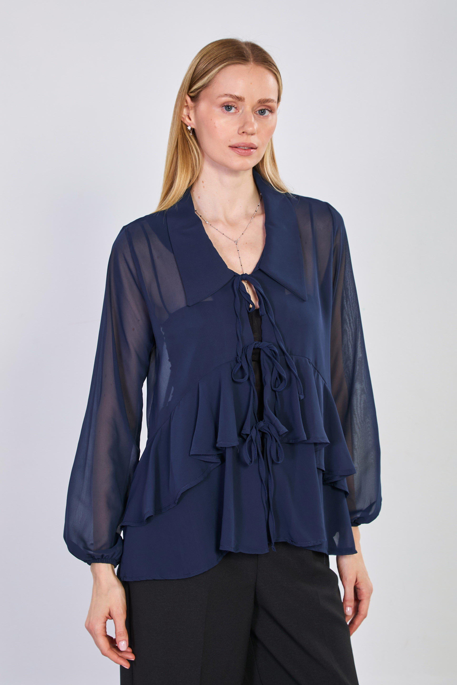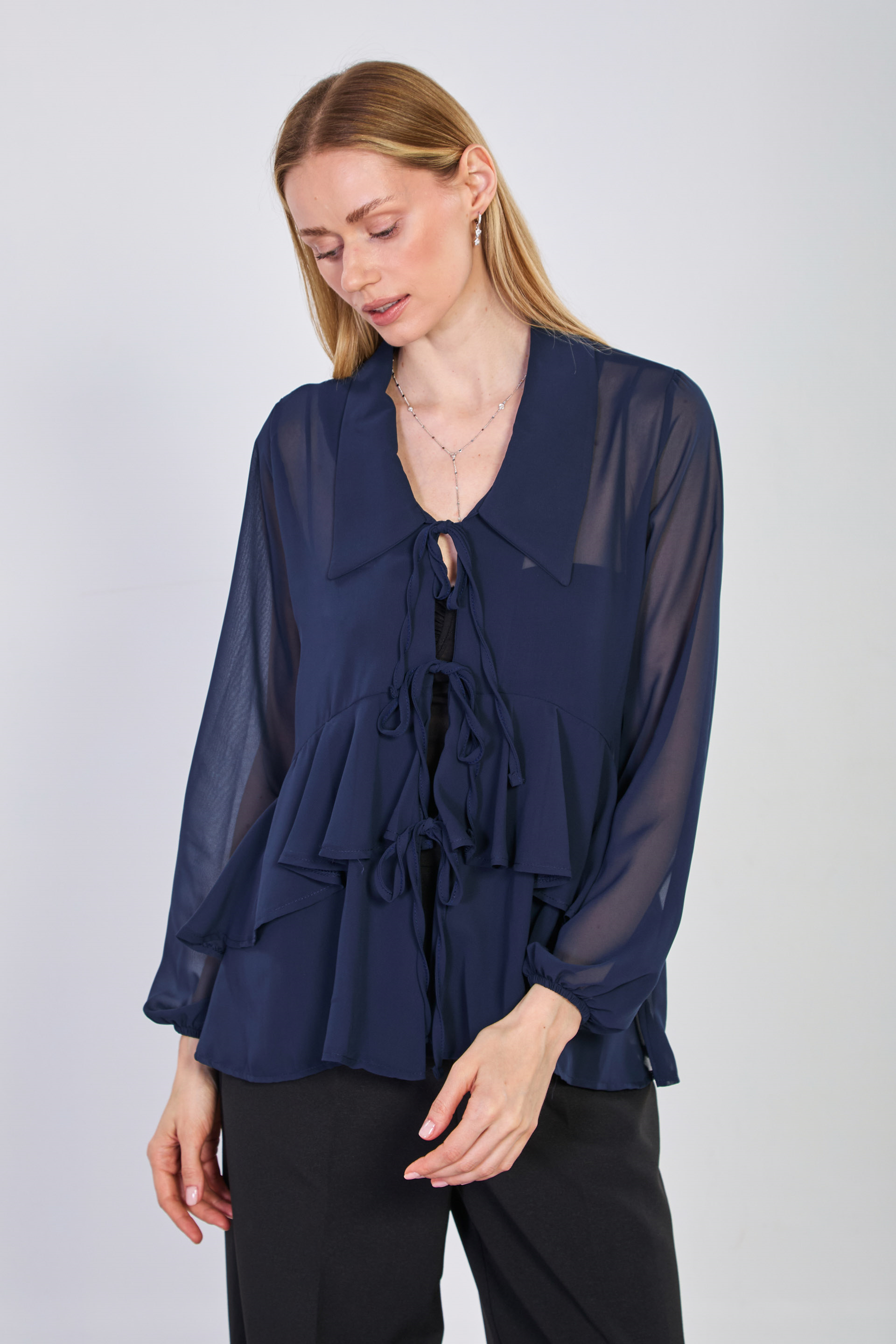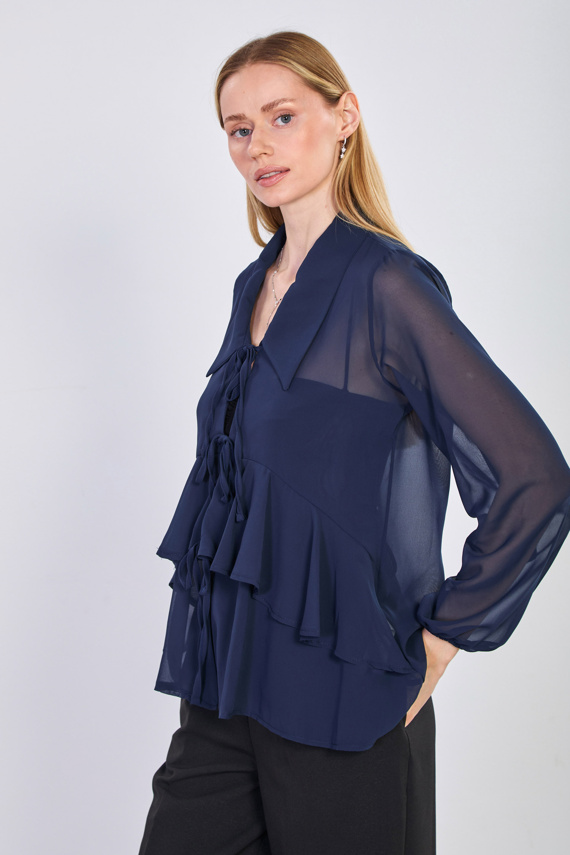 Kadın Önü Bağlamalı Fırfırlı Şifon Bluz - Koyu Lacivert