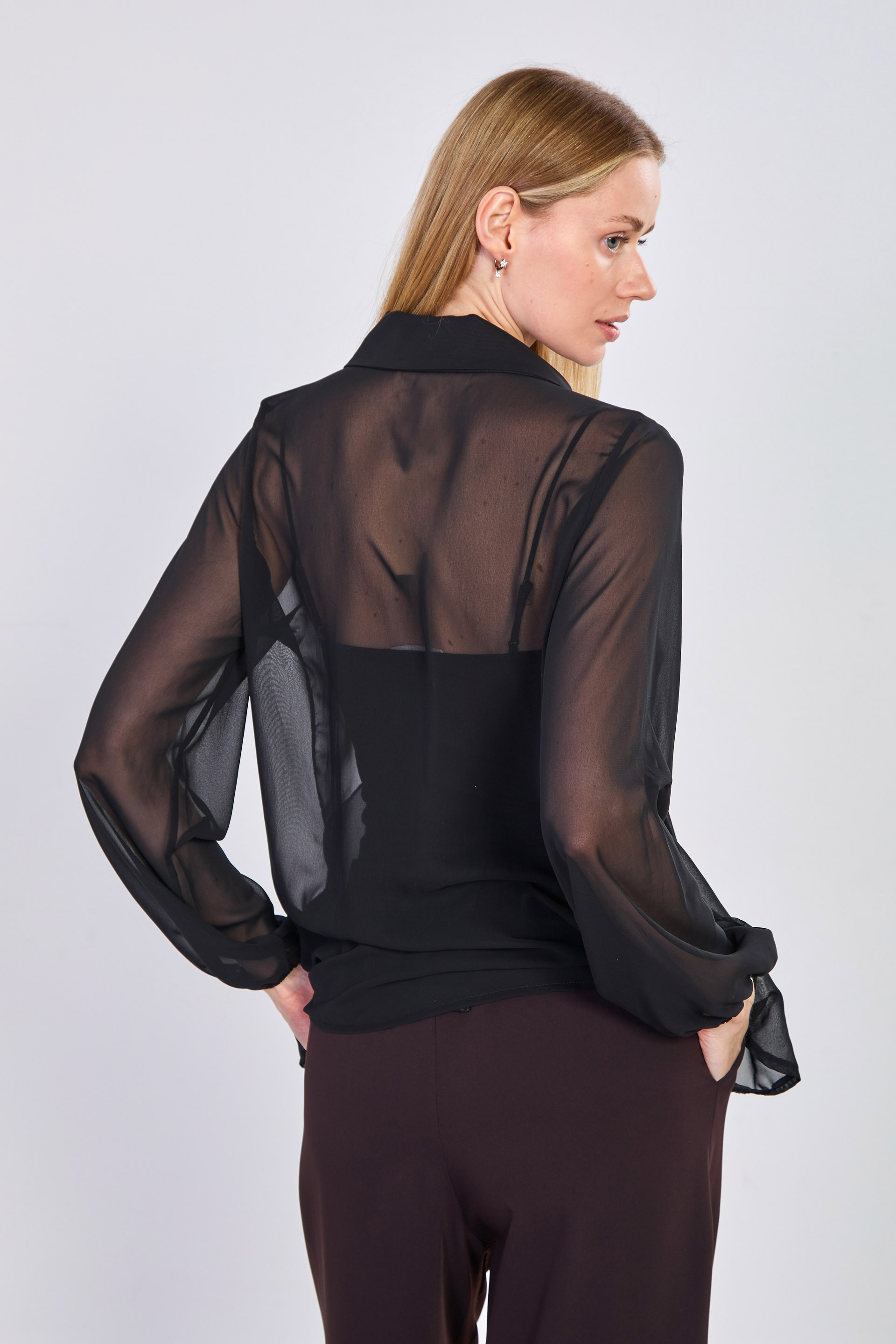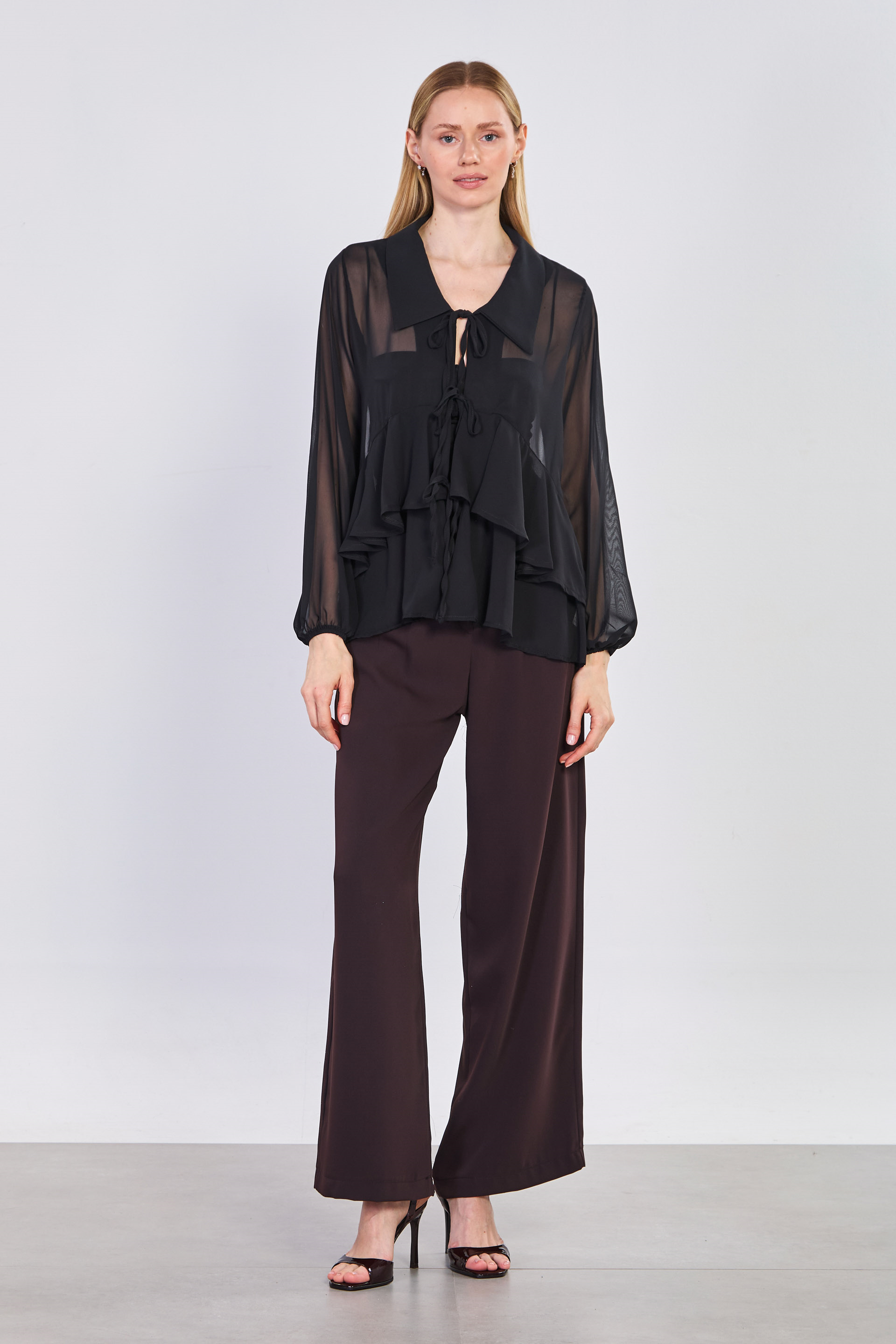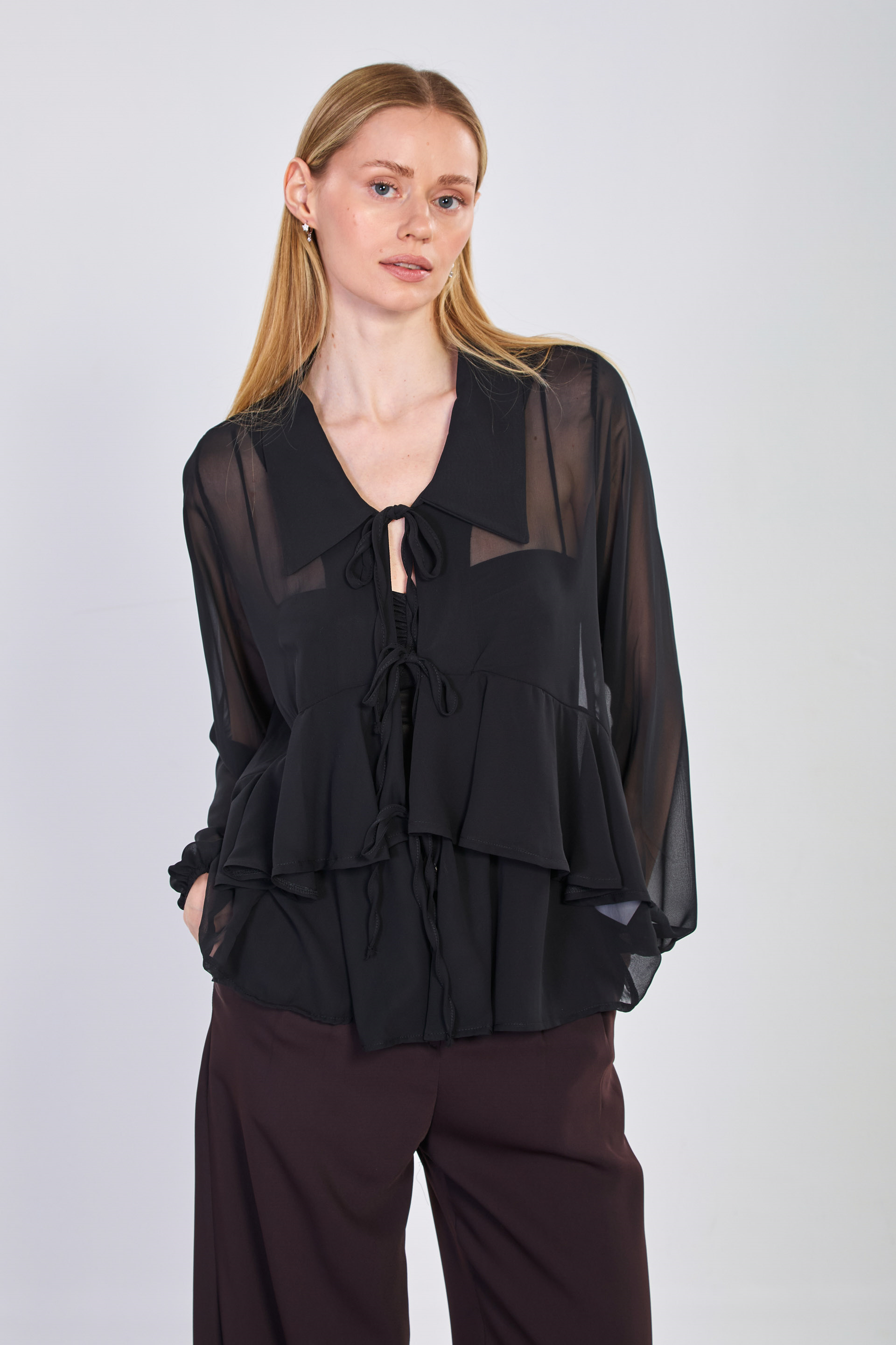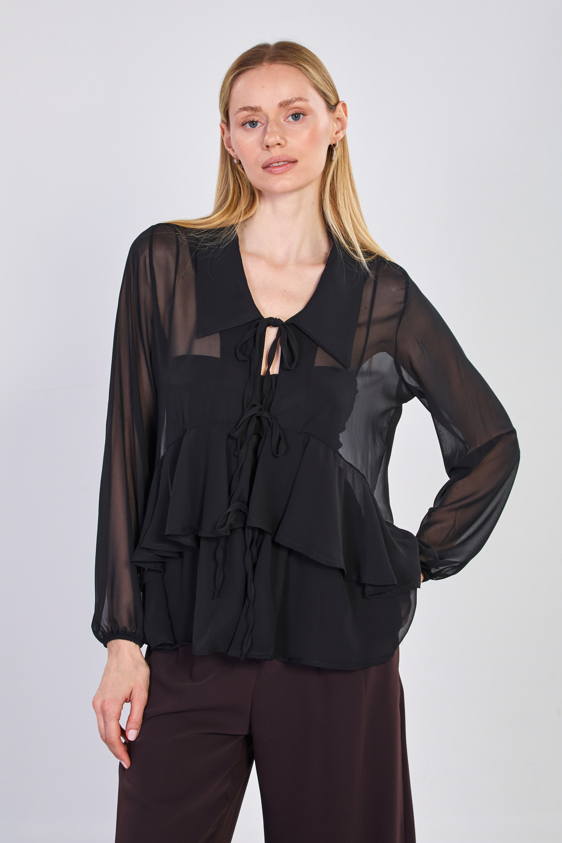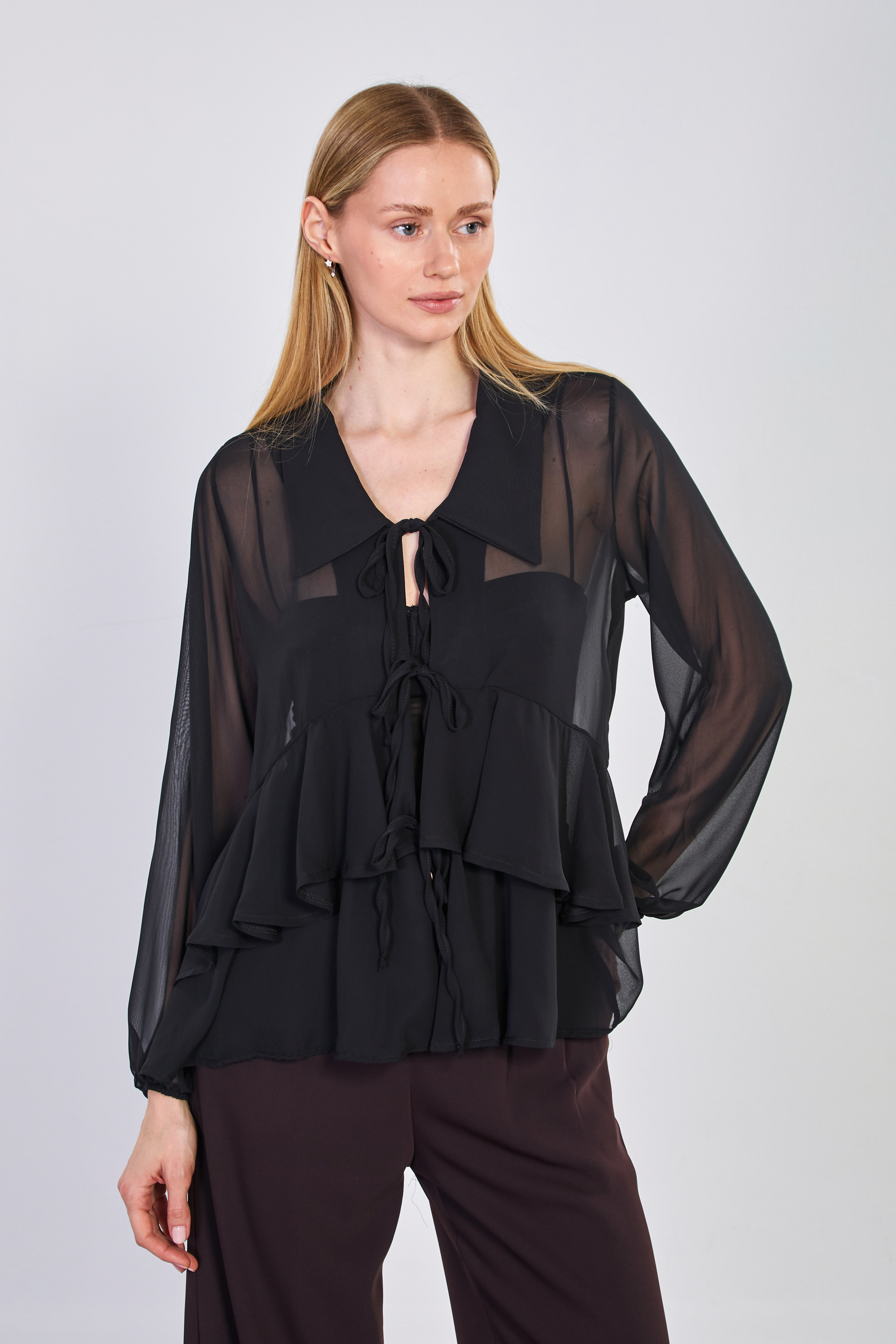 Kadın Önü Bağlamalı Fırfırlı Şifon Bluz - Siyah